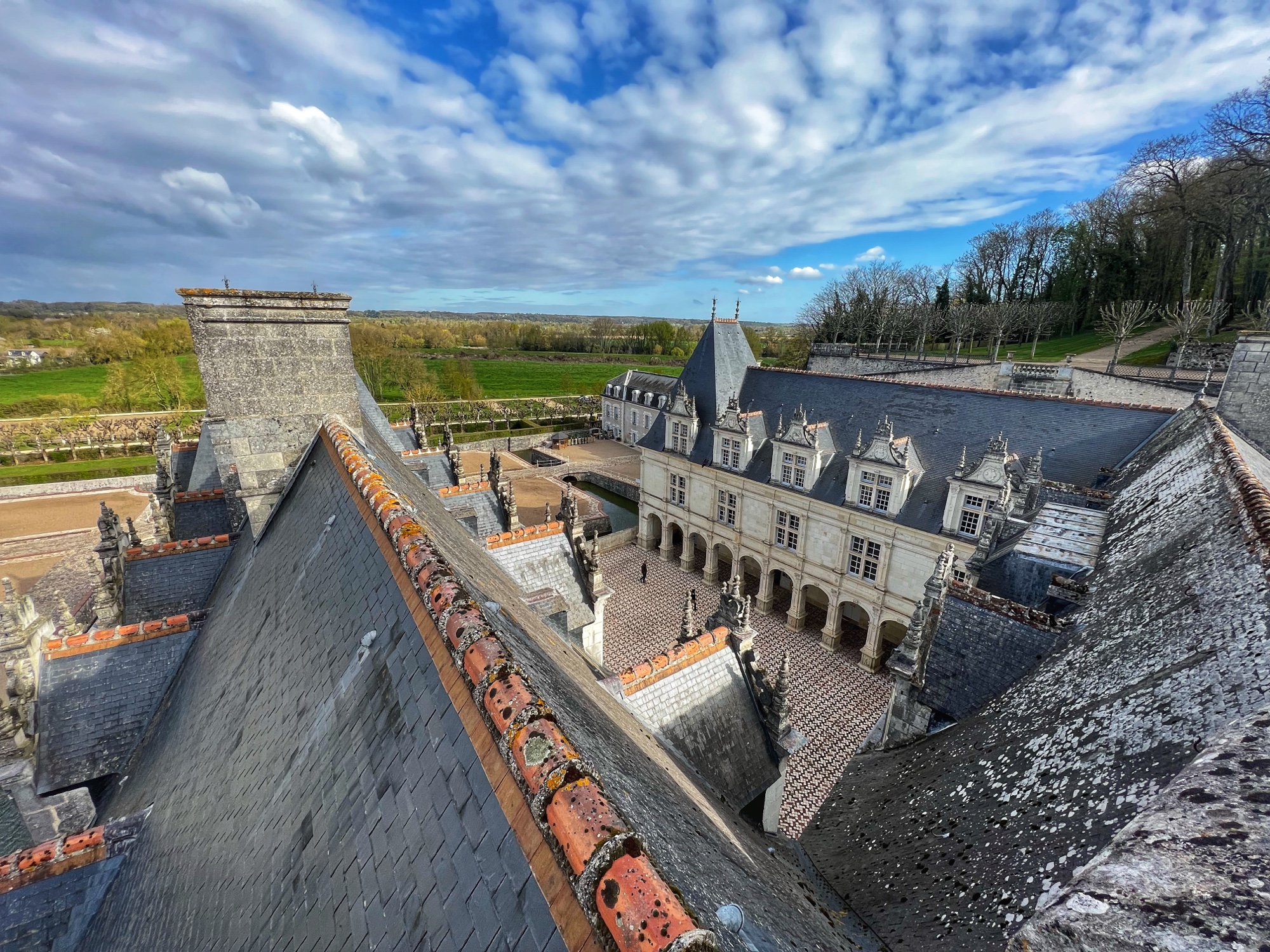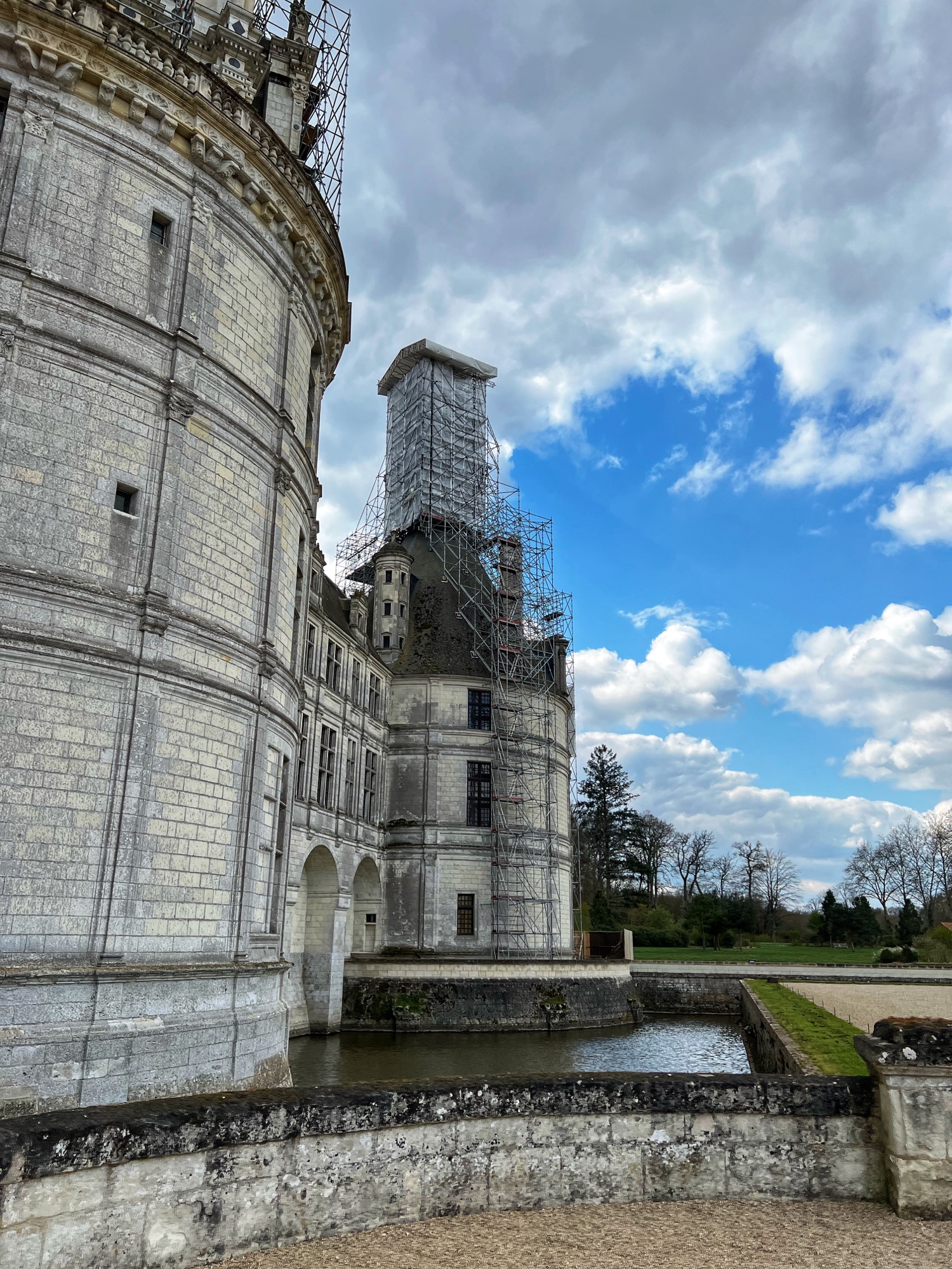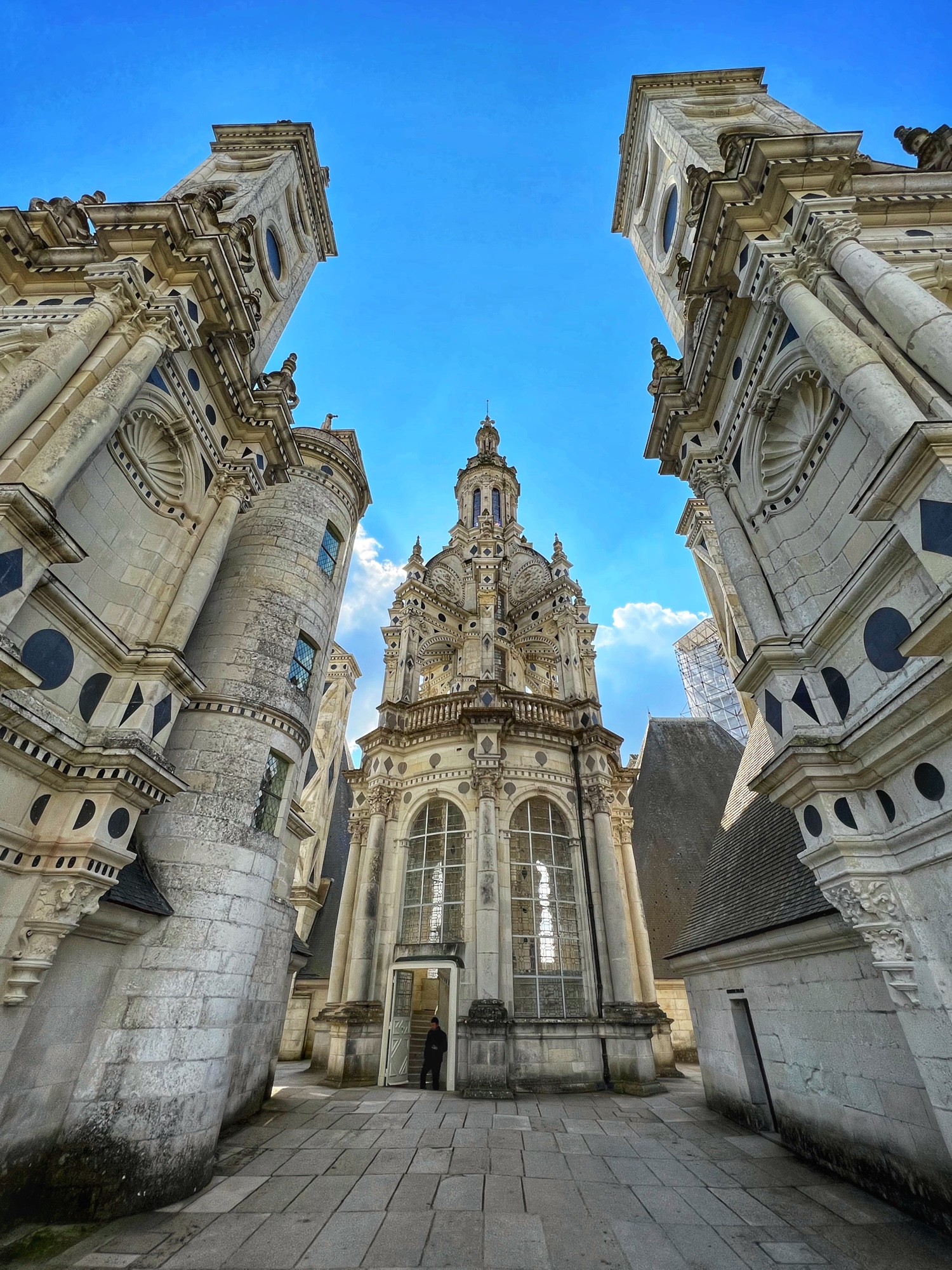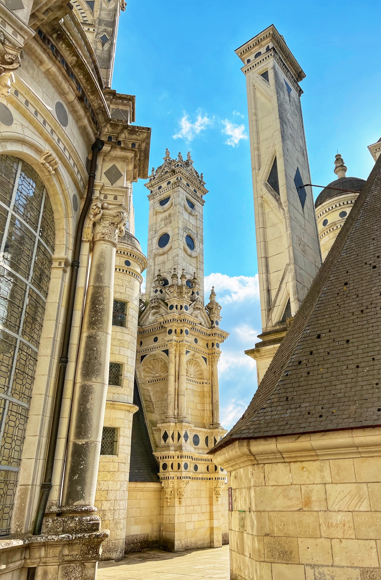 The rooftop is also a phenomenal place that is not to be missed. This is the pièce de résistance! Walking along the rooftop you can see for miles, and in each direction there is a slightly different surrounding of columns, spires and towers. I was a bit disappointed that nearly the entirety of the main towers were covered in scaffolding but happy to see it is being restored. The central “lantern” is exquisite! In just the right light, the “skyline” of the rooftop spires can be seen in the shadows overlooking the courtyard and gardens. Besides Villandry, this is the only other castle with rooftop access that we saw.