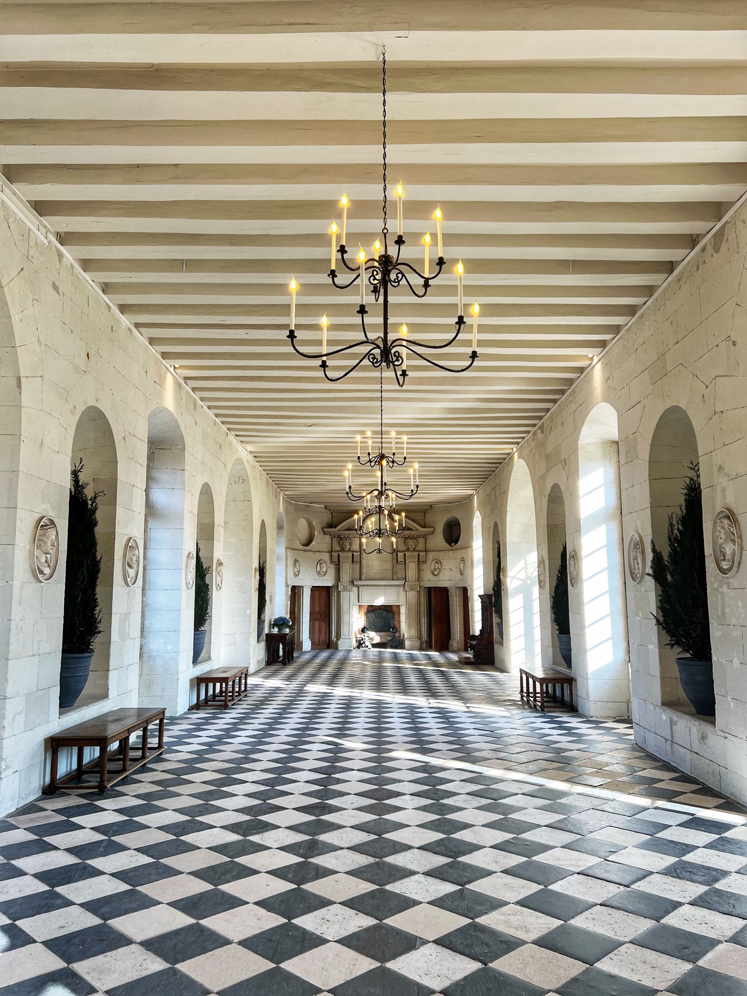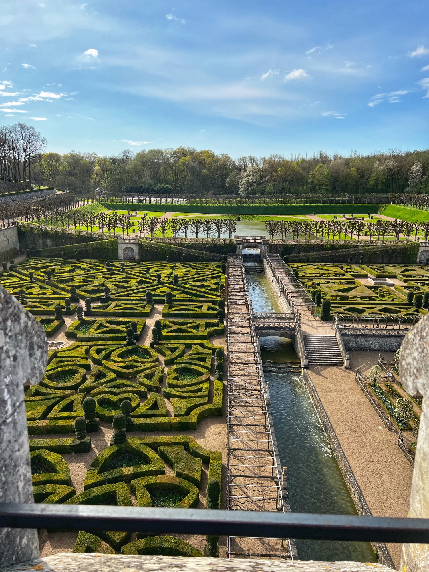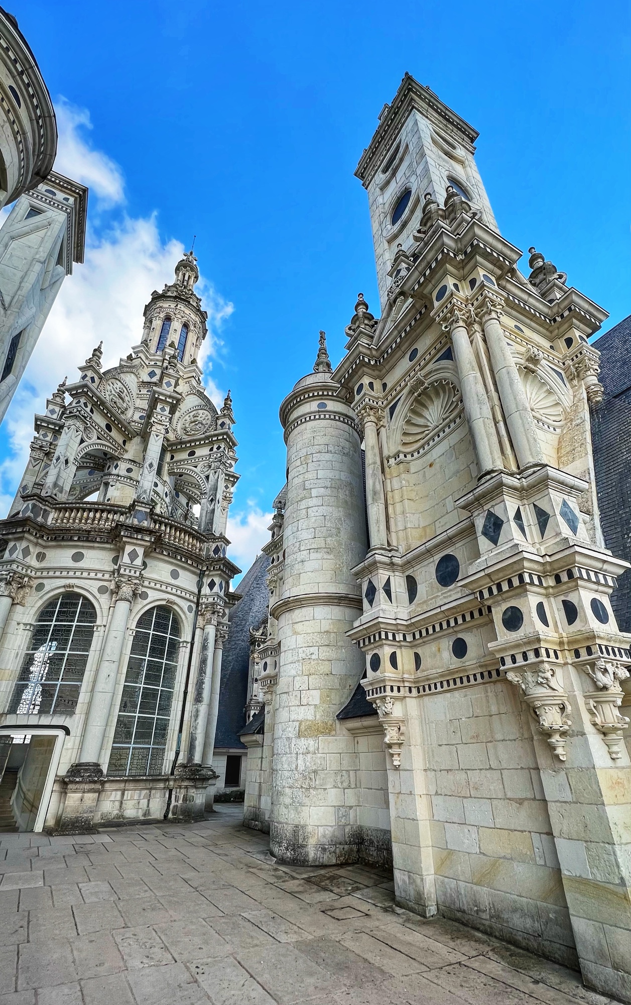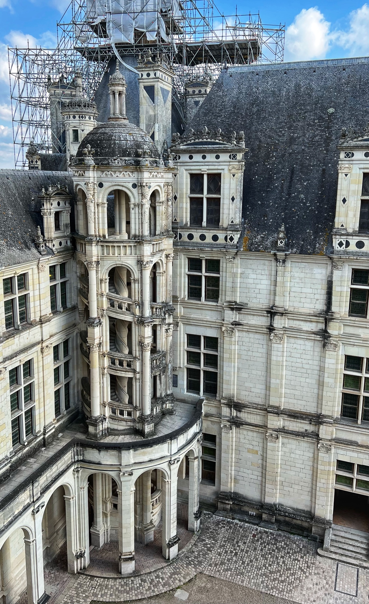 The rooftop is also a phenomenal place that is not to be missed. This is the pièce de résistance! Walking along the rooftop you can see for miles, and in each direction there is a slightly different surrounding of columns, spires and towers. I was a bit disappointed that nearly the entirety of the main towers were covered in scaffolding but happy to see it is being restored. The central “lantern” is exquisite! In just the right light, the “skyline” of the rooftop spires can be seen in the shadows overlooking the courtyard and gardens. Besides Villandry, this is the only other castle with rooftop access that we saw.