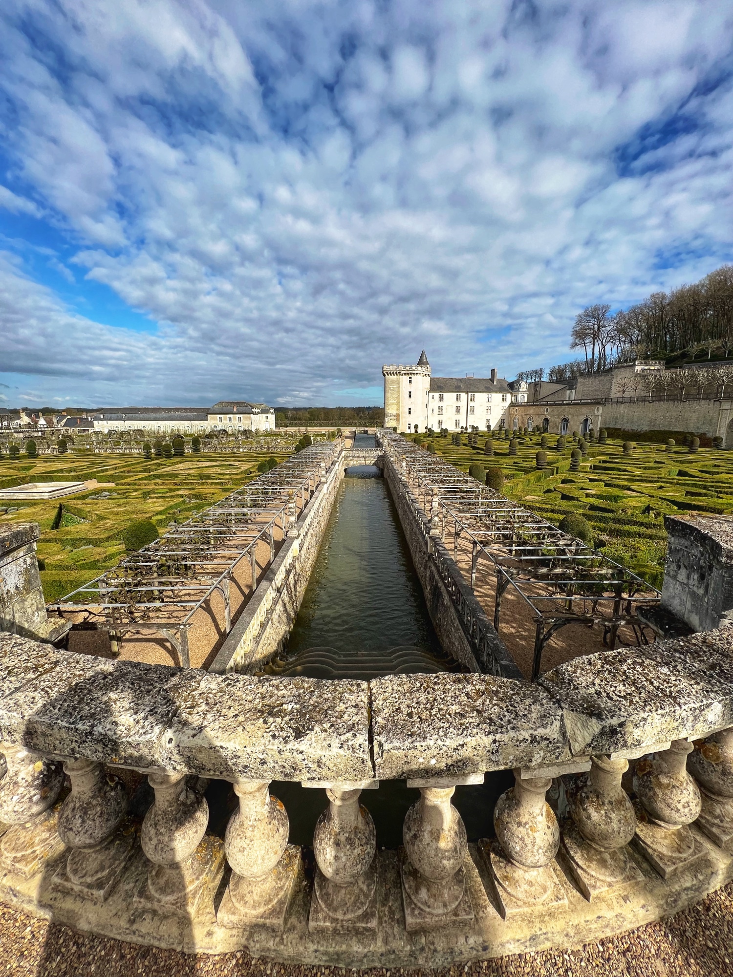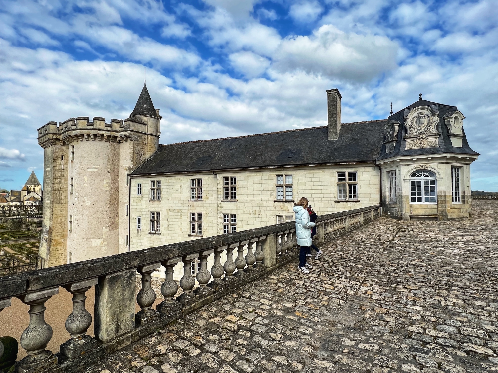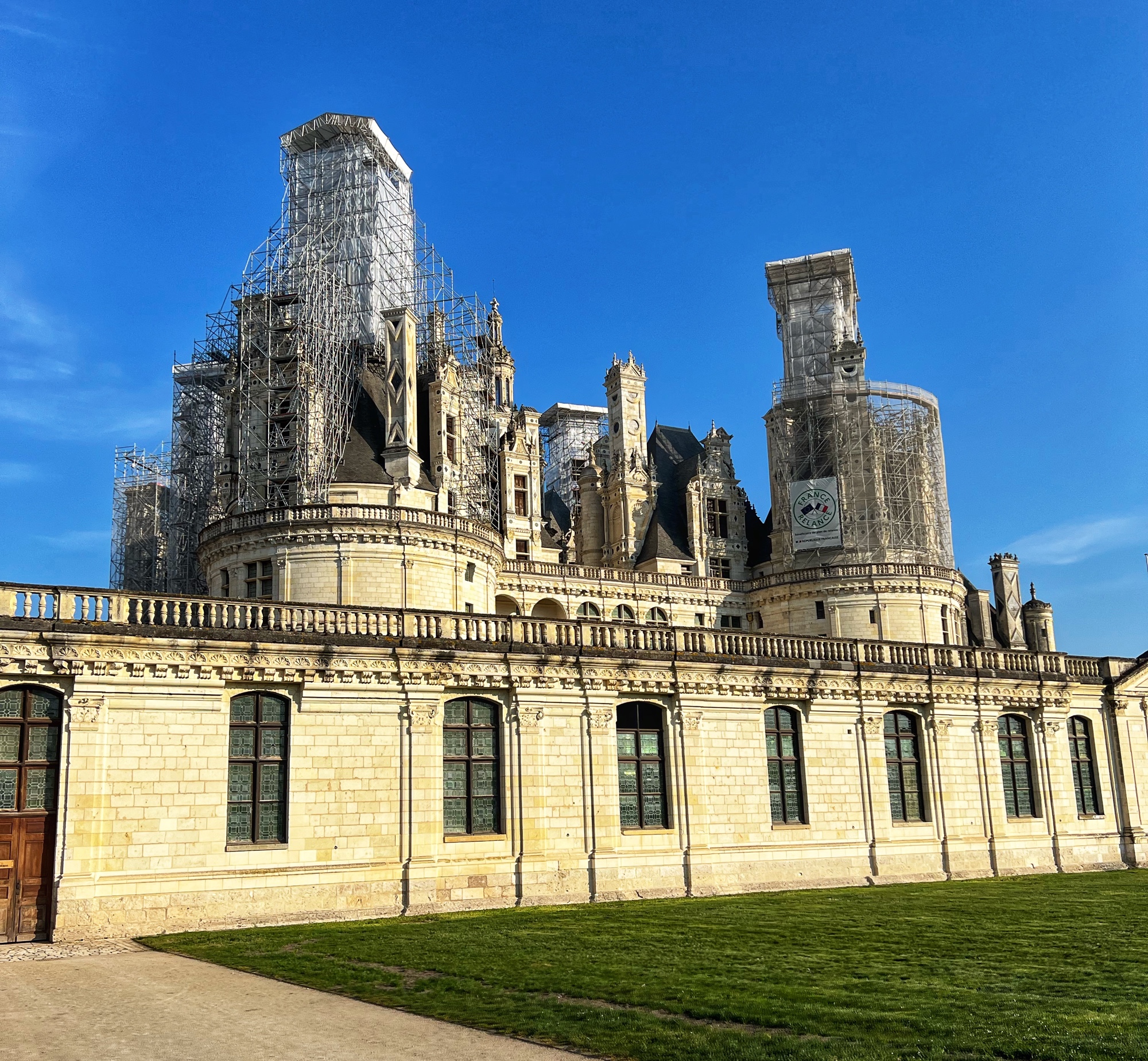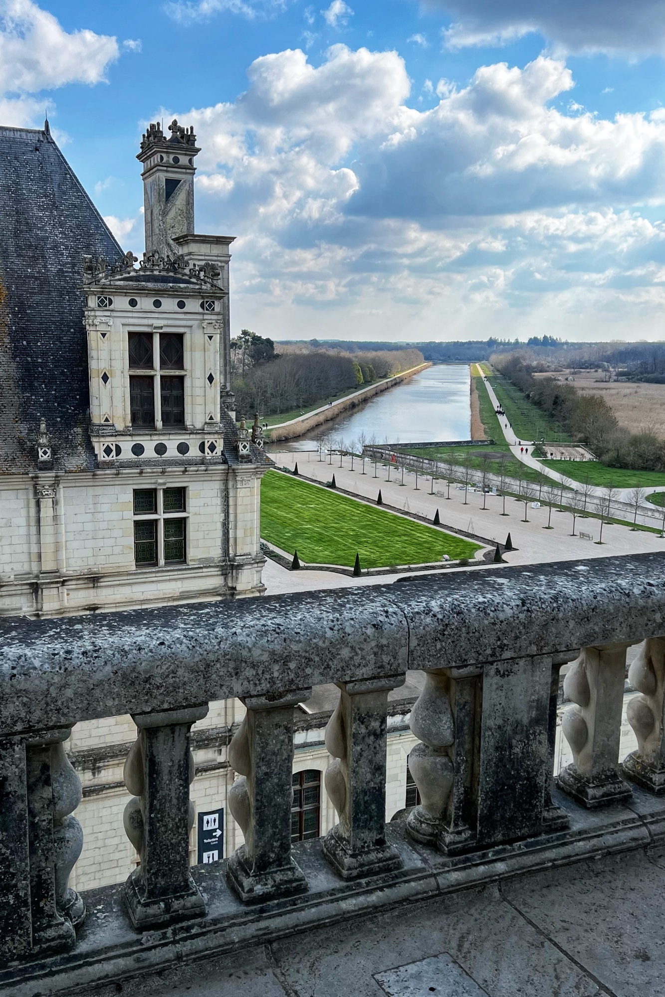 The rooftop is also a phenomenal place that is not to be missed. This is the pièce de résistance! Walking along the rooftop you can see for miles, and in each direction there is a slightly different surrounding of columns, spires and towers. I was a bit disappointed that nearly the entirety of the main towers were covered in scaffolding but happy to see it is being restored. The central “lantern” is exquisite! In just the right light, the “skyline” of the rooftop spires can be seen in the shadows overlooking the courtyard and gardens. Besides Villandry, this is the only other castle with rooftop access that we saw.
