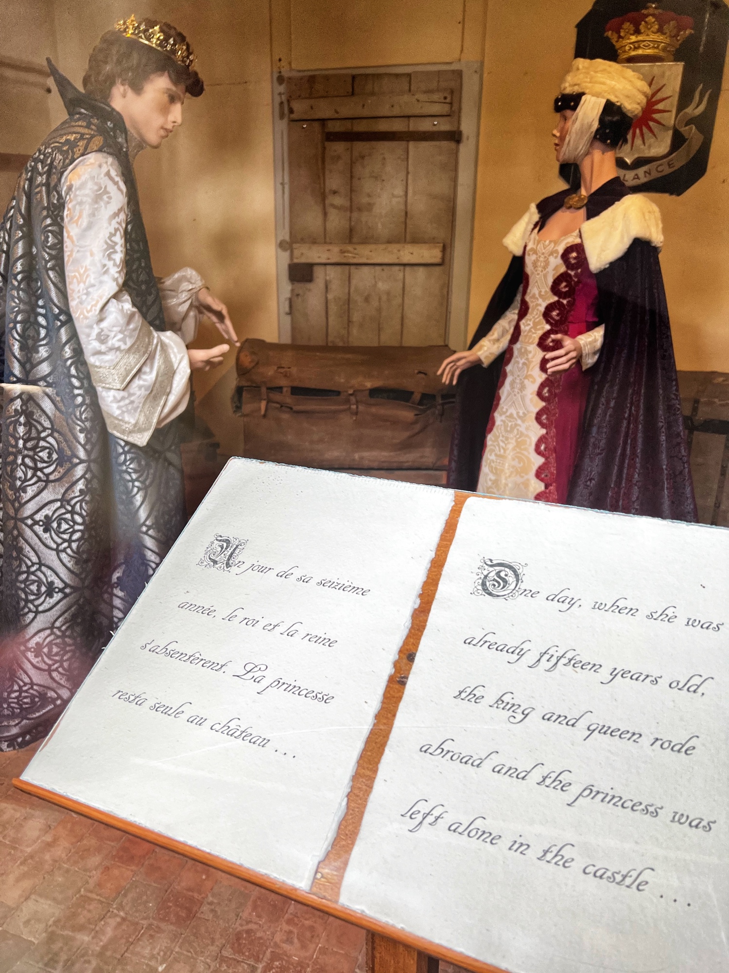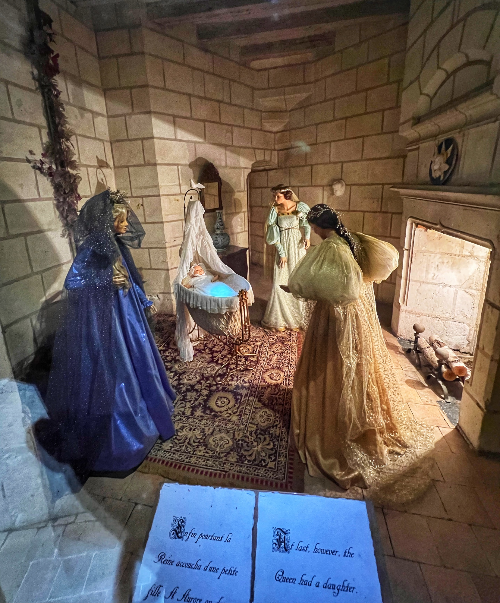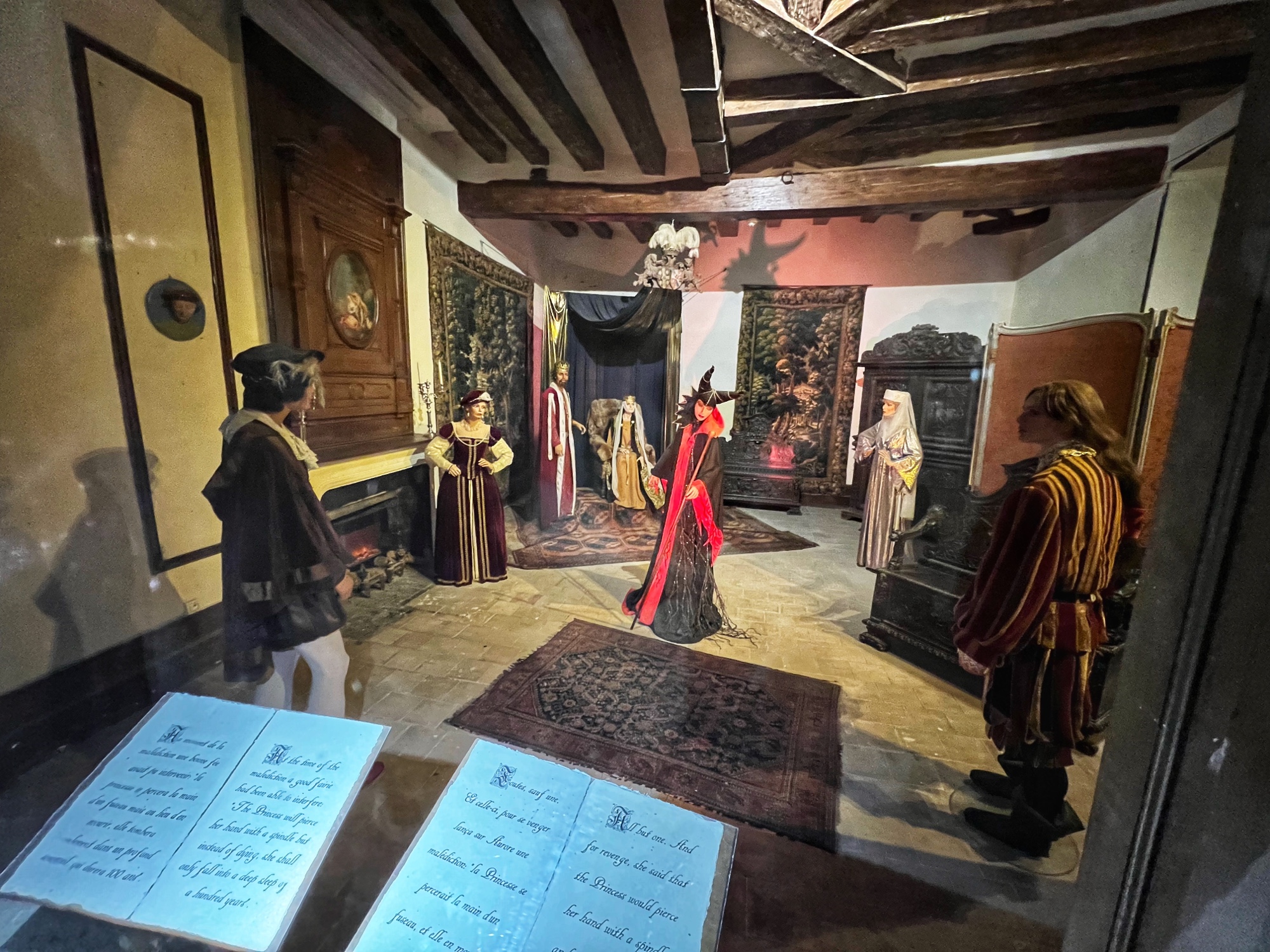 After viewing the various dining rooms, galleries, and fancy bedrooms, the tour will take you up into the towers and along the open air ramparts. Here you can peer into closed rooms, each one telling a portion of the story of Sleeping Beauty. I admit it’s a little bit kitschy (and by then I had had my fill of mannequins), but the girls thought it was cool and immediately wanted to re-watch Disney’s Sleeping Beauty. You also walk through the attic in this castle and it is NOT pristine like in Azay-le-Rideau. Instead it is a creepy, dusty old attic filled with broken memorabilia and cobwebs. It lent itself well to the fairytale story though, giving us the chills as we walked through!