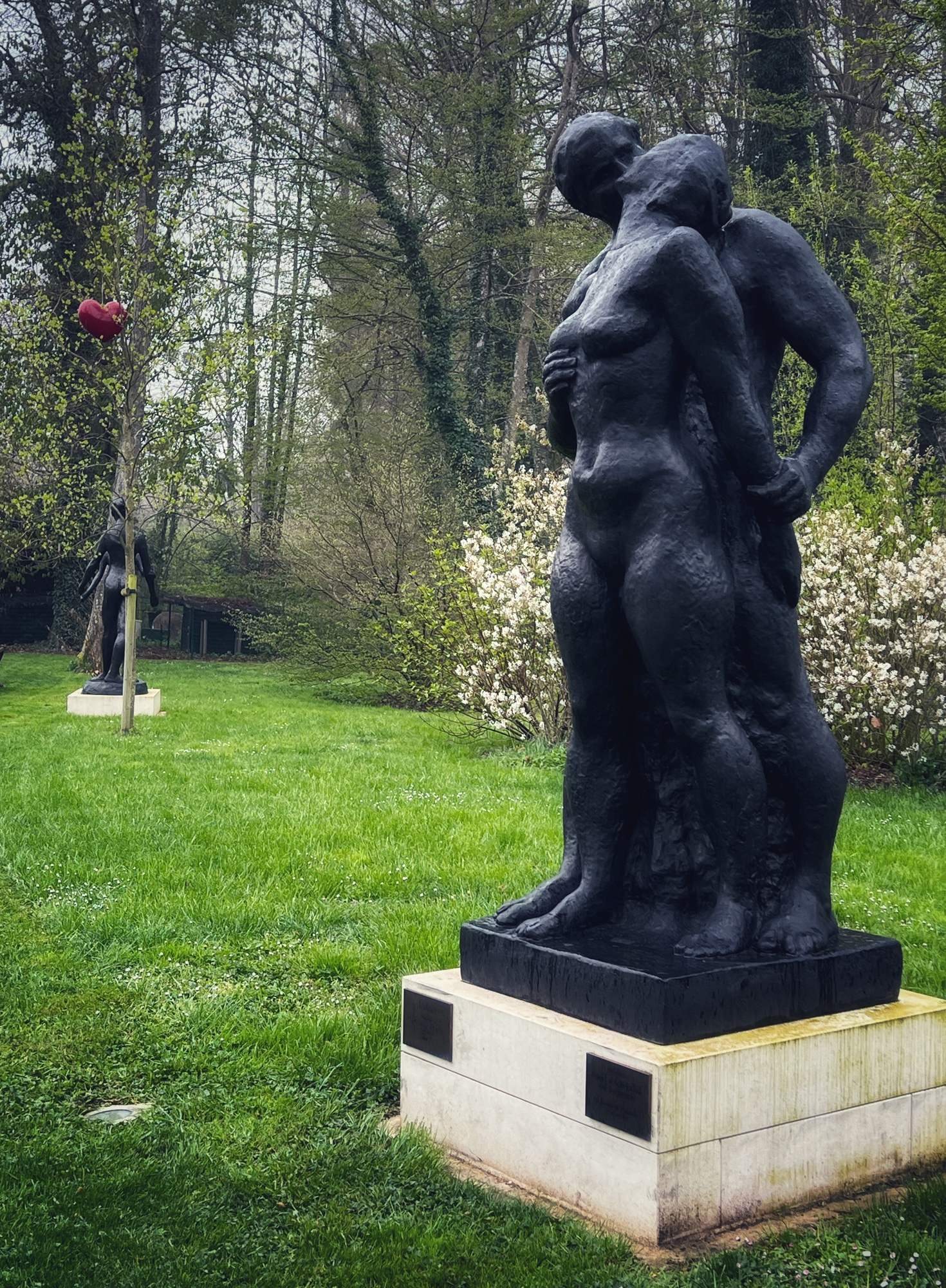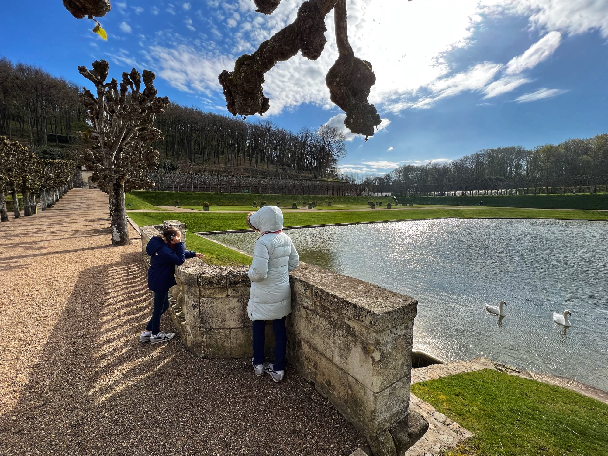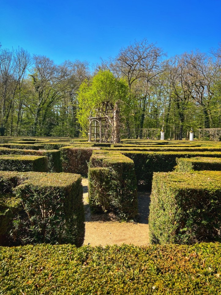 Next we moved along the gardens and “extraordinary trees” towards the Orangerie (not open when we went, but looks beautiful and is famous for its ice cream) and then the maze. I will admit I tried this labyrinth and didn’t have any luck! The girls eventually made it through and it helped warm them up to race and run through the very high hedges. Also here at Cheverny I saw my first black swans! Many castles and places in Europe have swans but I have never seen black ones…and they were nesting! So cool. Next to the pond and along the trails is an erotic “love garden” with various statues of lovers.