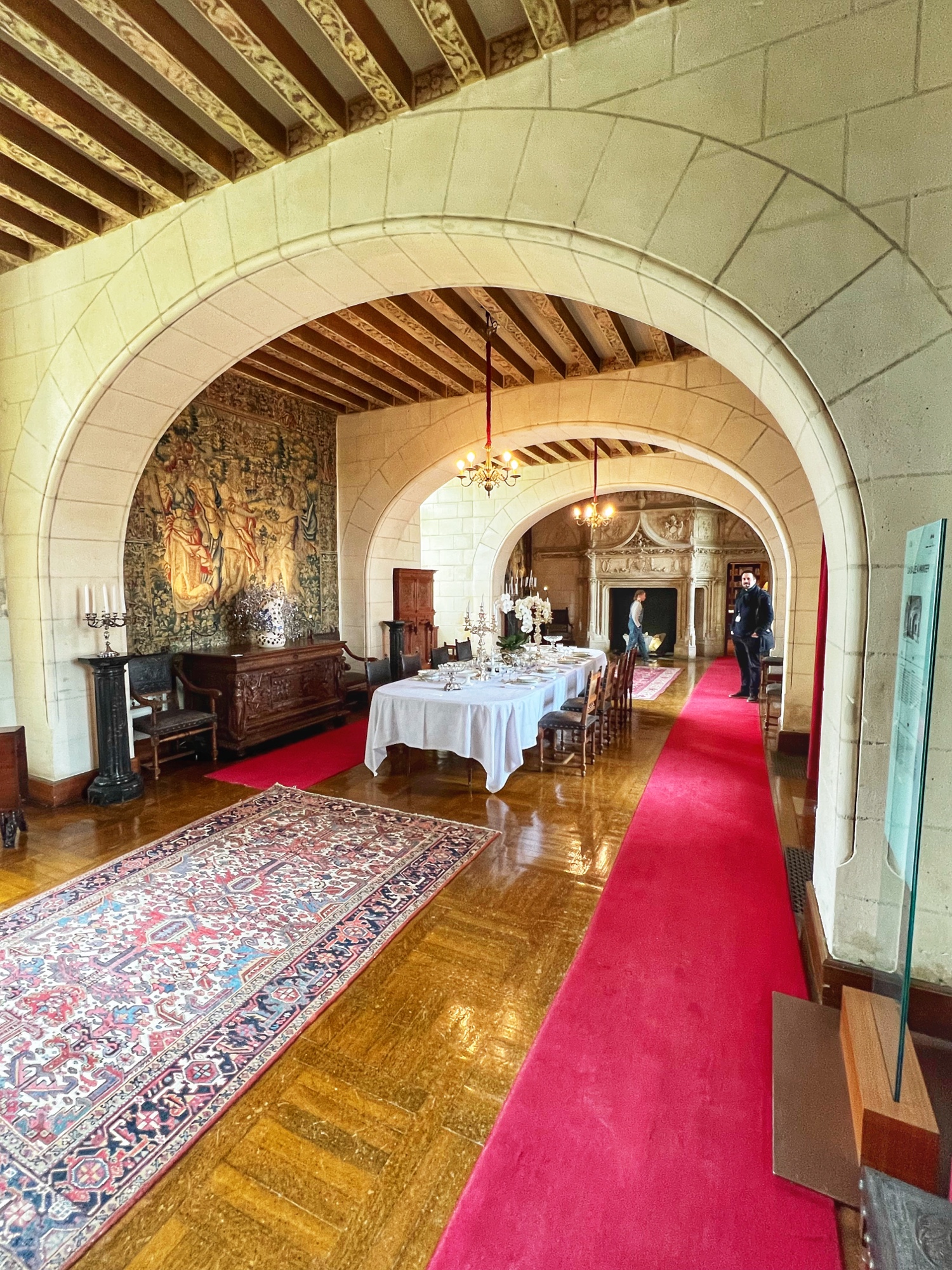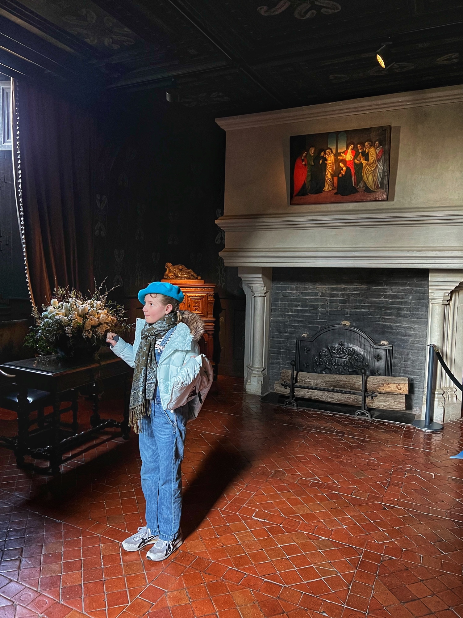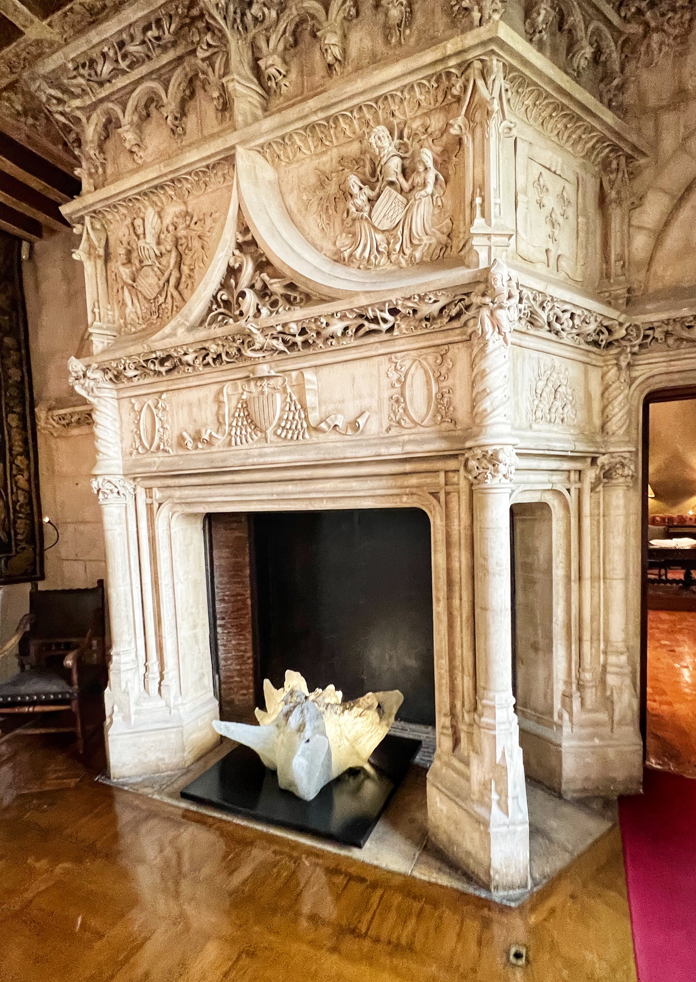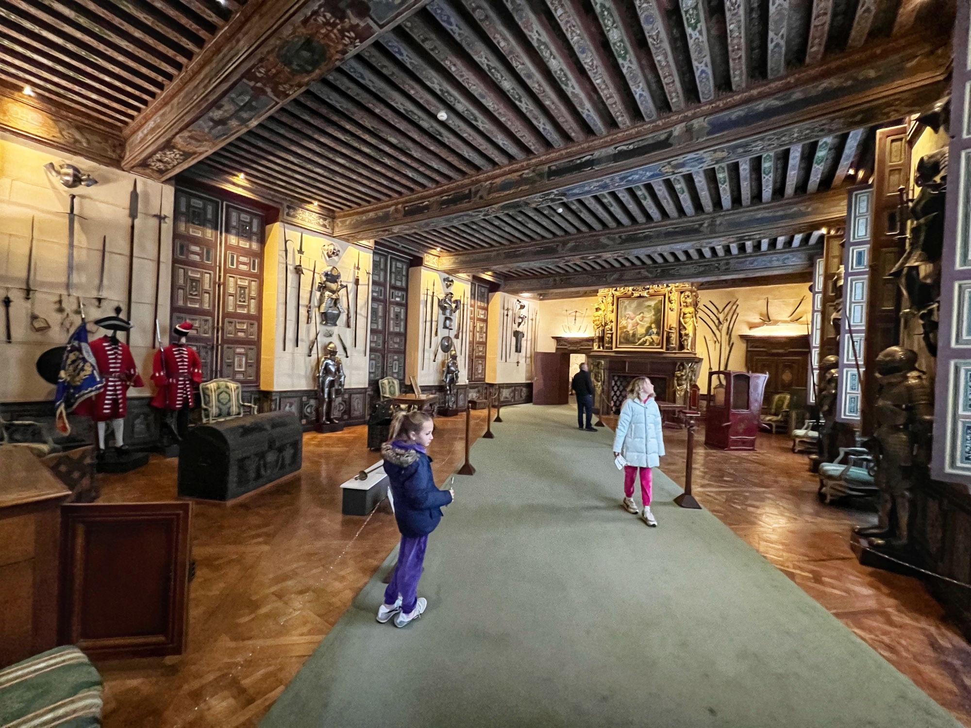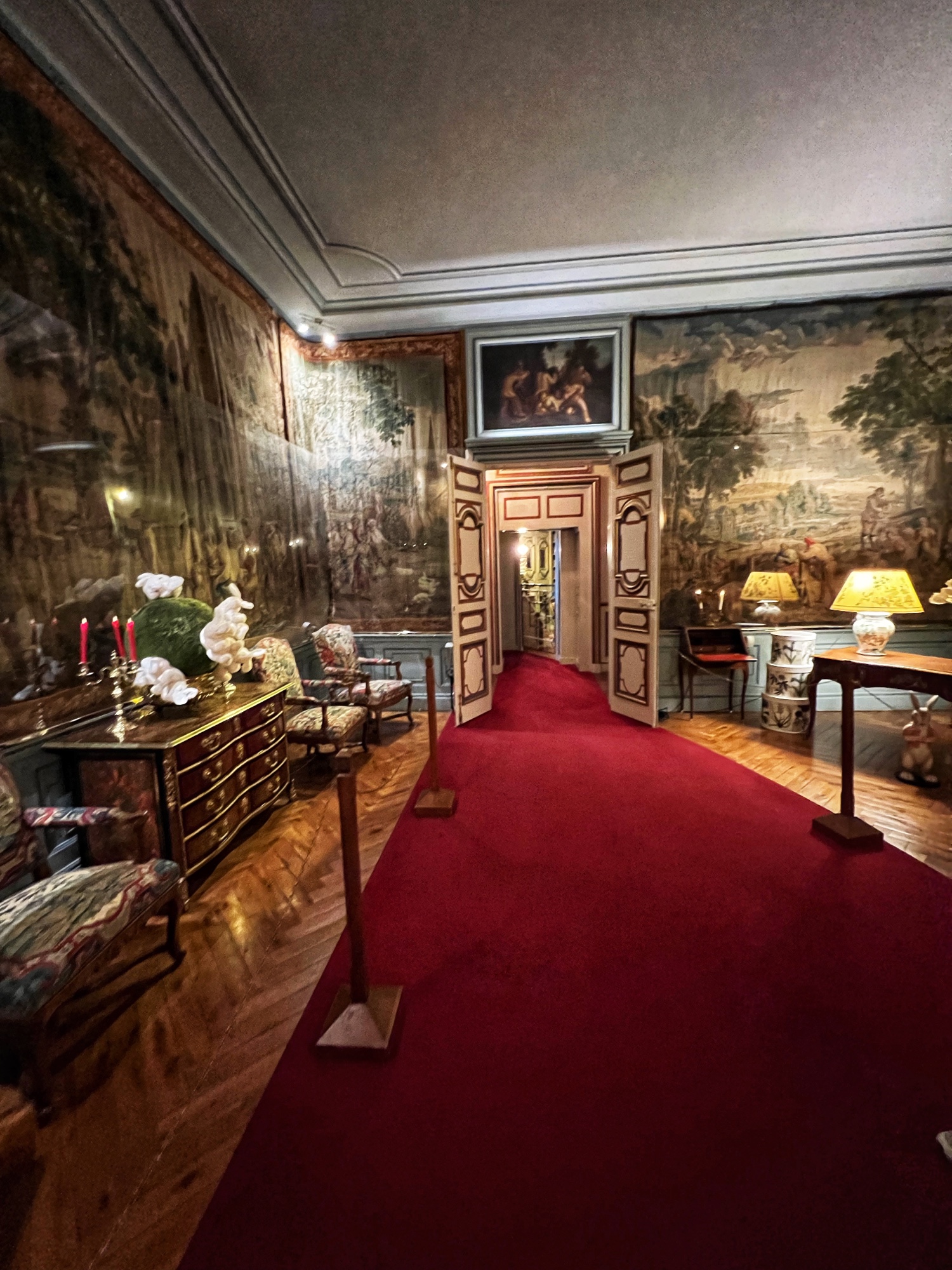 Right away we noticed the tapestries and carved wooden doorways. Also you can see the fire places do not have real fires in them as they are very careful to prevent accidents.