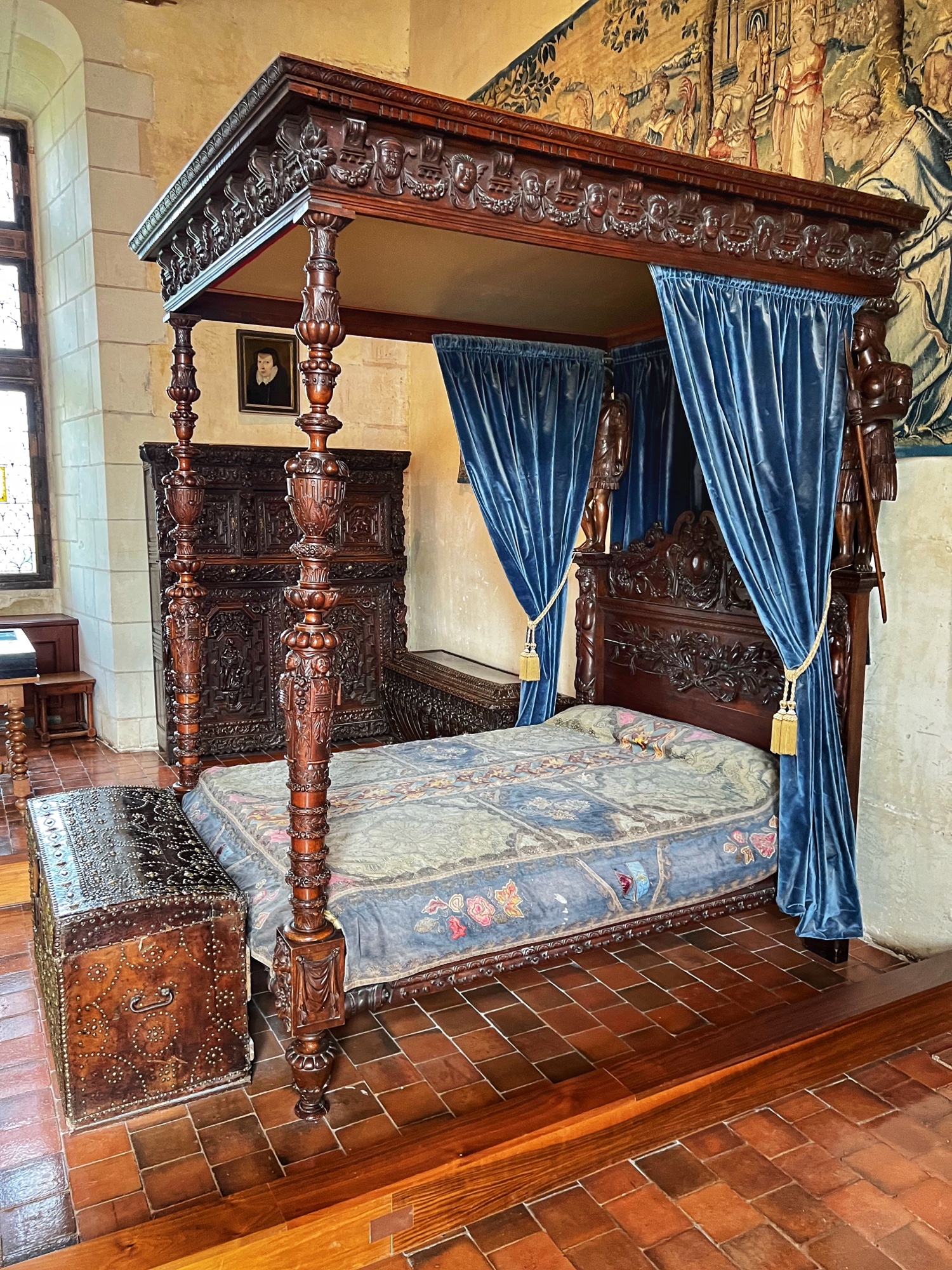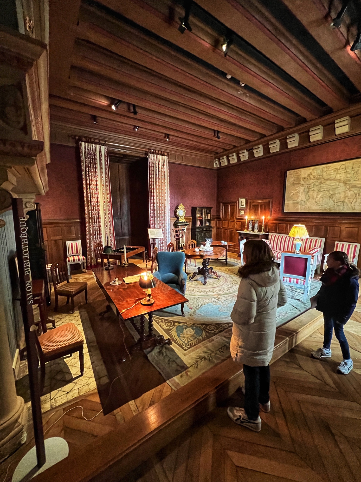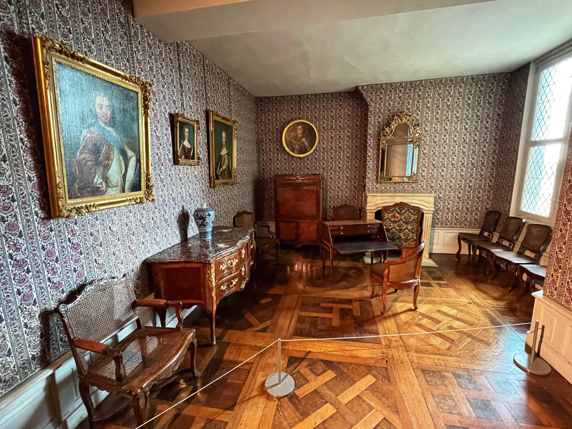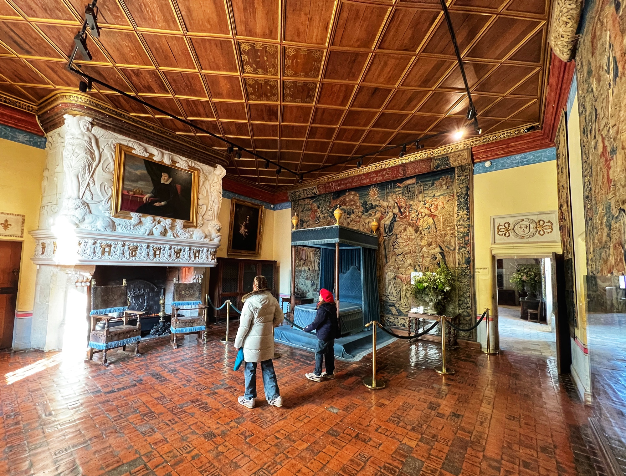 Unique to the châteaus (I don’t remember seeing this anywhere else) but typical of the period, keep an eye out for the “rush mats” or wall coverings made of straw that adorn the walls, intended to warm up the rooms. How many portraits of kings can you find? How many salamander designs can you find? These are all indicators of nobility. The salamander represented king Francois Ist, who lived at the time many of these châteaus were at their peak.