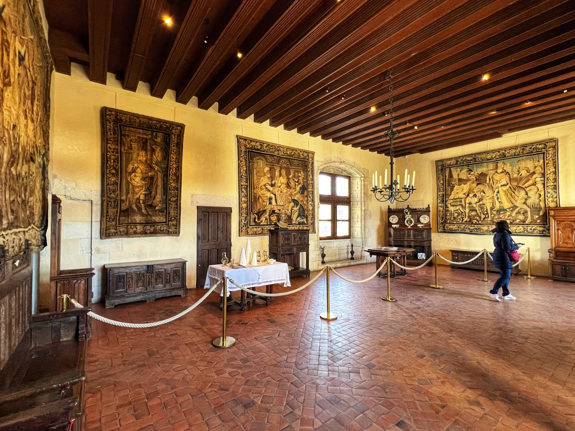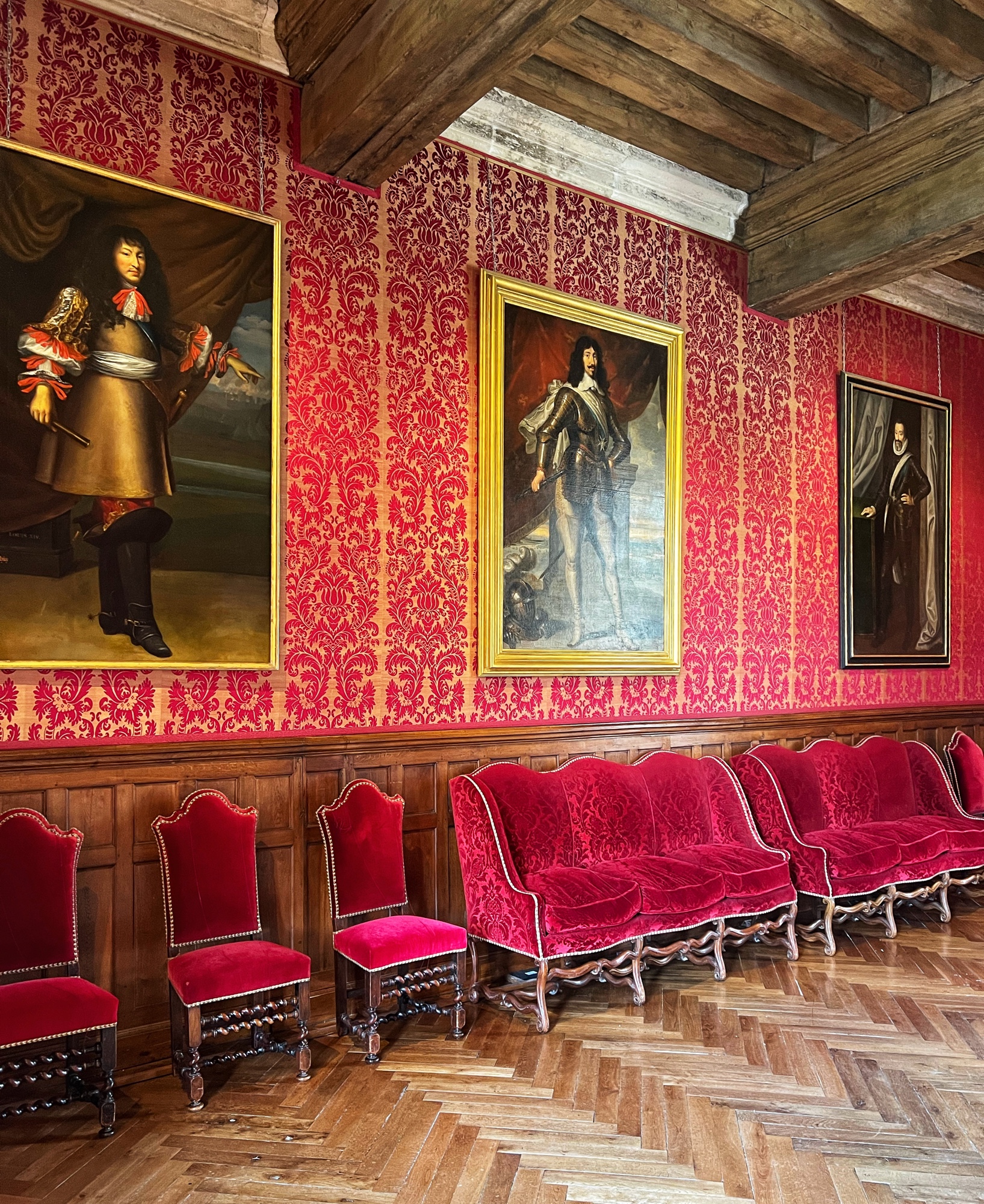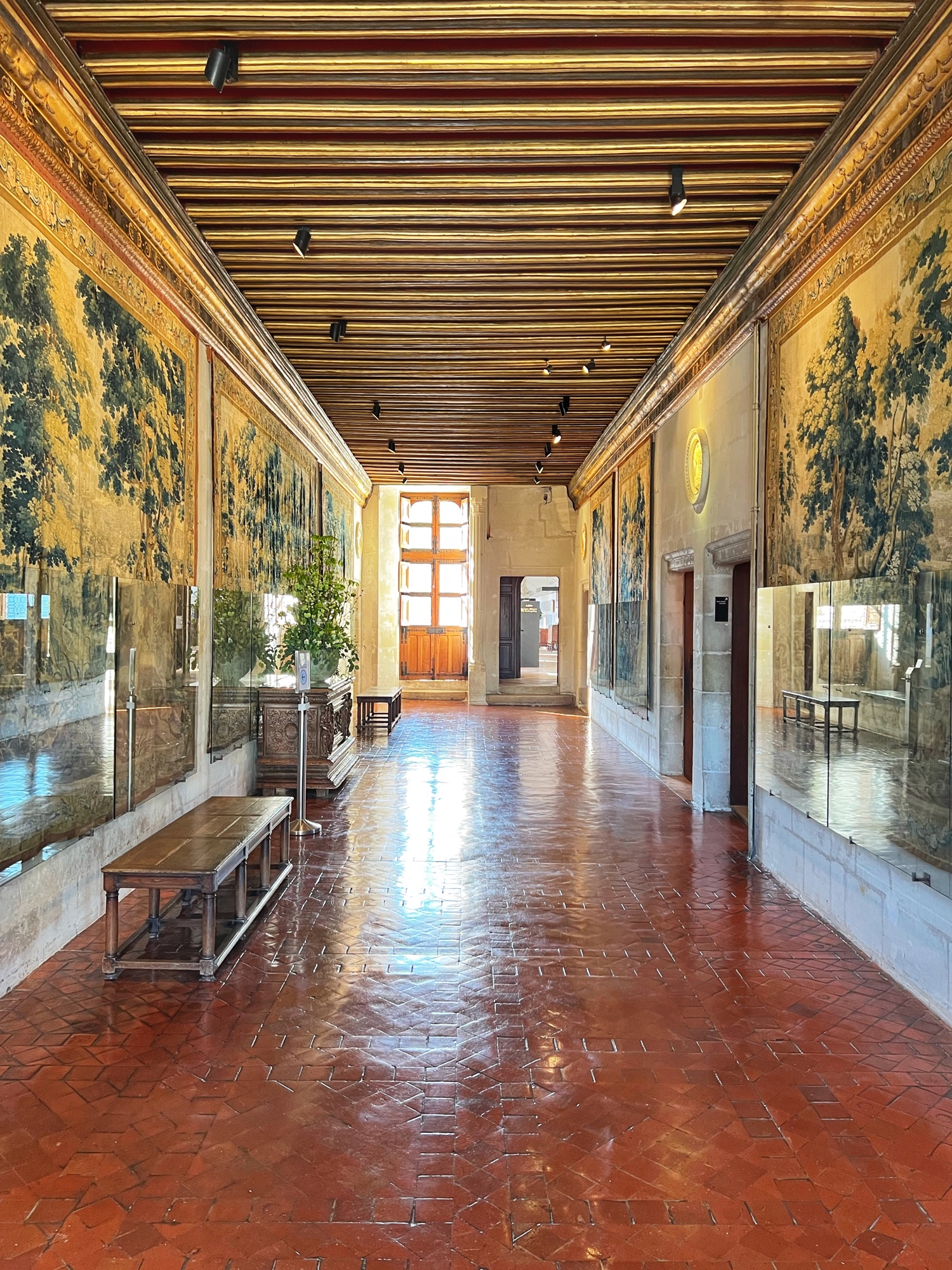 Unique to the châteaus (I don’t remember seeing this anywhere else) but typical of the period, keep an eye out for the “rush mats” or wall coverings made of straw that adorn the walls, intended to warm up the rooms. How many portraits of kings can you find? How many salamander designs can you find? These are all indicators of nobility. The salamander represented king Francois Ist, who lived at the time many of these châteaus were at their peak.