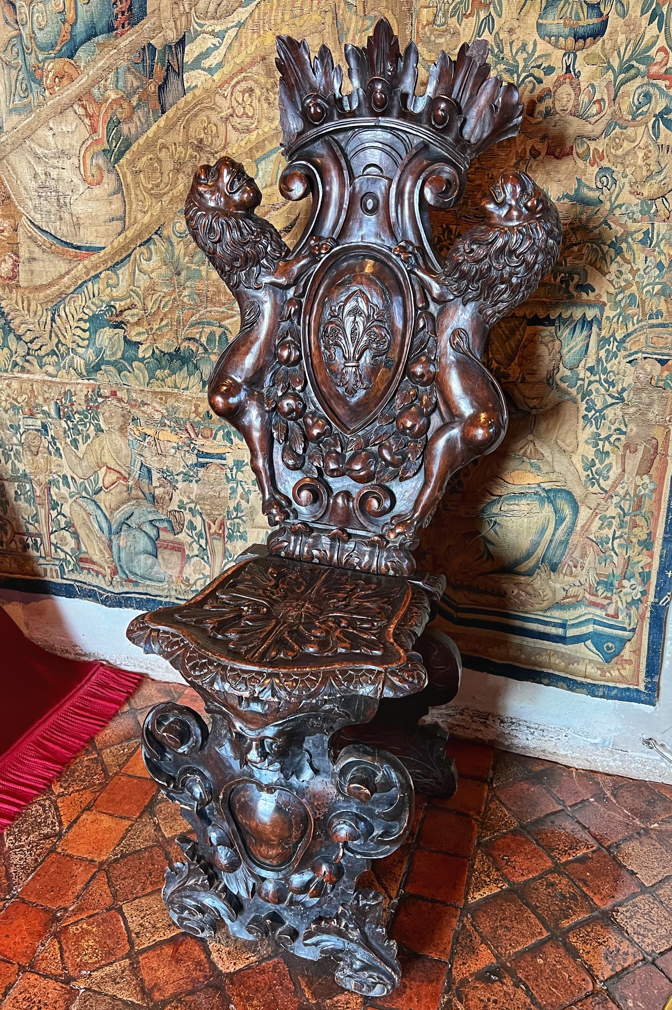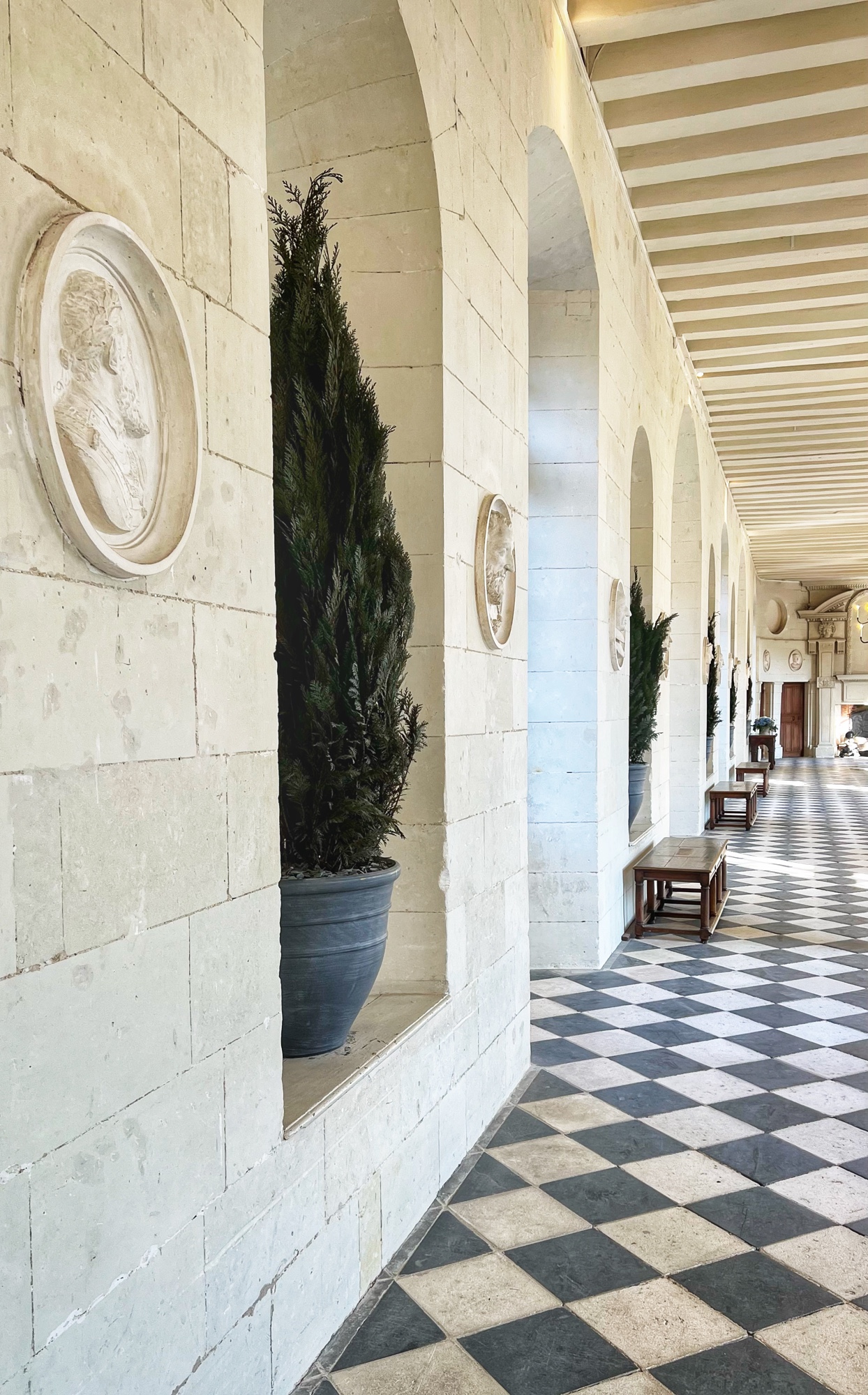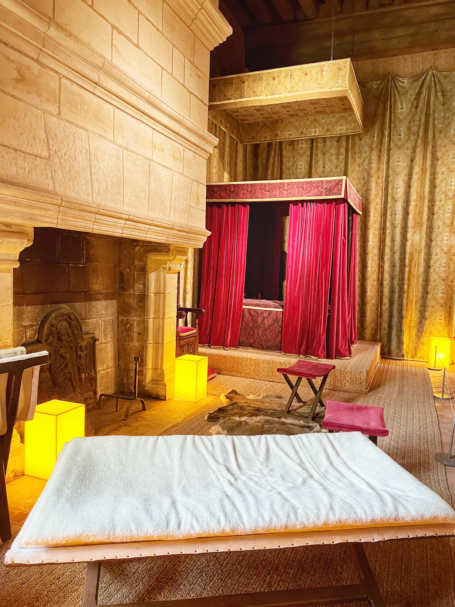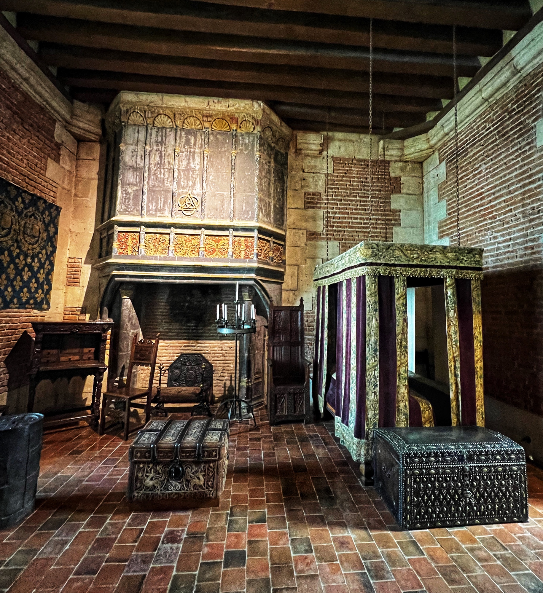 Unique to the châteaus (I don’t remember seeing this anywhere else) but typical of the period, keep an eye out for the “rush mats” or wall coverings made of straw that adorn the walls, intended to warm up the rooms. How many portraits of kings can you find? How many salamander designs can you find? These are all indicators of nobility. The salamander represented king Francois Ist, who lived at the time many of these châteaus were at their peak.