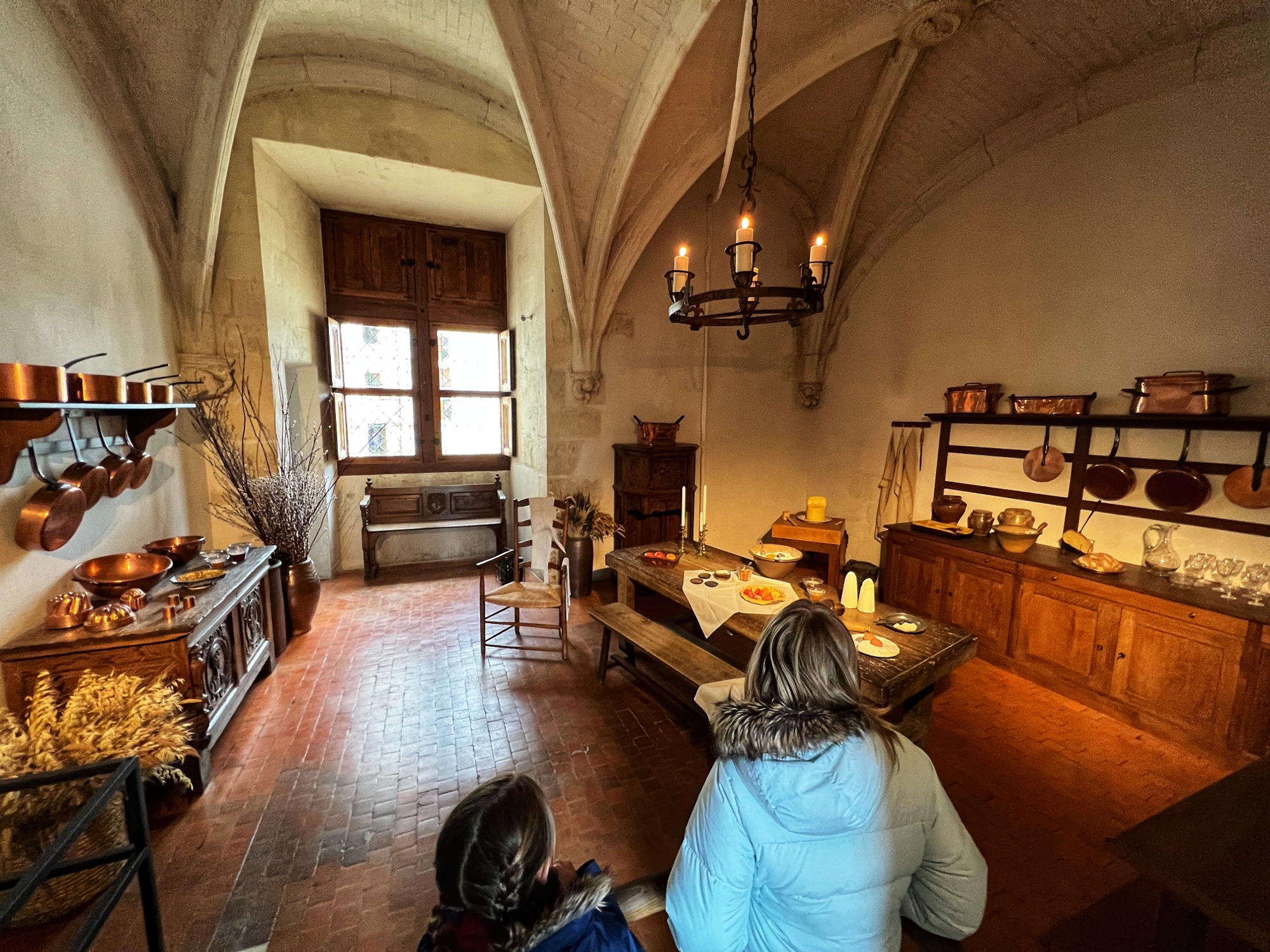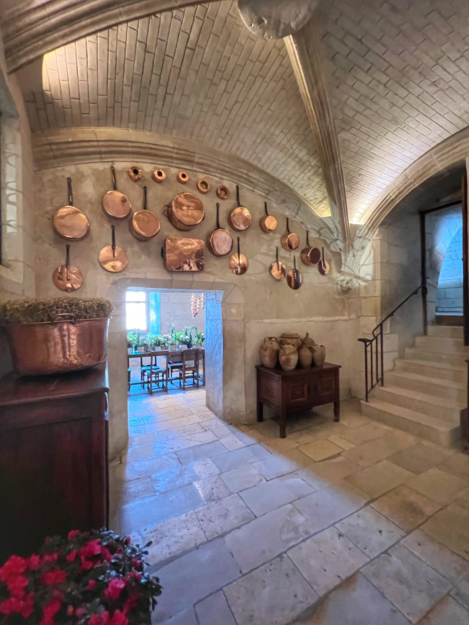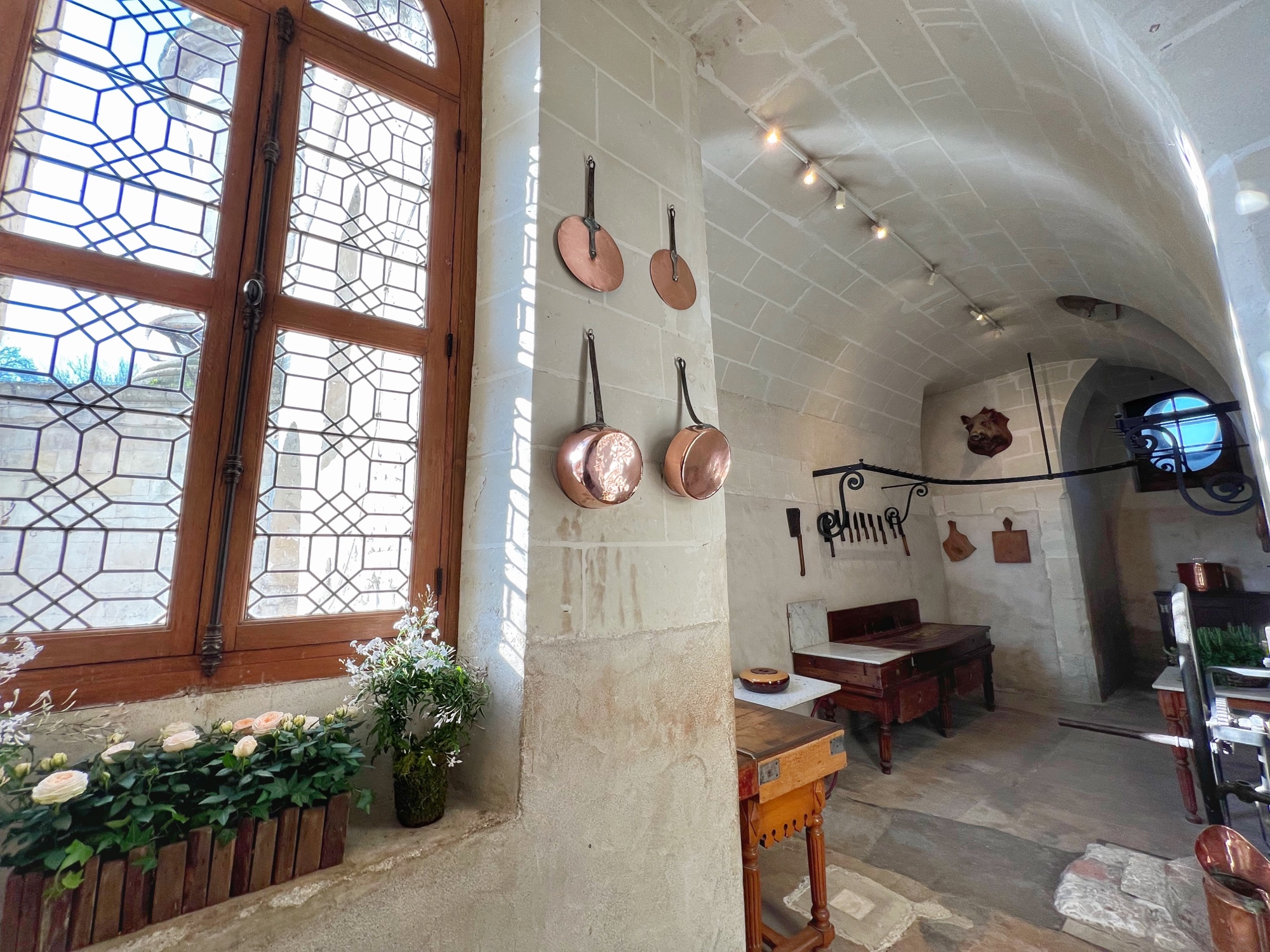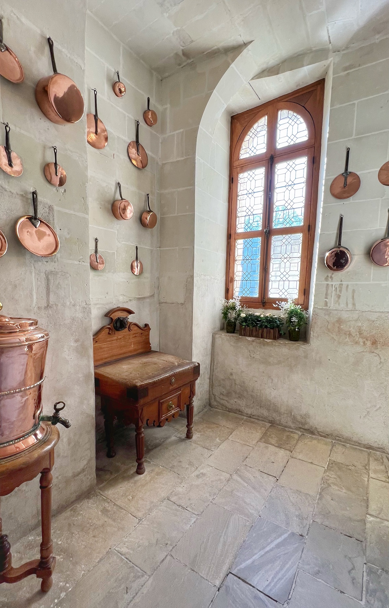 My absolute FAVORITE part of this castle is the series of kitchens. And I do mean series! This is not one big kitchen or a few rooms – it is the entire downstairs of two huge pillars that form the base of the bridge that reaches across the River cher. Pantry, dining area, larder, butchery, bridge, boat mooring area, baking and cooking areas, and all filled with light and beautiful arched ceilings. I could’ve spent hours down there and badly wanted to see it in action. All that copper…all those fresh flowers…all those wooden tables and hutches – such a dream! I’m sure at the time it felt more like a cave than a desirable “selling feature” but that didn’t stop me from drooling.