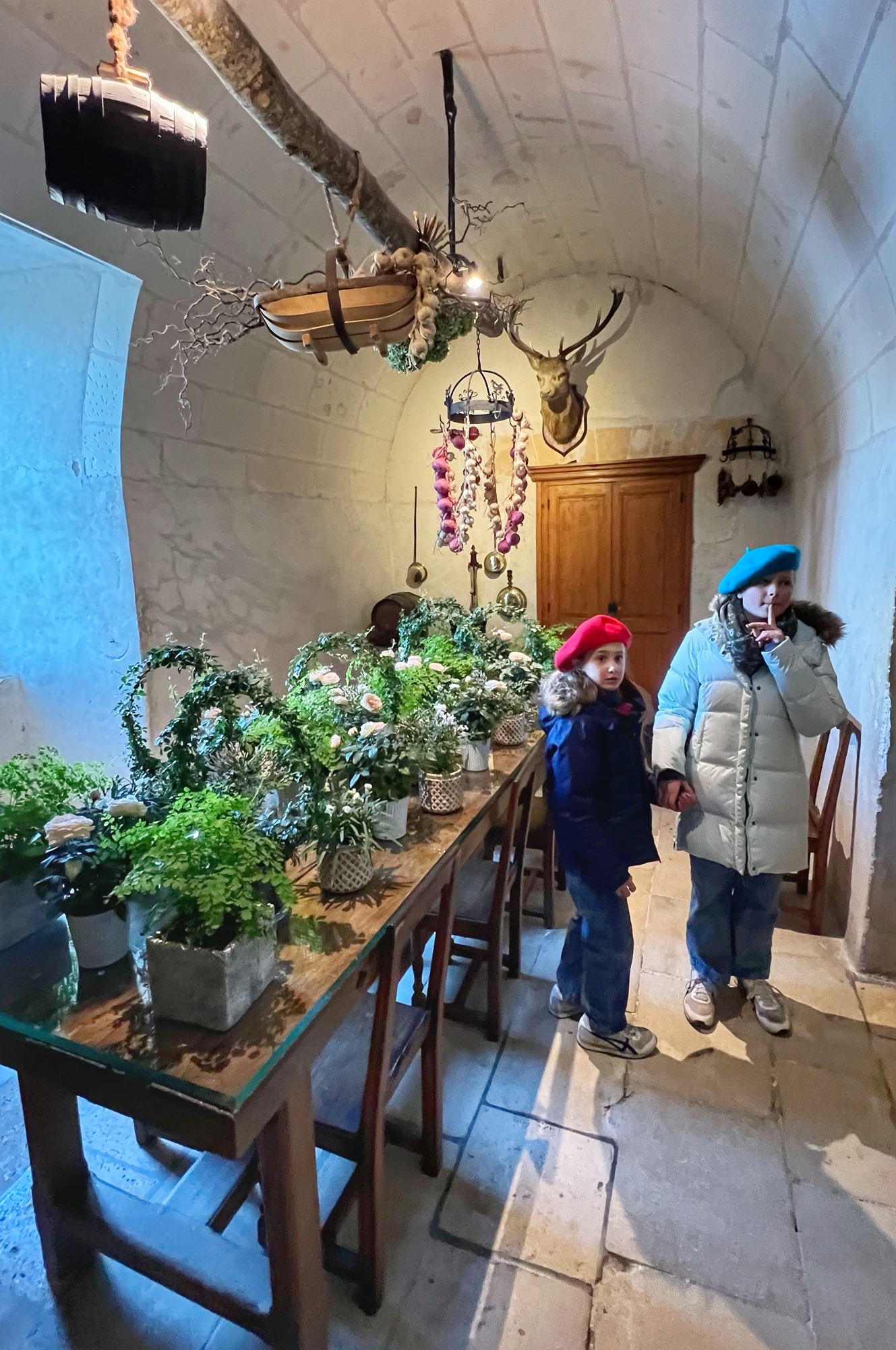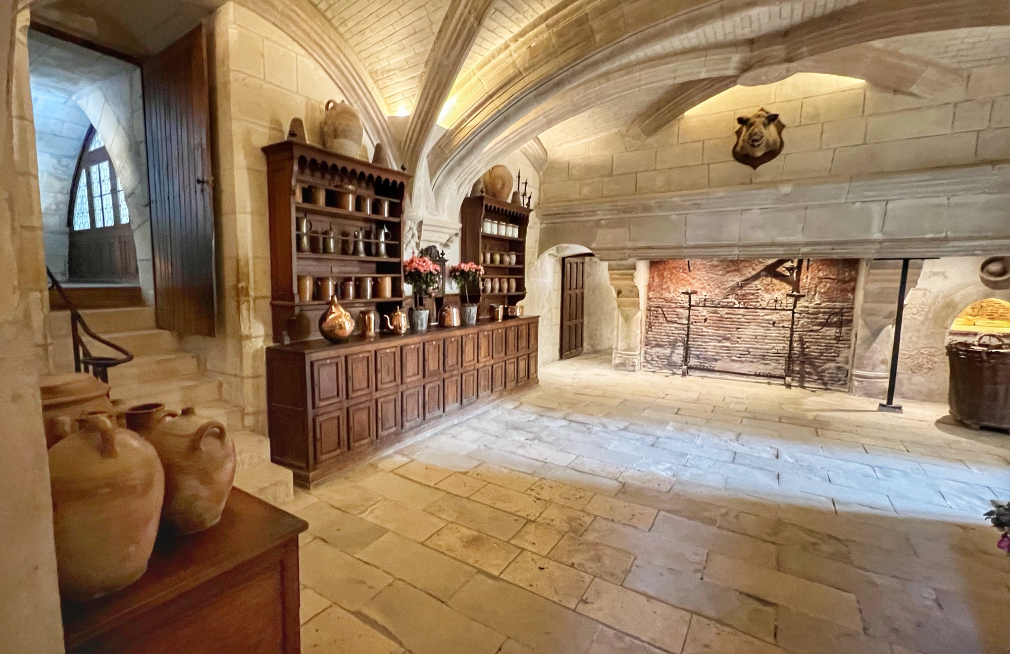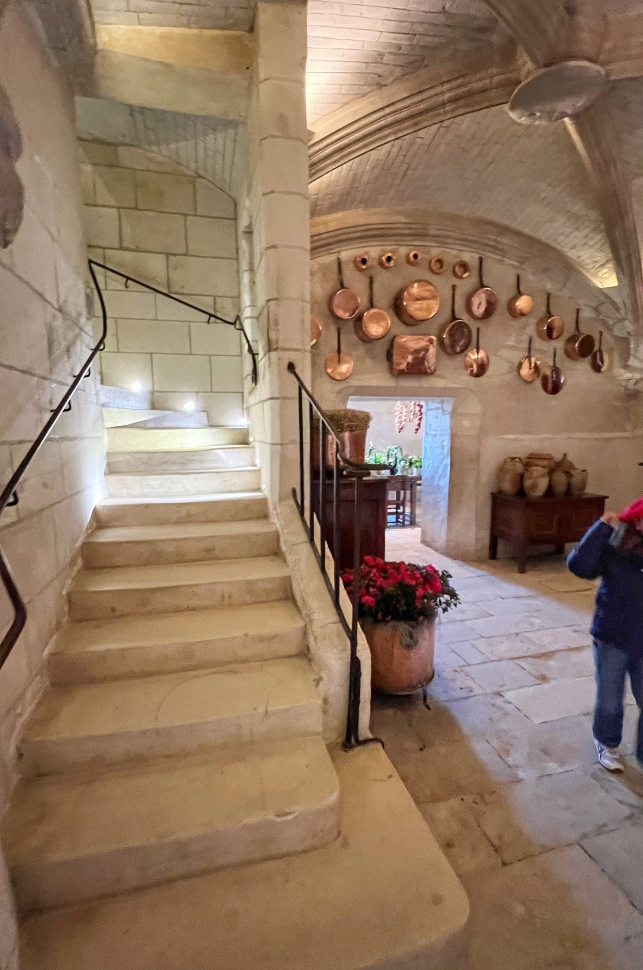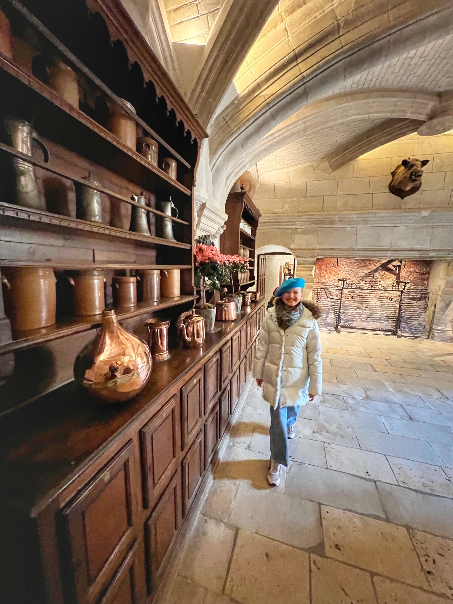 My absolute FAVORITE part of this castle is the series of kitchens. And I do mean series! This is not one big kitchen or a few rooms – it is the entire downstairs of two huge pillars that form the base of the bridge that reaches across the River cher. Pantry, dining area, larder, butchery, bridge, boat mooring area, baking and cooking areas, and all filled with light and beautiful arched ceilings. I could’ve spent hours down there and badly wanted to see it in action. All that copper…all those fresh flowers…all those wooden tables and hutches – such a dream! I’m sure at the time it felt more like a cave than a desirable “selling feature” but that didn’t stop me from drooling.