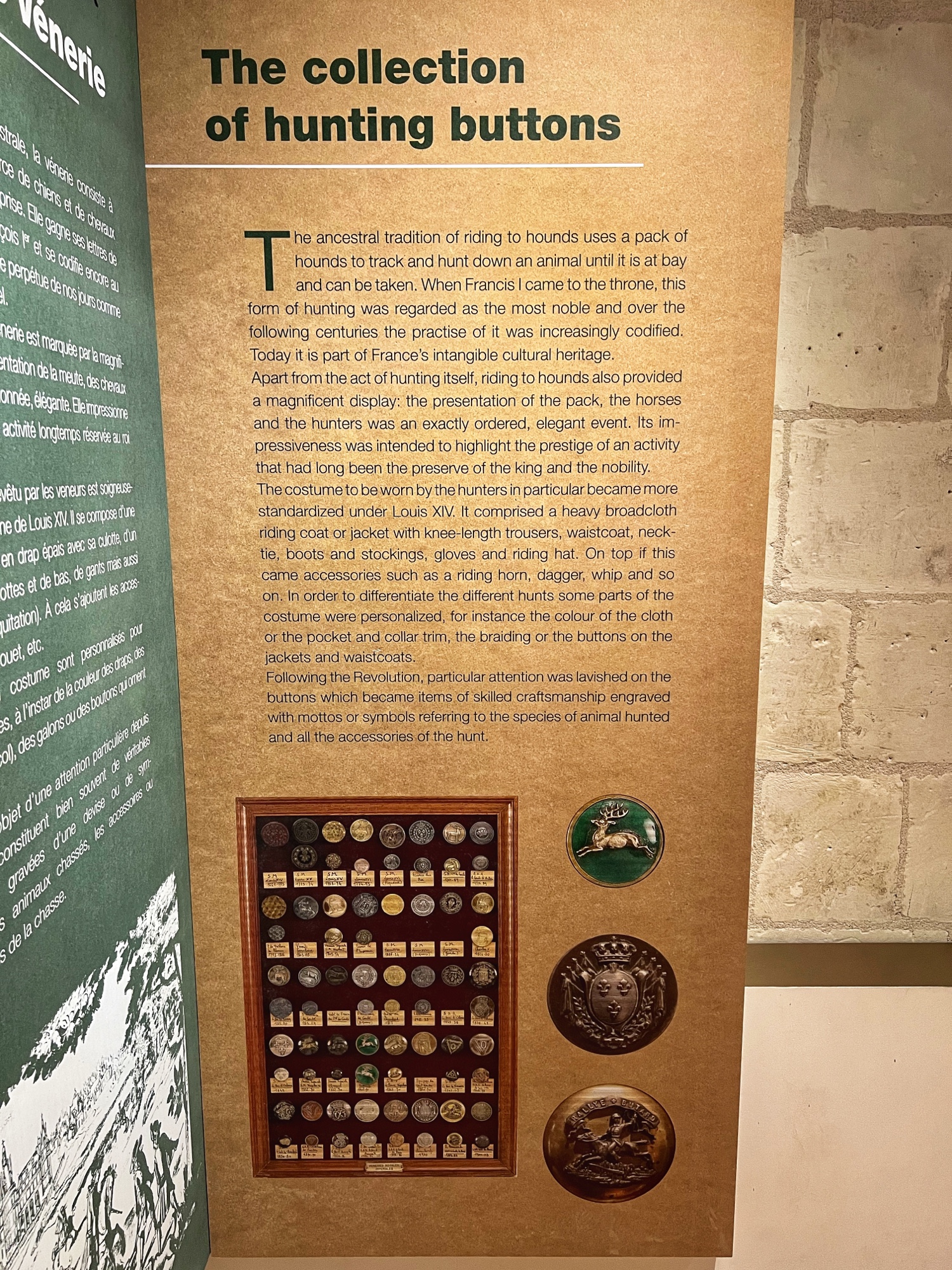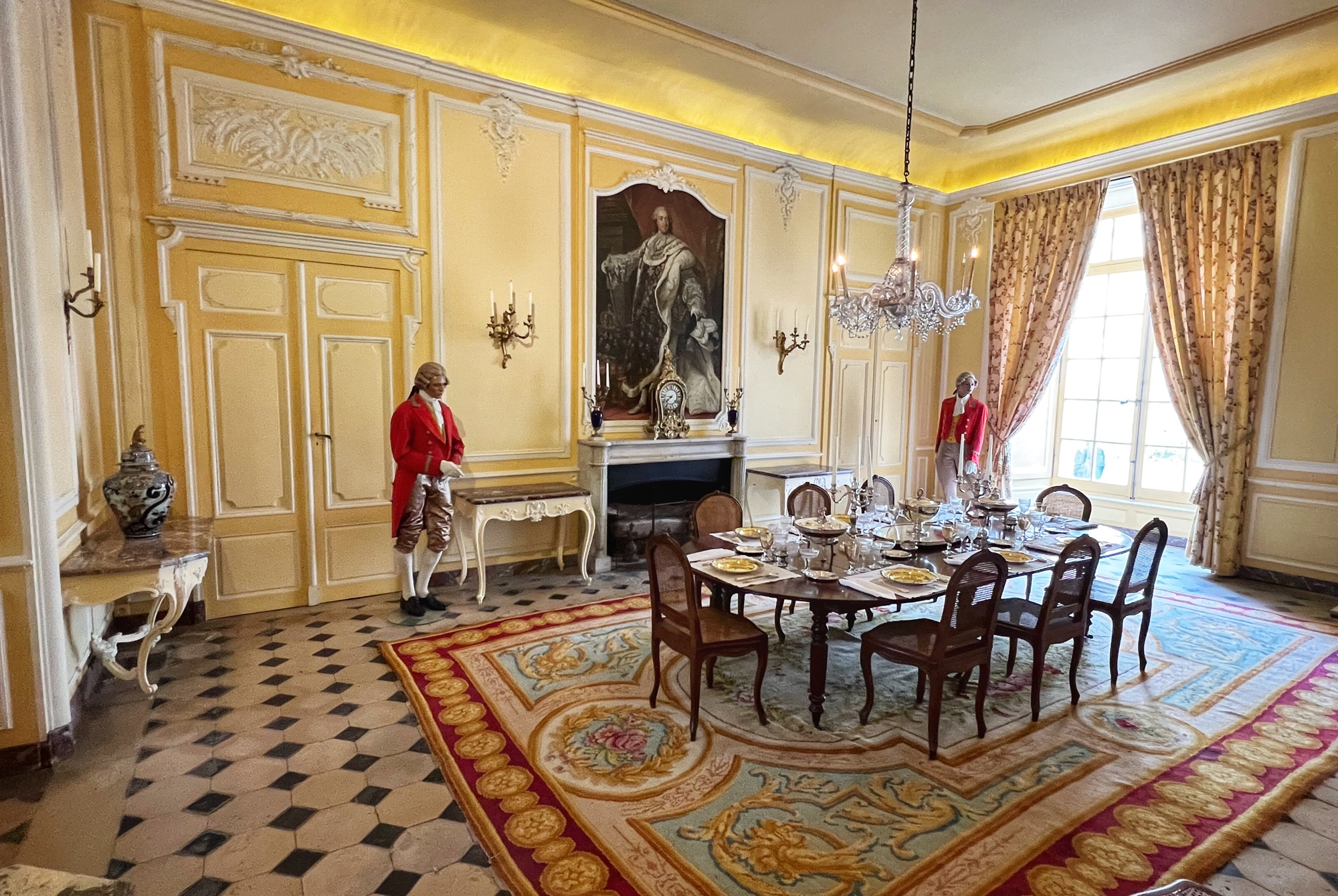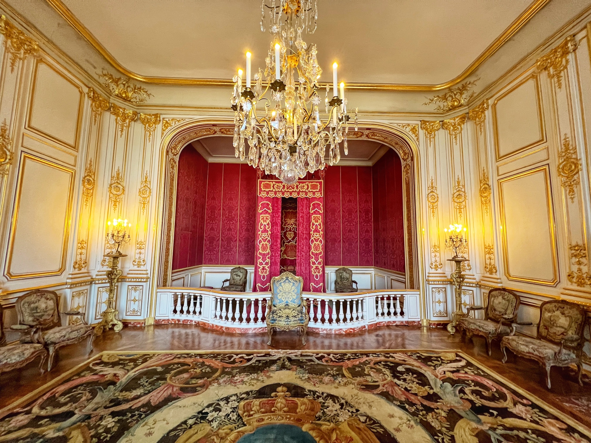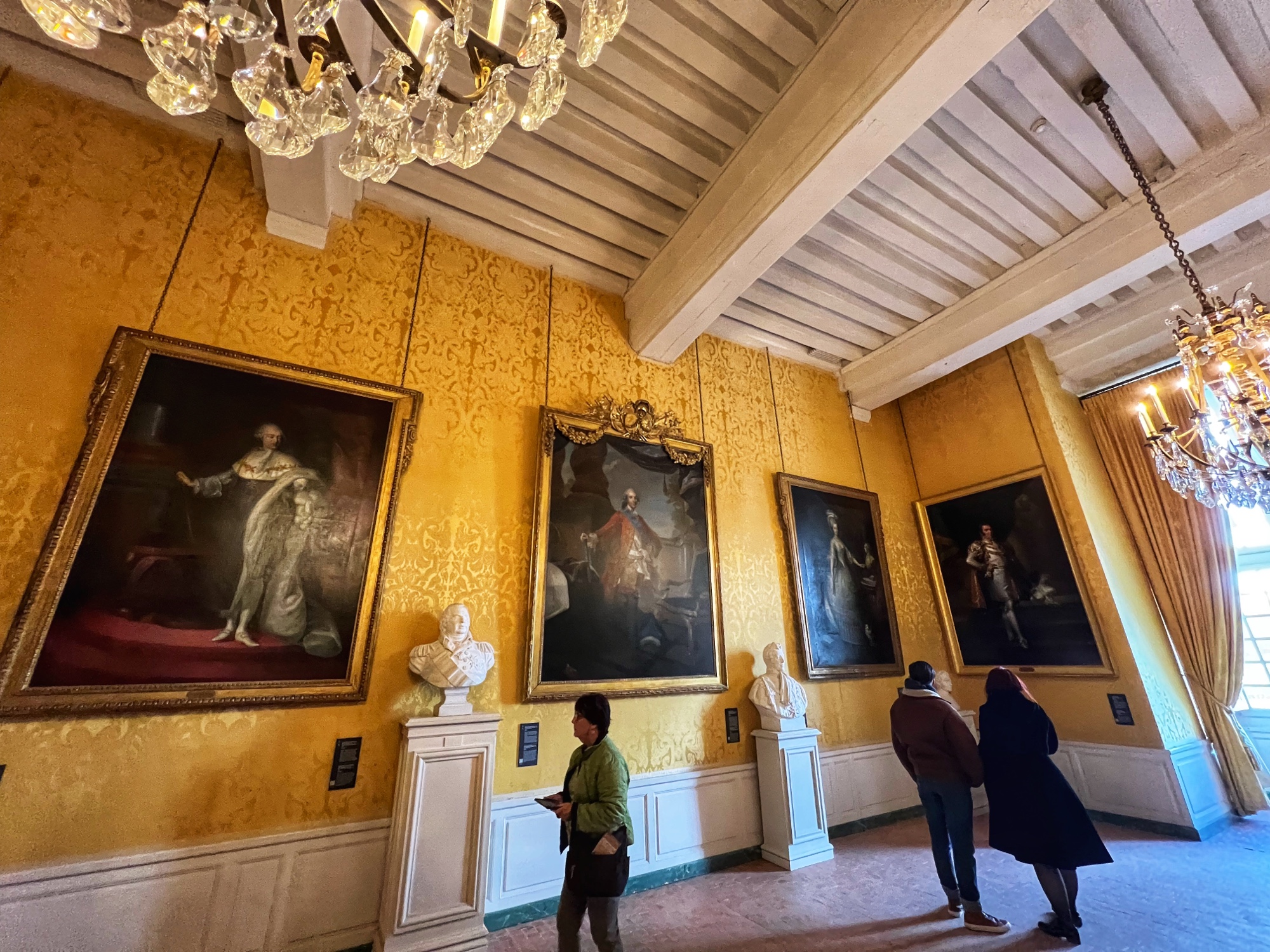 We loved learning about the hunting traditions in the Hunting room (yikes! The paintings of dogs are kind of gruesome), the massive custom button collection (who knew buttons were such a badge of honor?), throne room, pottery, furniture, and old ruins from restorations. The carriages are amazing too – and to think that all of this furniture, fabric, wall coverings, art and belongings were transported here (and everywhere the King went) for only a few weeks at a time!