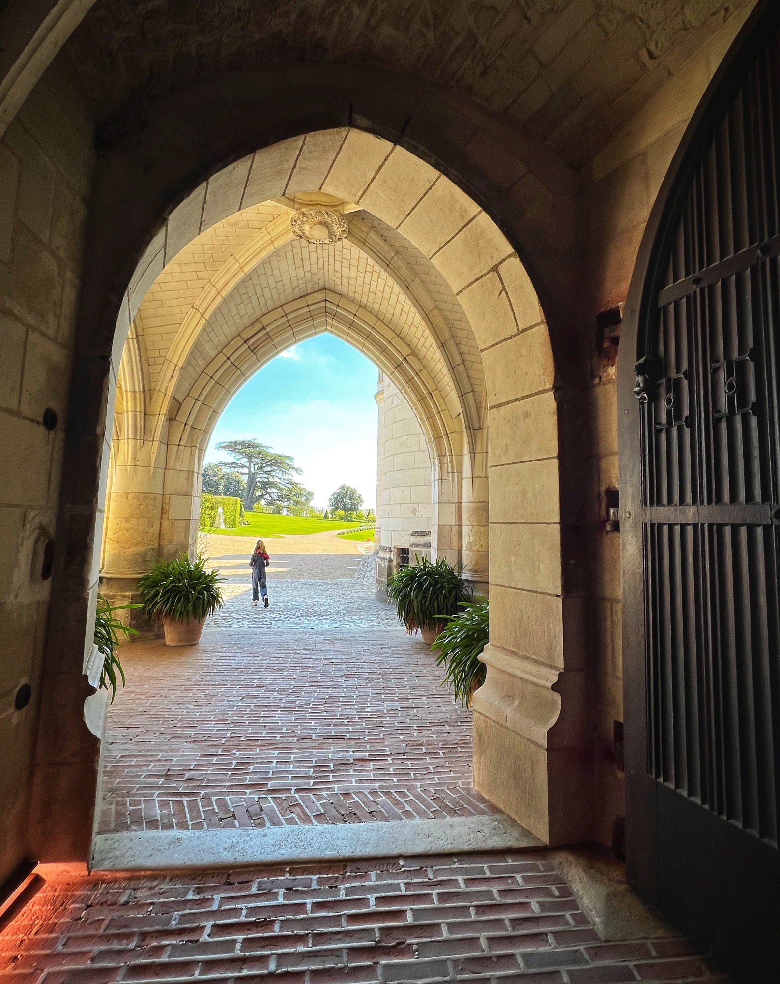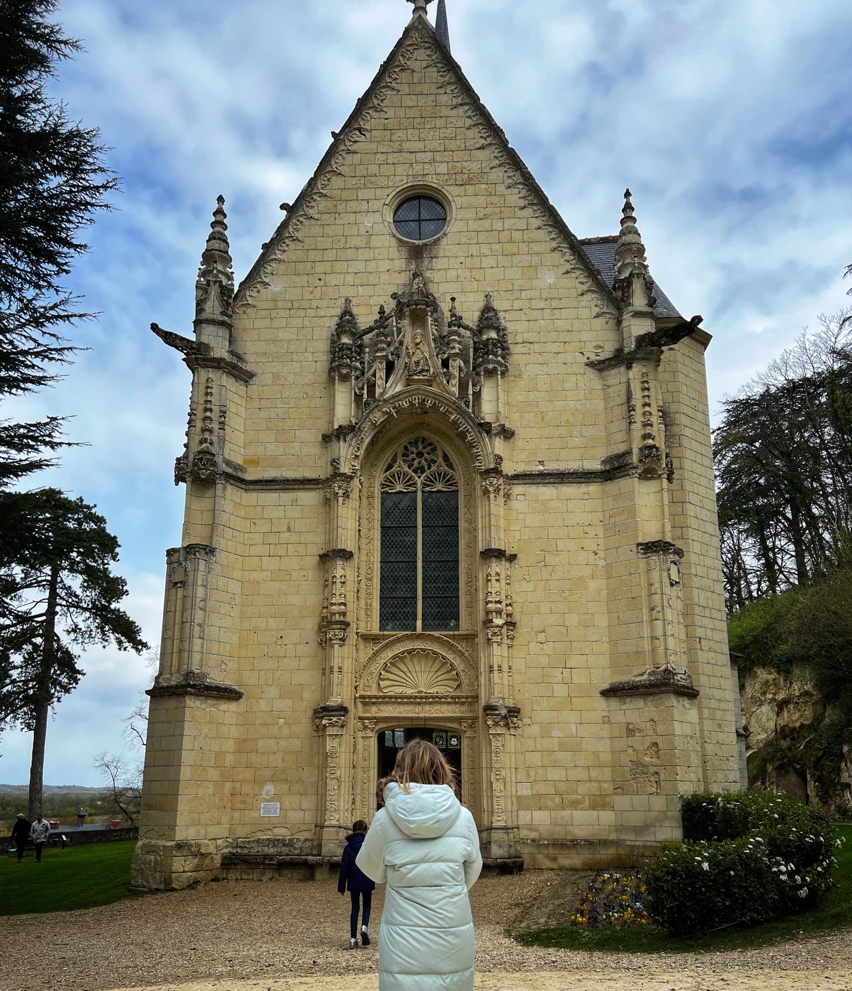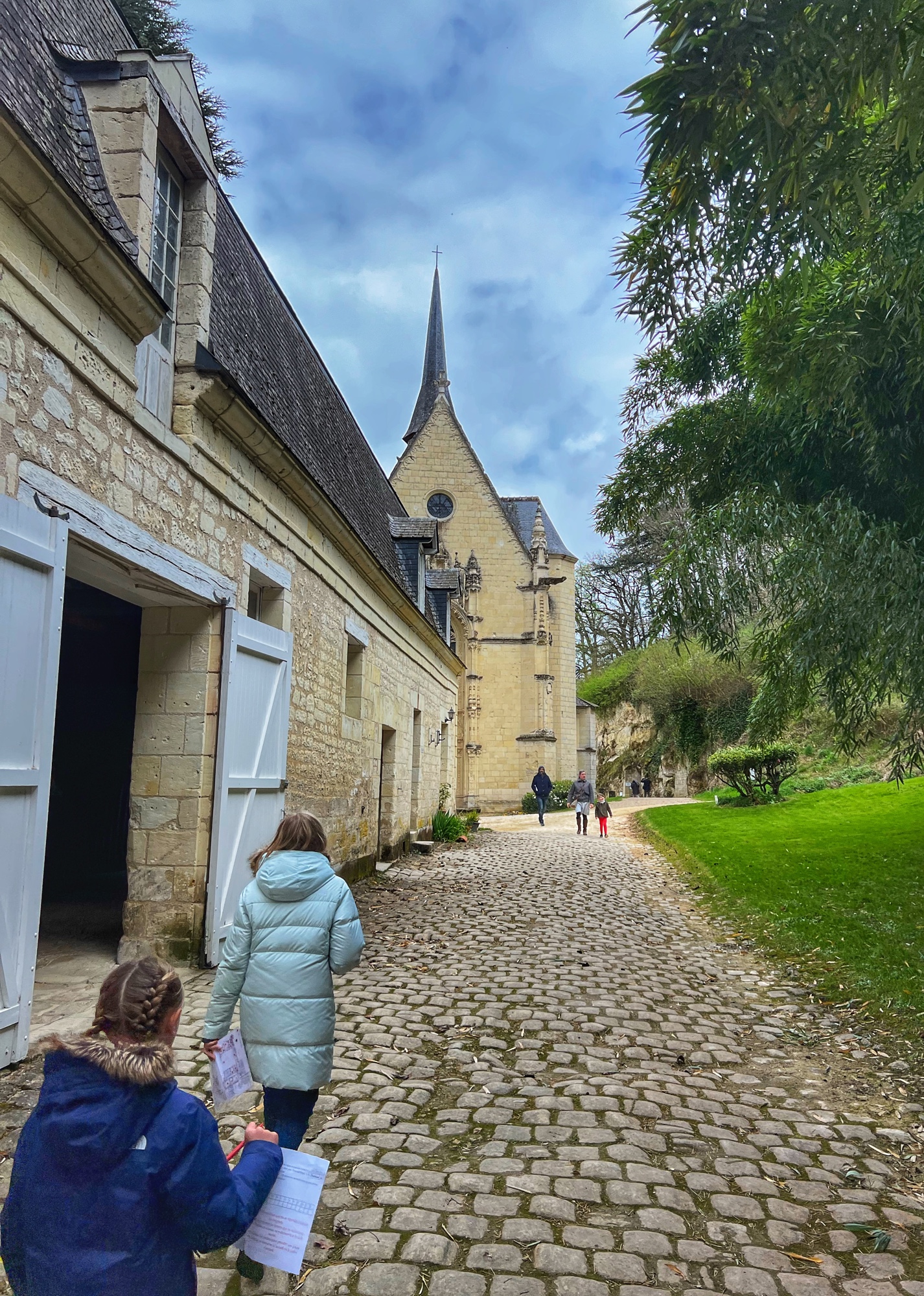 The most unique part of Amboise is the huge and ingenious spiral cavalier ramp that was used to trek carriages and horses up to the castle terraces from down in the town. The girls galloped up and down the ramp like horses! Outside there is a beautiful garden overlooking the river and town. It is simple and not flowering, but lovely nevertheless.