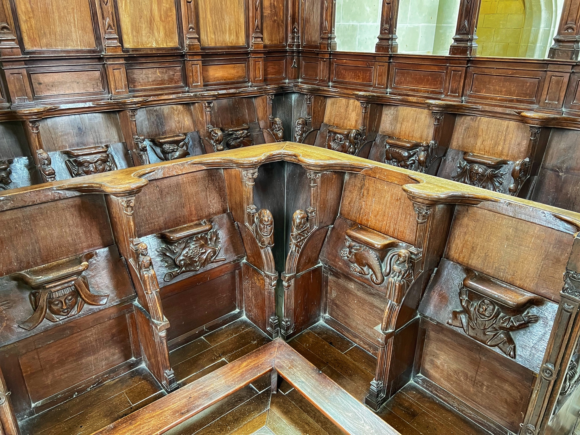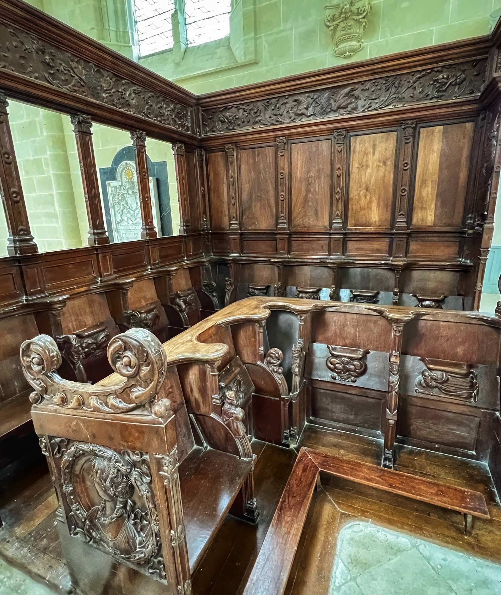 Outside we walked past the small bamboo grove to see the stables and carriage collection. Note the small “dog” carriage on one of the larger vehicles. We also peeked into the caves, now used for wine storage, as well as the chapel. I was blown away by the carvings on the wooden choir seats in the chapel – this was probably someone’s life’s work. Do not miss it! As we walked towards the gardens, we noted the “remarkable” trees, each labeled with a name. We couldn’t believe how huge the pine cones were on one of them! Finally, don’t miss the prison. This is certainly a unique place that carries tremendous history.