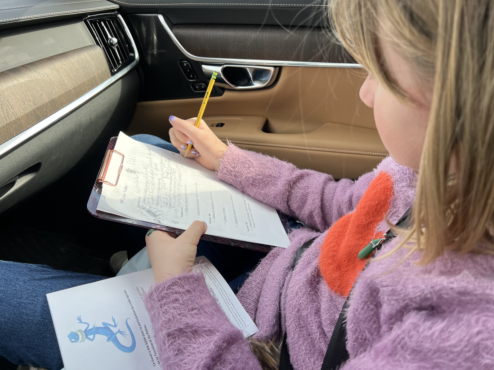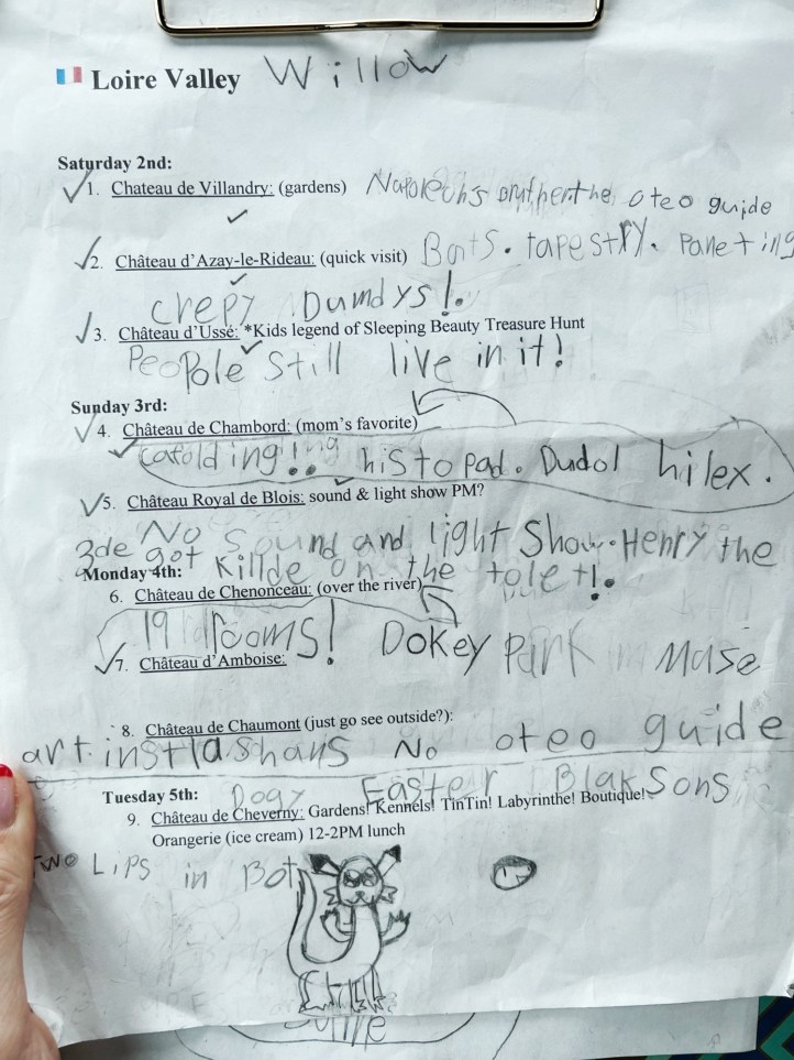 To make the experience more engaging for the girls, I printed out a list of the castles we were going to see so after each stop we could debrief and they could write down the things that stood out at each place. They also had photos of each castle that they would label when we were finished, and they put them in order of when we saw them. I found that stops could easily blur together when you have so many, and this was a great way to help them remember. “Remember the château with the bats in the attic? Which château had 100 hunting dogs? My favorite château is the one with the double helix staircase!” Check out their notes! They’re hilarious: