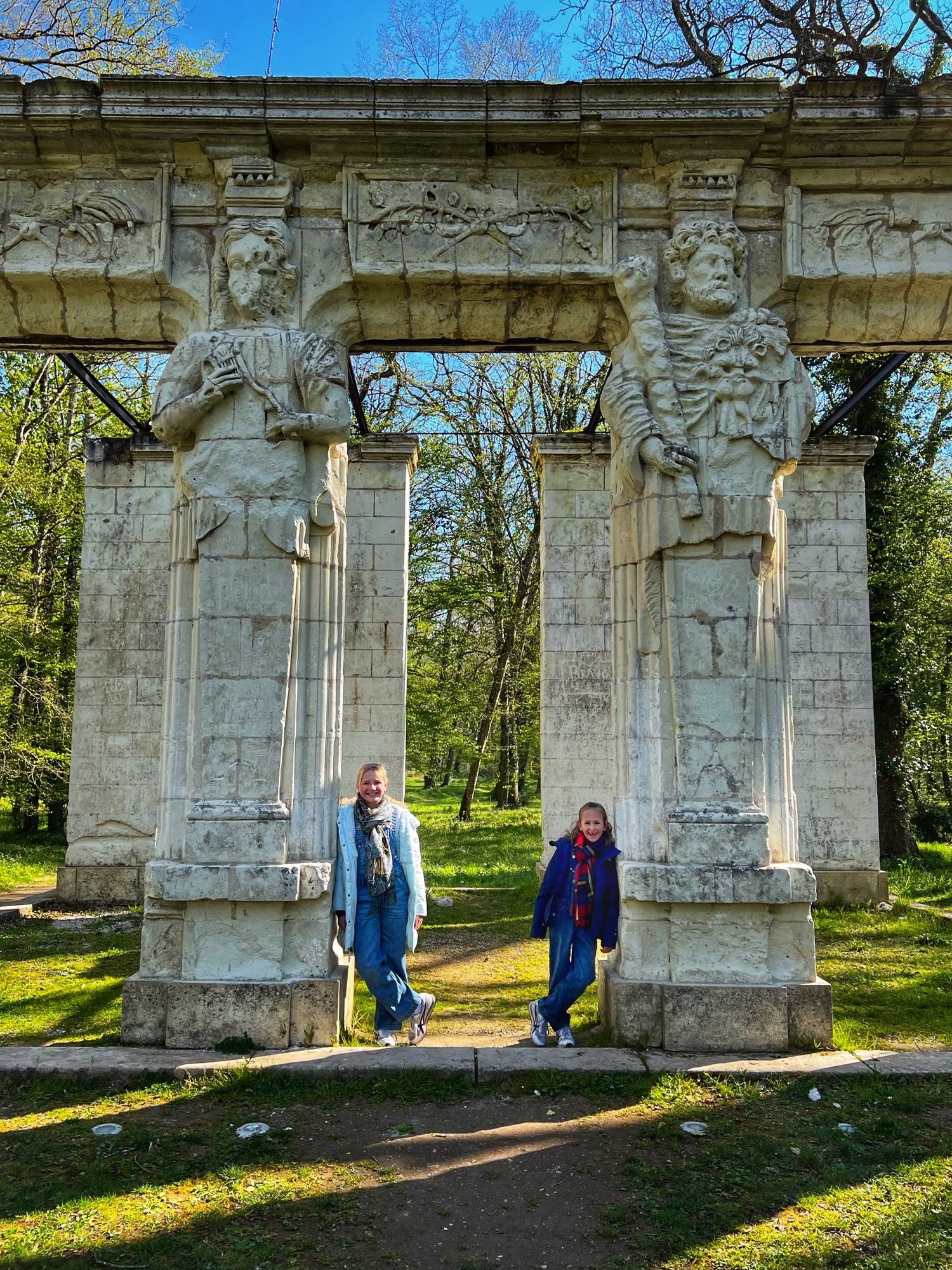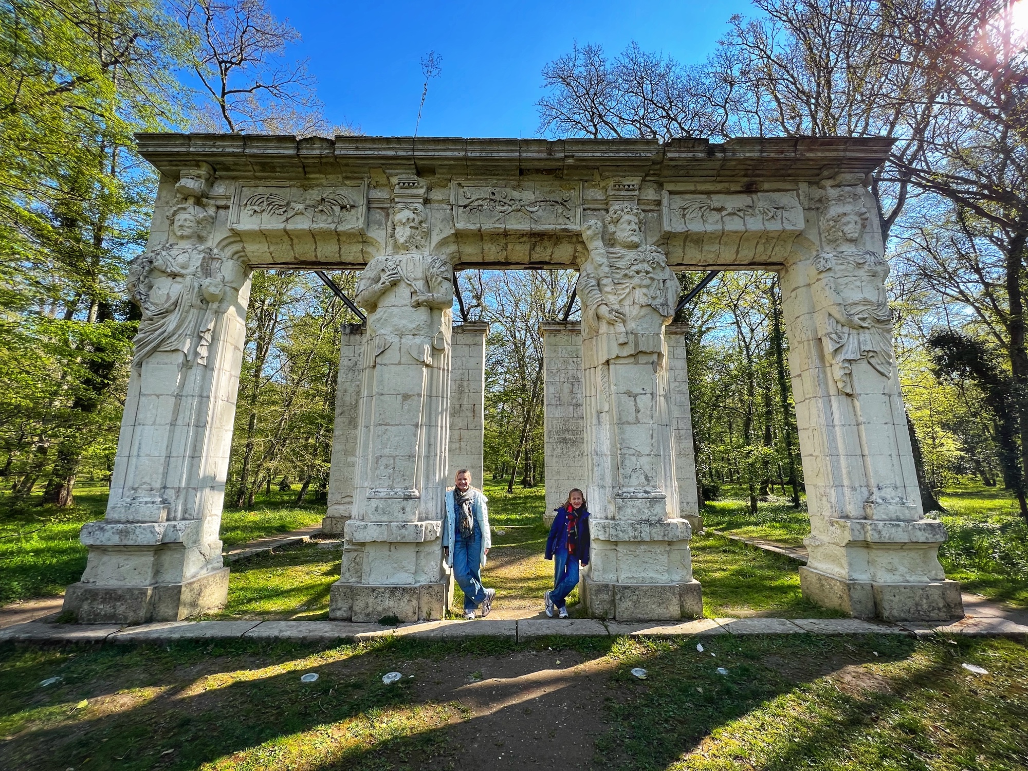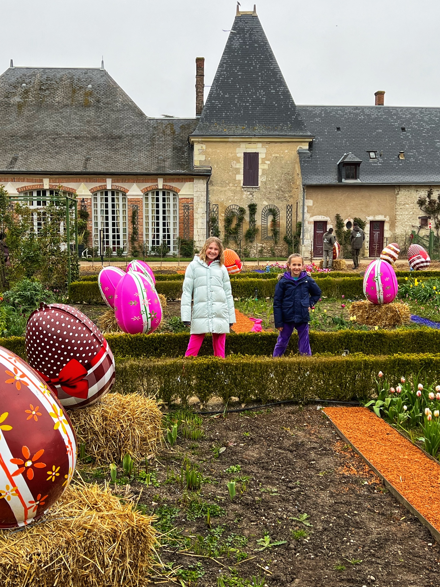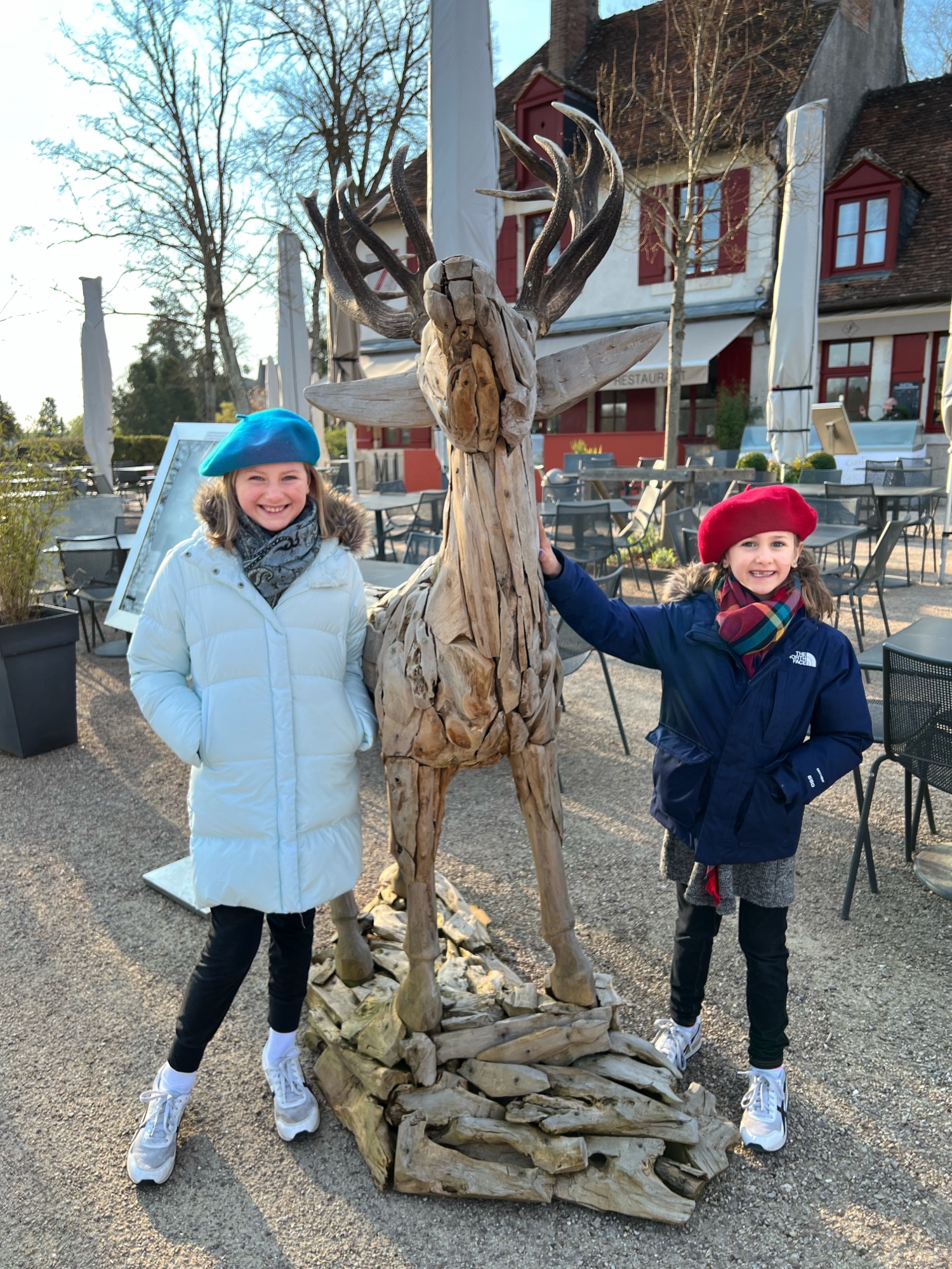 Finally we made it to the maze! The girls raced through it and even lost a beret – but we were able to retrace steps and find it. What an adventure! On the other side of the maze are the Caryatids, a monumental pillar structure that once decorated the Château facade with ancient Greek gods. Next to the flower and vegetable gardens you can visit the donkeys. The girls loved them – they were pretty friendly. We also saw chickens and beehives here. It’s quite a lively place!