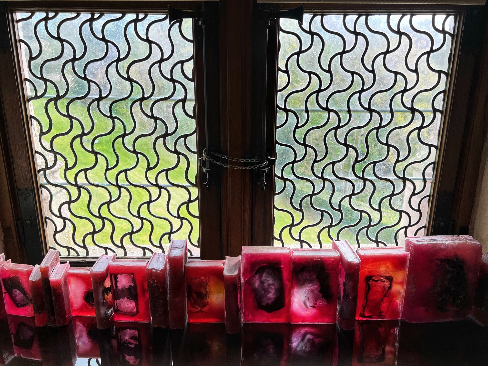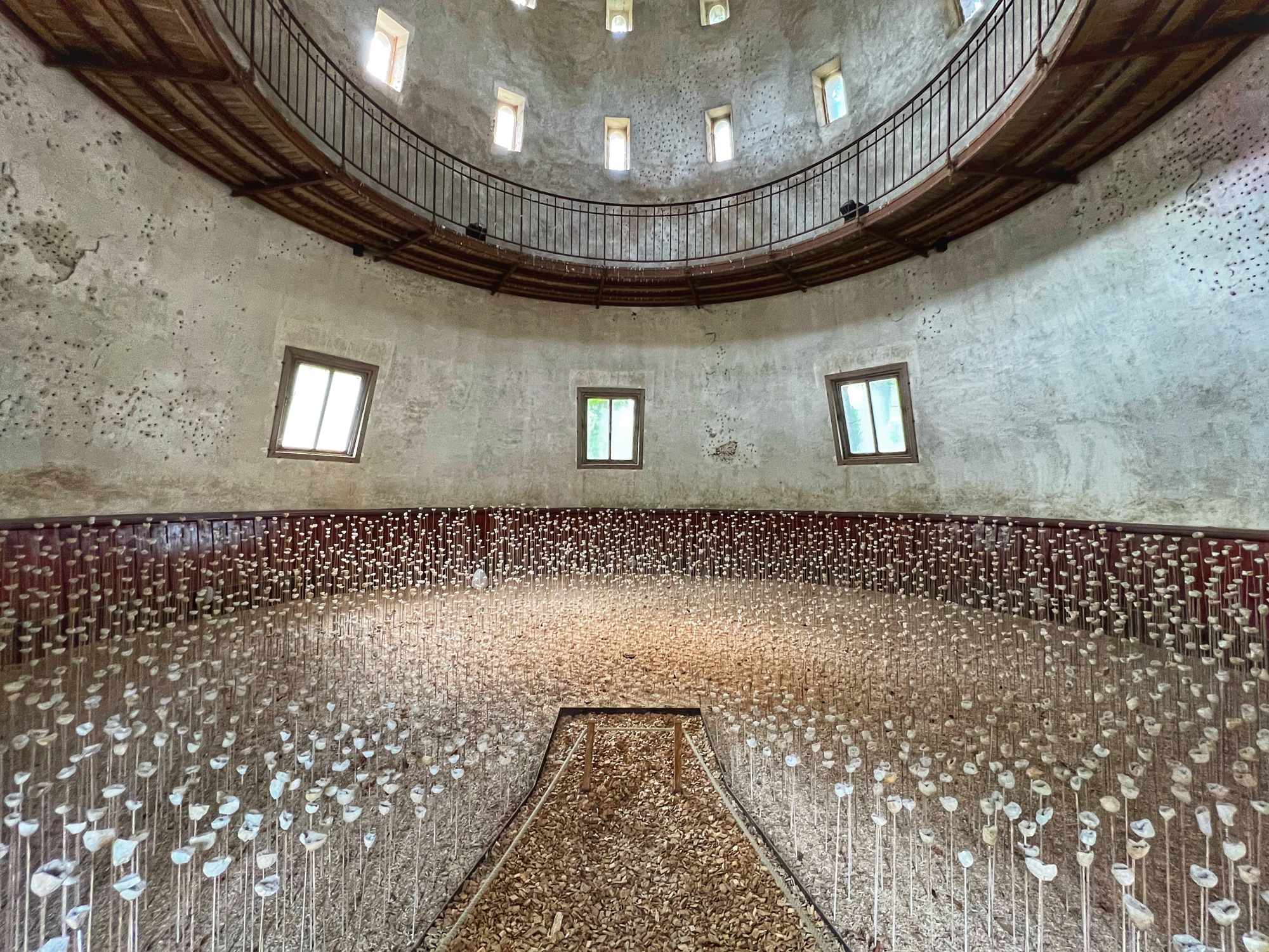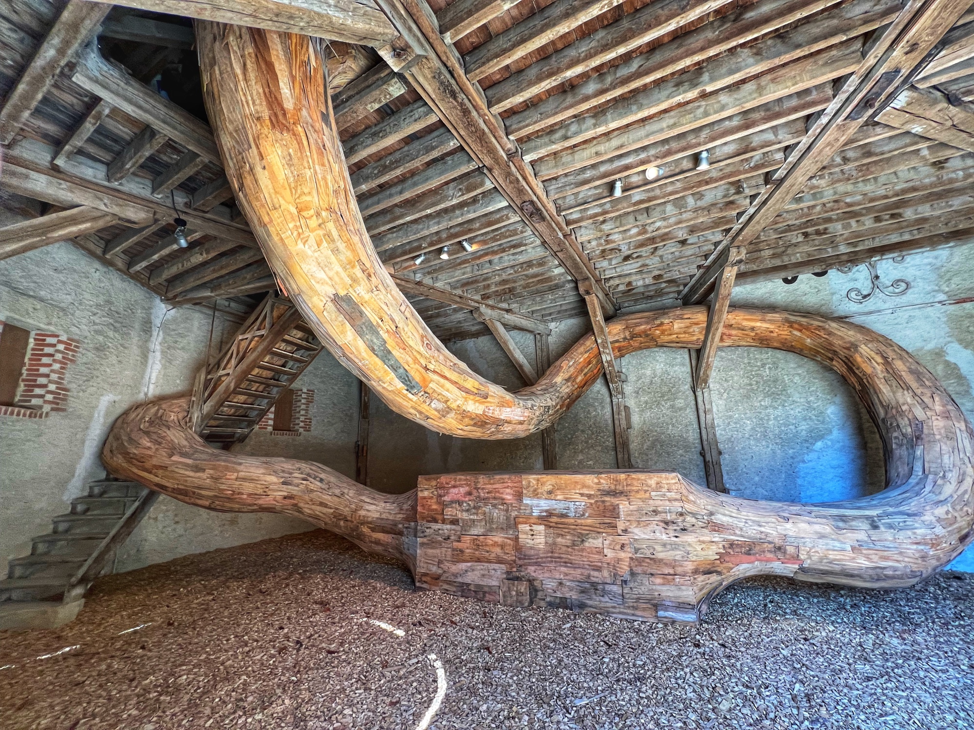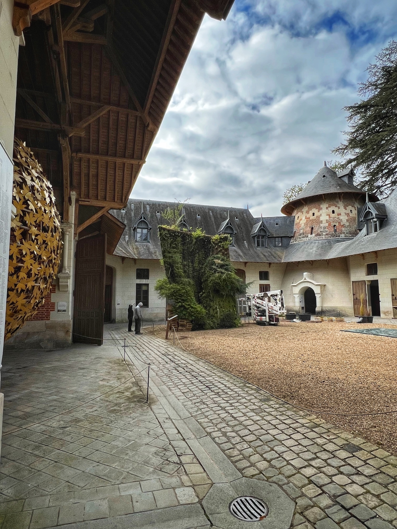 The courtyard was enchanting, with another open air spiral staircase reminiscent of Blois and Chambord. The tulips were in bloom! And the view from here was lovely. This was the only castle we saw that had an entryway with a huge drawbridge type door. Everything was very well preserved! Below are photos of some of the remarkable trees at Chaumont as well as several of the art instillations in various stalls of the stable. One stood out – thousands of geodes arranged at varying heights the ethereal music playing. You stepped into this rounded space and it transports your senses!