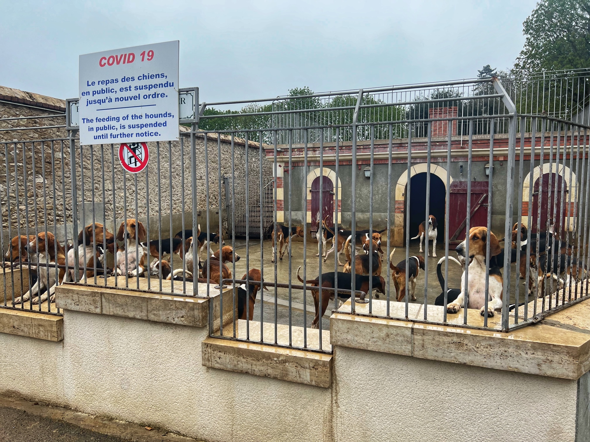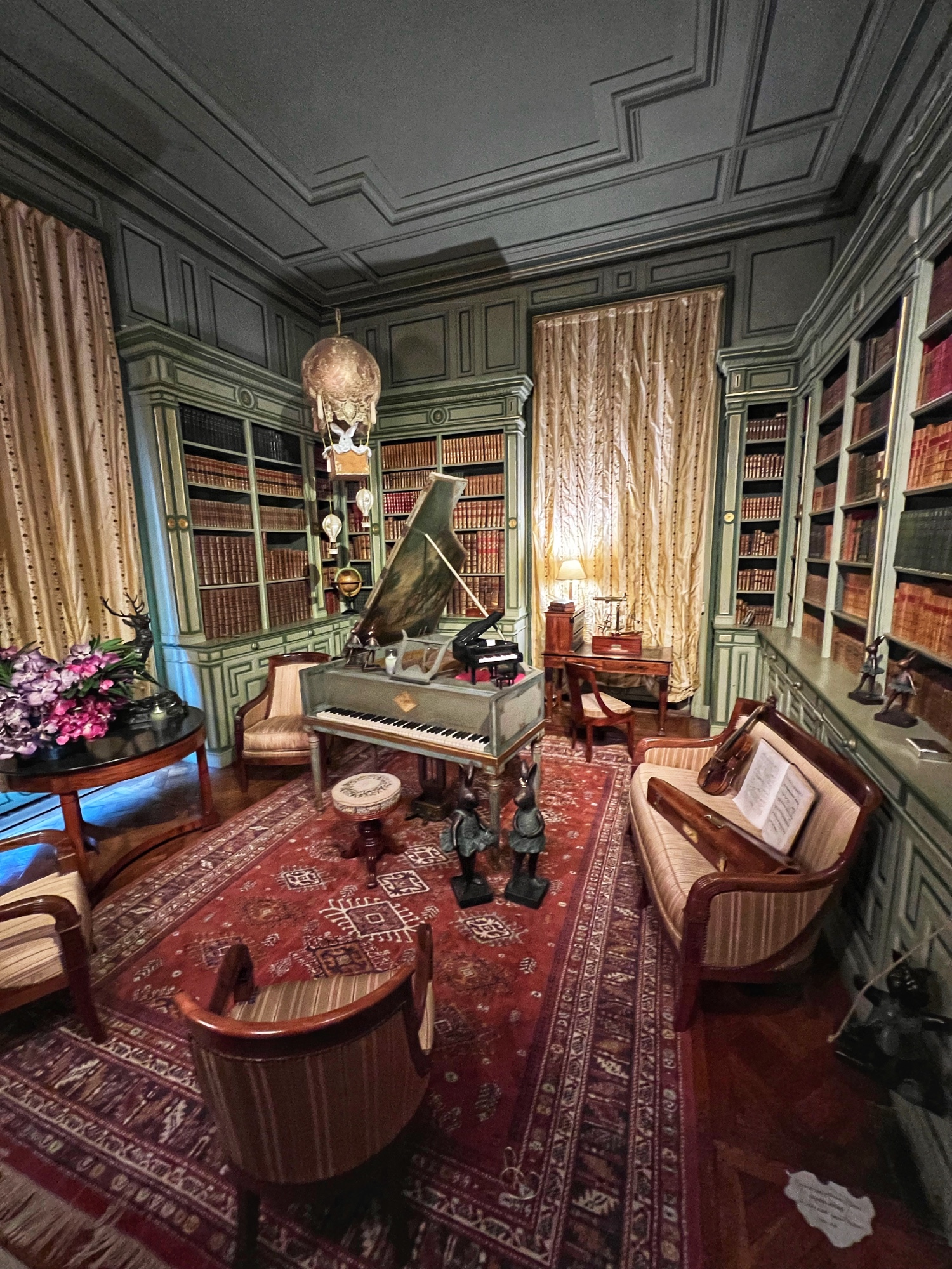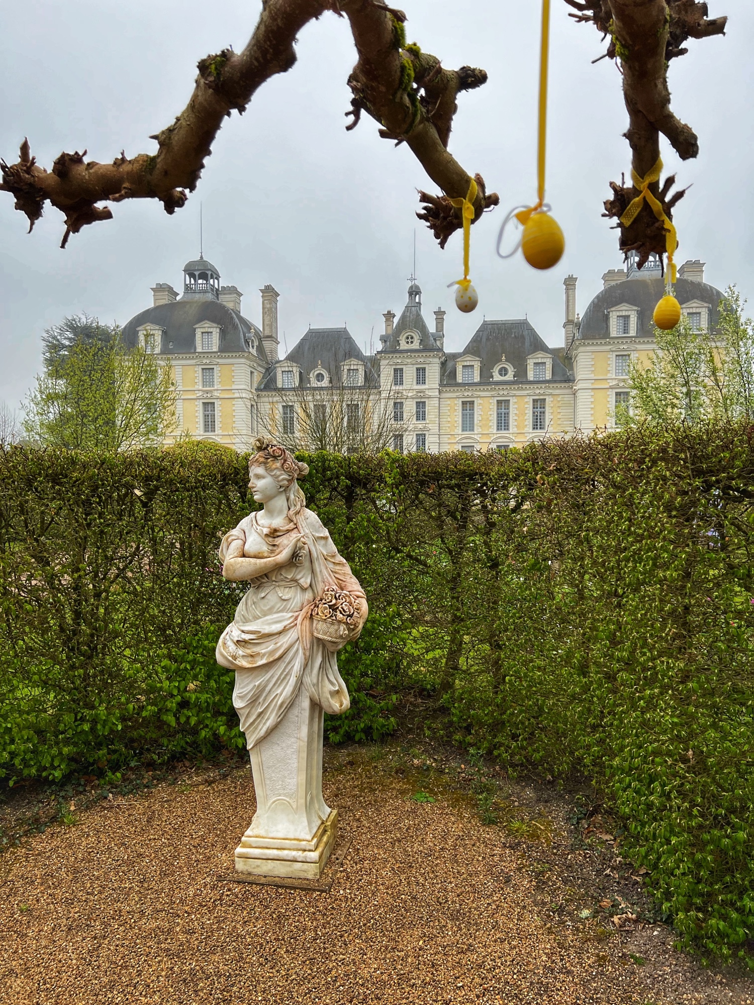 My favorite room was the library, with a little “hot air balloon” hanging from the ceiling above a grand piano. These rooms are all impeccably decorated. Outside the château (on a cold and dreary day) we wandered the grounds and visited the gardens and dogs first.