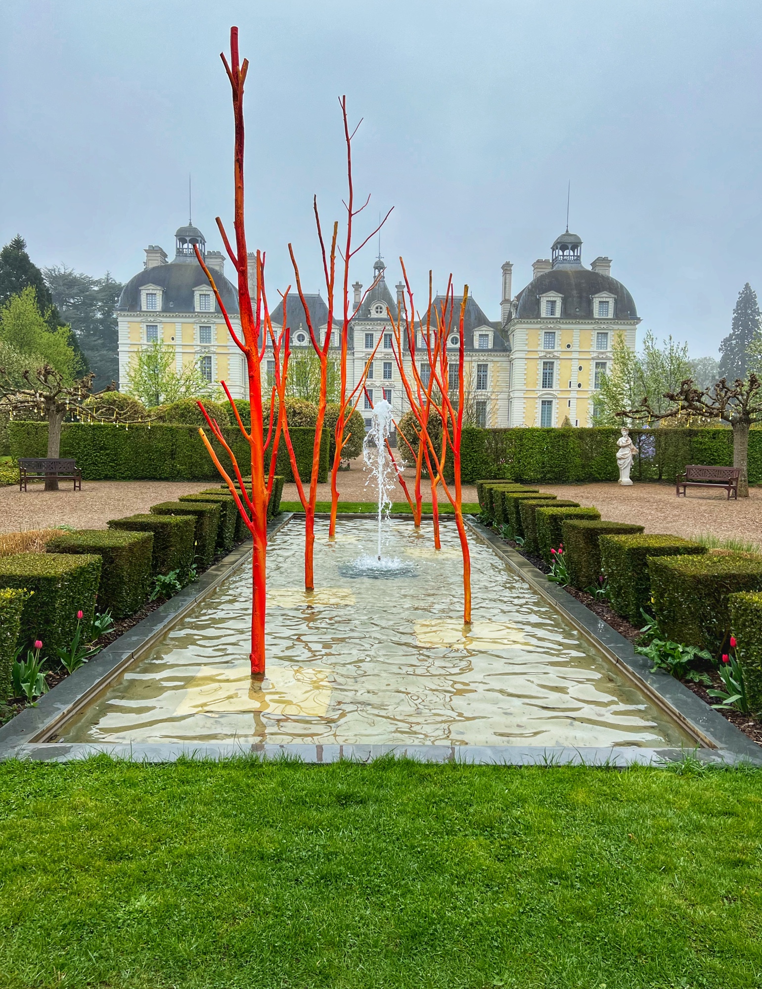 Outside, as you exit the front of the palace, the great gardens reach forward towards the moat. The impressive perspective of the château from the pathways really show its grandeur. The current whimsical art sculptures by Pablo Reinoso (“Overflows” from May 1-Sept 4) on display also provide a unique vantage point at the front of Chambord.