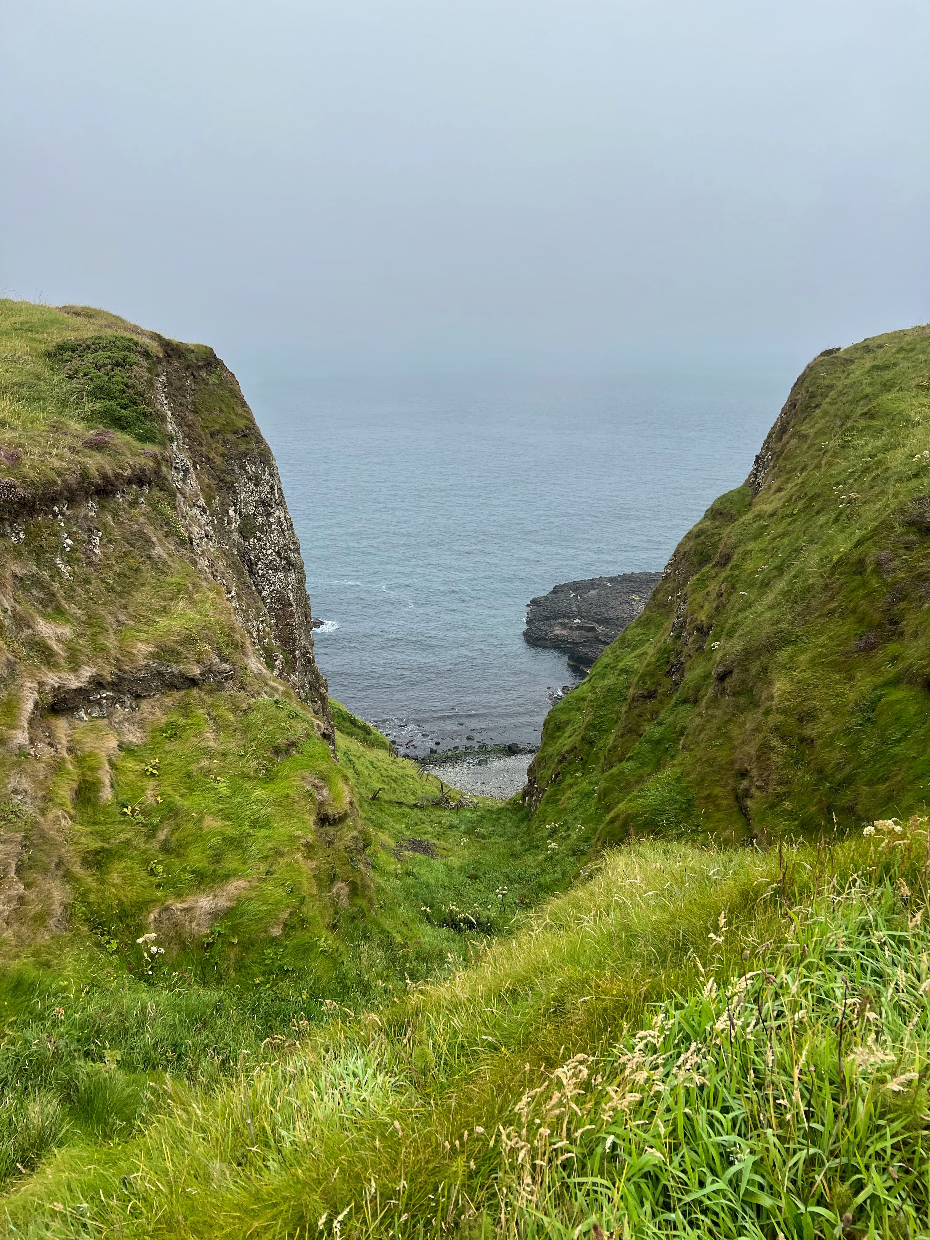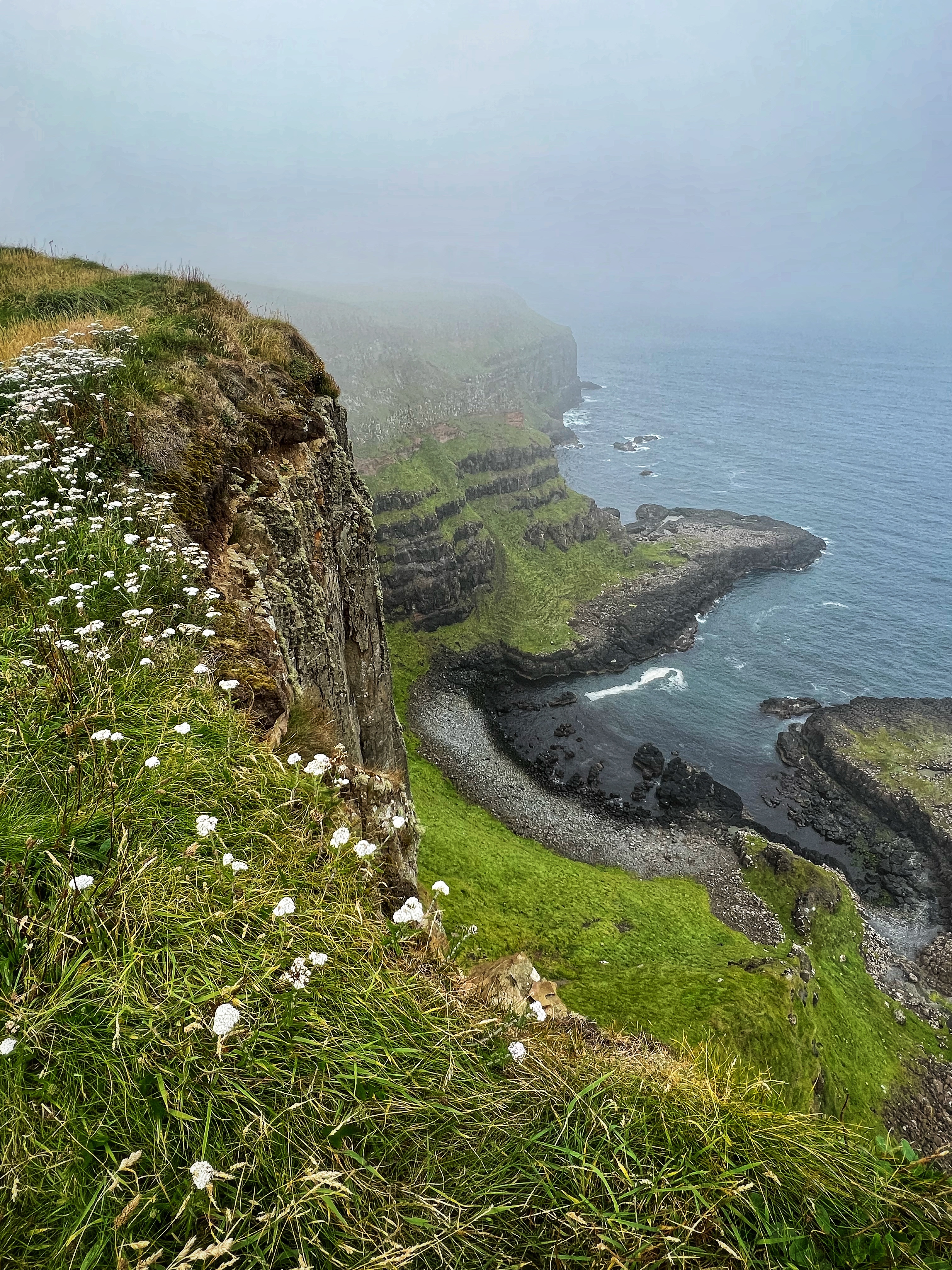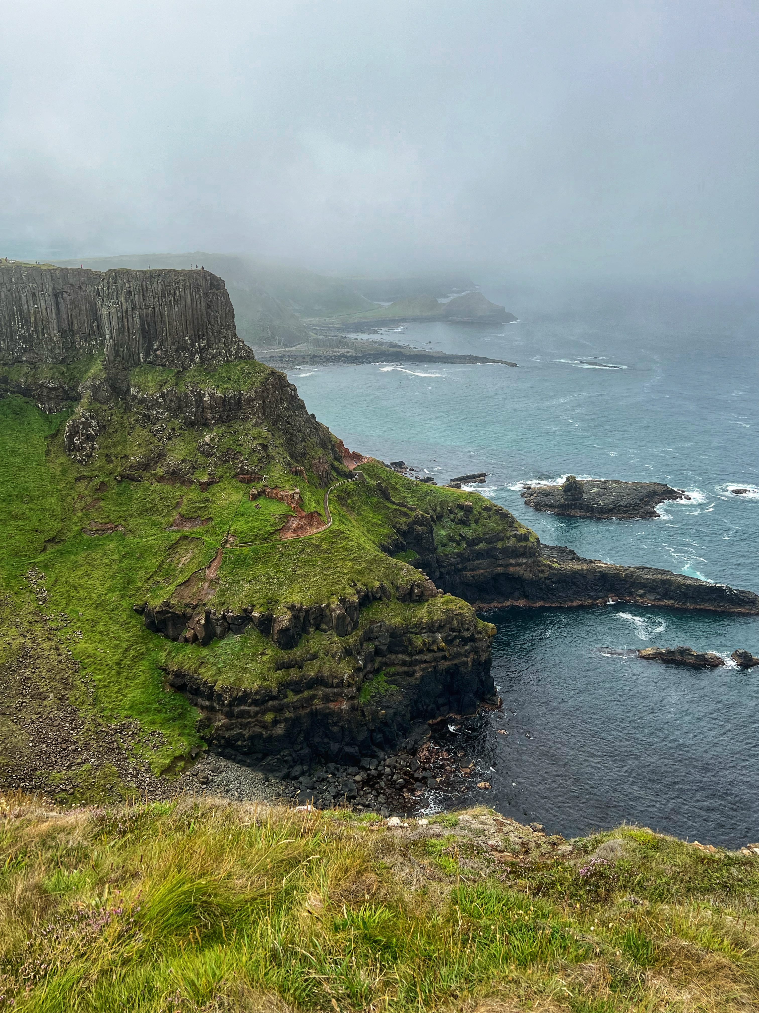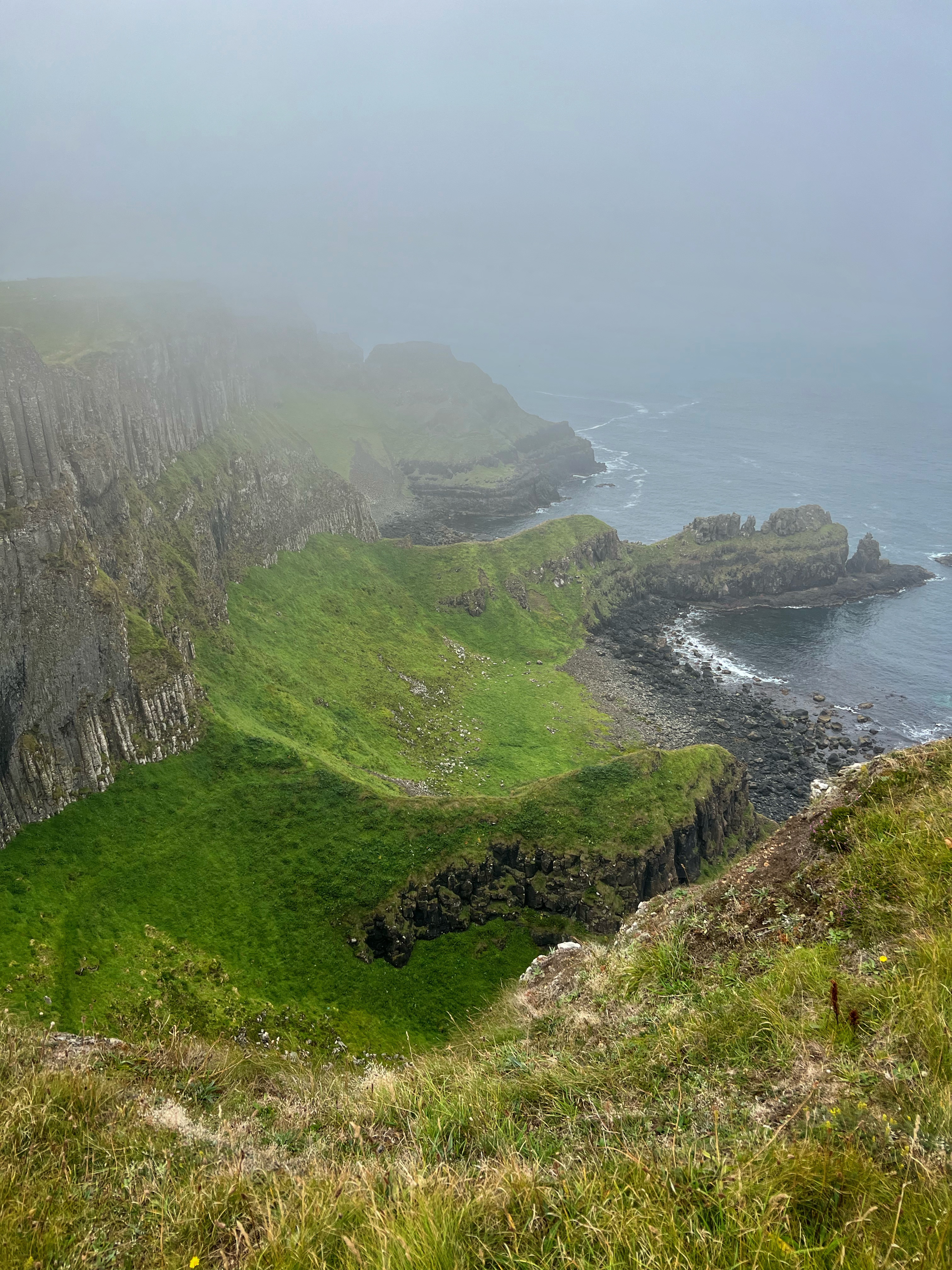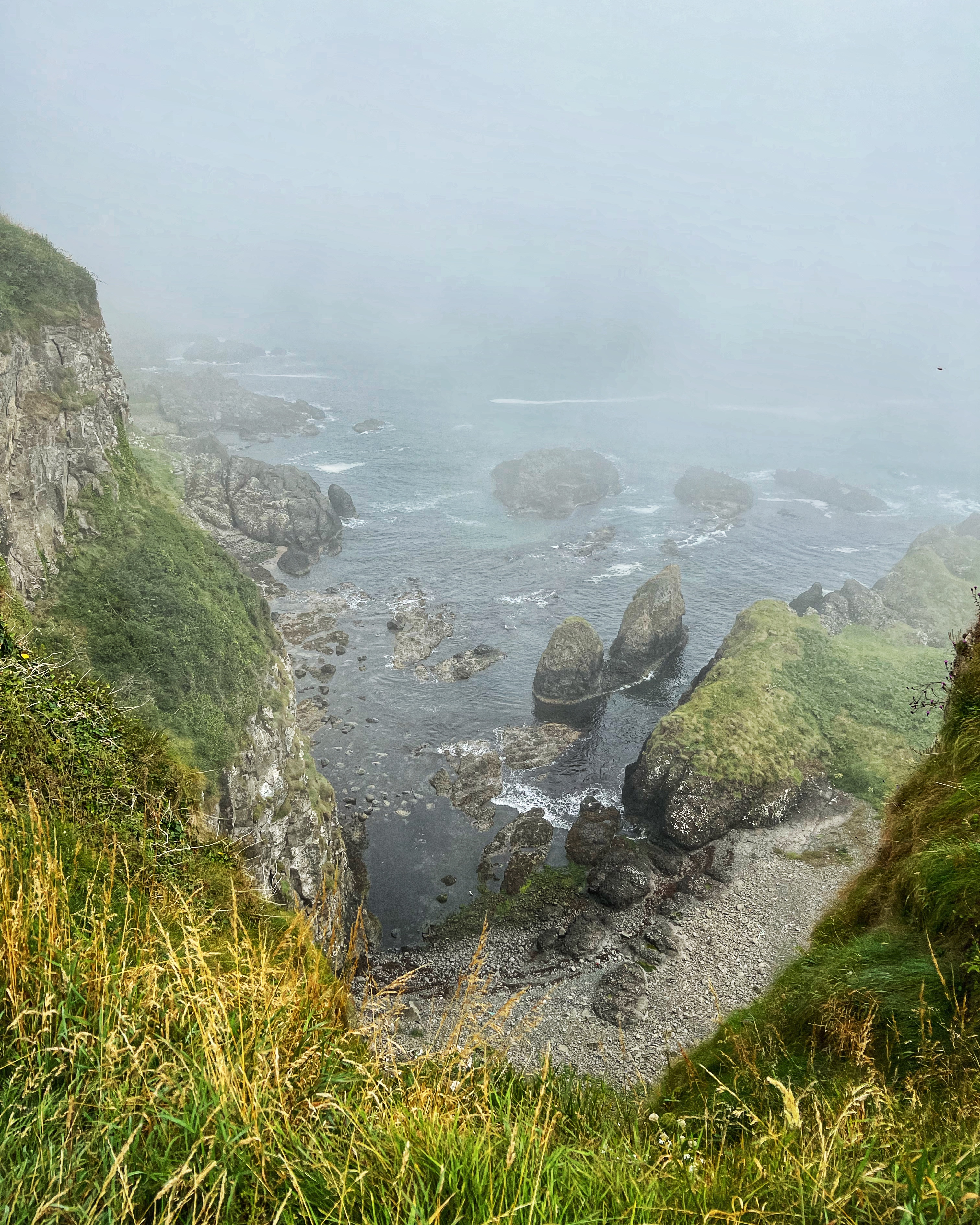 Our destination for the rest of the day was the Causeway Coast, including Giant’s Causeway, Bushmills, Carrick-a-Rede rope bridge area and Larrybane Quarry. This was another record breaking day for steps on the smartwatch, and every single one was beautiful. We wanted to hike the causeway coast instead of just heading straight to Giant’s Causeway’s infamous honeycombs, so we parked at Dunseverick castle ruins (a small pullout car park near a house with the nicest lady we made friends with) and hiked about 2 hours west to the Giant’s Causeway. This turned out to be a perfect plan, as the entire coast was socked in with fog until noon time, which was exactly when we arrived at Giant’s Causeway. It was amazing to see the blue skies emerge and made it all worthwhile, even with the mid day crowds.