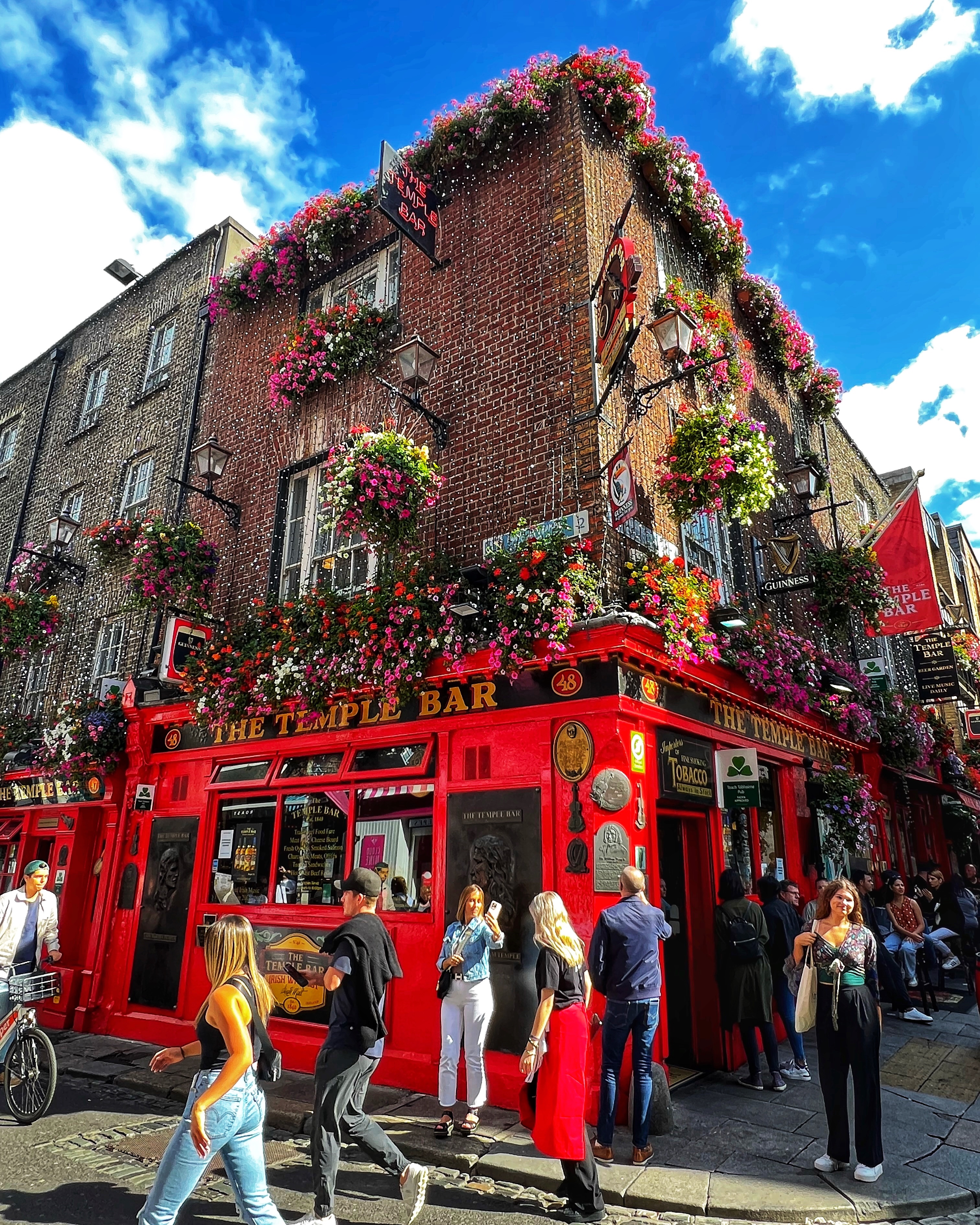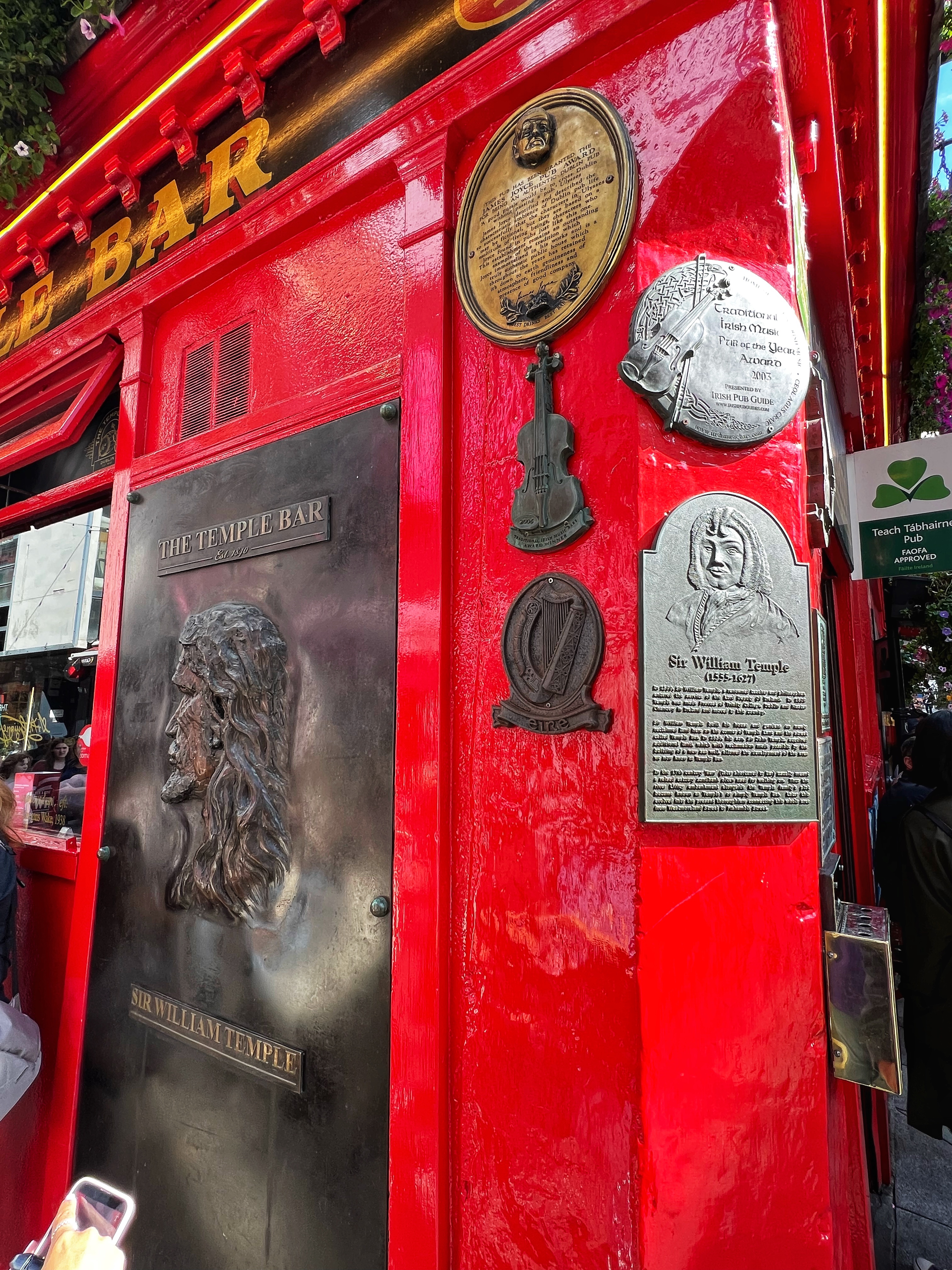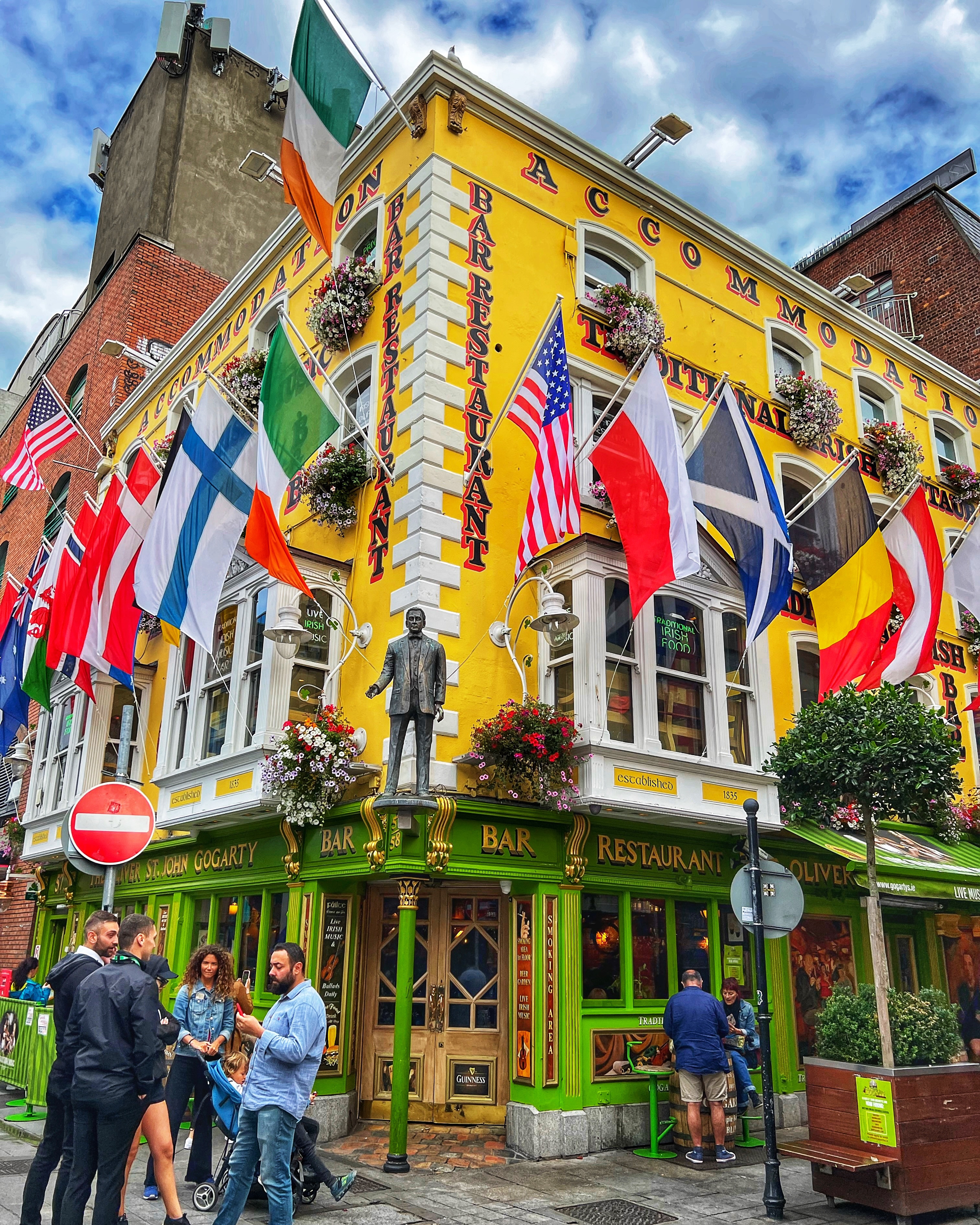 Next we wandered down to the Temple Bar area. We learned Temple Bar isn’t just one place – it’s a whole neighborhood in Dublin! There are many “Temple Bars” in Temple Bar neighborhood, but the most noteworthy is the bright red Temple Bar Pub, est in 1840, made famous for their 450+ kinds of whiskey, Ireland’s largest collection. My favorite building in this neighborhood is the green and yellow Oliver St. John Gogarty’s Hostel – it’s not even a pub!