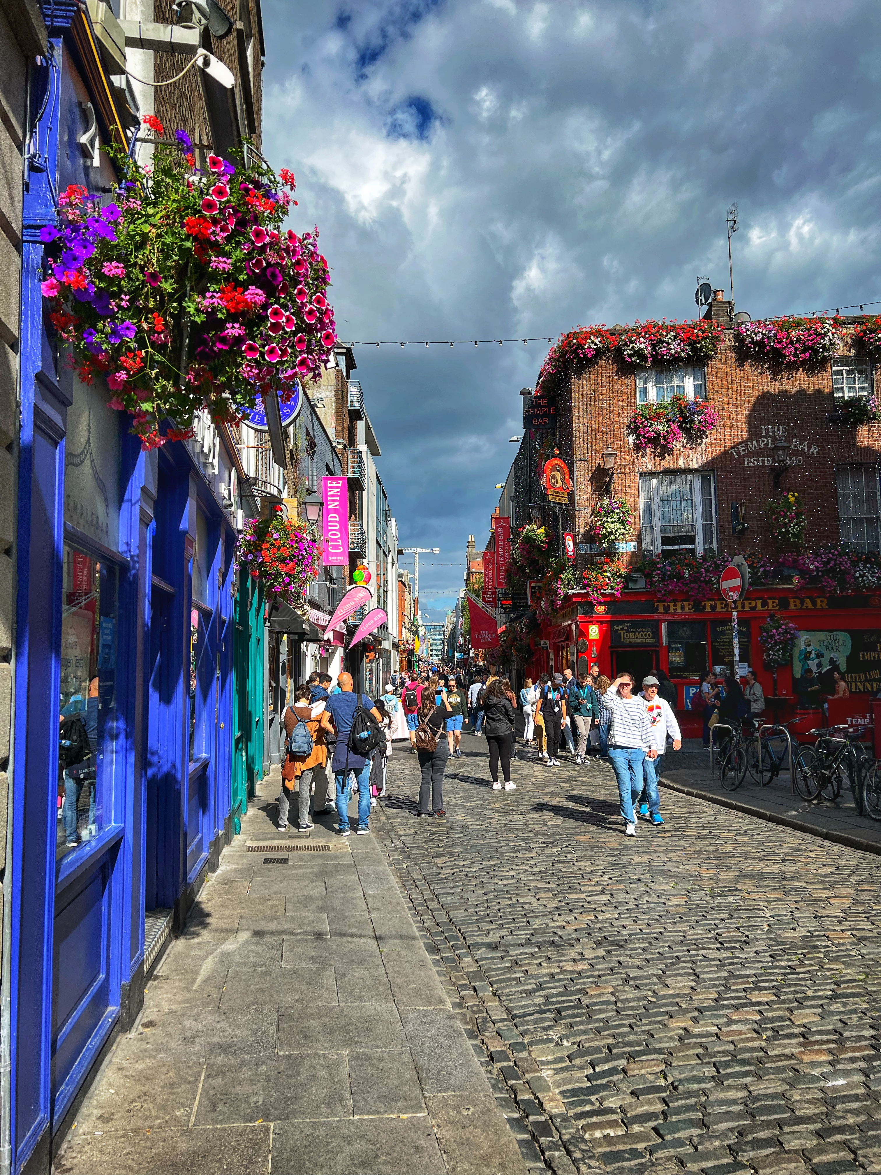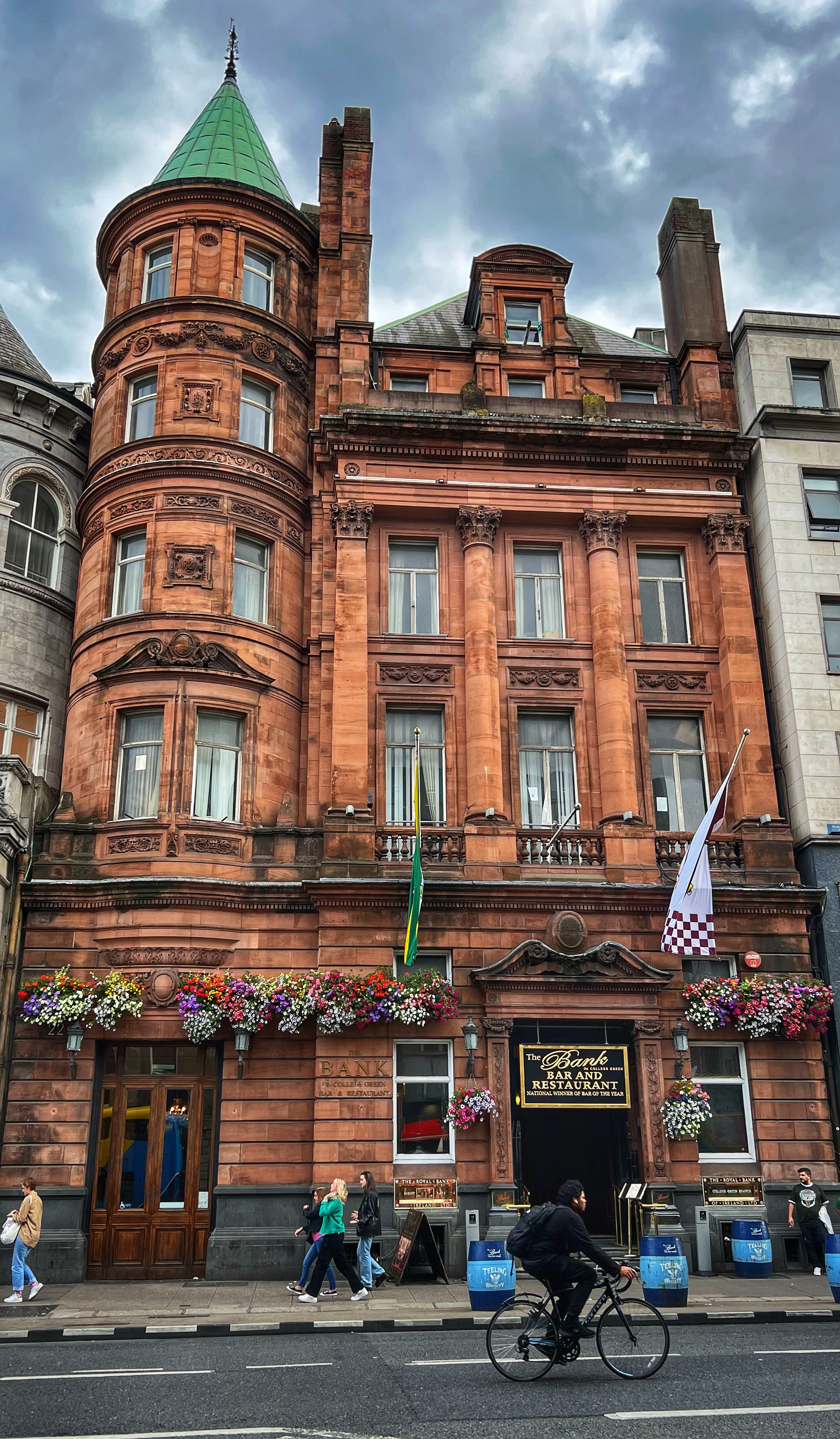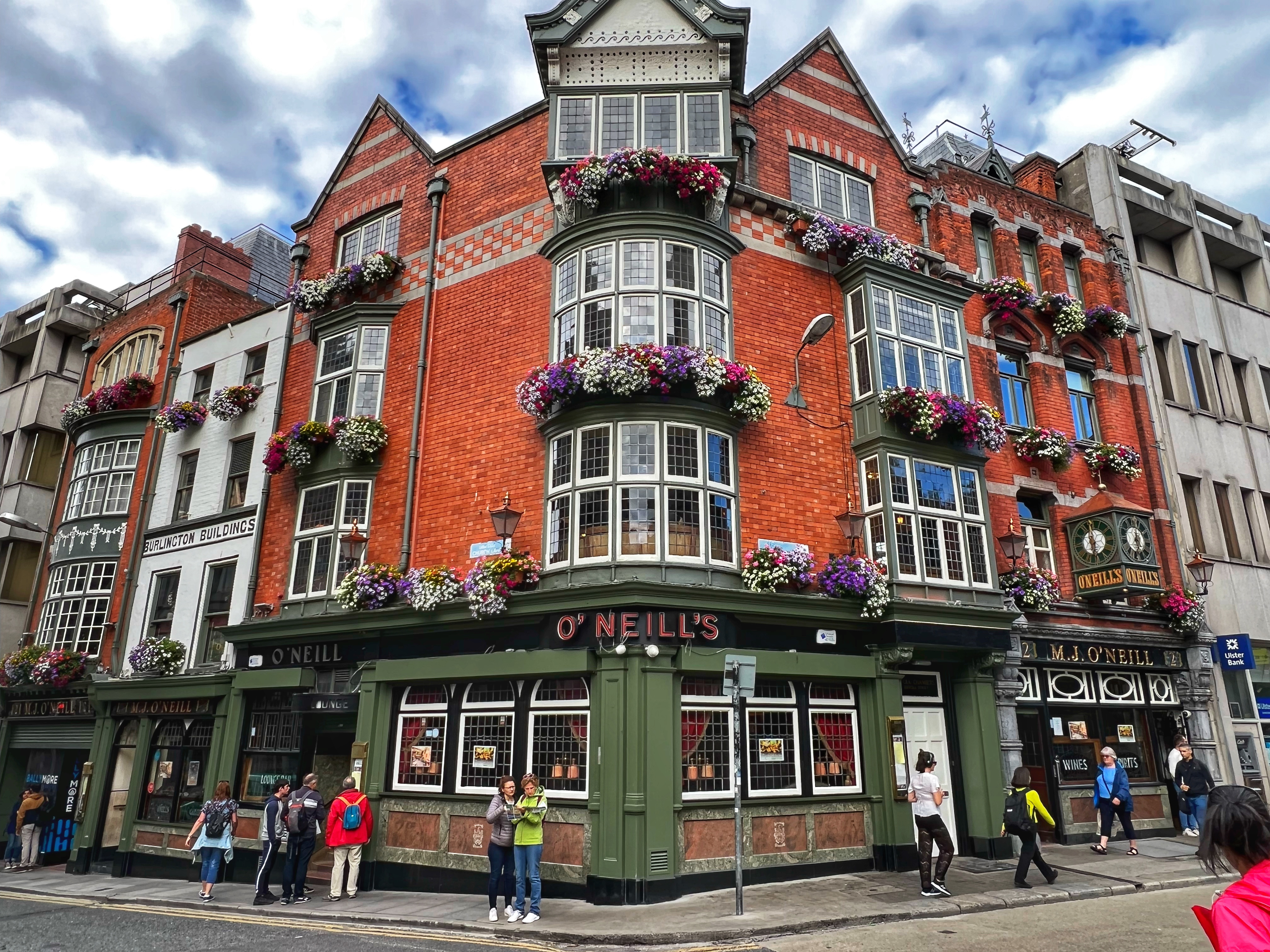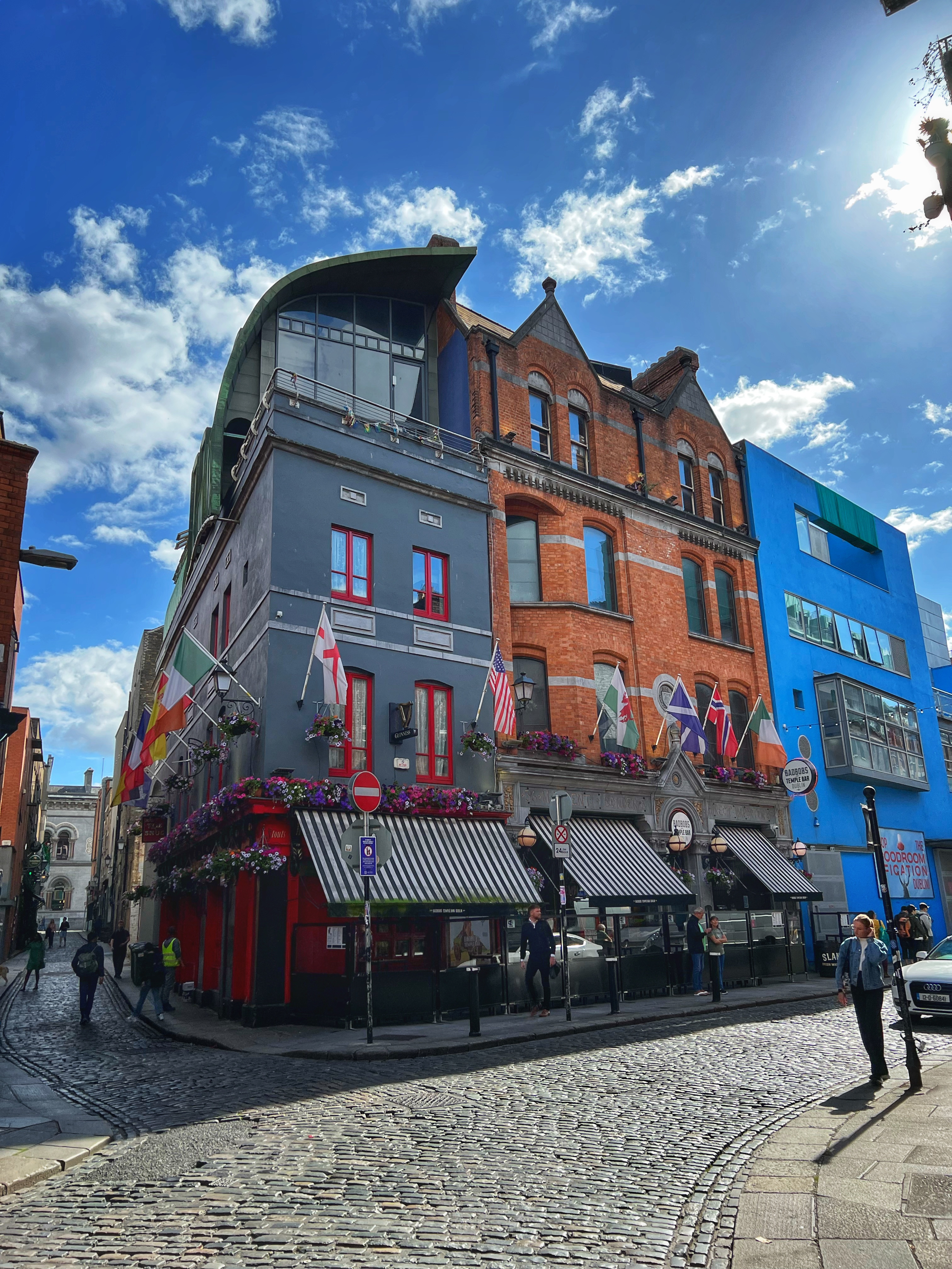 Next we wandered down to the Temple Bar area. We learned Temple Bar isn’t just one place – it’s a whole neighborhood in Dublin! There are many “Temple Bars” in Temple Bar neighborhood, but the most noteworthy is the bright red Temple Bar Pub, est in 1840, made famous for their 450+ kinds of whiskey, Ireland’s largest collection. My favorite building in this neighborhood is the green and yellow Oliver St. John Gogarty’s Hostel – it’s not even a pub!