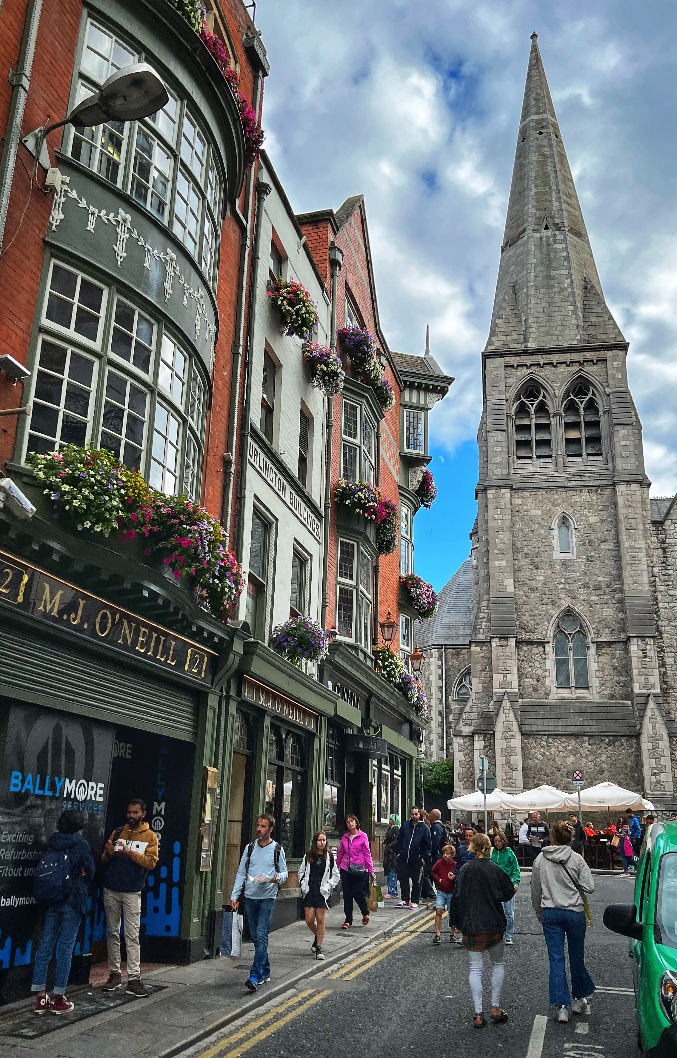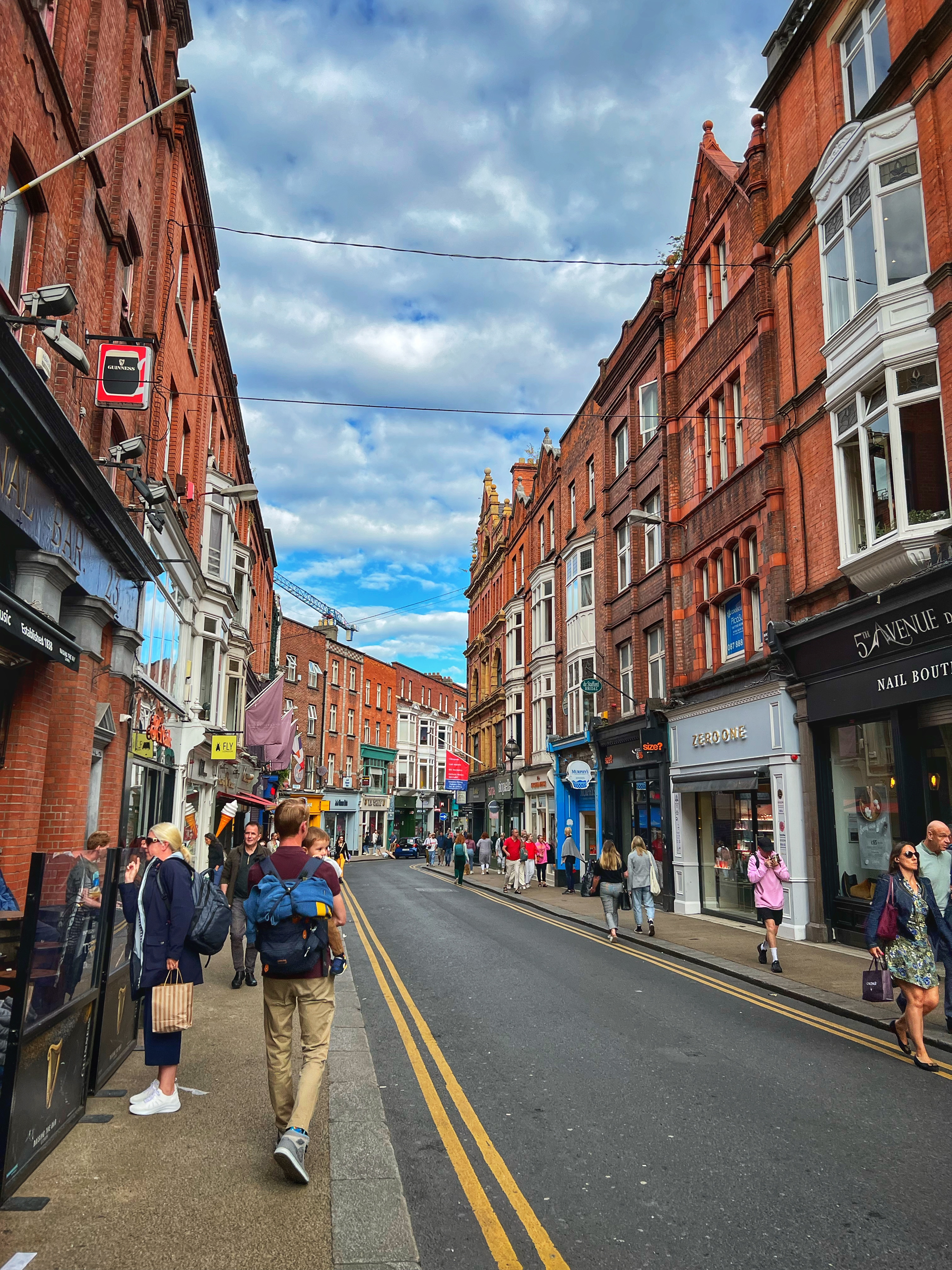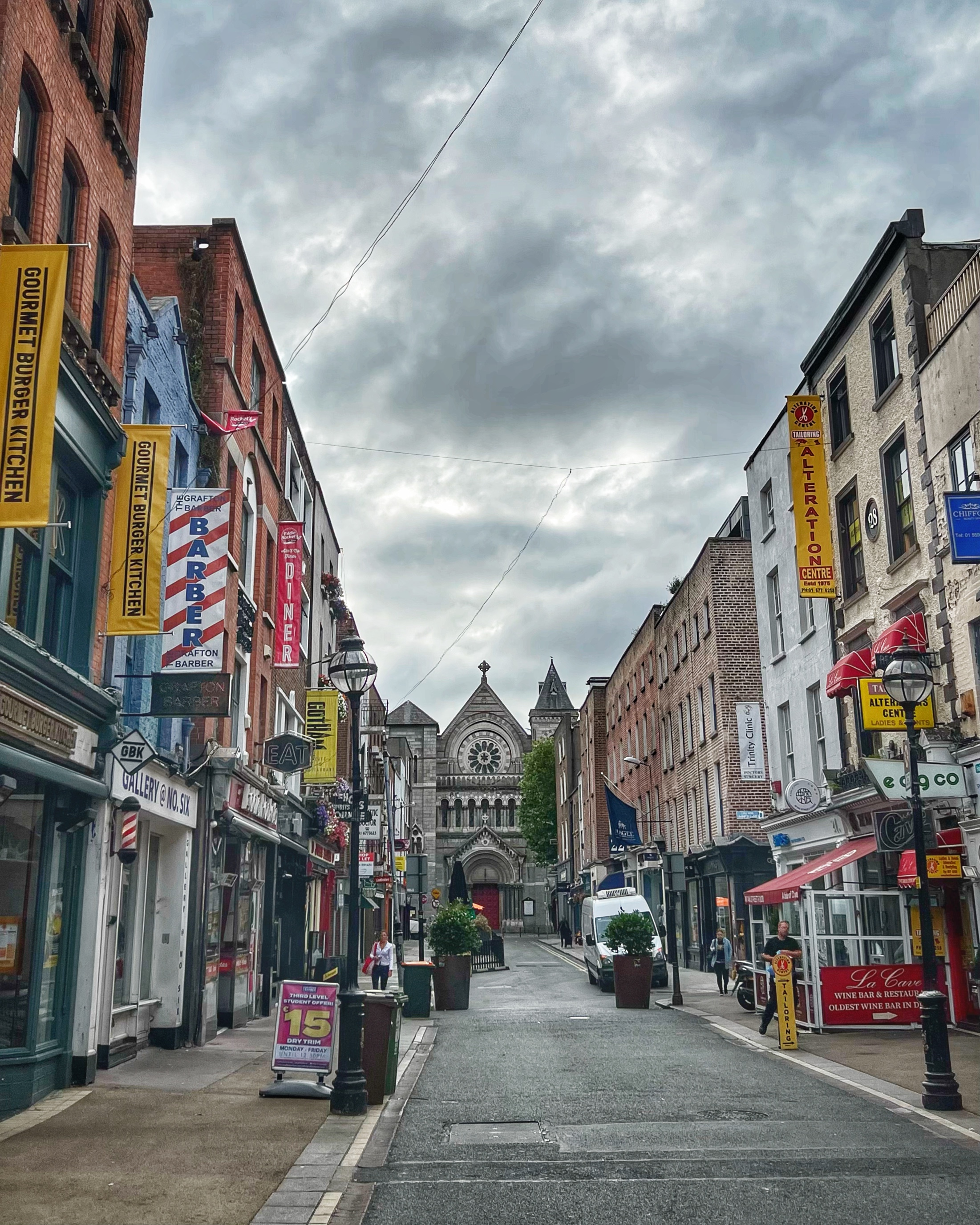 There are so many fun, historic sites to see in Dublin! My favorite is spotting a funky pub, like The Bank Bar & Restaurant, built into an old bank. It’s beautiful inside! We didn’t have time to visit all the pubs but you could easily spend a week or more just bopping around from pub to pub. We passed The Bank Bar on our way to the Molly Mallone statue, one of those iconic Irish stories based on a song. It’s right behind St. Andrew’s Church. Even though we couldn’t get tickets to THE Riverdance on this trip, we couldn’t resist a walk past the Gaiety Theater to see the famous handprints in the sidewalk. If you want Riverdance tickets, book early – you can get them for as low as €15/pp, but if you wait then all that’s left will be €55/pp tickets (if you’re lucky!). We also picked up donuts at the delicious Rolling Donut shop on King Street – we can’t find great donuts here in Belgium. It’s right across from the beautiful Stephen’s Green Shopping Center (large glass atrium pictured below). Finally, a quick walk up Grafton Street was in order, because we love a good Ed Sheeran song and he used to play here as a street musician. Don’t miss peeking down Anne St towards St. Anne’s Church – another one of those iconic Dublin views (pictured below).
