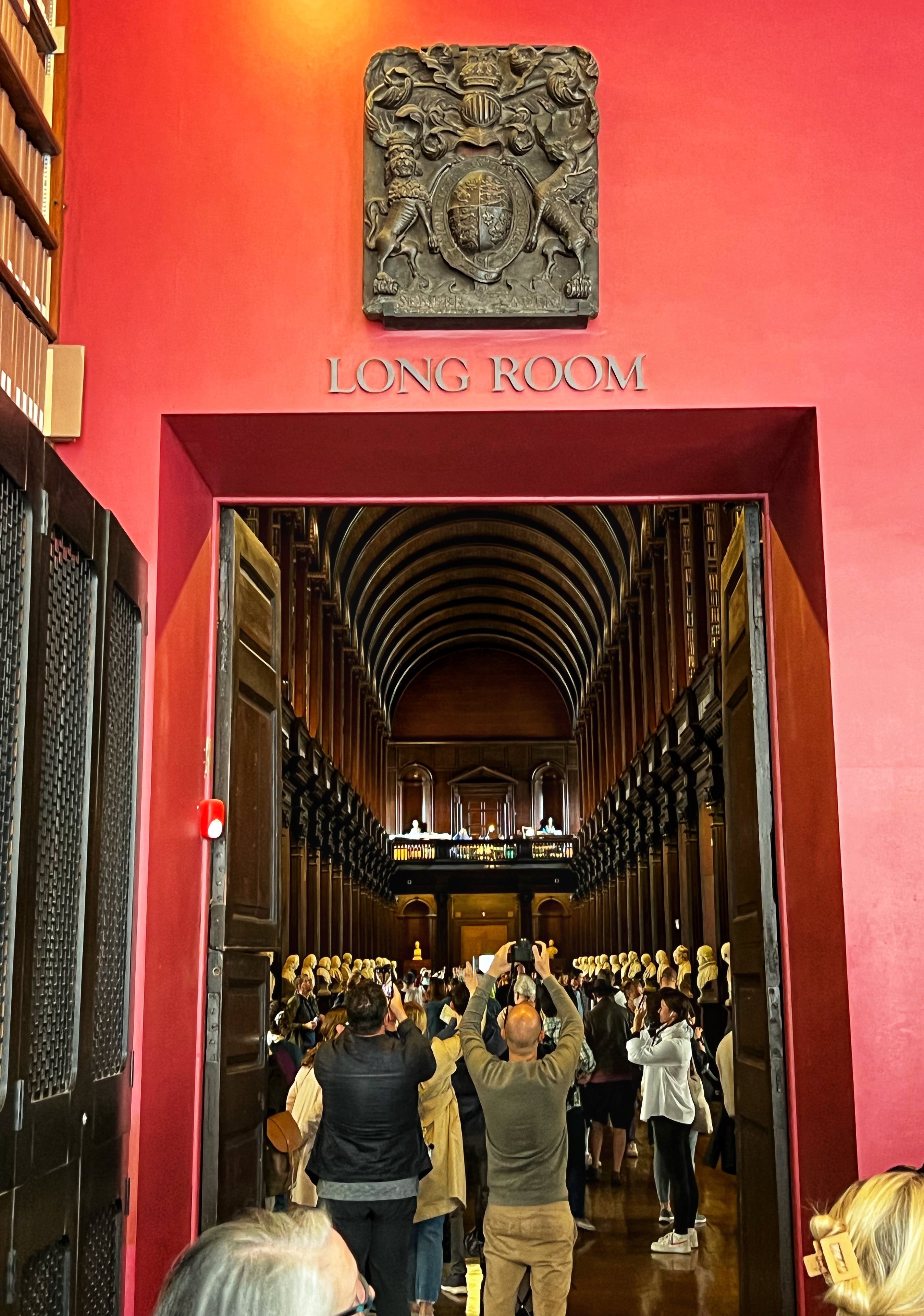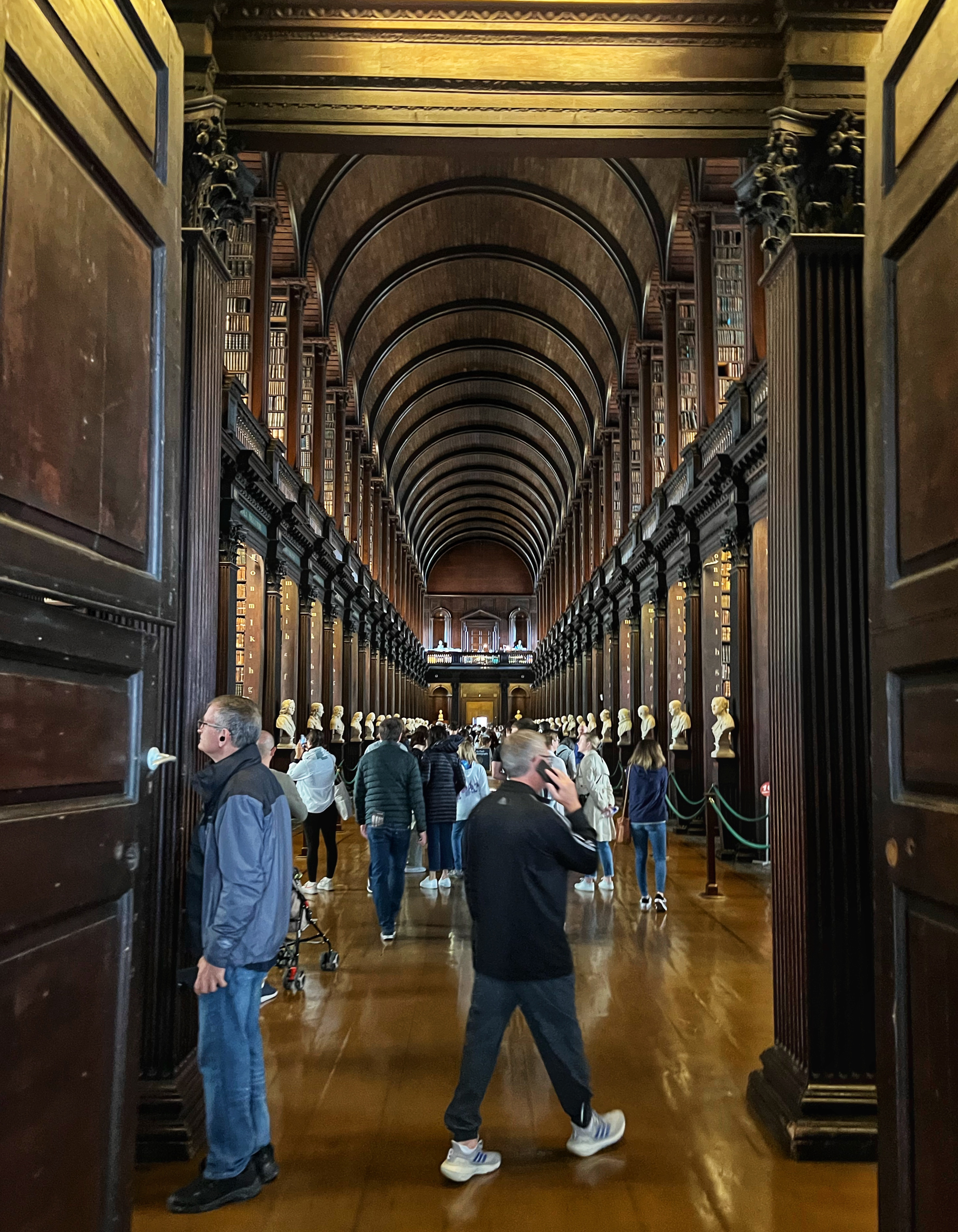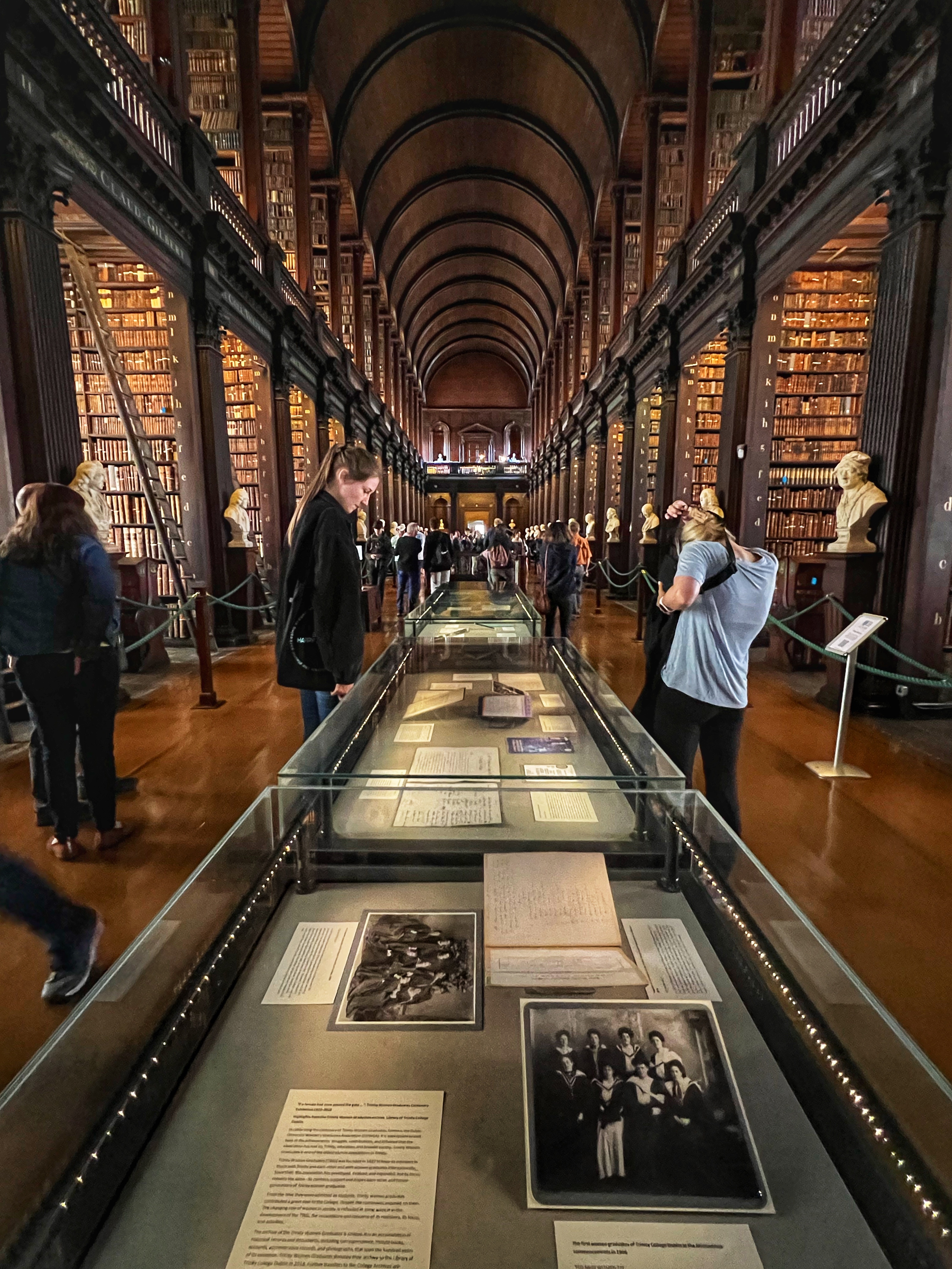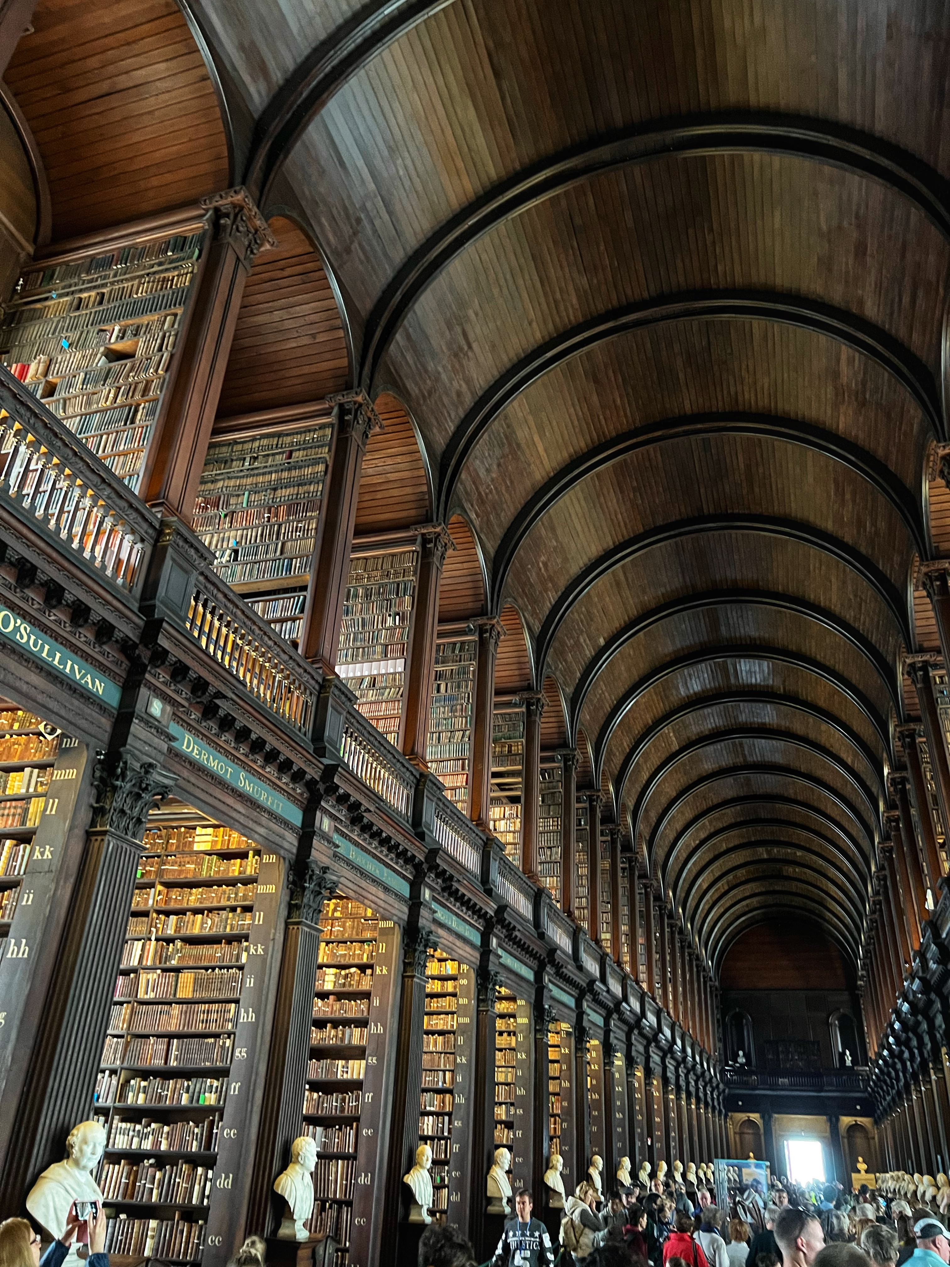 The informative exhibits for the Book of Kells take about 30 minutes to view. In the exhibit hall you are permitted to take photos as you learn about the history of the Book of Kells, but once you enter the “treasury” where the actual book is located, photos are off limits. This famous religious text was believed to be written around the year 800 AD at a Columbian monastery in the UK, but got the name Book of Kells from its home at the Abbey of Kells in Ireland, where it lived for centuries. The decorative detail and colorful designs in this Biblical text are unmatched anywhere, and are therefore priceless. After viewing the (one page of the) Book of Kells, you make your way upstairs to the infamous Long Room at the Old Library of Trinity College. Most people recognize this incredible place from Harry Potter – but the truth is, the movie was filmed in Cambridge, England! The library, however, is very similar to the Long Room and therefore has even been nicknamed the Harry Potter Library. The Trinity Old Library is actually larger than what we are able to visit as tourists, but this long room is definitely the most impressive part of the tour. Several famous artifacts are on display here, including the Brian Boru harp, a copy of the Book of Kells, and the 1916 Proclamation of the Irish Republic. After your visit you can walk downstairs into the impressive bookstore. We were there quite early, among the first tours of the day, and it was still jam packed.