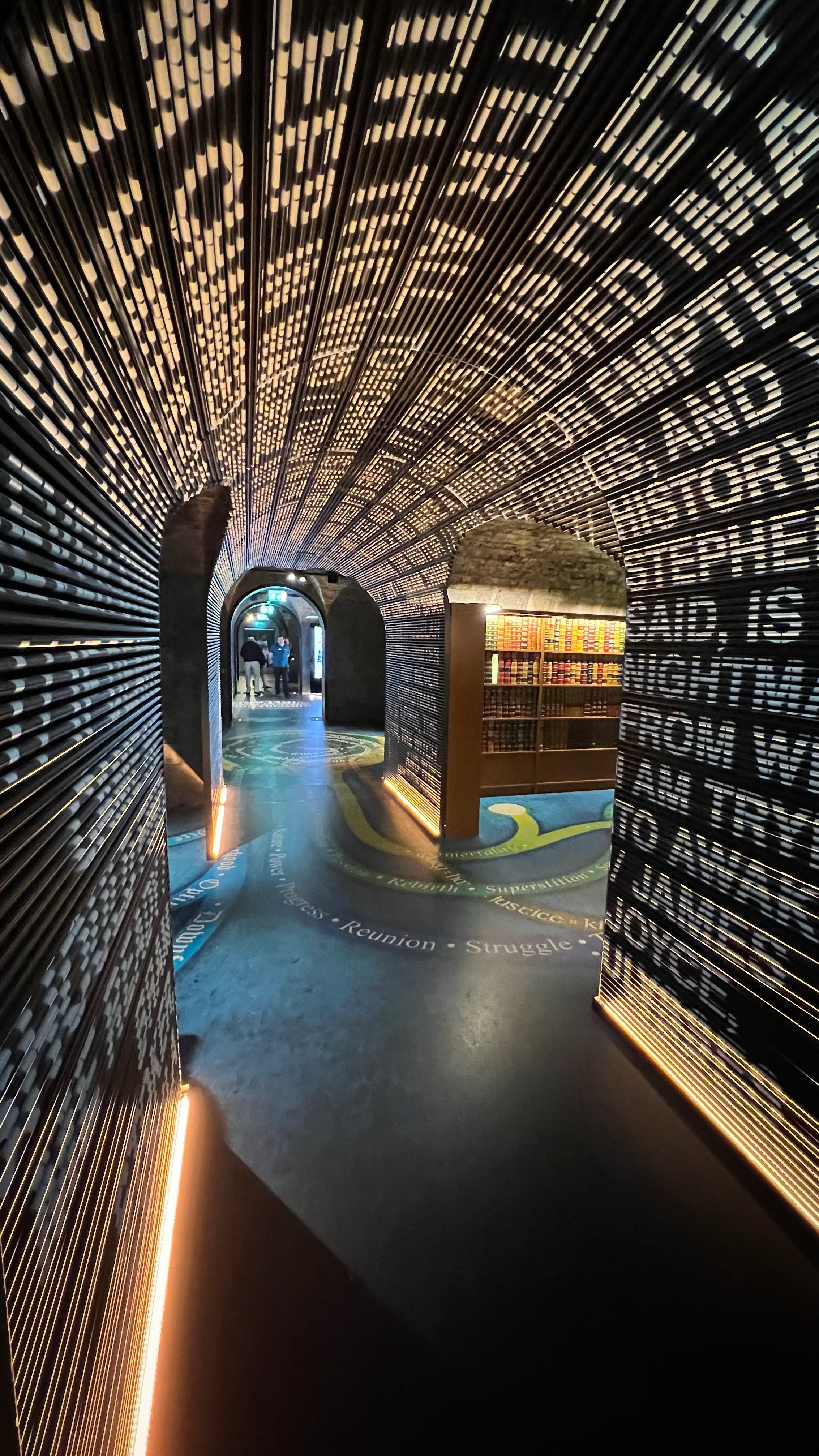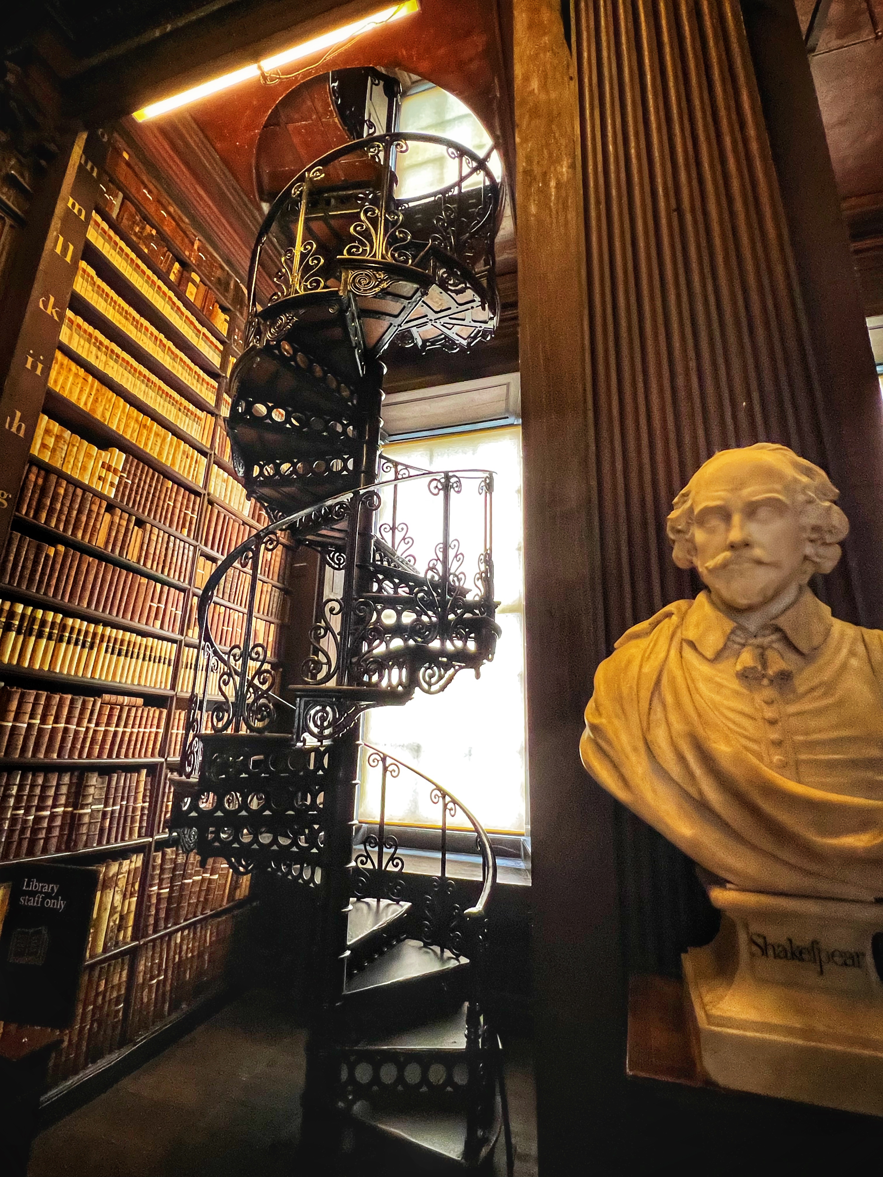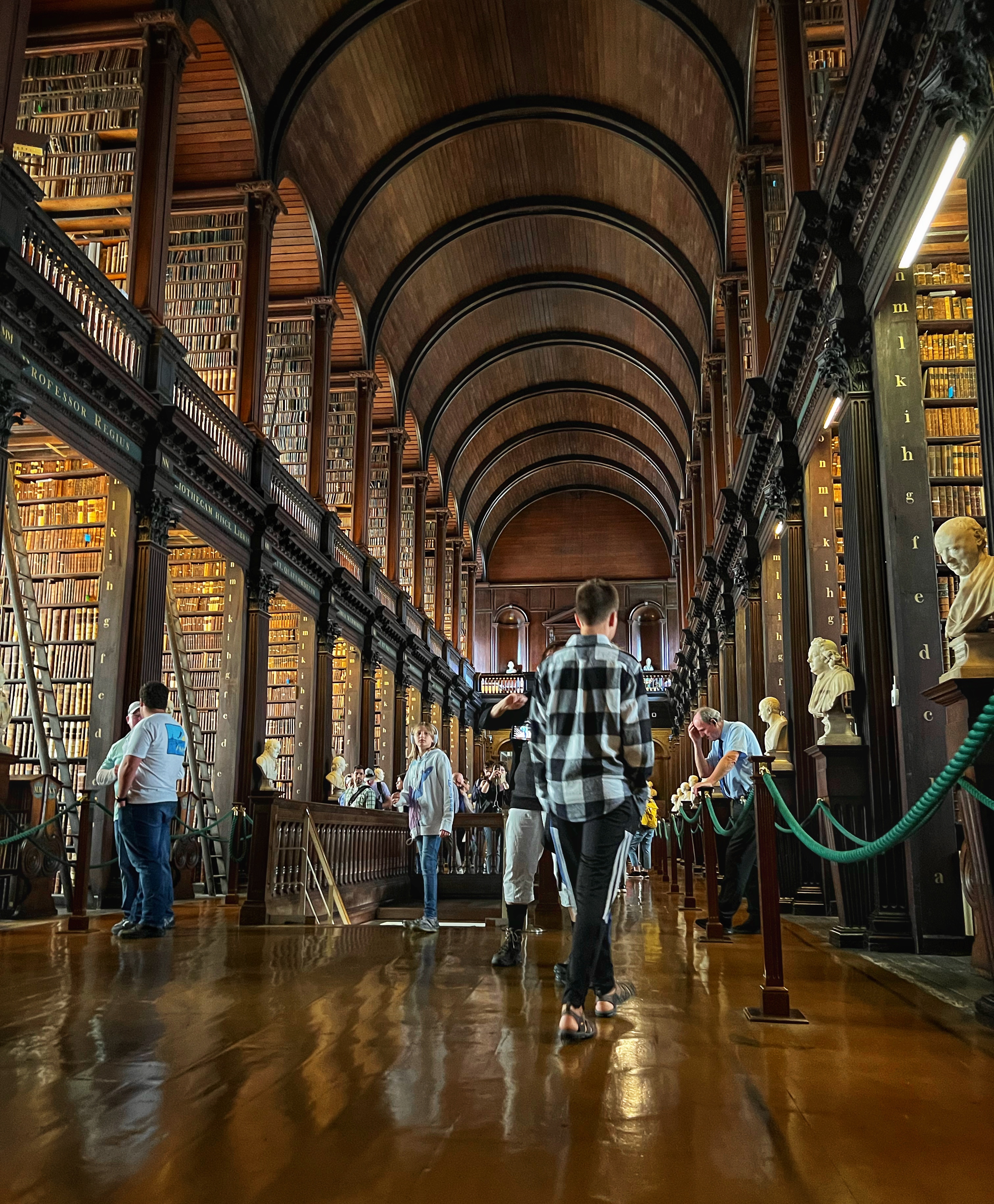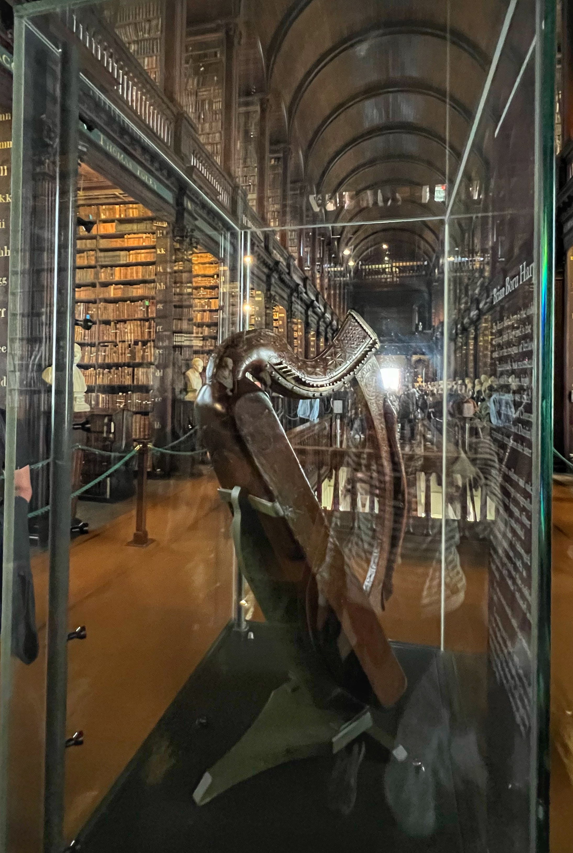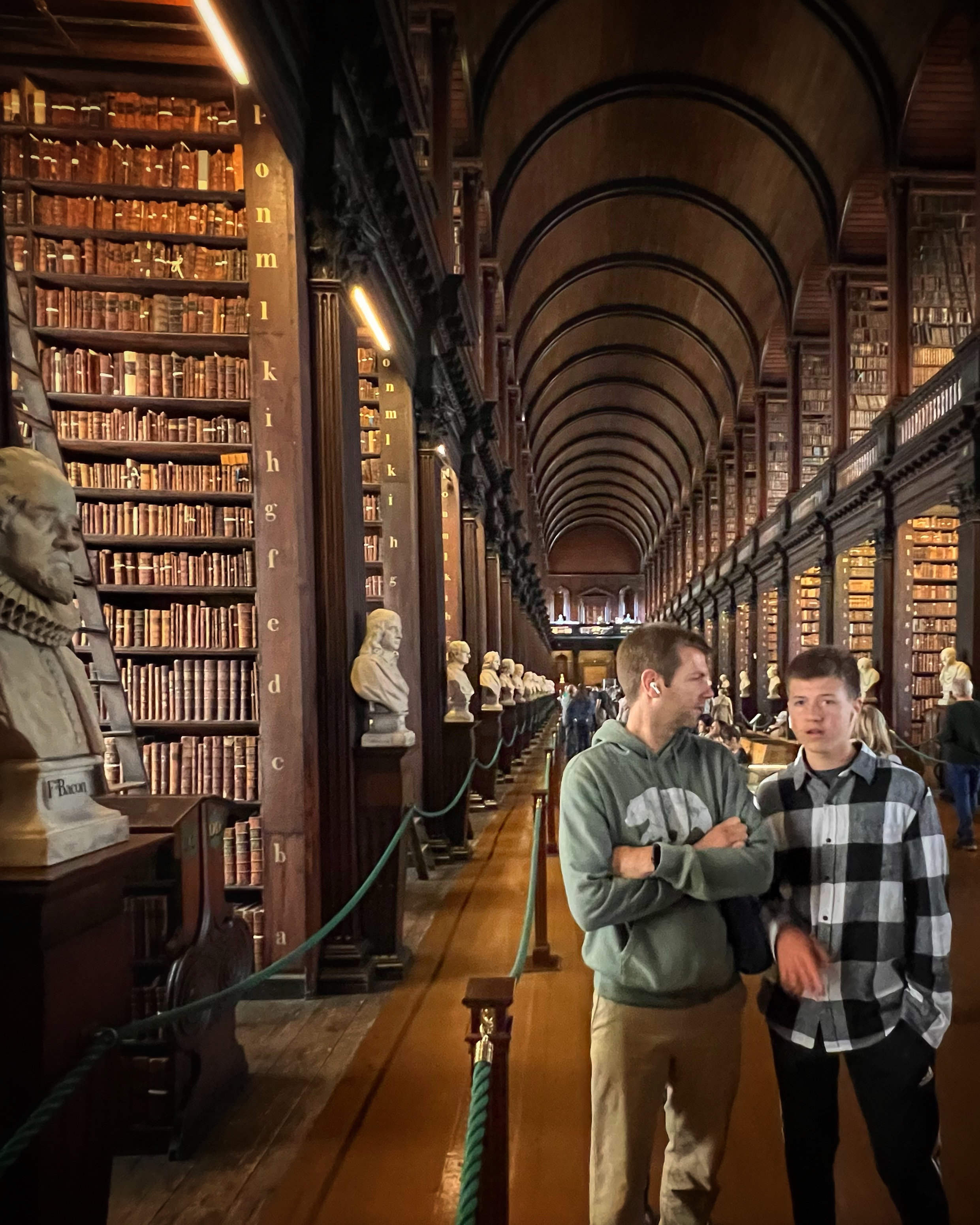 The informative exhibits for the Book of Kells take about 30 minutes to view. In the exhibit hall you are permitted to take photos as you learn about the history of the Book of Kells, but once you enter the “treasury” where the actual book is located, photos are off limits. This famous religious text was believed to be written around the year 800 AD at a Columbian monastery in the UK, but got the name Book of Kells from its home at the Abbey of Kells in Ireland, where it lived for centuries. The decorative detail and colorful designs in this Biblical text are unmatched anywhere, and are therefore priceless. After viewing the (one page of the) Book of Kells, you make your way upstairs to the infamous Long Room at the Old Library of Trinity College. Most people recognize this incredible place from Harry Potter – but the truth is, the movie was filmed in Cambridge, England! The library, however, is very similar to the Long Room and therefore has even been nicknamed the Harry Potter Library. The Trinity Old Library is actually larger than what we are able to visit as tourists, but this long room is definitely the most impressive part of the tour. Several famous artifacts are on display here, including the Brian Boru harp, a copy of the Book of Kells, and the 1916 Proclamation of the Irish Republic. After your visit you can walk downstairs into the impressive bookstore. We were there quite early, among the first tours of the day, and it was still jam packed.