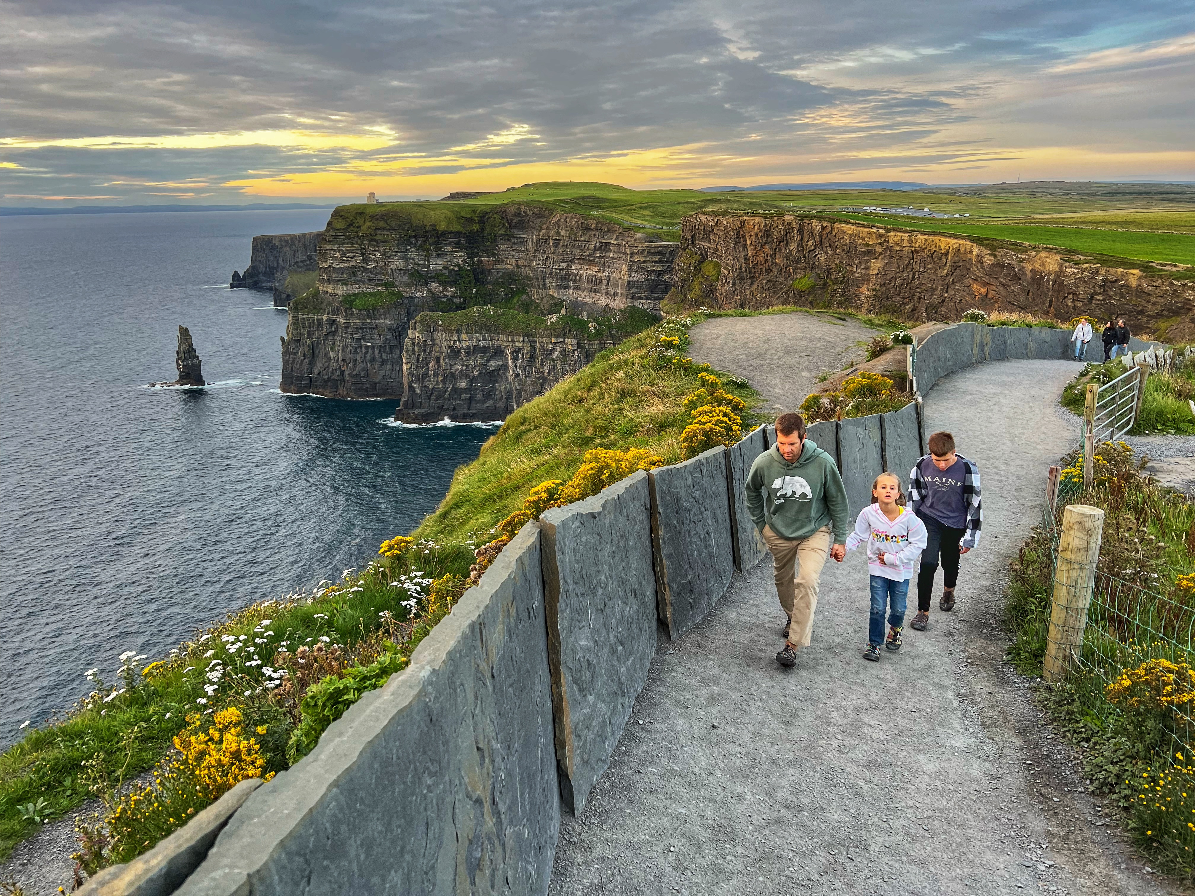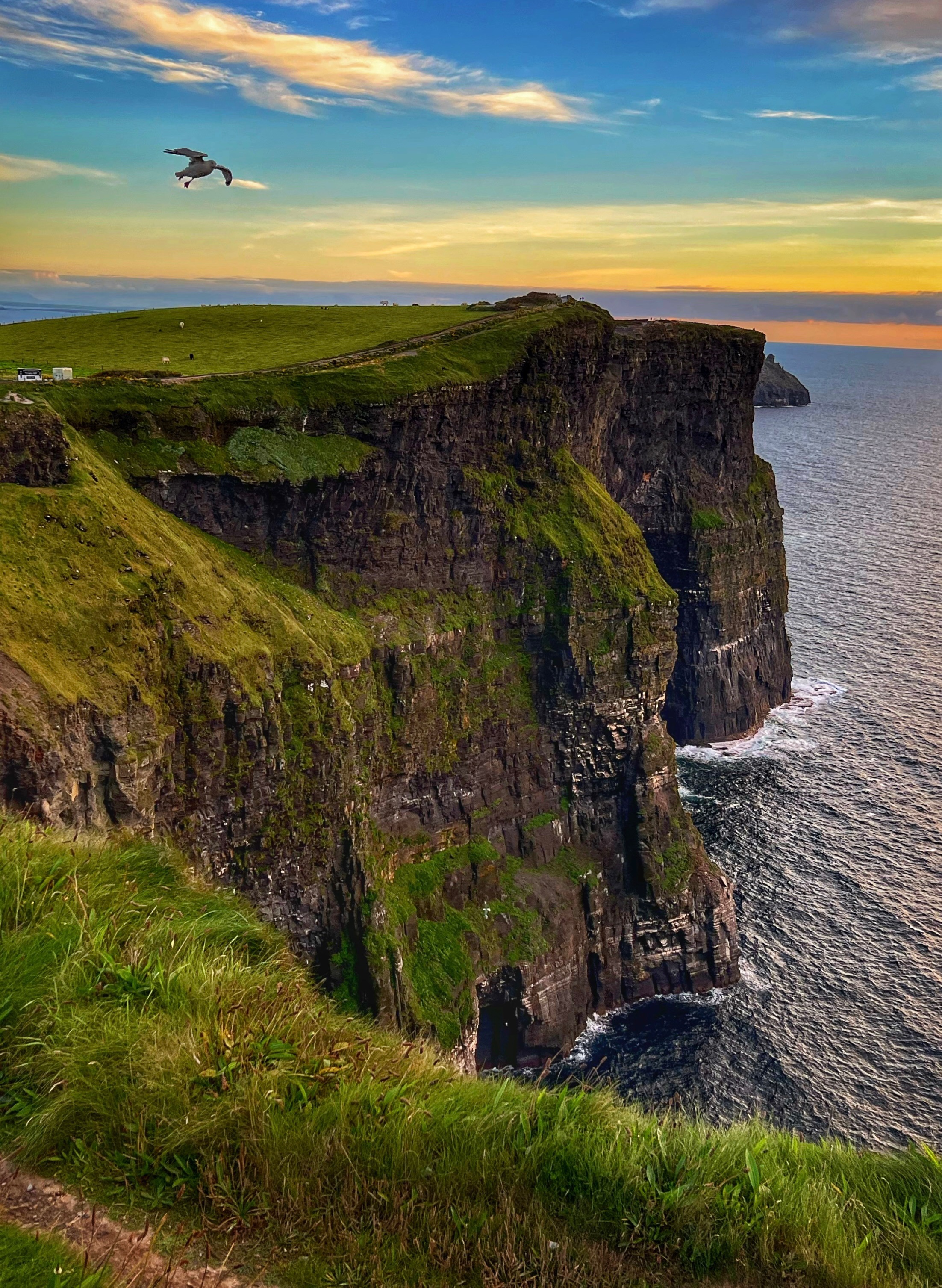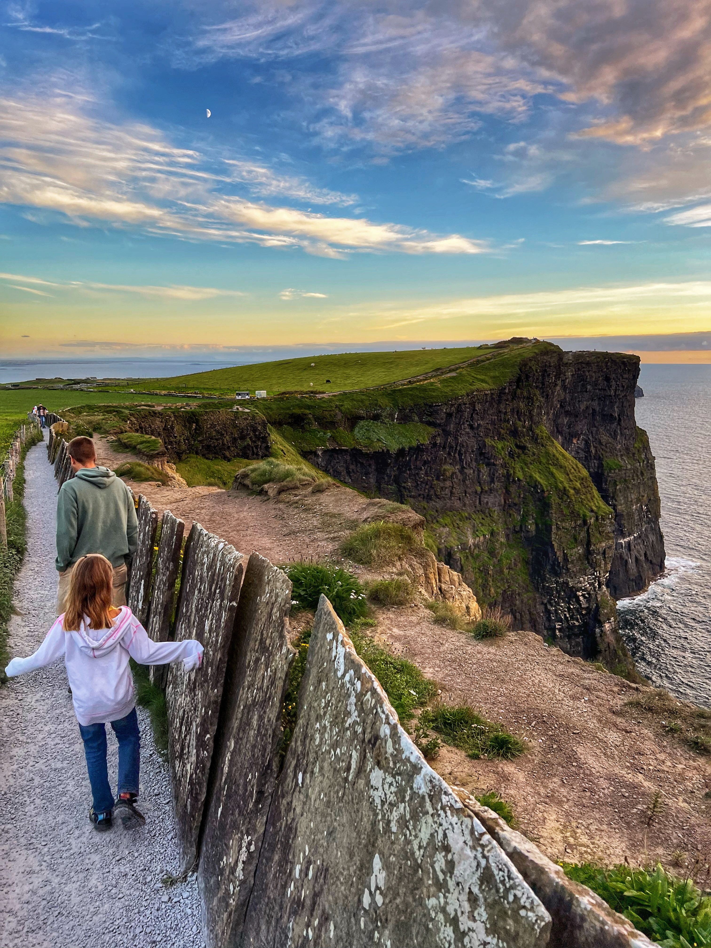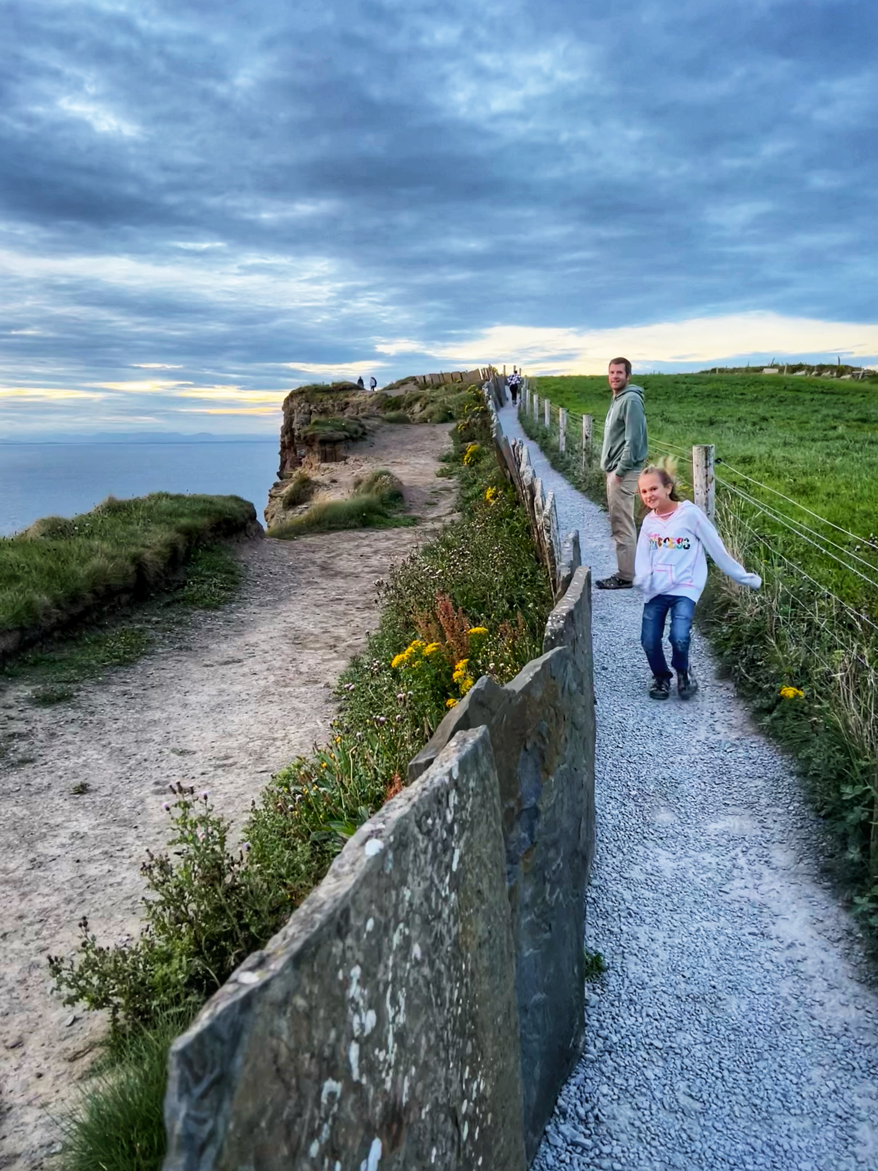 If you arrive a bit earlier, you can visit the Hungry Veggie (below) a food truck located on Burren Way path out to the south Cliffs of Moher viewpoint in the direction of Hag’s Head. I wish we could’ve had a bite to eat here before they closed at 5PM. I messaged the owner on instagram @thehungryveggiefoodtrailer to find out the hours and he said 12-5PM weather permitting, except Tuesdays. There are many, many trails along the cliffs of Moher. The most popular ones lead to O’Brien’s Tower to the north, and Moher Tower at Hag’s Head to the south. We didn’t have time to hike all the way to Moher’s Tower, but we were able to fit in walks from O’Brien’s Tower all the way to Johnston’s Quarry viewpoint area in the 2 hours we stayed to watch the sunset. The hike from the visitor center to Hag’s Head would take about one hour. The trails are very well marked and labeled (with warning signs), but people were still hopping over for closer-to-the-cliffs views. Just be extra careful, especially with kids.