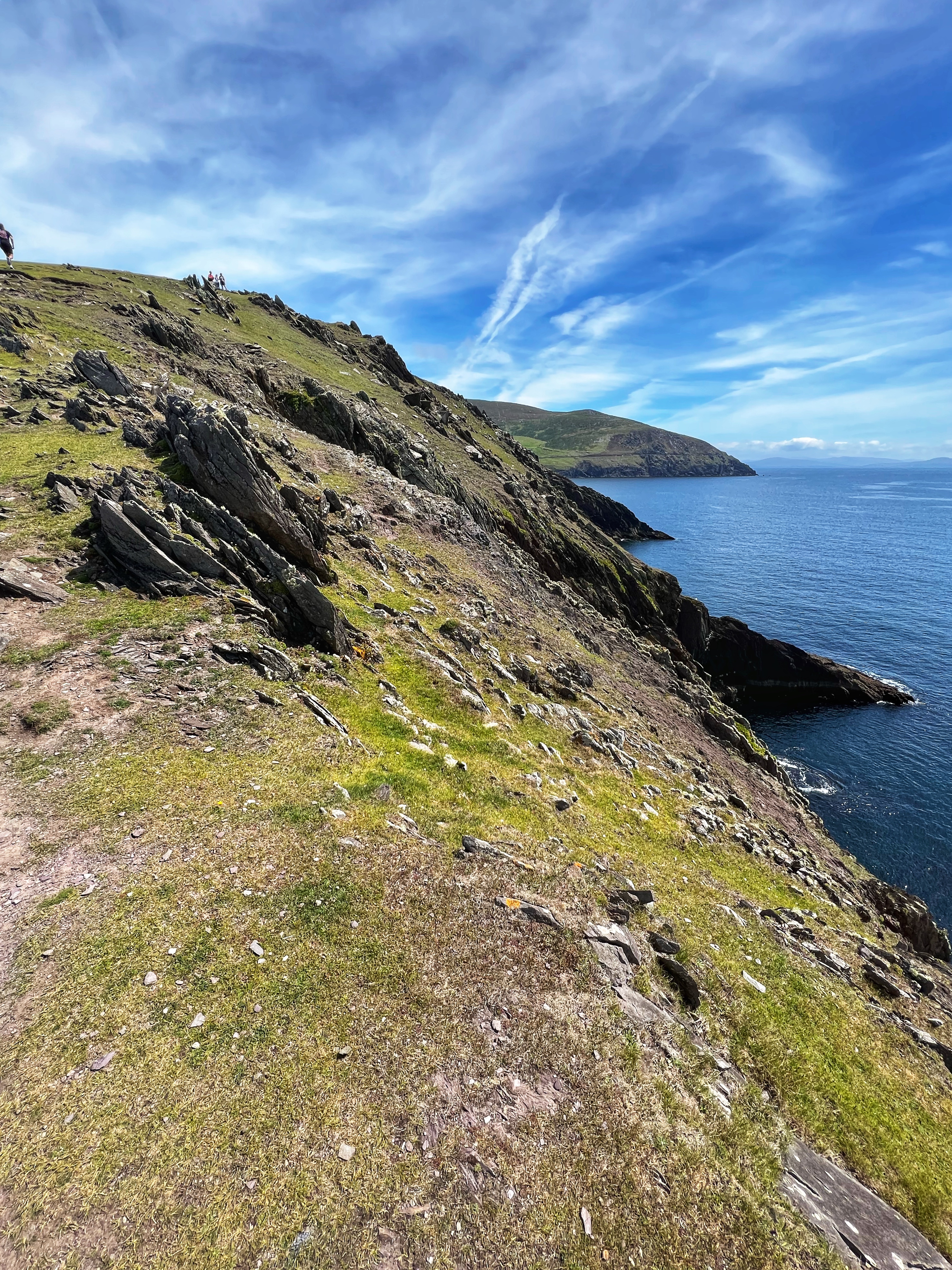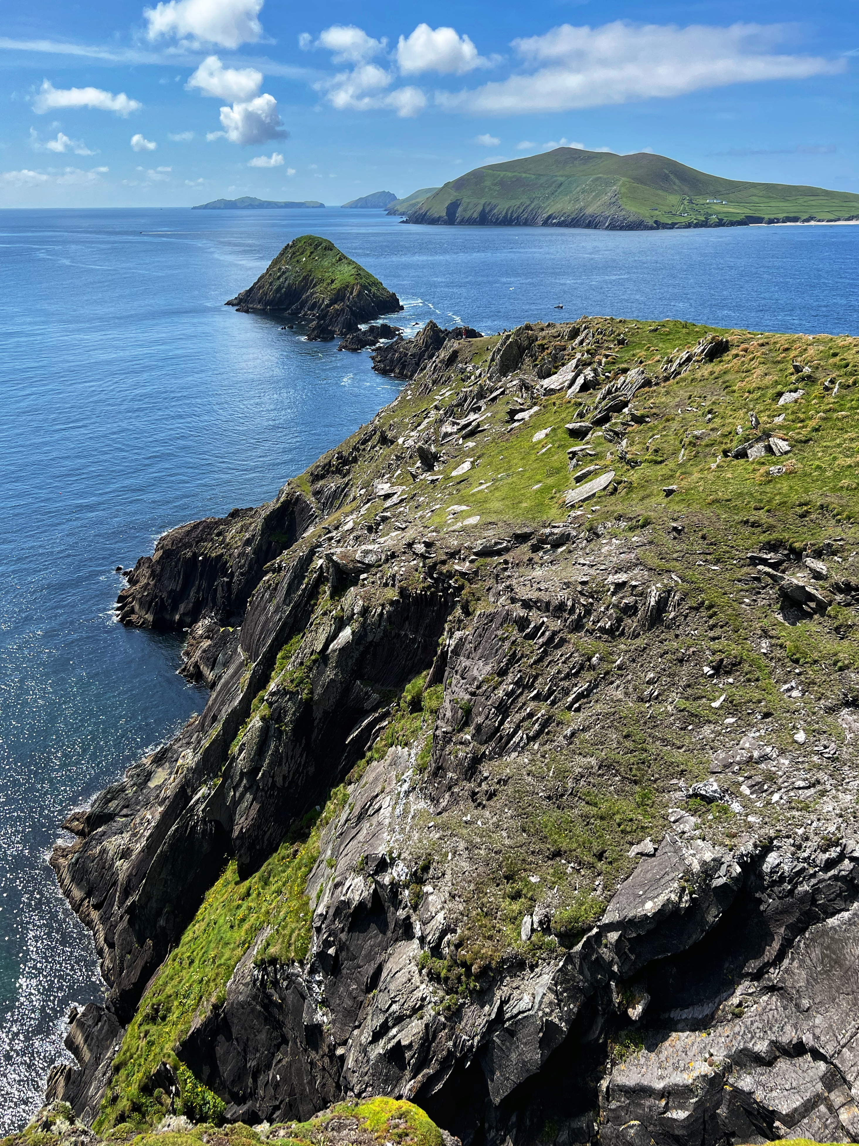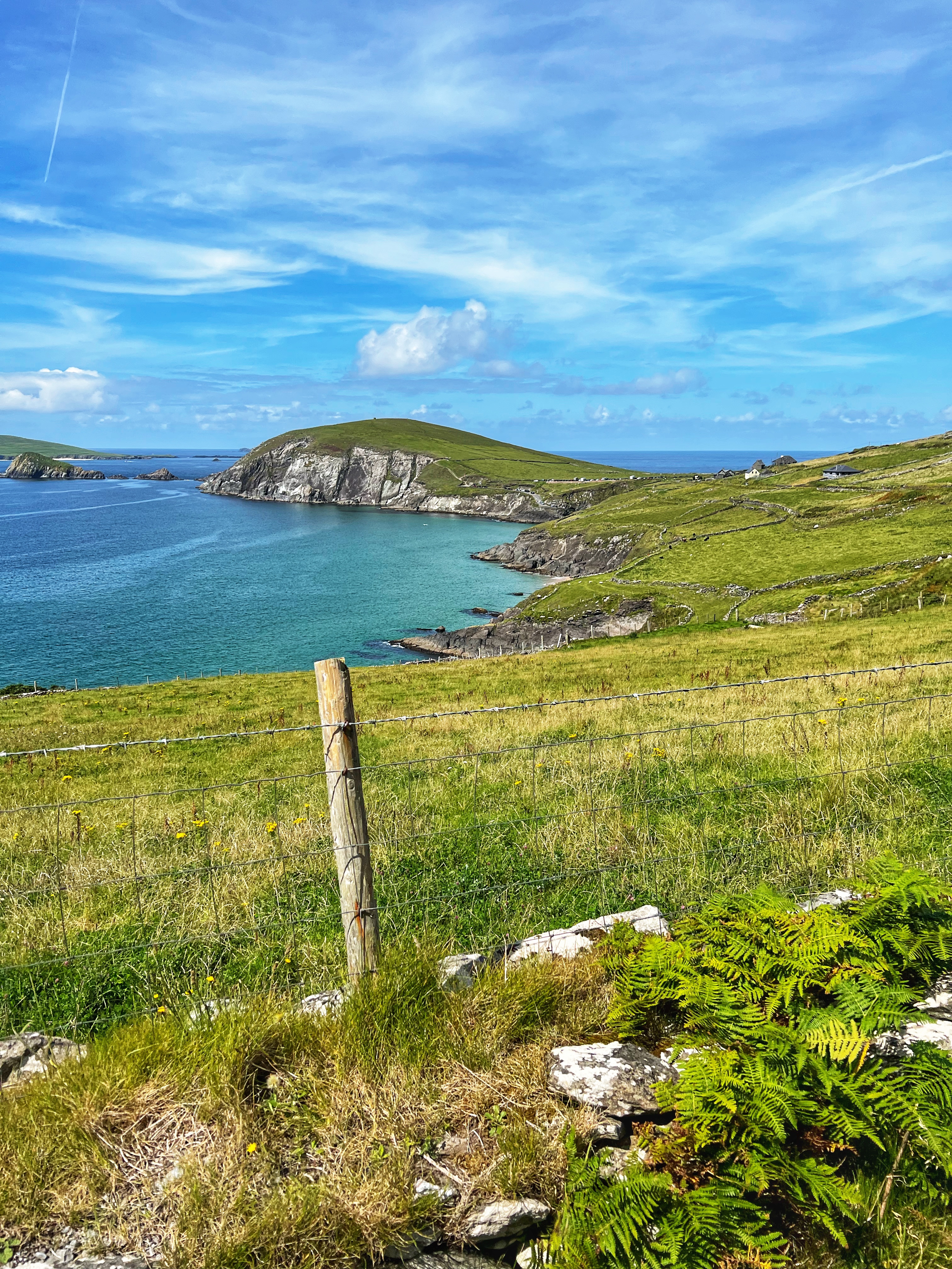 It was a bit foggy when we first awoke at the Cliffs of Moher, but we were eager to head south to the Dingle Peninsula, so we hit the road by 8AM. It was a 3h45m drive down to Dunmore Head. Of course we stopped at several beautiful viewpoints along the way. The coast of Ireland is so green and breathtaking!