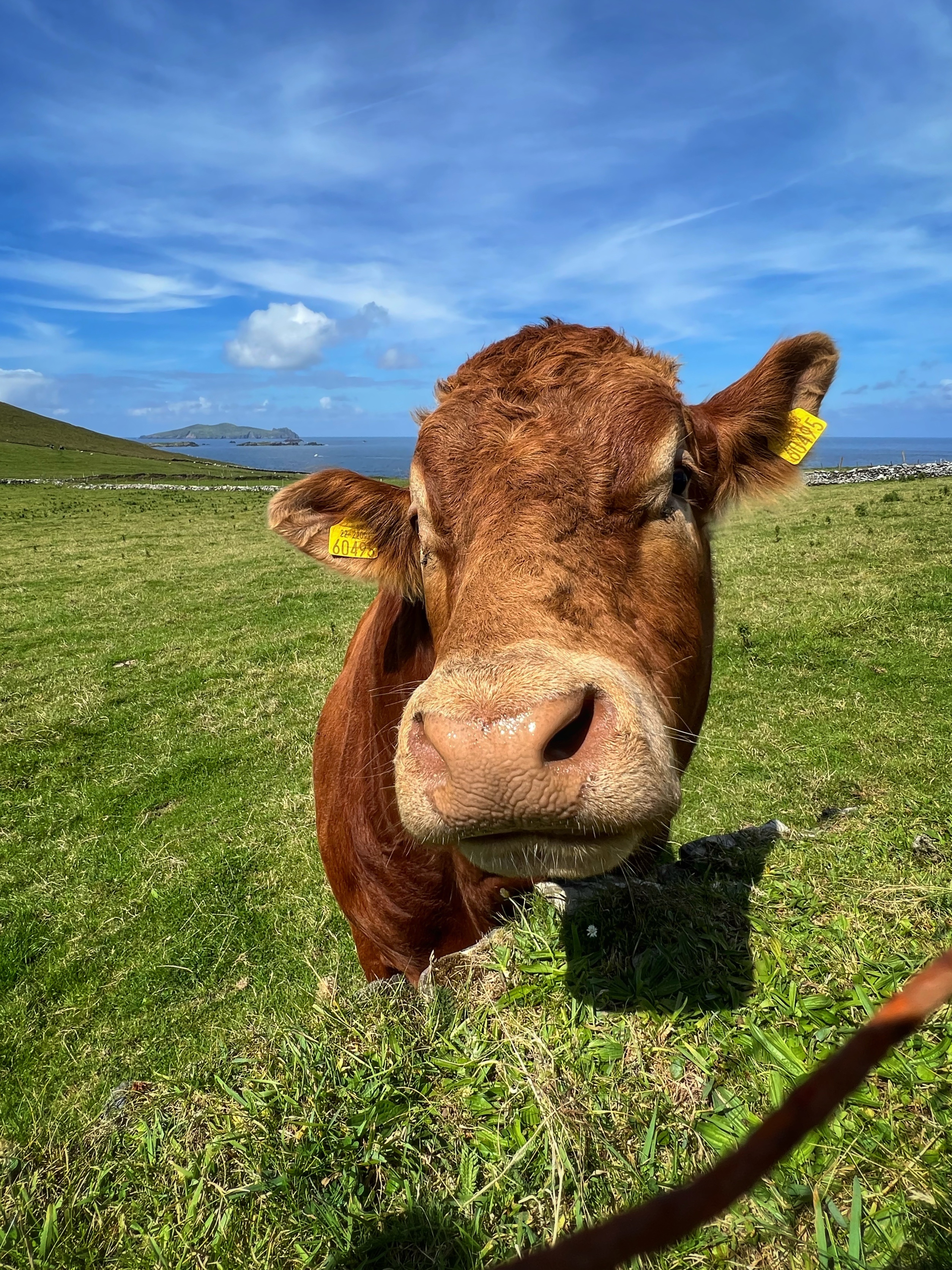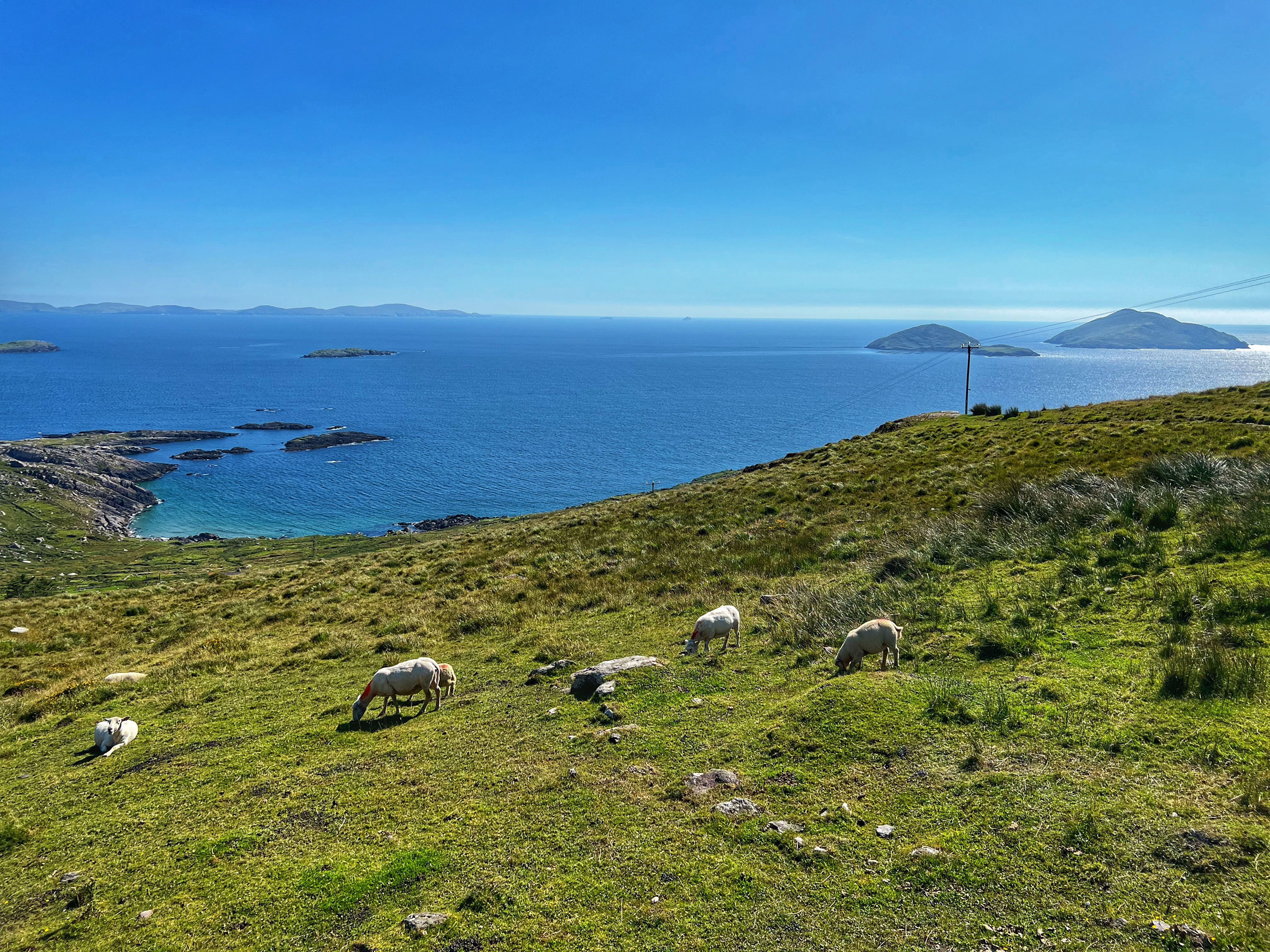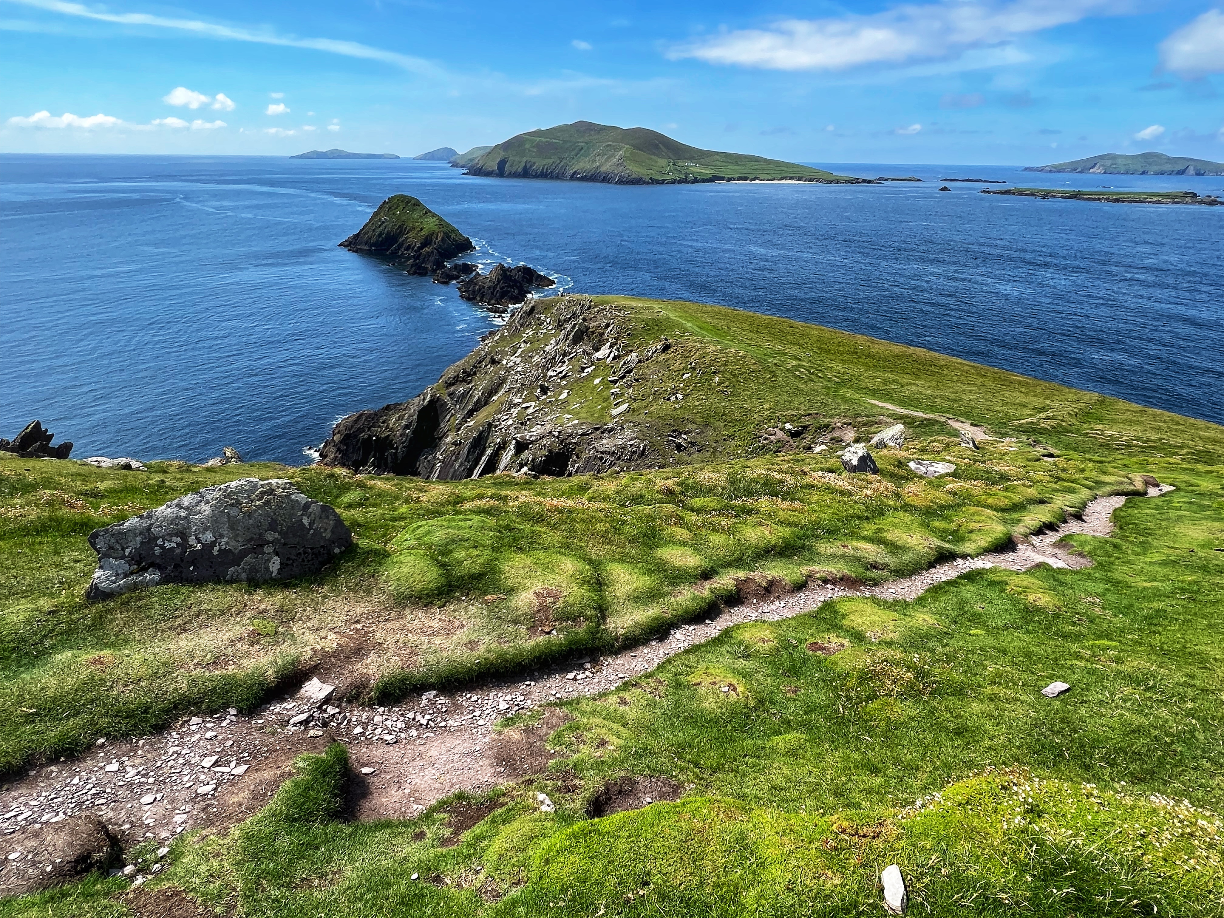 It was a bit foggy when we first awoke at the Cliffs of Moher, but we were eager to head south to the Dingle Peninsula, so we hit the road by 8AM. It was a 3h45m drive down to Dunmore Head. Of course we stopped at several beautiful viewpoints along the way. The coast of Ireland is so green and breathtaking!