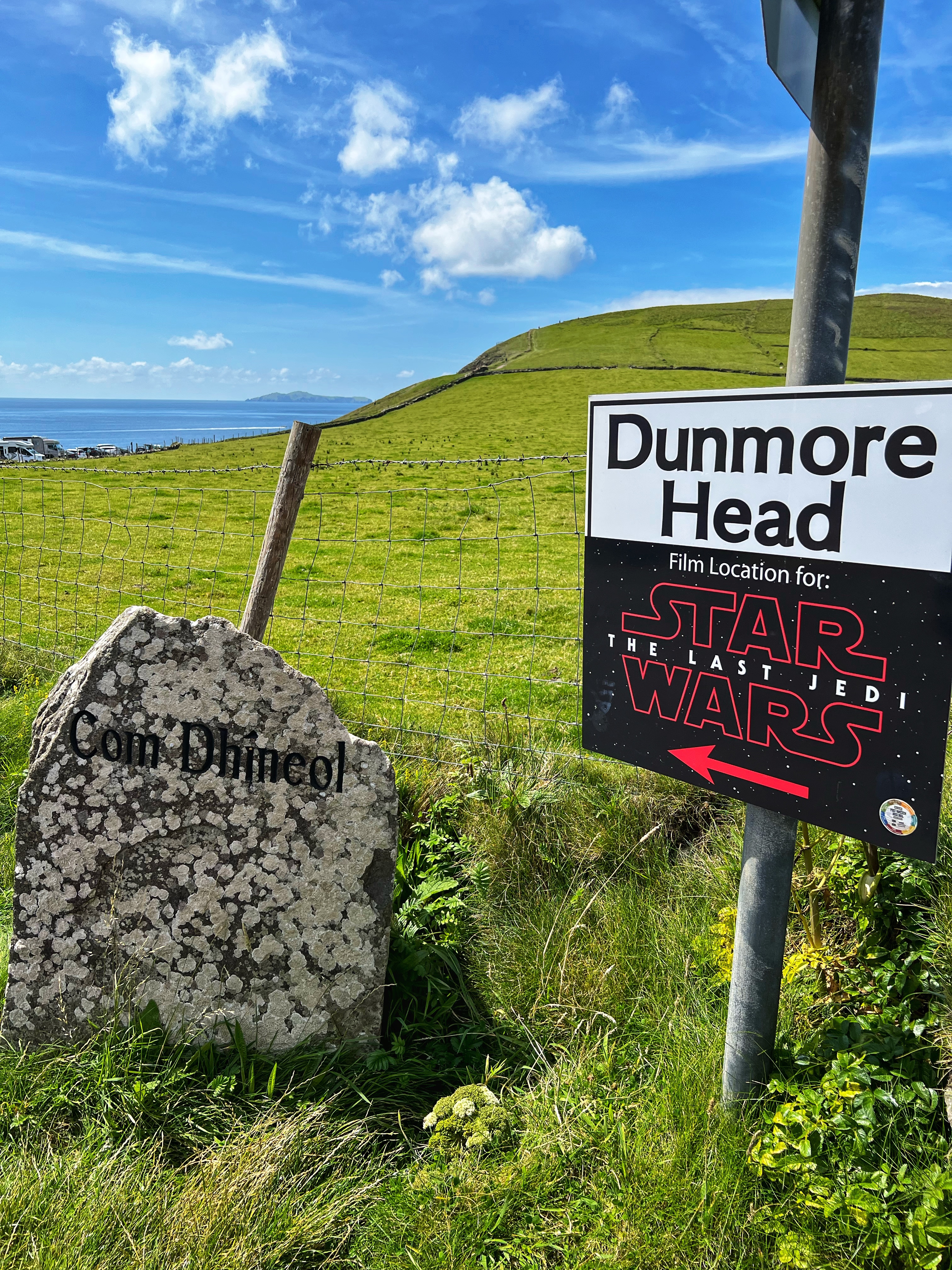 The first thing you have to do at Dunmore Head (besides drop in a 1€ donation in the trail head box) is hike up and over (or around) the hill to the tip of the peninsula. The views are incredible in all directions, and the grass feels just like a golf course. Clearly there are sheep who graze here occasionally (as evidenced by the poo), but otherwise this is a pristine spot, great for a picnic and especially magnificent for STAR WARS fans. As you can see, this is a STAR WARS filming location. Only a few shots were taken here for Episode 8 The Last Jedi, but they’re iconic. Do you recognize them? The scene where Luke extracts green milk from the thala on “Ahch-To” was filmed here!