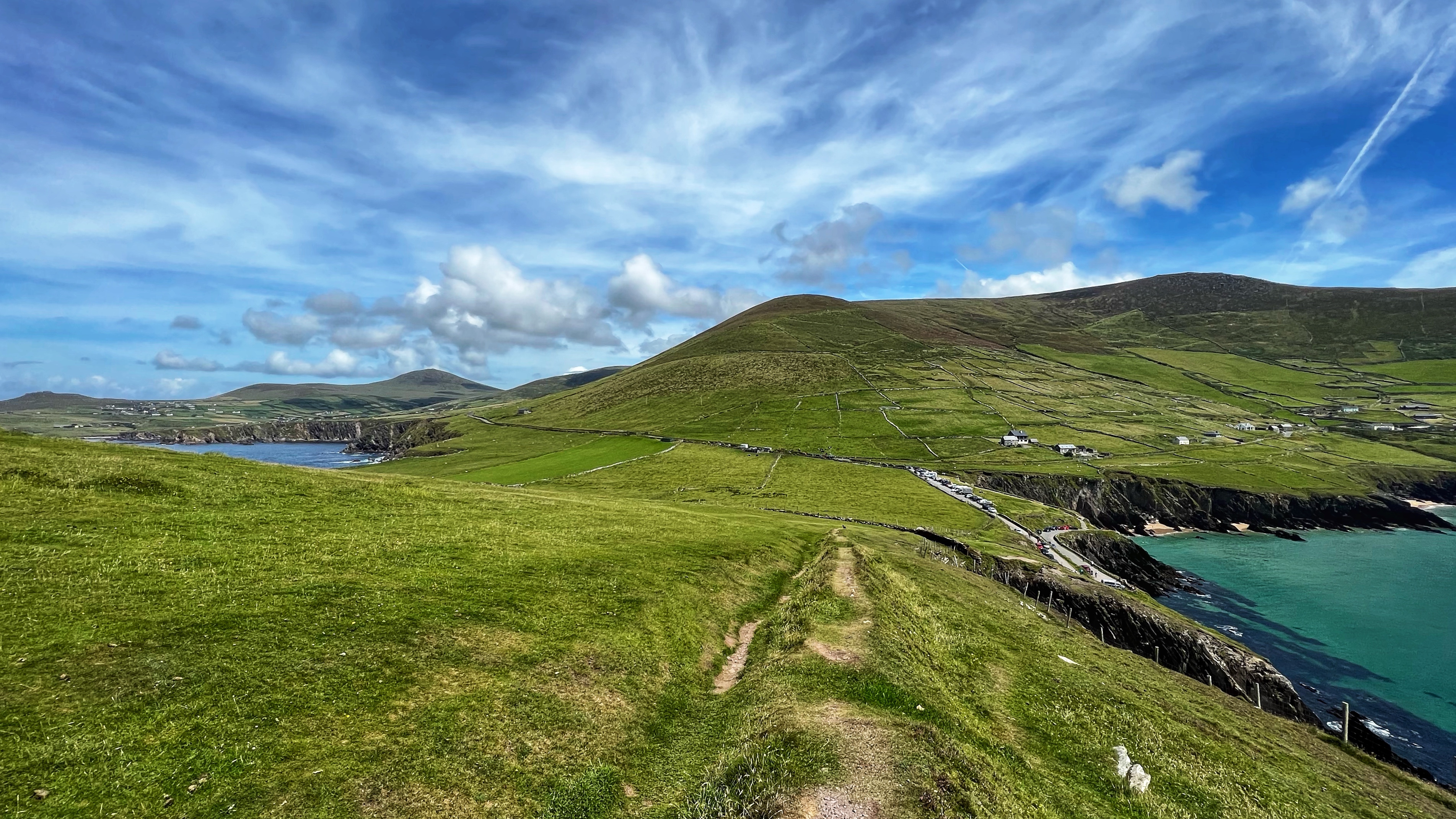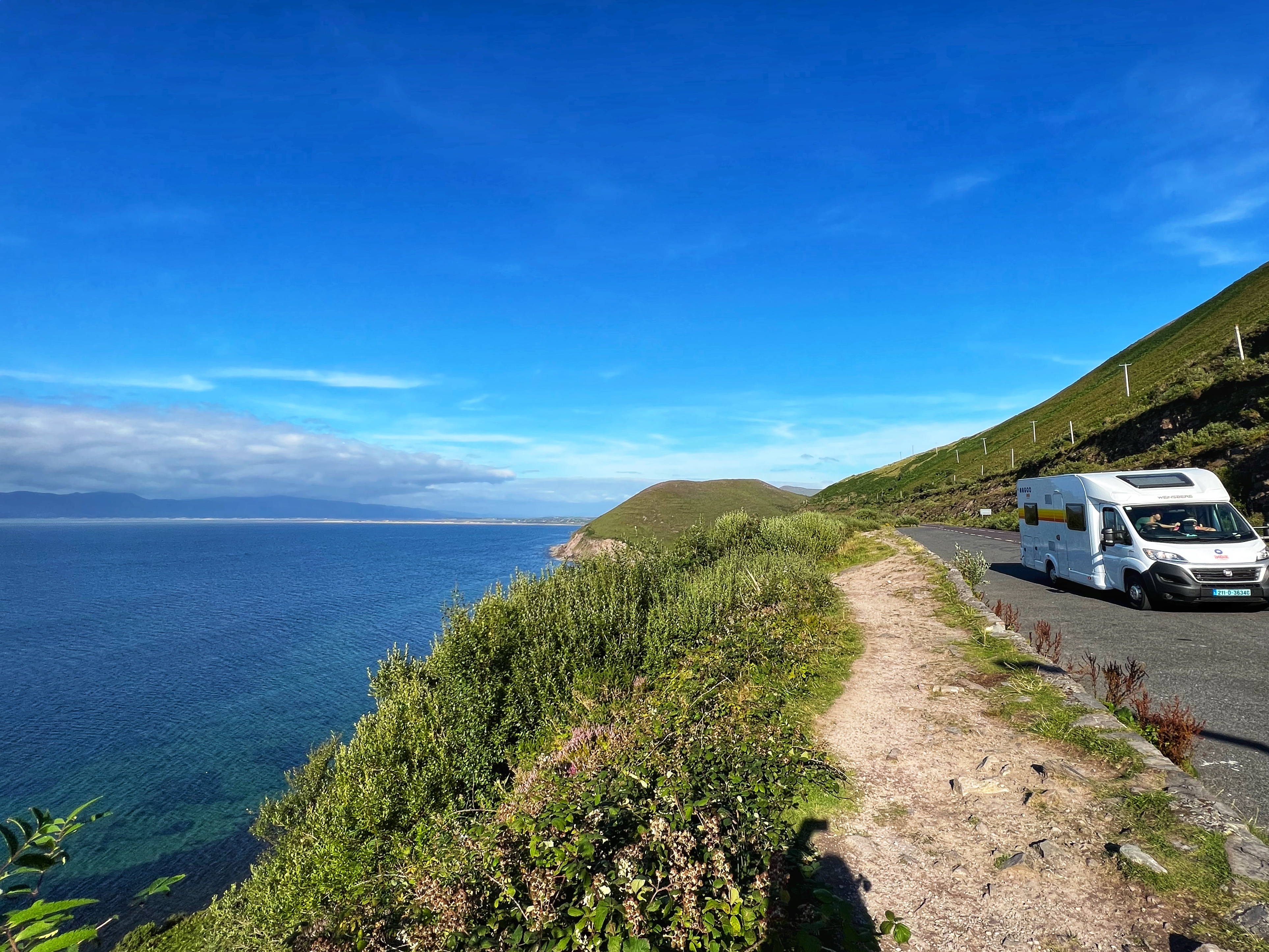 The Dingle Peninsula is a unique place that you can only drive clockwise around during the day (keep this in mind) but you wouldn’t want it any other way. The roads are narrow on the Slea Head Drive (the name of the loop around the Dingle Peninsula), so it helps when the traffic is mostly going in the same direction, especially as there are amazing views that will be quite distracting. We didn’t stop – we went straight for Dunmore Head. When we arrived there at the tip of the Dingle Peninsula, we parked our big campervan along the road. This was the only place that turned out to be a little hairy (we dinged the bumper on the way out) but that’s probably because we visited mid summer on one of the best weather days, so the small parking lots were full and there was quite a bit of traffic.