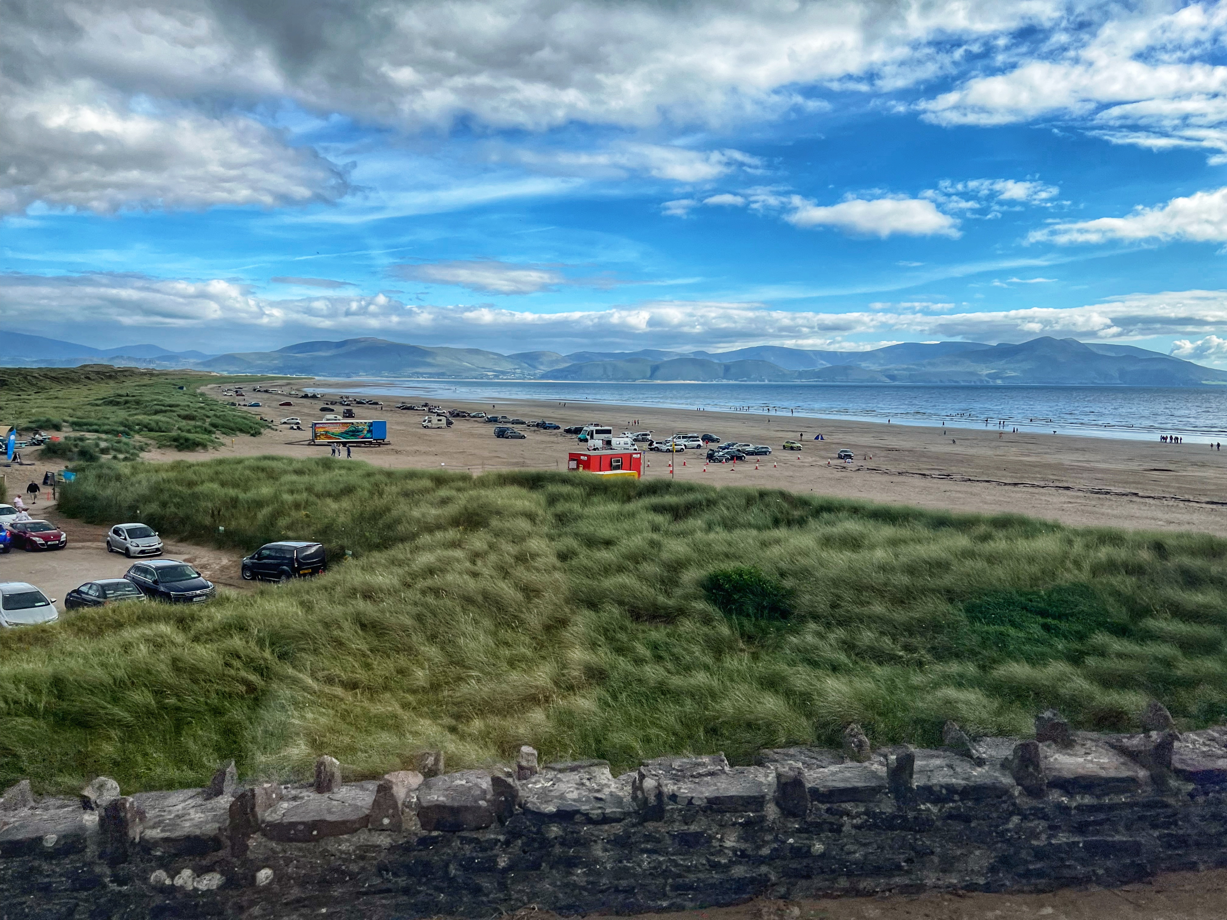 Clogher Strand is pictured below left, but just before that is Dunquin Pier. Dunquin Pier is a beautiful pitstop about 1km after leaving Dunmore Head. It’s definitely worth a quick walk down the pier for a view overlooking the back side of Dunmore Head and Great Blasket Island. We continued along the Slea Head Drive until it reconnected with the main road in Dingle, then headed east until we reached the end of the peninsula, passing Inch Beach along the way. We met up with the Ring of Kerry at the River Caragh Viewing Point and finished the gorgeous drive along the north rim of the Ring of Kerry, arriving at Portmagee in time for a delicious dinner at The Moorings restaurant and lovely sunset over the coast. We parked for free behind the Catholic Church in Portmagee, and again we weren’t the only ones! Two other campervans were there overnight as well.