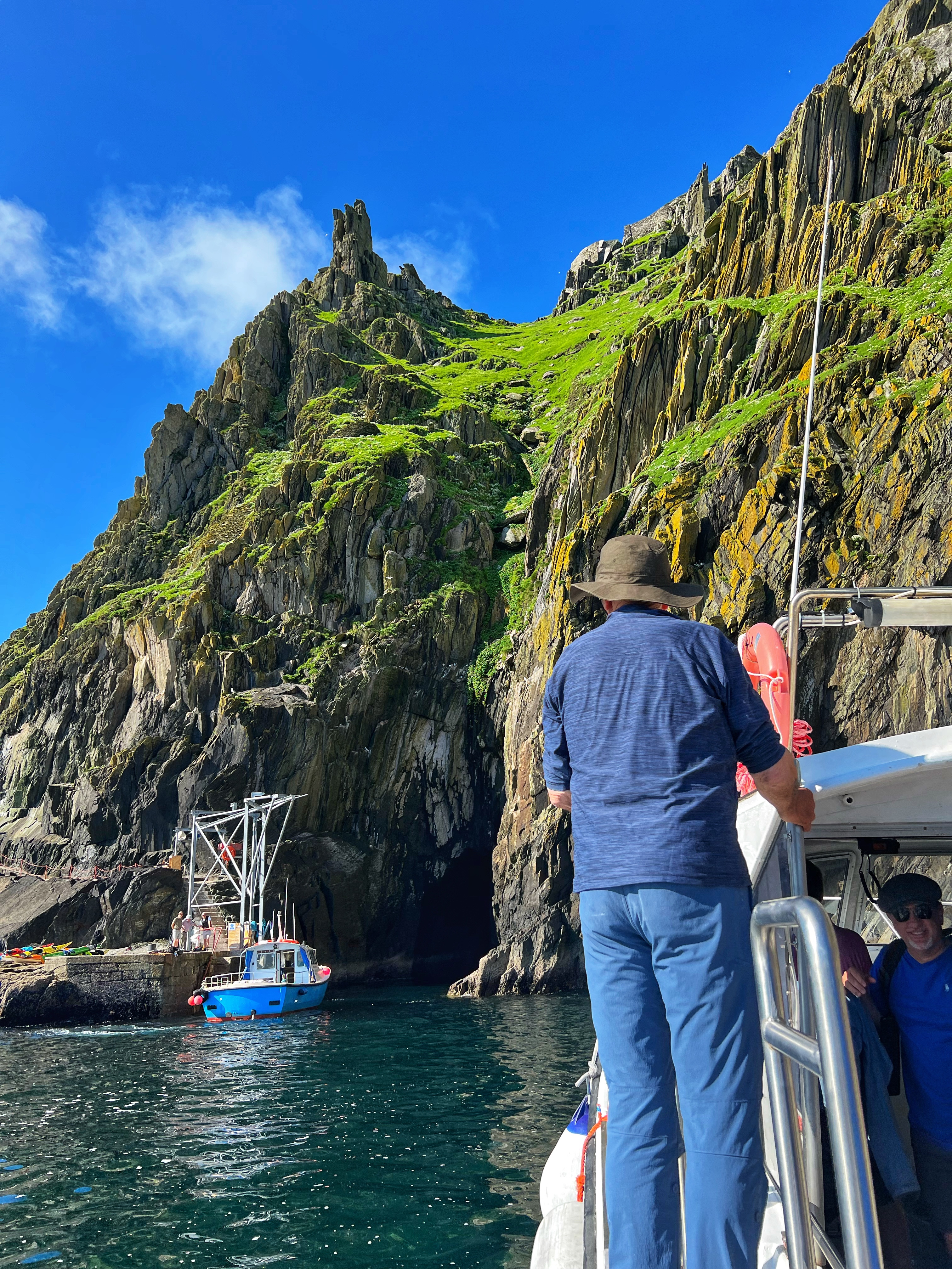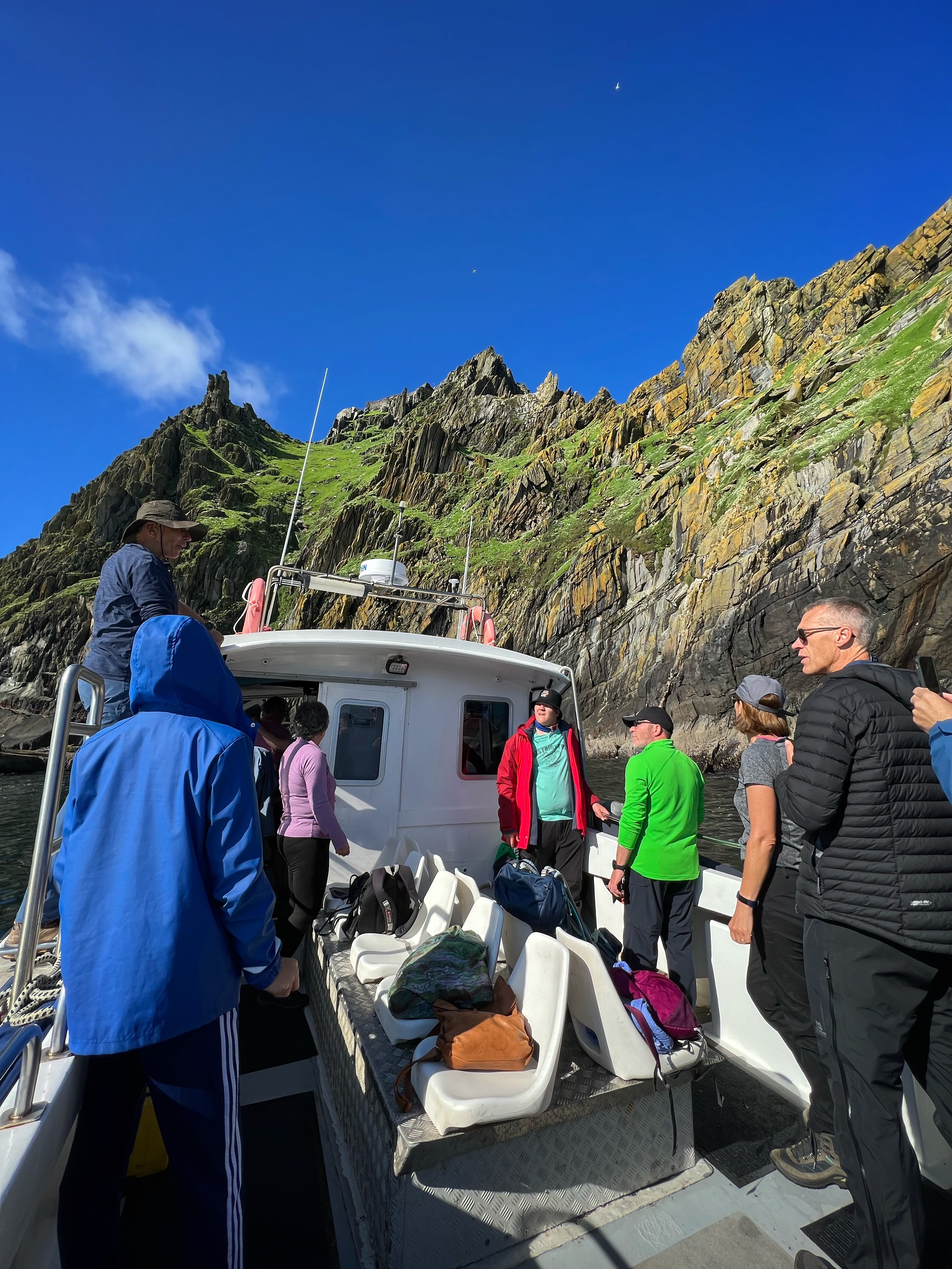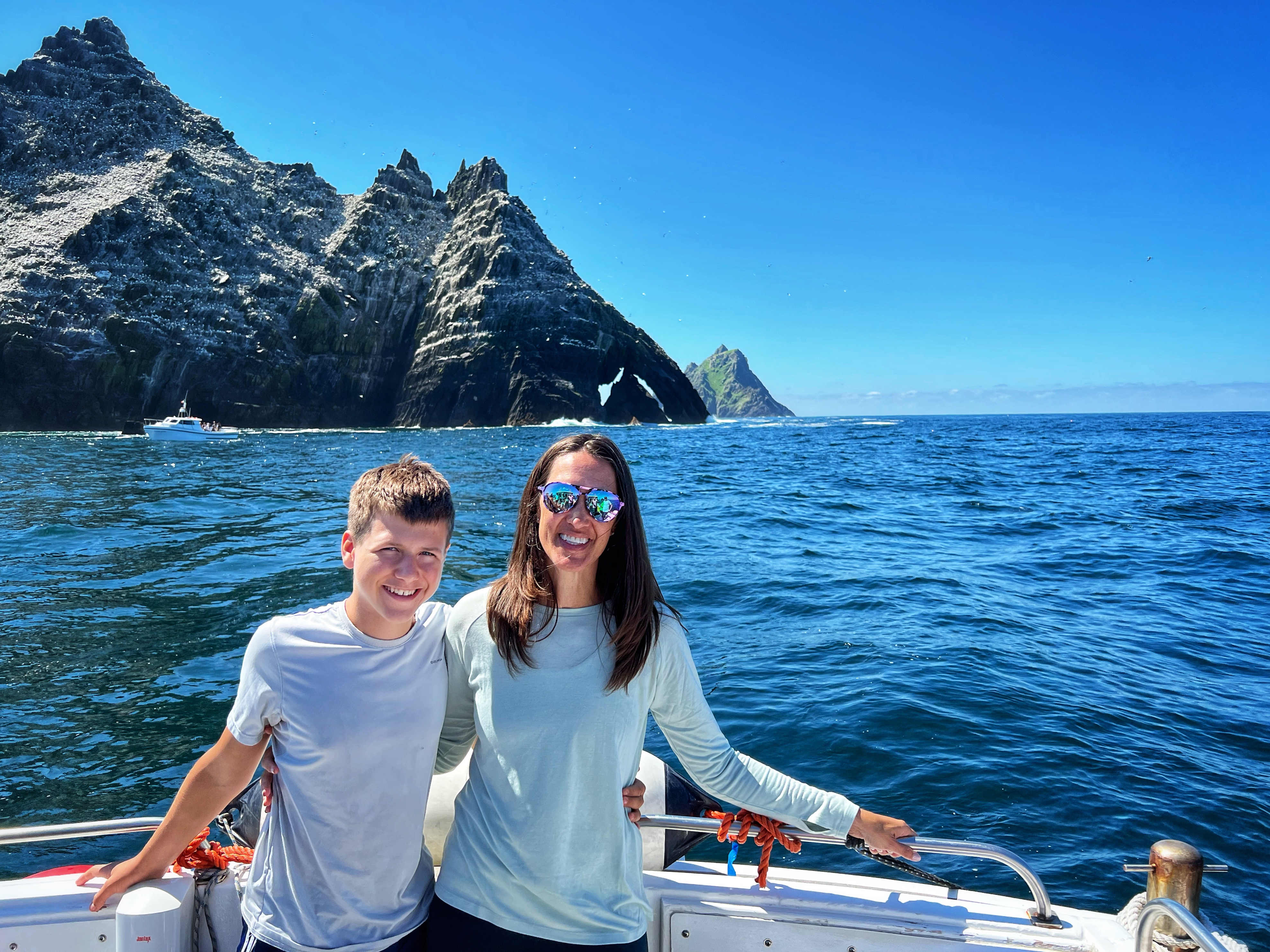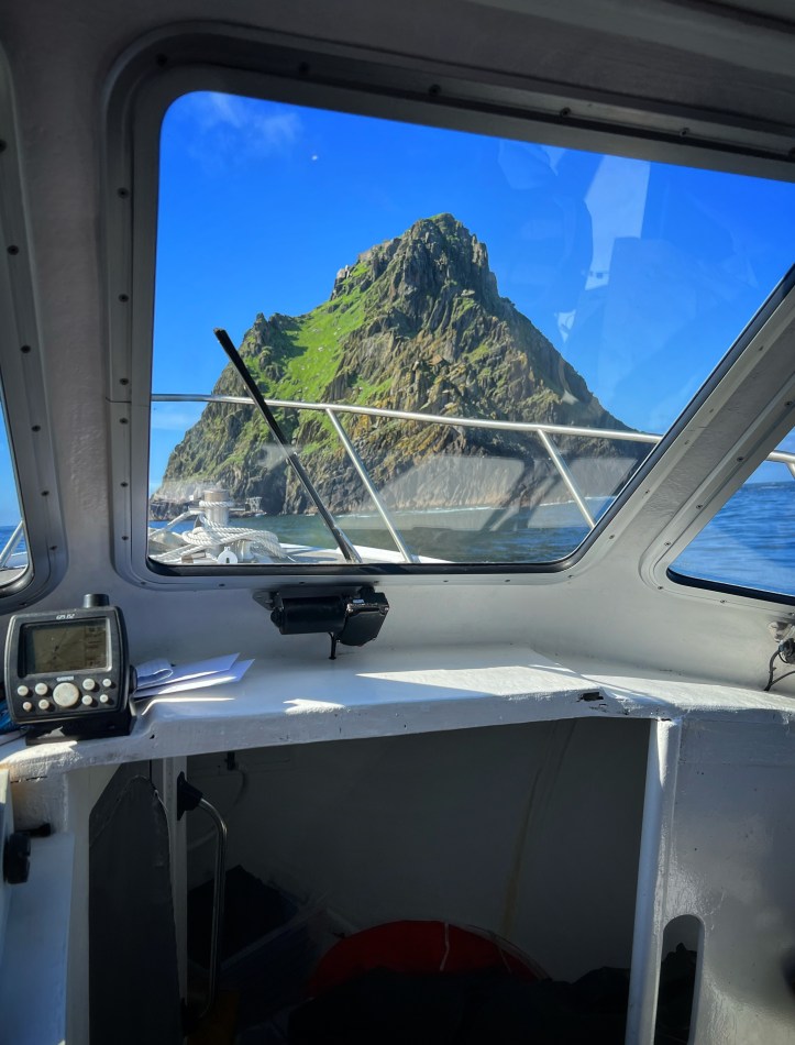‘Twas a day for tours! My son and I were very excited for our landing tour on Skellig Michael and boat tour around the coast and Skellig islands, but even more jazzed that it was a bluebird day with calm seas. There truly couldn’t have been better conditions. We were all layered up in warm, weatherproof clothes, but it turned out we didn’t need half of those layers and ended up stripping them off as it got HOT on our hike! More on that later…
