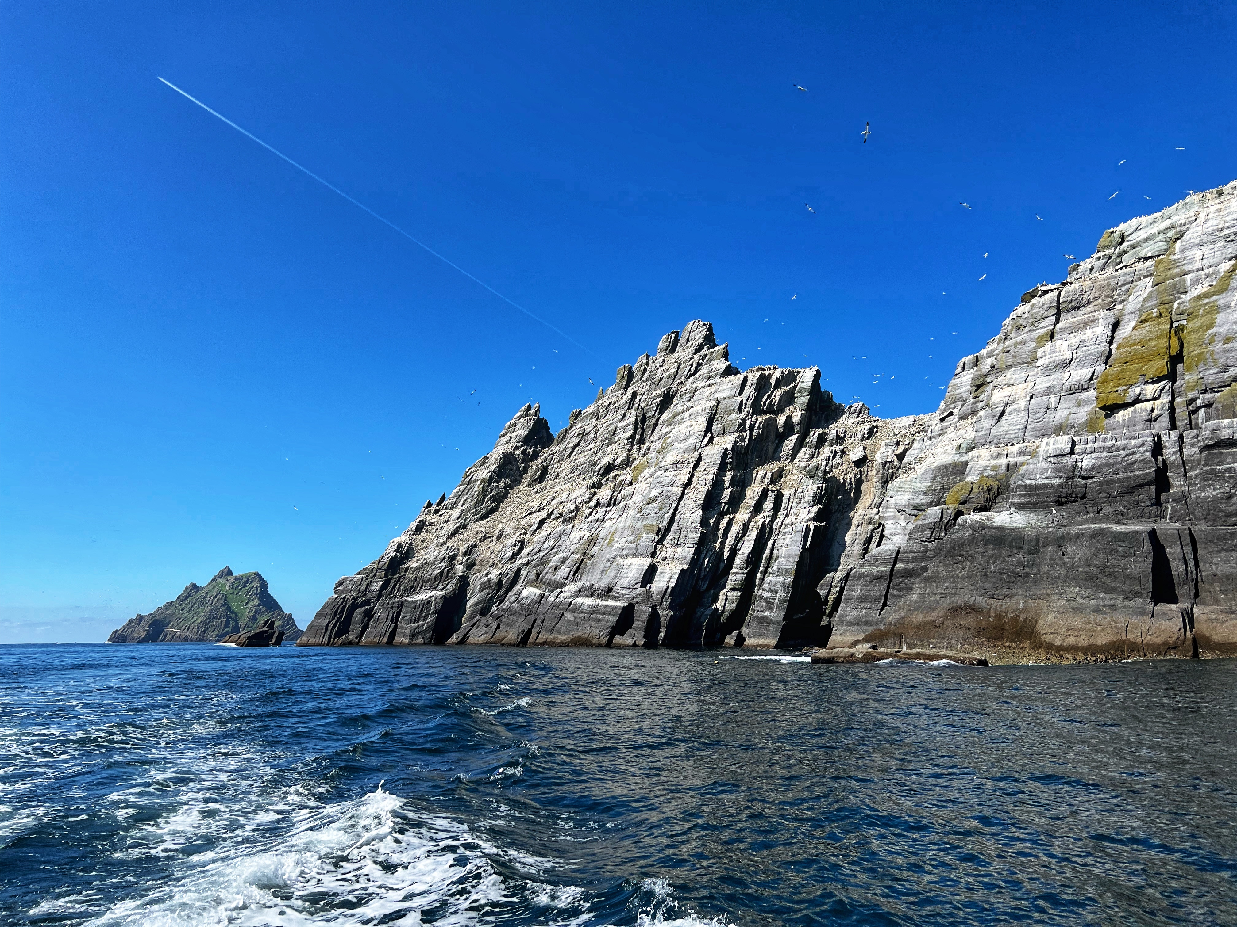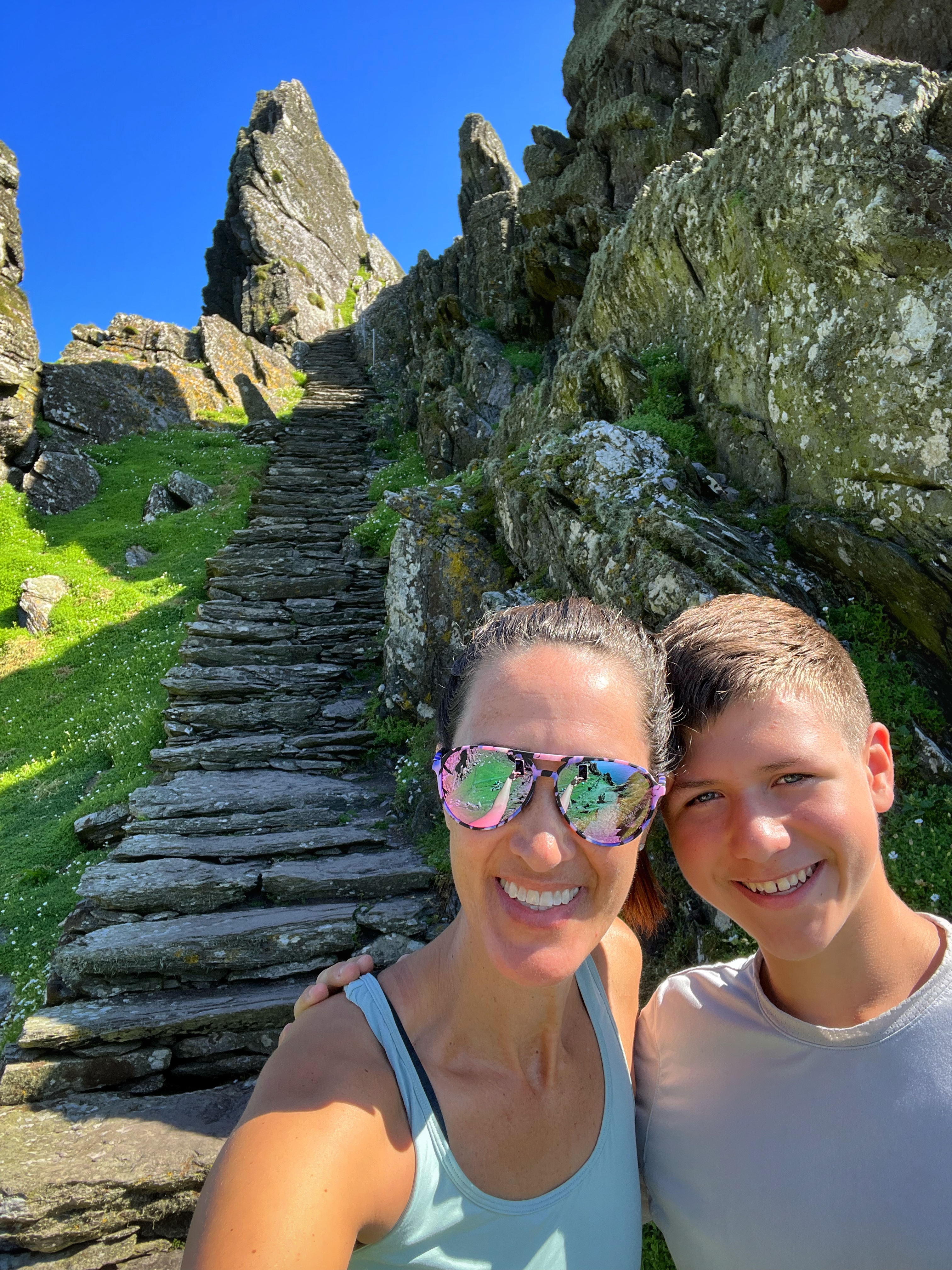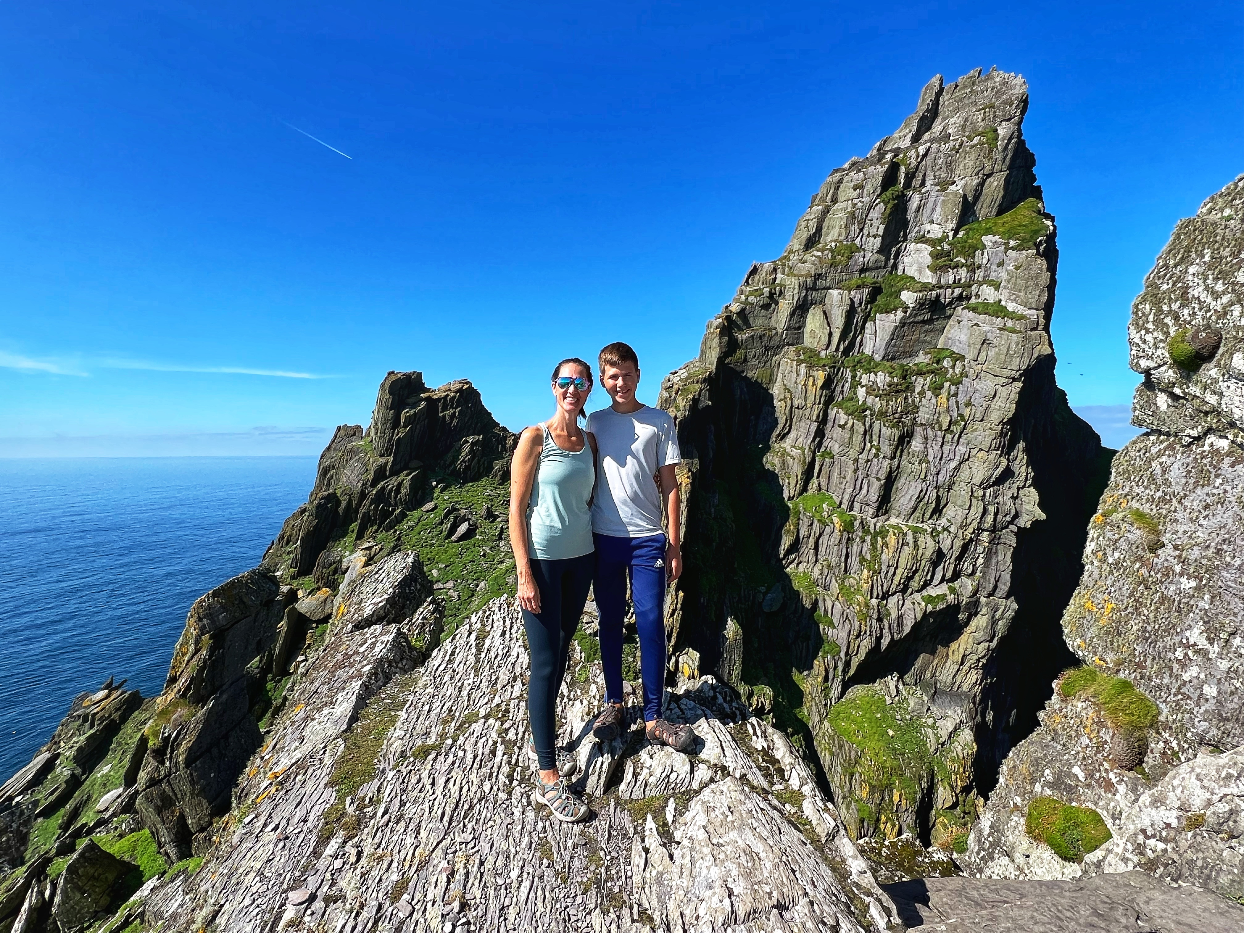 ‘Twas a day for tours! My son and I were very excited for our landing tour on Skellig Michael and boat tour around the coast and Skellig islands, but even more jazzed that it was a bluebird day with calm seas. There truly couldn’t have been better conditions. We were all layered up in warm, weatherproof clothes, but it turned out we didn’t need half of those layers and ended up stripping them off as it got HOT on our hike! More on that later…