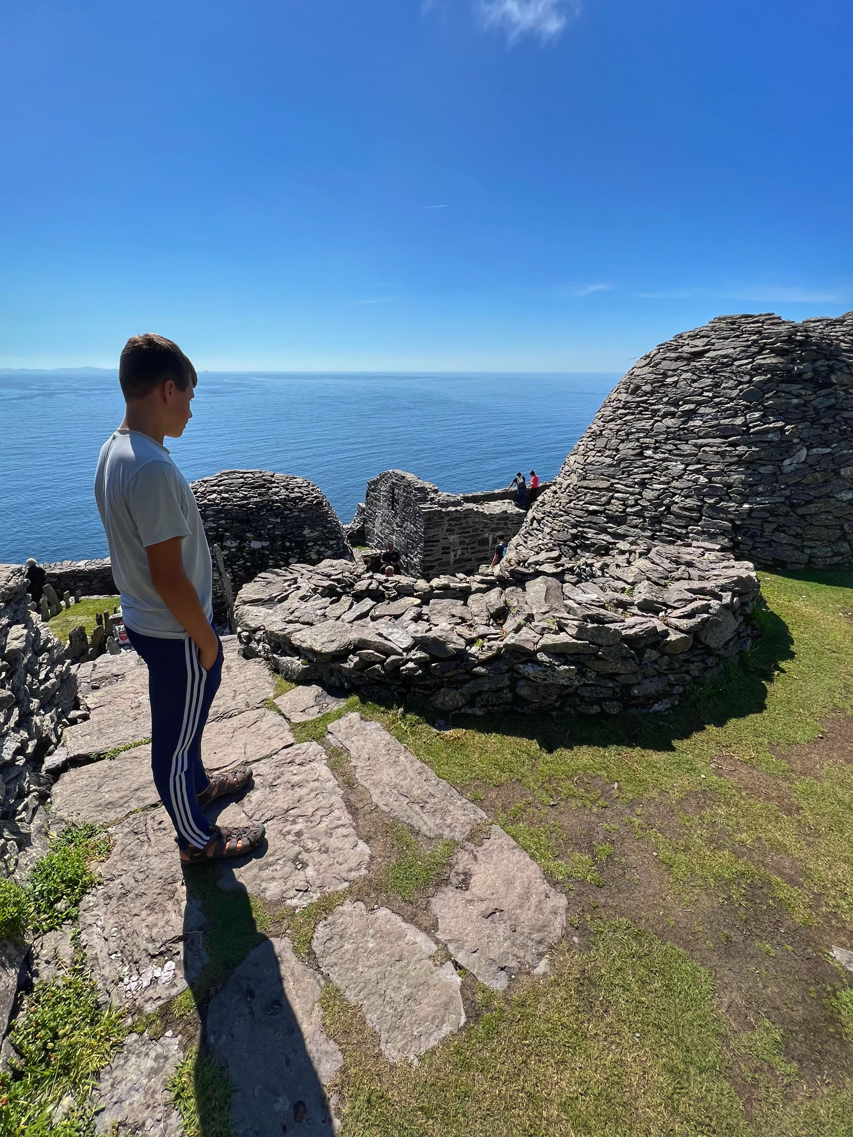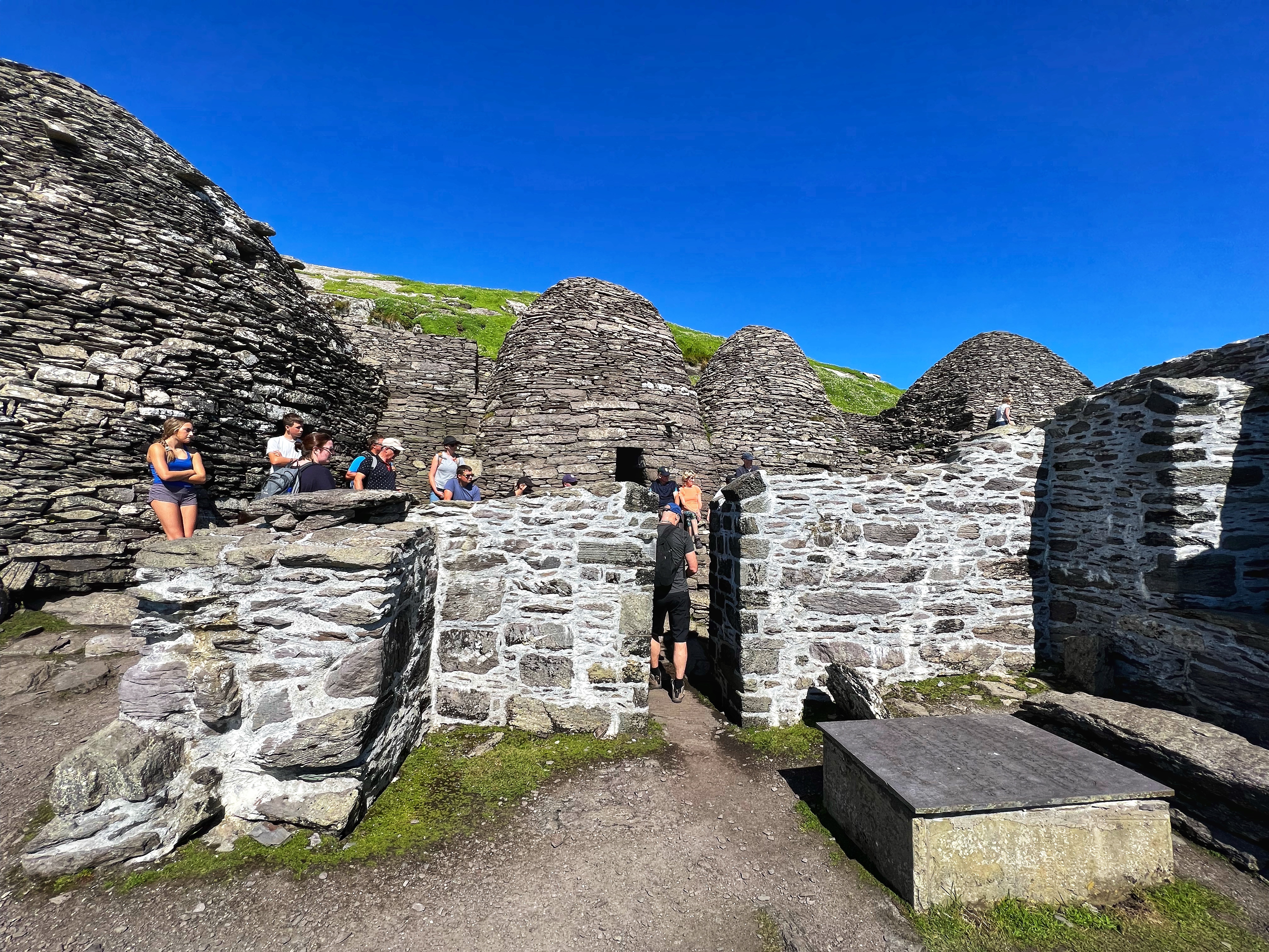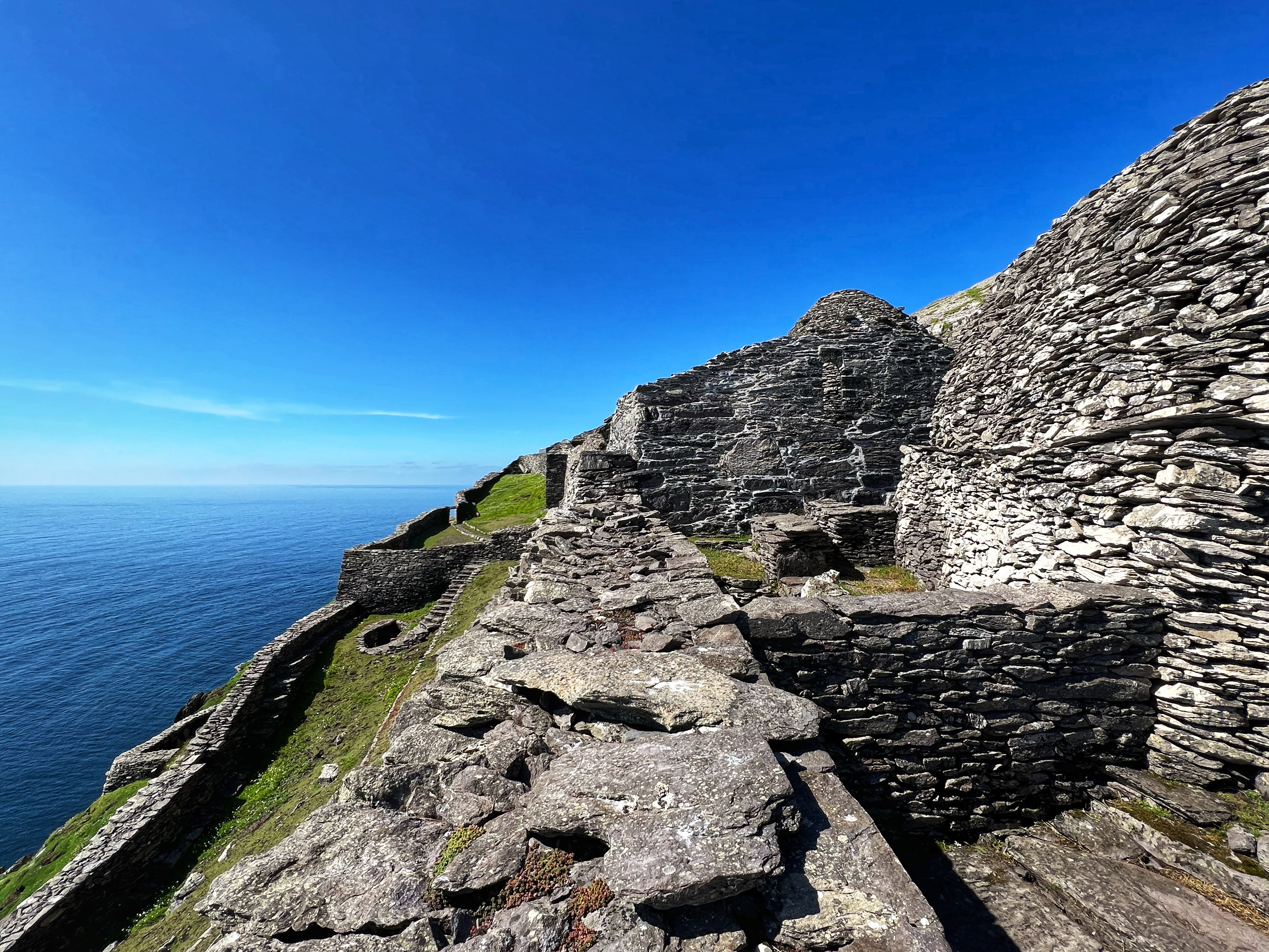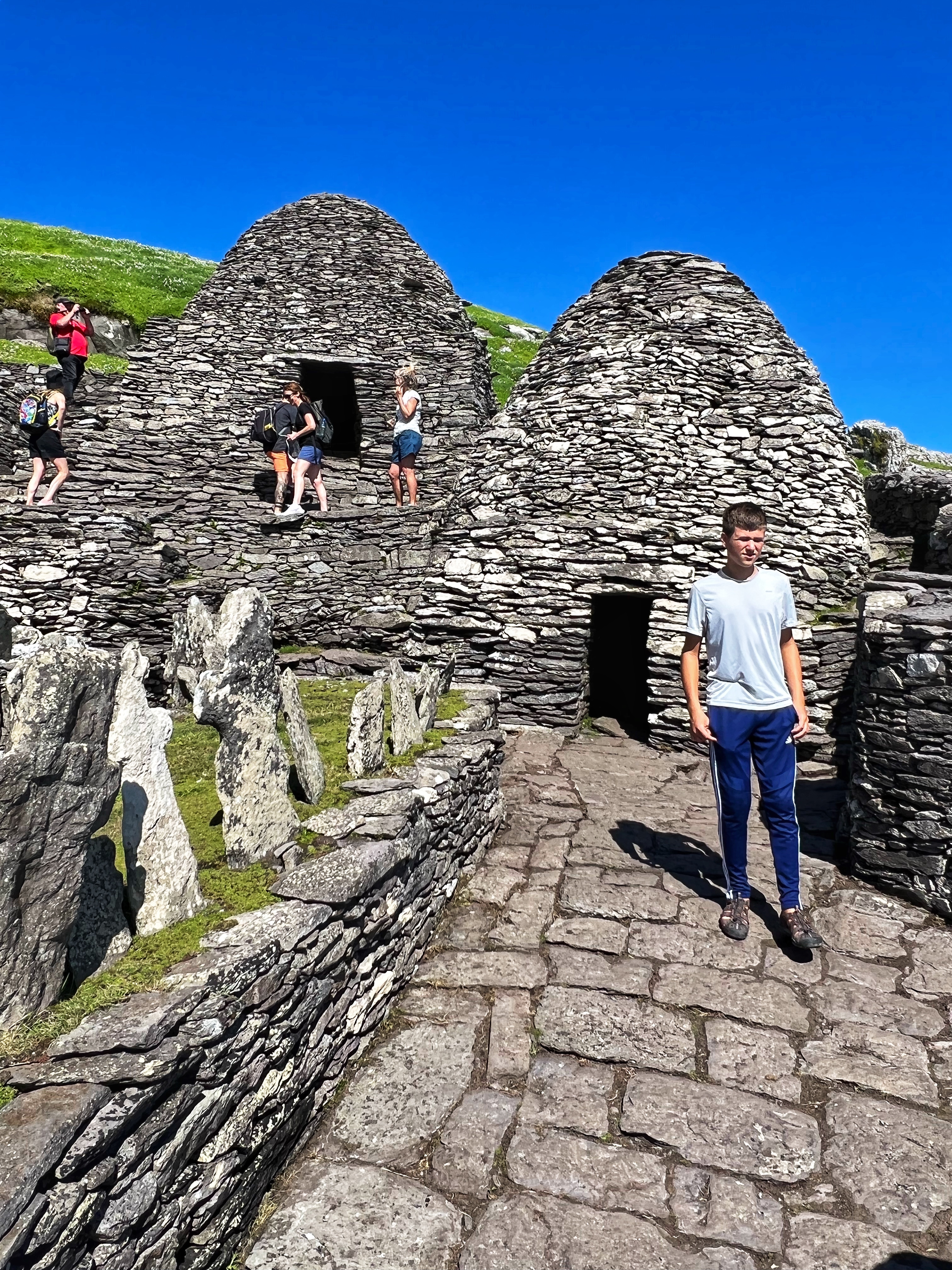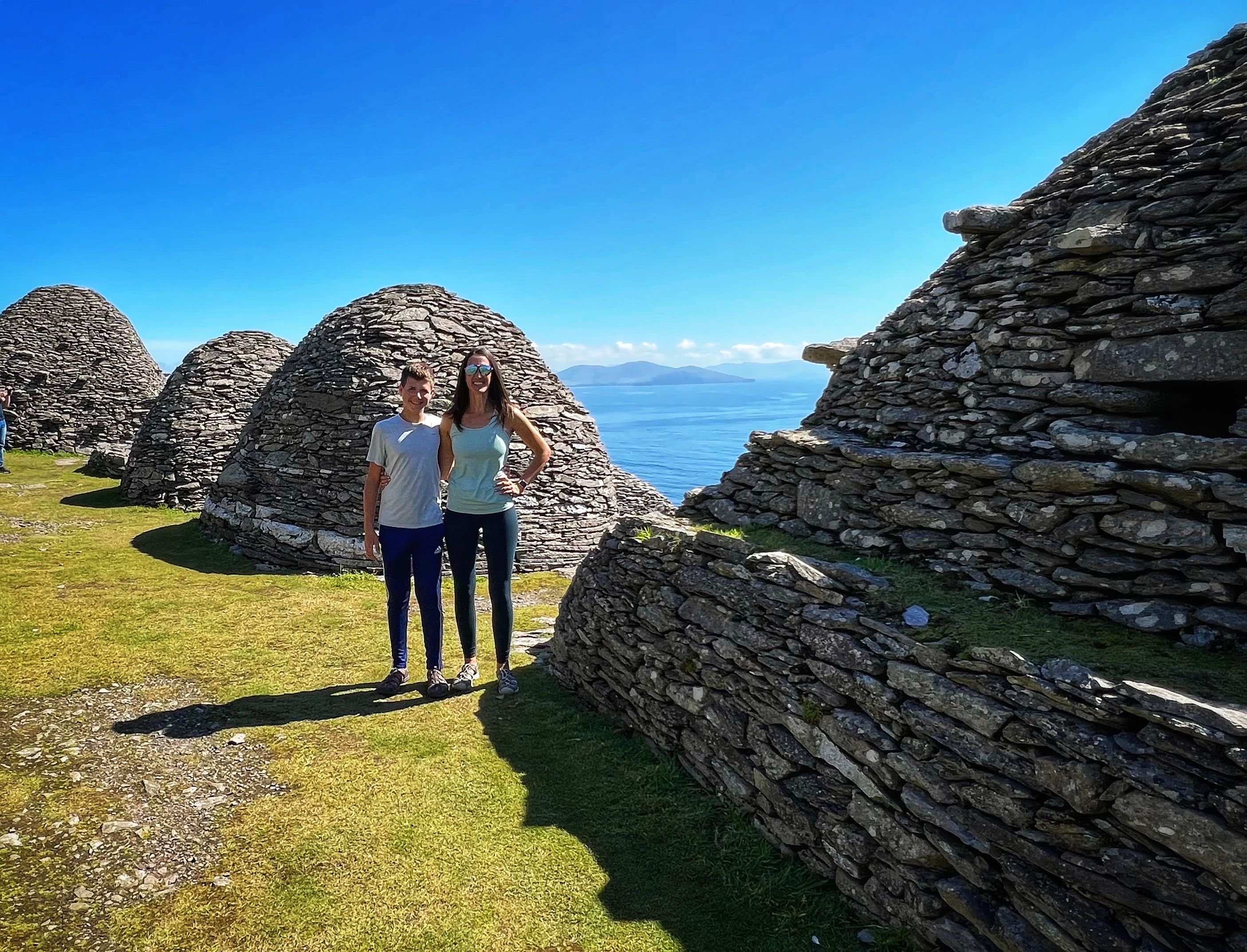 What an incredible day with my son! I was overwhelmed by it, really. We loved standing on the mythical STAR WARS island of Ahch-To and learning about the real life monks who lived at this UNESCO World Heritage Site for centuries. The original Gaelic monastery was slowly built between the 6th-8th centuries and endured for a millenia, when around the 16th century it became a site for religious pilgrims. STAR WARS nerds will appreciate that this island was used in the movies by Luke Skywalker as his hideaway, where the “sacred Jedi texts” were protected in an ancient tree. In real life, monks used the hermitage on the island to house and protect ancient texts from the Culdee church that date back to 37 AD. Interesting nod to history! Below you can see the beautiful beehive huts of the hermitage, in remarkable condition. Each one had a capstone on top that could be removed to allow campfire smoke to escape, but they were remarkably waterproof dwellings. A church, gardens, and cemetery also exist on the island. It was a self-serving community for hundreds of years as the monks fished, farmed, and let livestock graze for their food. Perhaps most impressive is that they made their way to and from the island by small rowboats – something I can’t imagine, even on our day with “good seas”! When you reach the beehive huts, another tour guide shares wonderful stories for about 15 minutes. The whole experience is spectacular! Yes, you can enter the huts, and you can wander just about everywhere except off the trails.