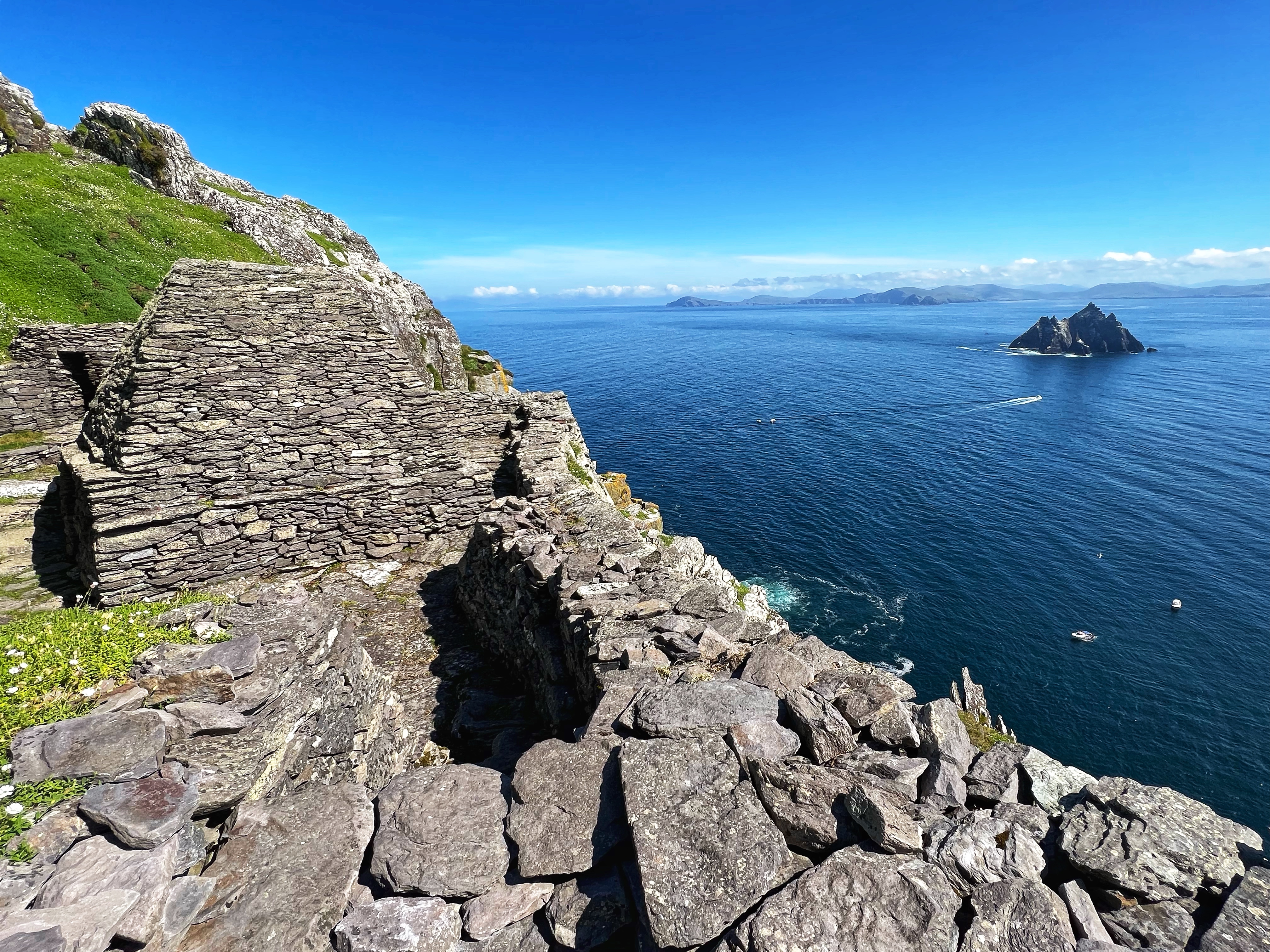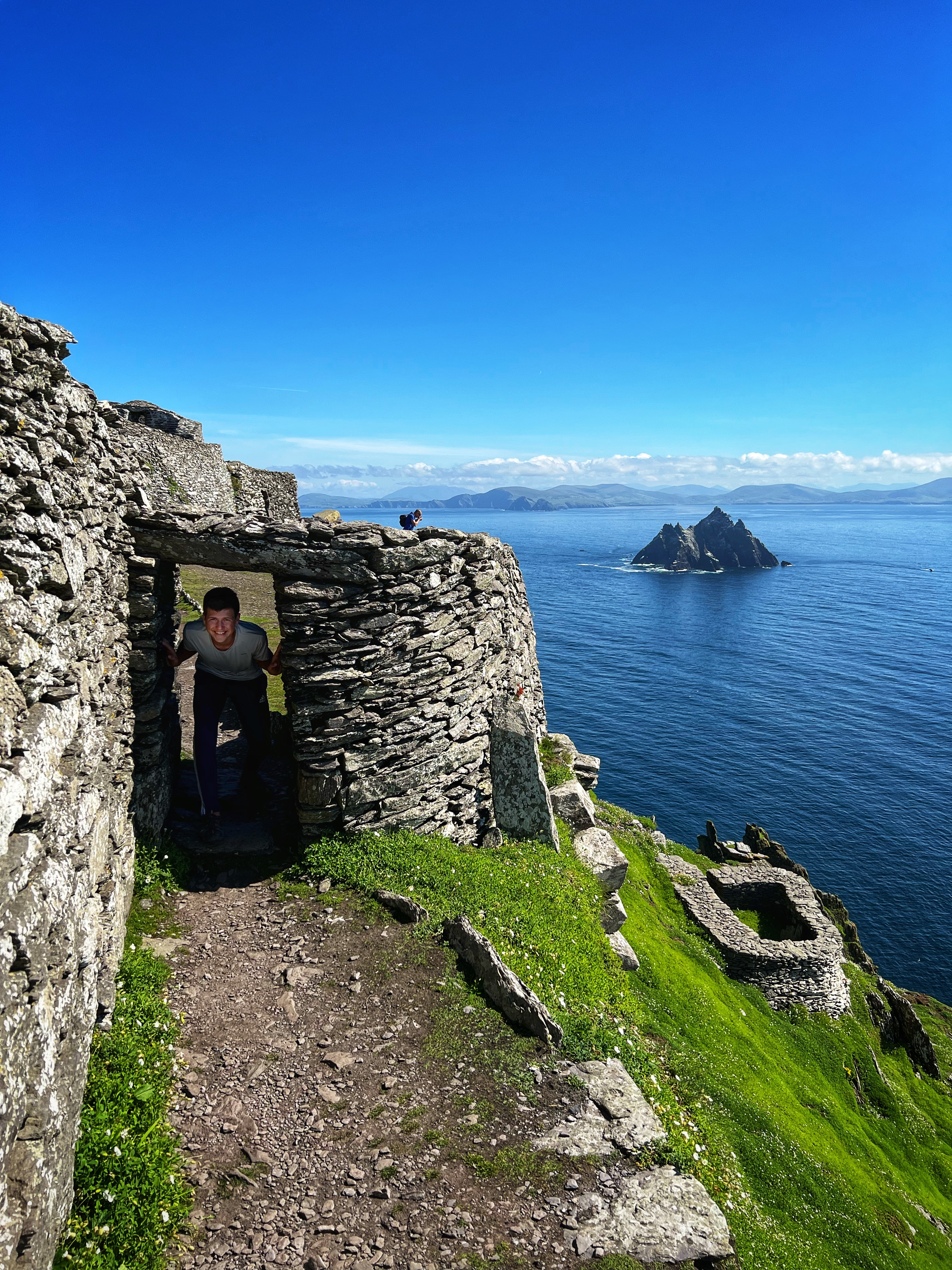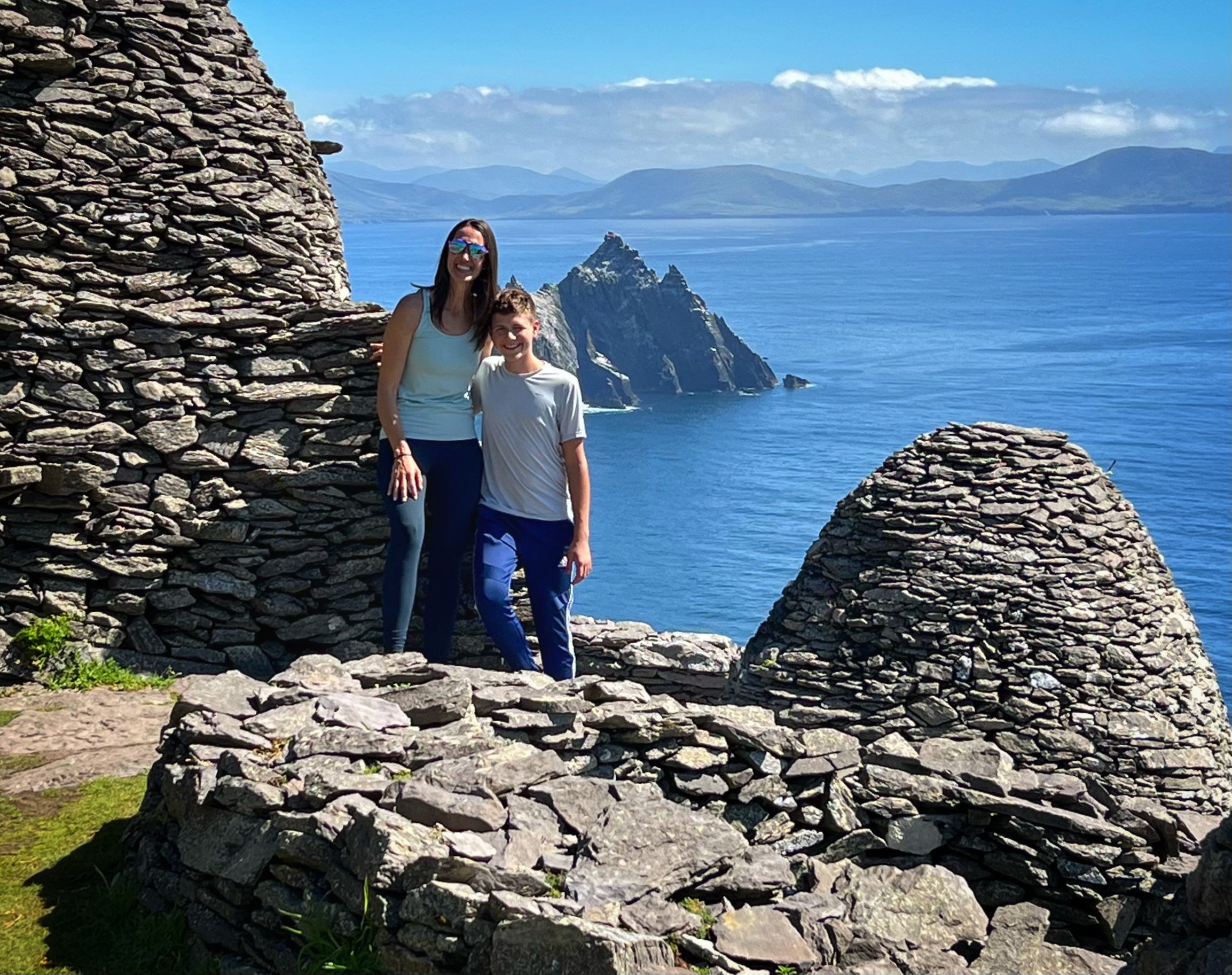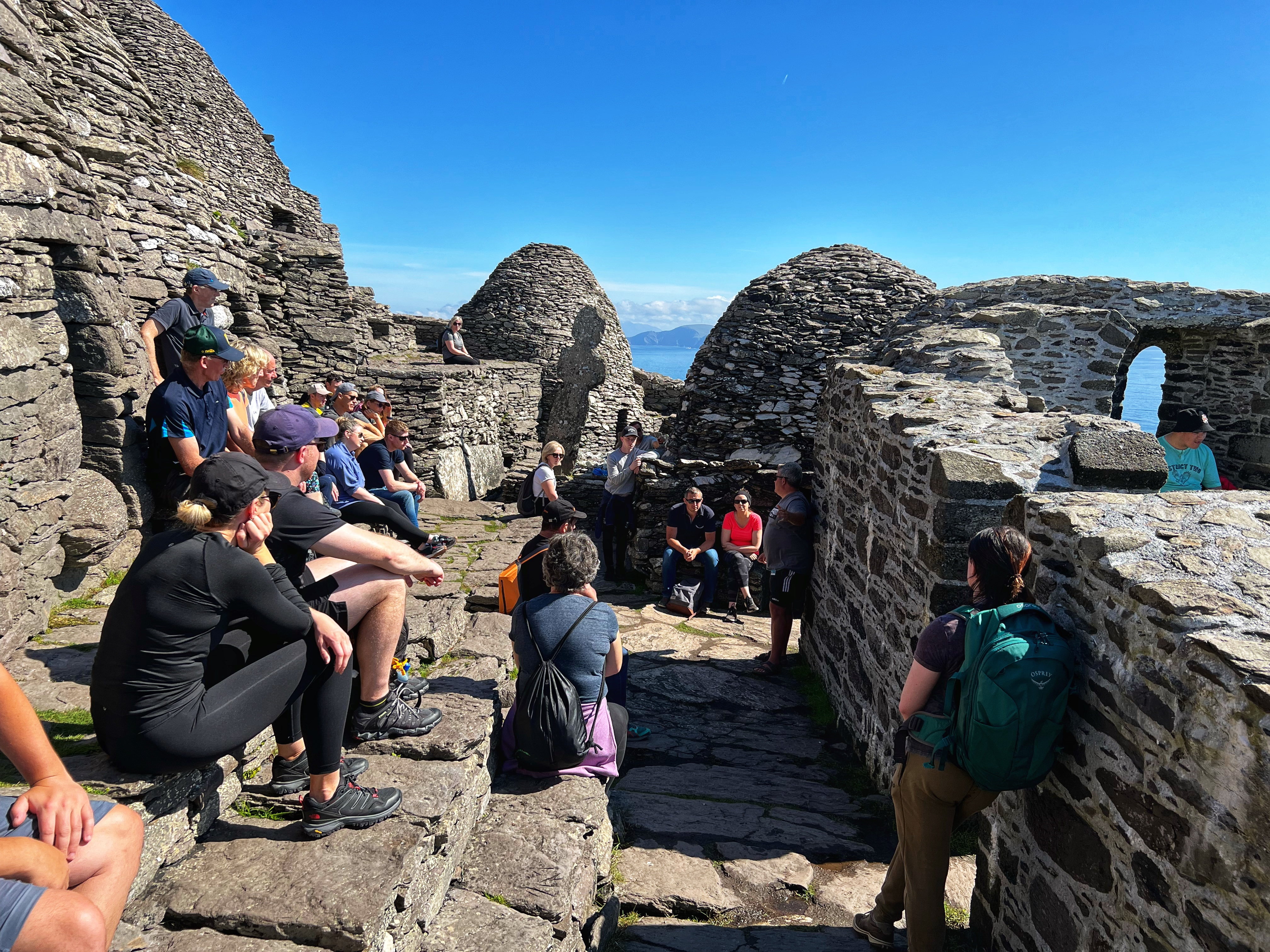 What an incredible day with my son! I was overwhelmed by it, really. We loved standing on the mythical STAR WARS island of Ahch-To and learning about the real life monks who lived at this UNESCO World Heritage Site for centuries. The original Gaelic monastery was slowly built between the 6th-8th centuries and endured for a millenia, when around the 16th century it became a site for religious pilgrims. STAR WARS nerds will appreciate that this island was used in the movies by Luke Skywalker as his hideaway, where the “sacred Jedi texts” were protected in an ancient tree. In real life, monks used the hermitage on the island to house and protect ancient texts from the Culdee church that date back to 37 AD. Interesting nod to history! Below you can see the beautiful beehive huts of the hermitage, in remarkable condition. Each one had a capstone on top that could be removed to allow campfire smoke to escape, but they were remarkably waterproof dwellings. A church, gardens, and cemetery also exist on the island. It was a self-serving community for hundreds of years as the monks fished, farmed, and let livestock graze for their food. Perhaps most impressive is that they made their way to and from the island by small rowboats – something I can’t imagine, even on our day with “good seas”! When you reach the beehive huts, another tour guide shares wonderful stories for about 15 minutes. The whole experience is spectacular! Yes, you can enter the huts, and you can wander just about everywhere except off the trails.