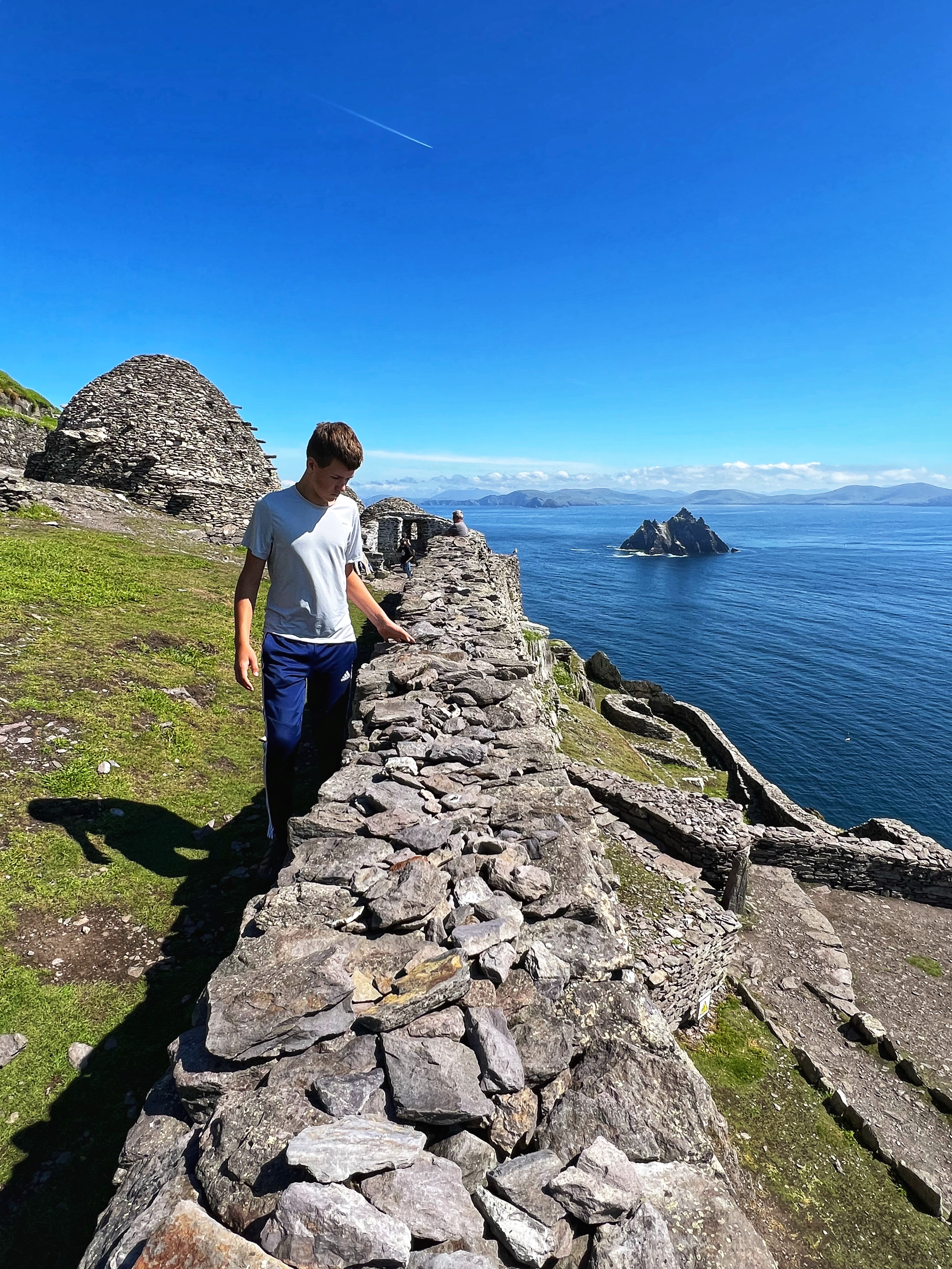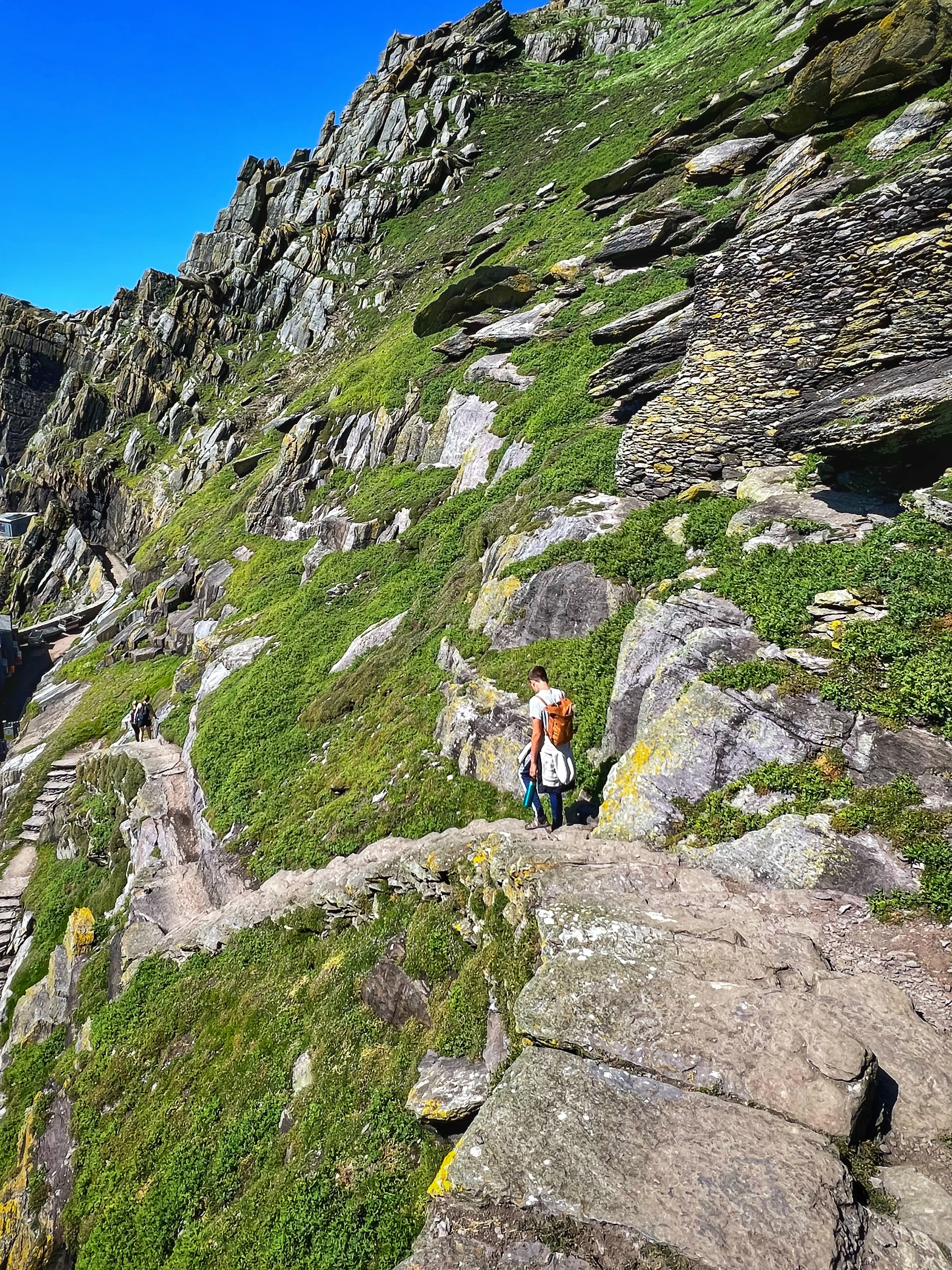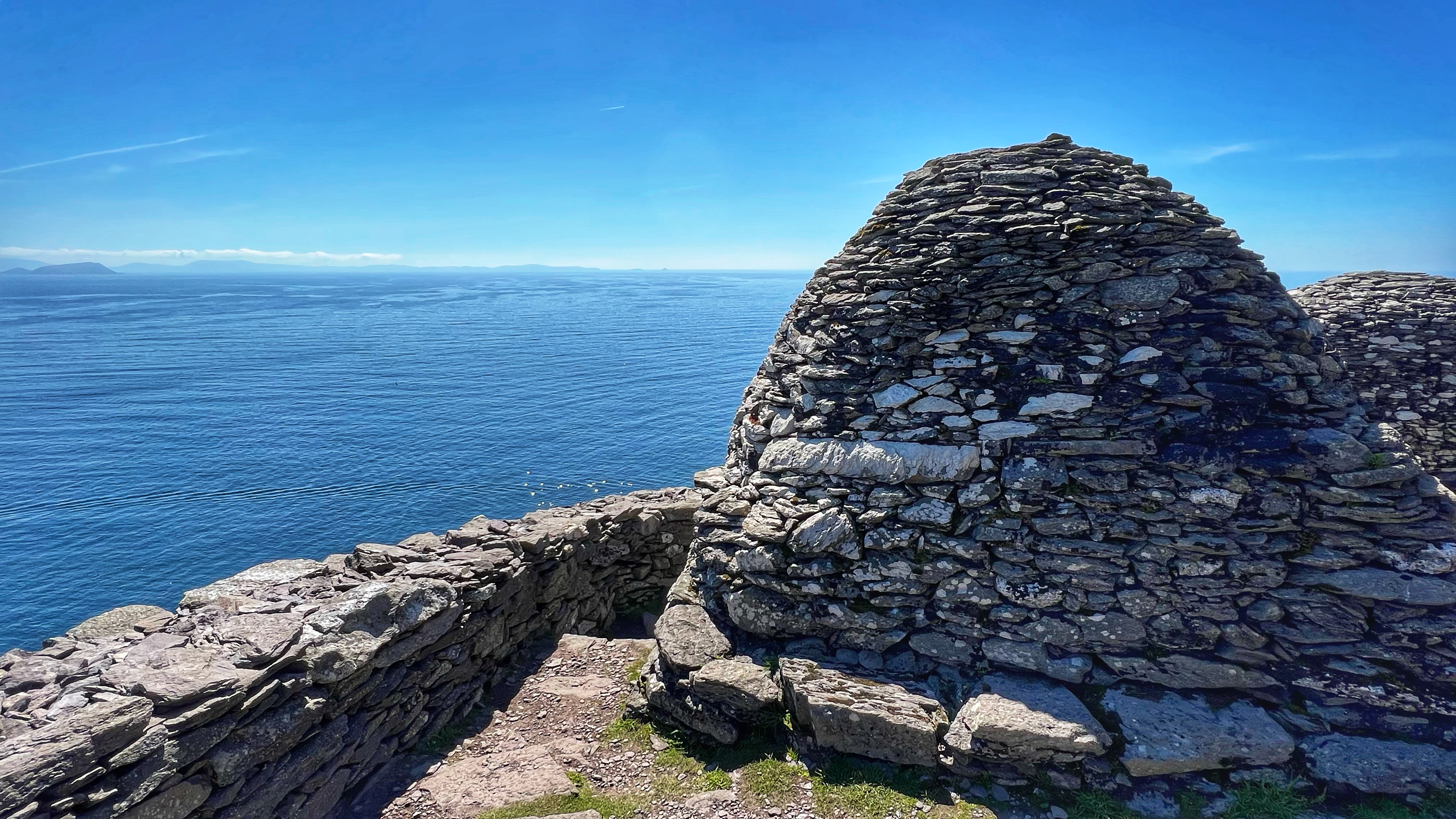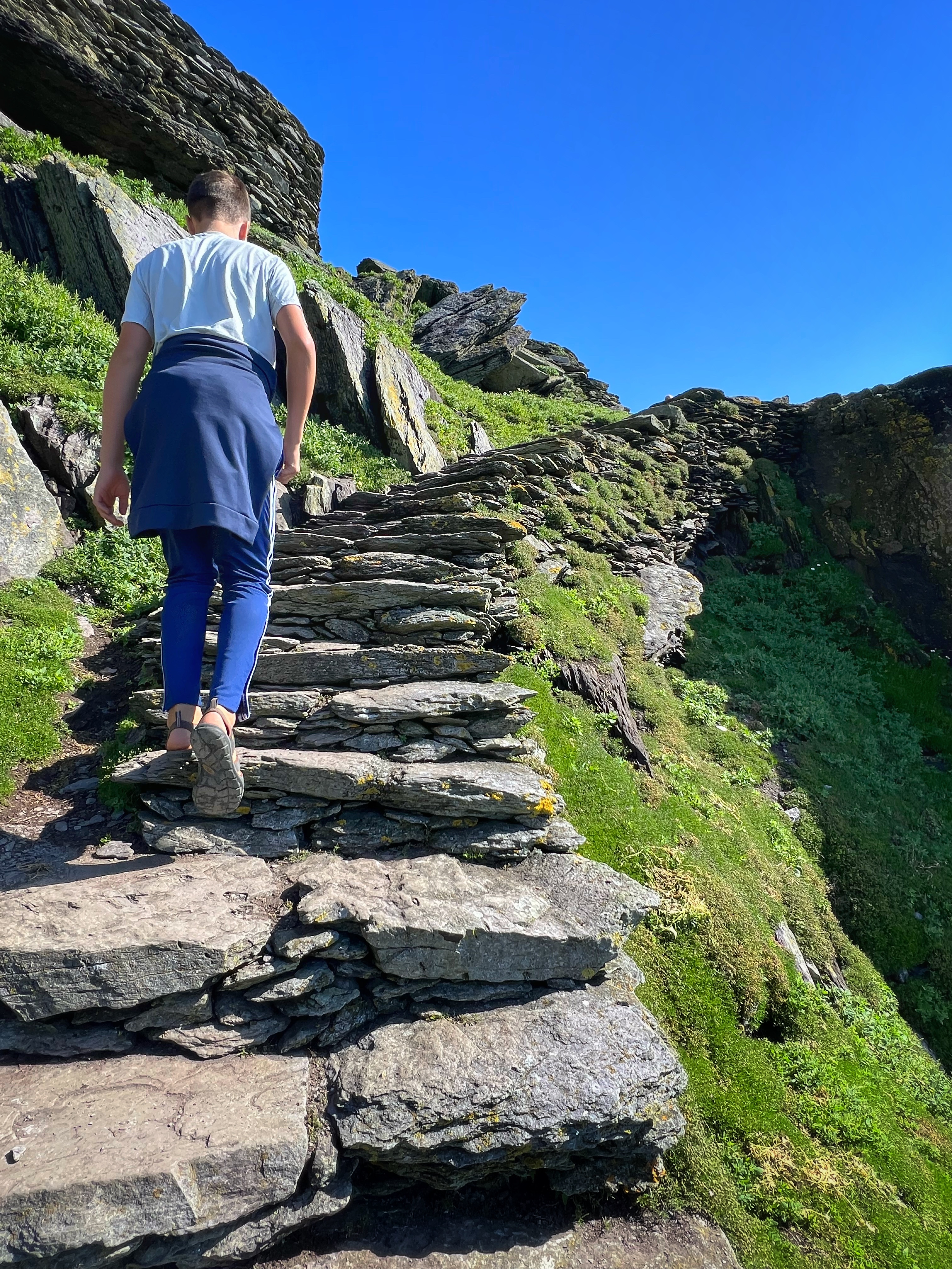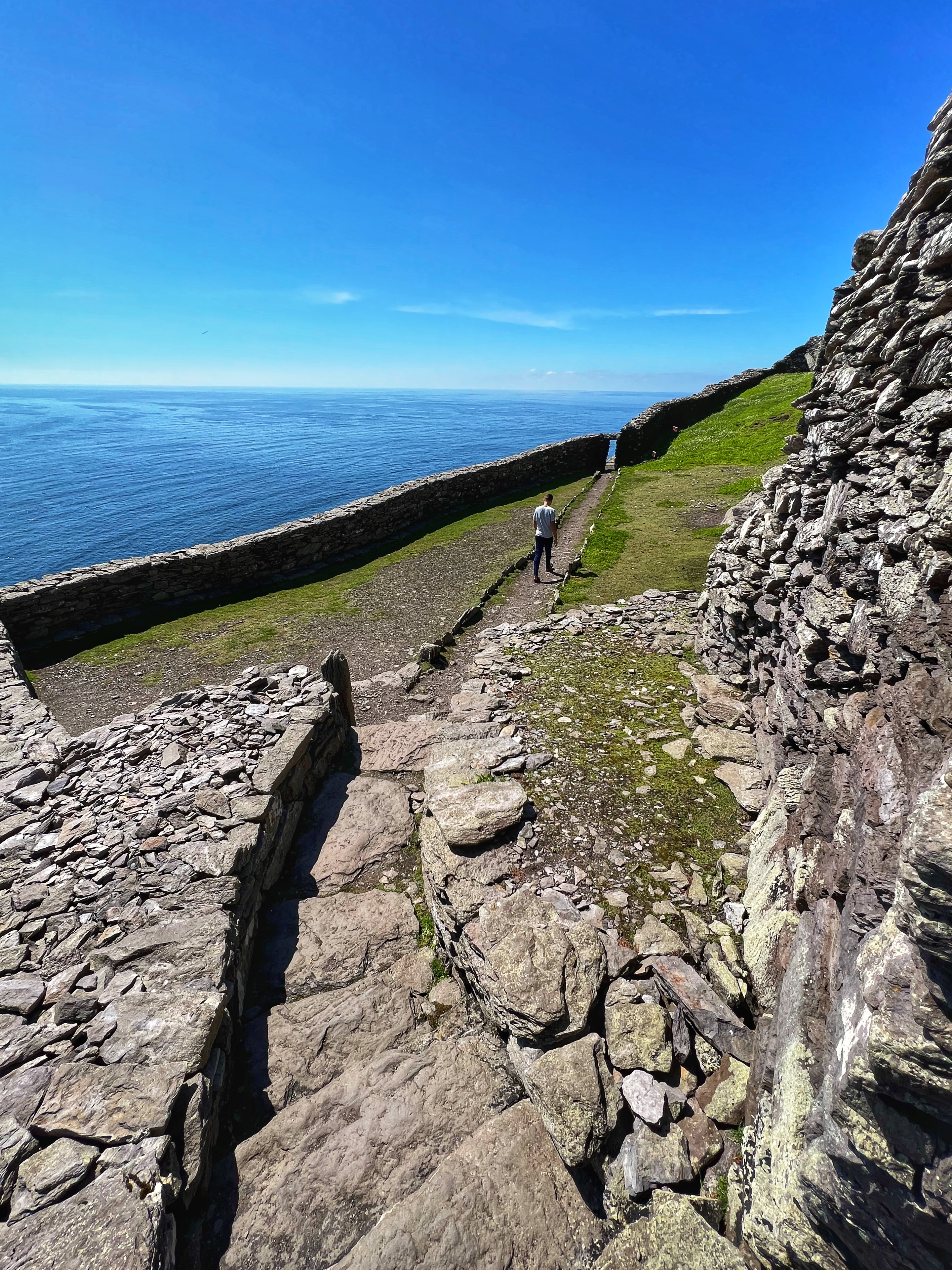 What an incredible day with my son! I was overwhelmed by it, really. We loved standing on the mythical STAR WARS island of Ahch-To and learning about the real life monks who lived at this UNESCO World Heritage Site for centuries. The original Gaelic monastery was slowly built between the 6th-8th centuries and endured for a millenia, when around the 16th century it became a site for religious pilgrims. STAR WARS nerds will appreciate that this island was used in the movies by Luke Skywalker as his hideaway, where the “sacred Jedi texts” were protected in an ancient tree. In real life, monks used the hermitage on the island to house and protect ancient texts from the Culdee church that date back to 37 AD. Interesting nod to history! Below you can see the beautiful beehive huts of the hermitage, in remarkable condition. Each one had a capstone on top that could be removed to allow campfire smoke to escape, but they were remarkably waterproof dwellings. A church, gardens, and cemetery also exist on the island. It was a self-serving community for hundreds of years as the monks fished, farmed, and let livestock graze for their food. Perhaps most impressive is that they made their way to and from the island by small rowboats – something I can’t imagine, even on our day with “good seas”! When you reach the beehive huts, another tour guide shares wonderful stories for about 15 minutes. The whole experience is spectacular! Yes, you can enter the huts, and you can wander just about everywhere except off the trails.