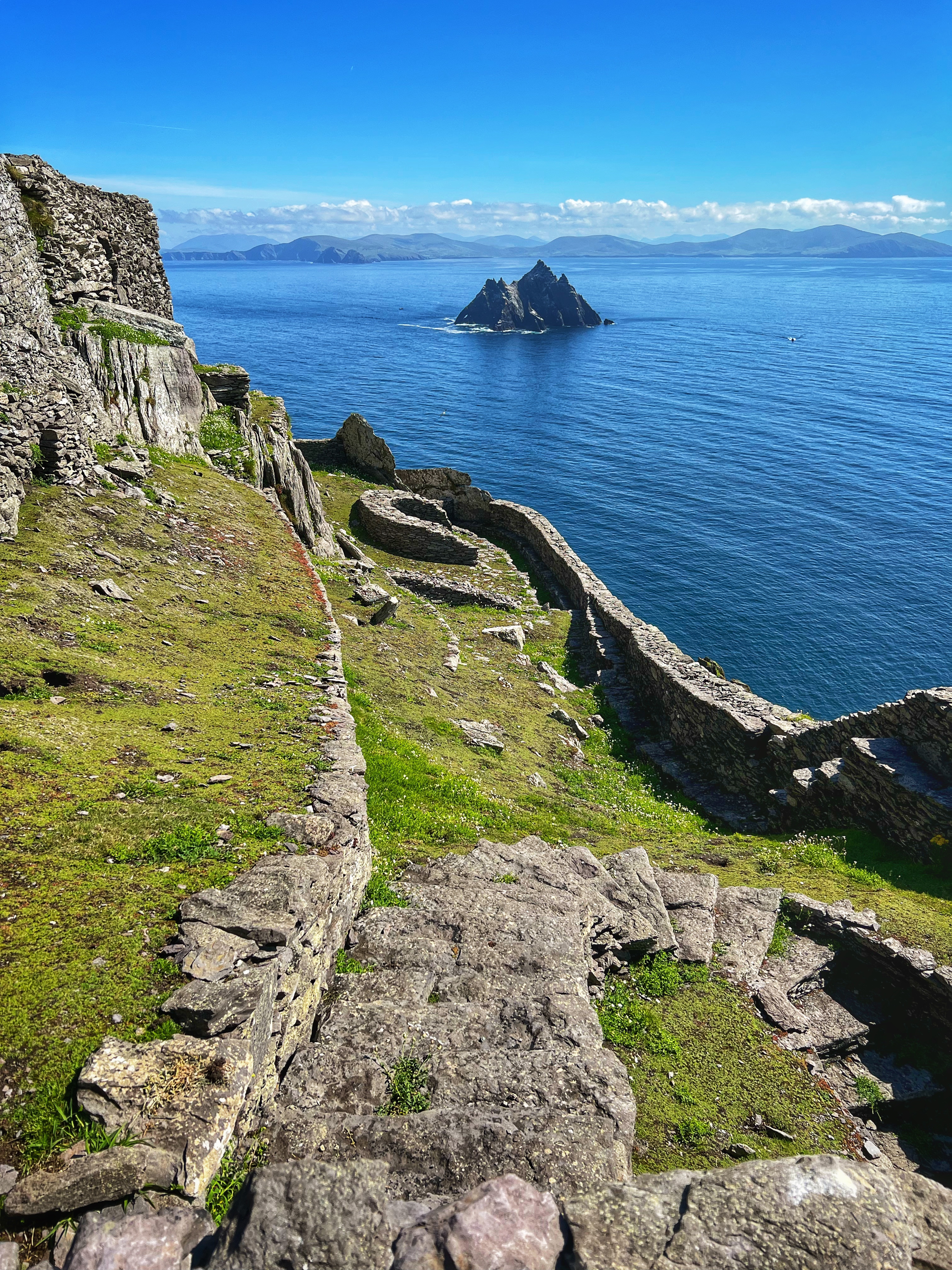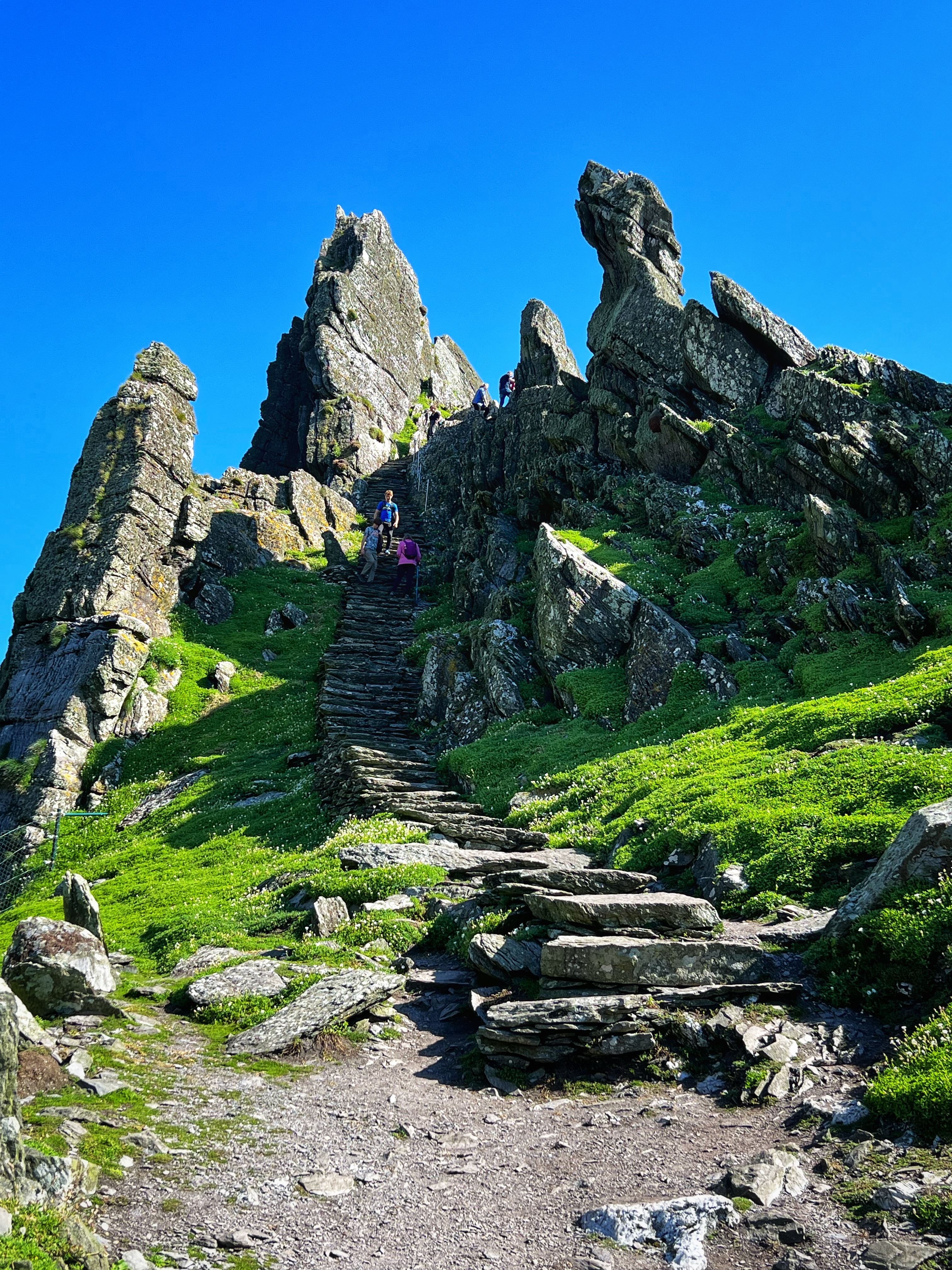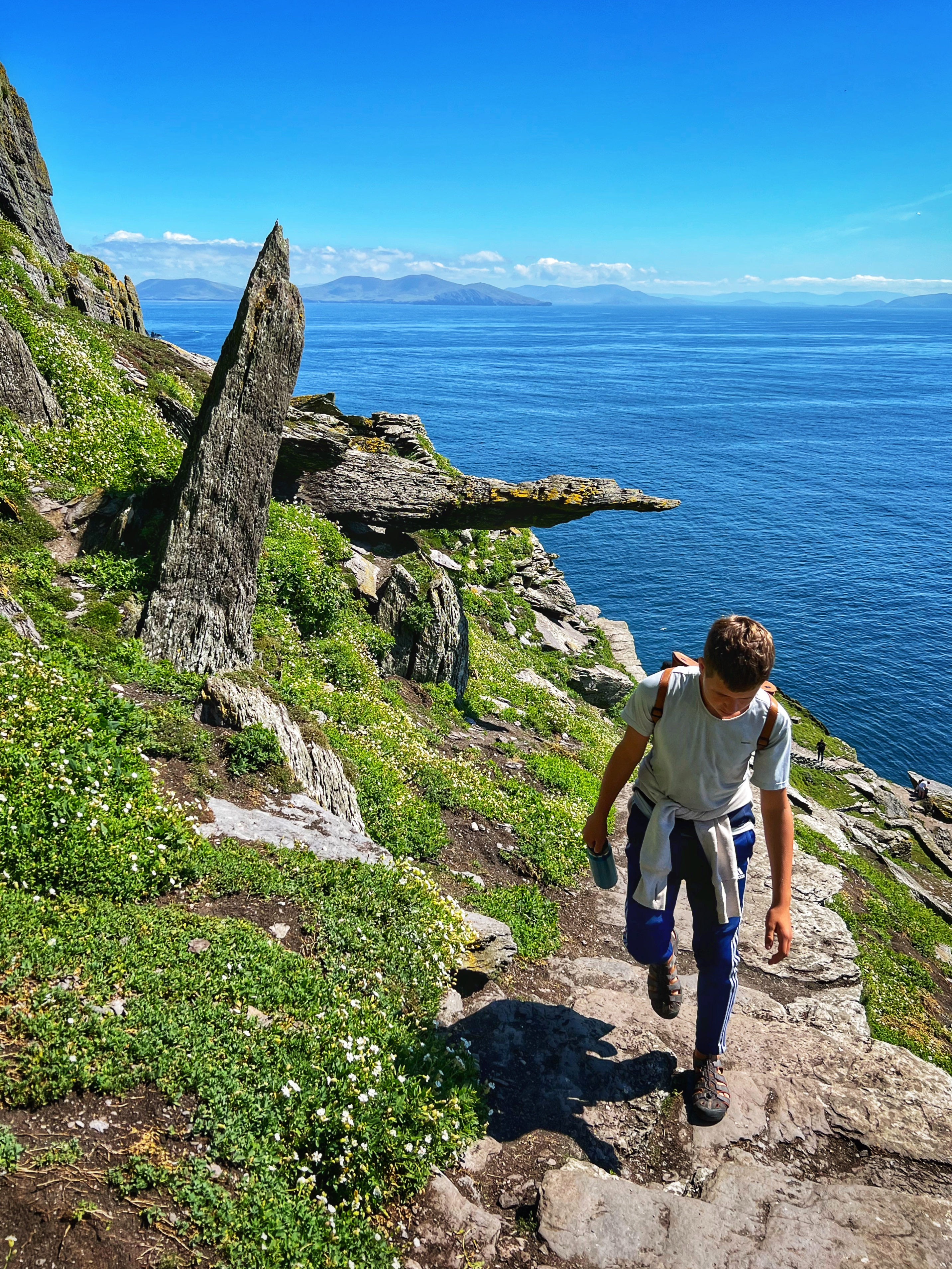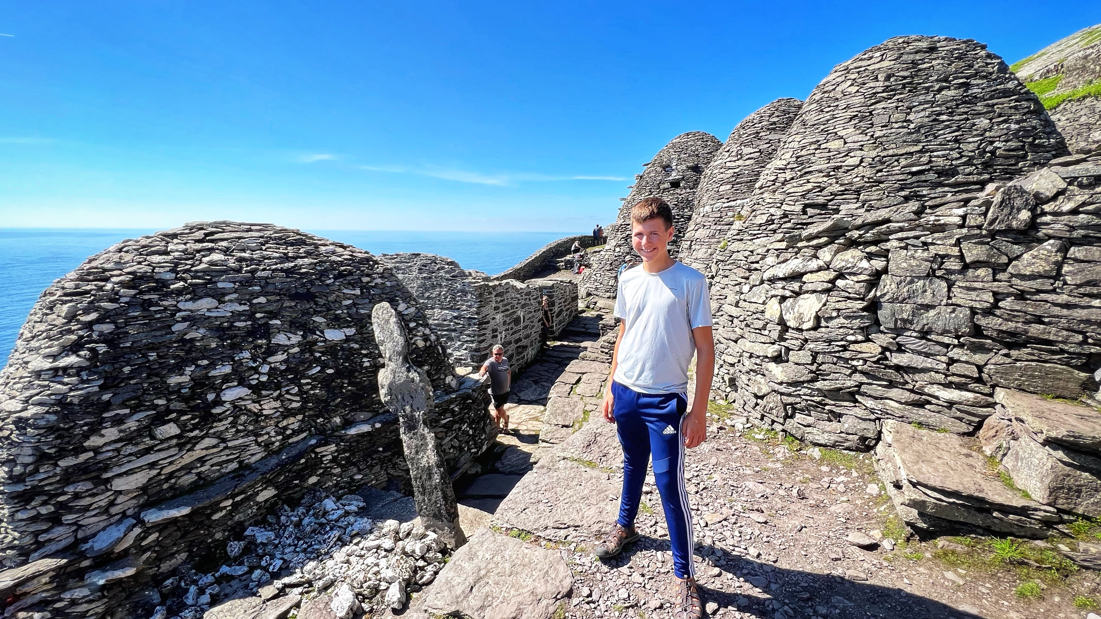 What an incredible day with my son! I was overwhelmed by it, really. We loved standing on the mythical STAR WARS island of Ahch-To and learning about the real life monks who lived at this UNESCO World Heritage Site for centuries. The original Gaelic monastery was slowly built between the 6th-8th centuries and endured for a millenia, when around the 16th century it became a site for religious pilgrims. STAR WARS nerds will appreciate that this island was used in the movies by Luke Skywalker as his hideaway, where the “sacred Jedi texts” were protected in an ancient tree. In real life, monks used the hermitage on the island to house and protect ancient texts from the Culdee church that date back to 37 AD. Interesting nod to history! Below you can see the beautiful beehive huts of the hermitage, in remarkable condition. Each one had a capstone on top that could be removed to allow campfire smoke to escape, but they were remarkably waterproof dwellings. A church, gardens, and cemetery also exist on the island. It was a self-serving community for hundreds of years as the monks fished, farmed, and let livestock graze for their food. Perhaps most impressive is that they made their way to and from the island by small rowboats – something I can’t imagine, even on our day with “good seas”! When you reach the beehive huts, another tour guide shares wonderful stories for about 15 minutes. The whole experience is spectacular! Yes, you can enter the huts, and you can wander just about everywhere except off the trails.