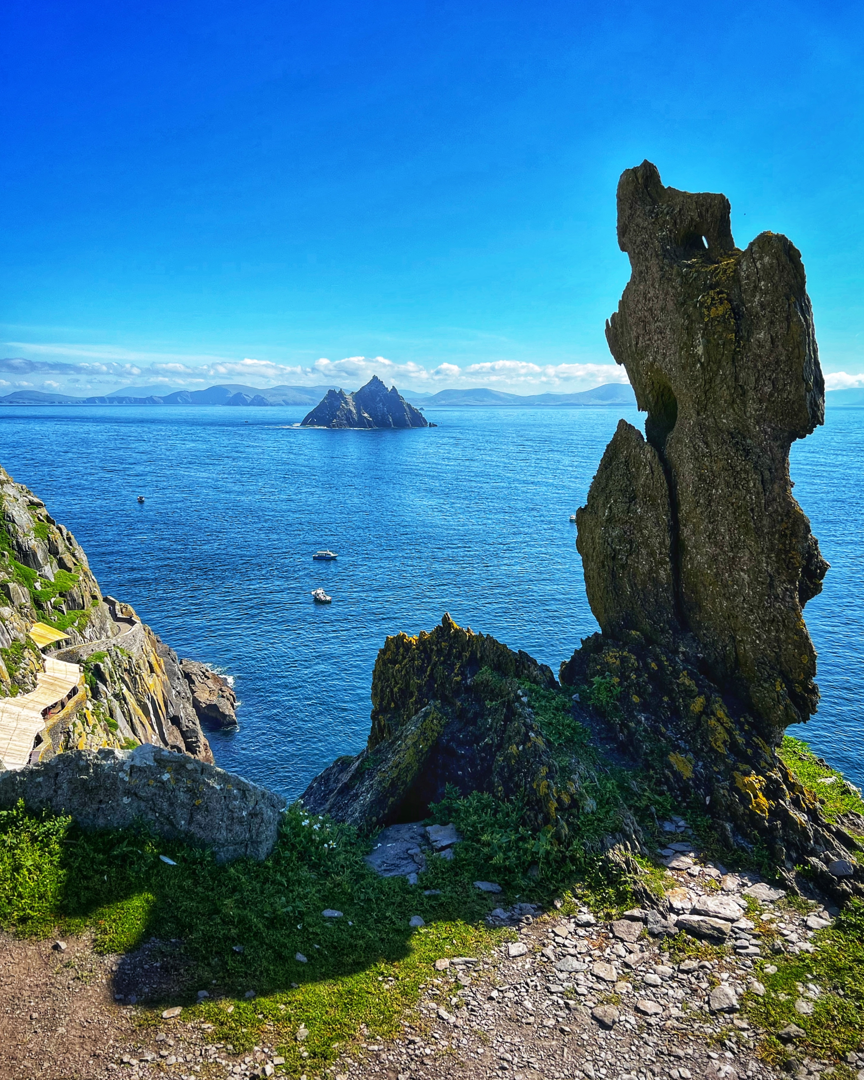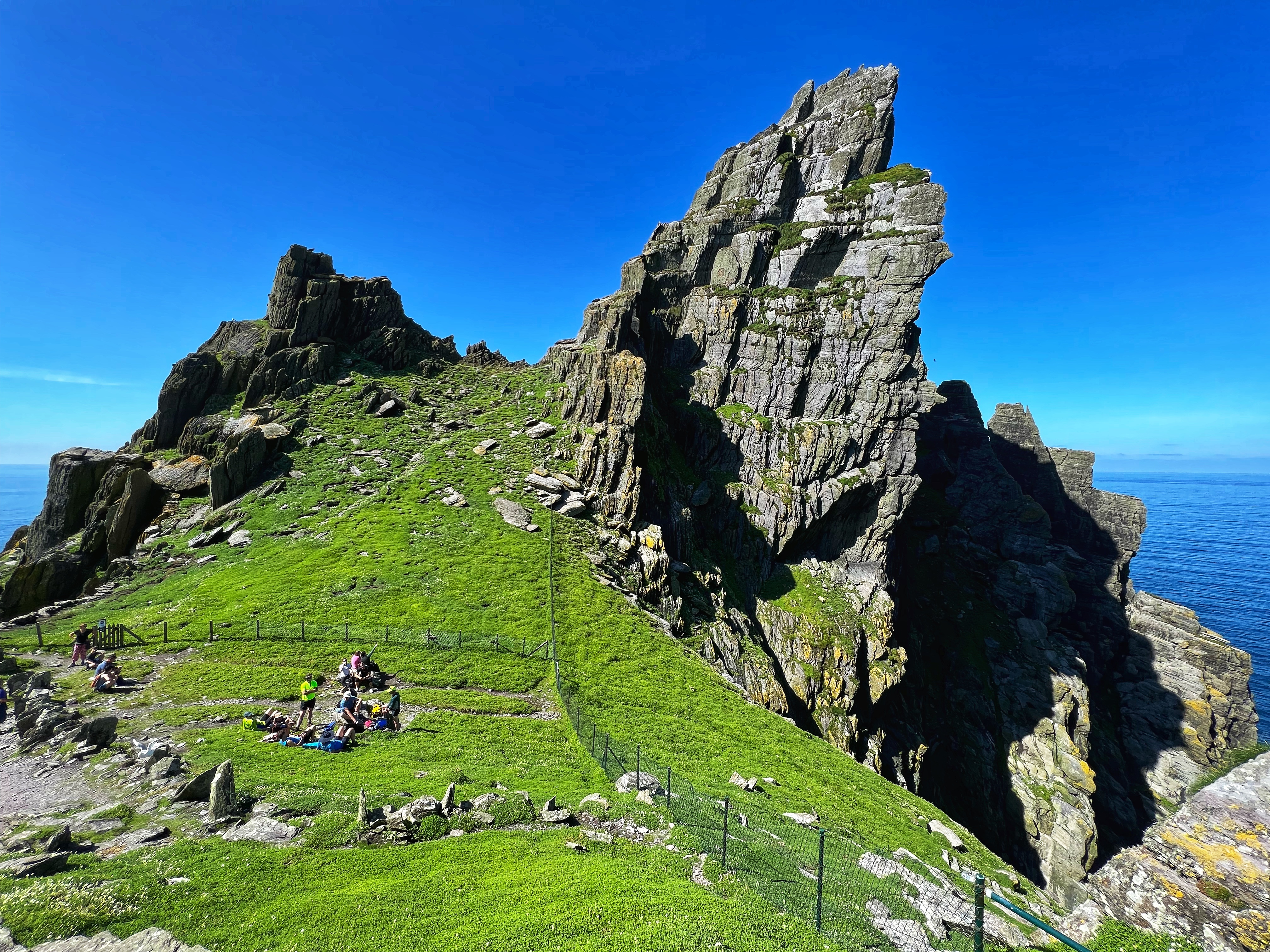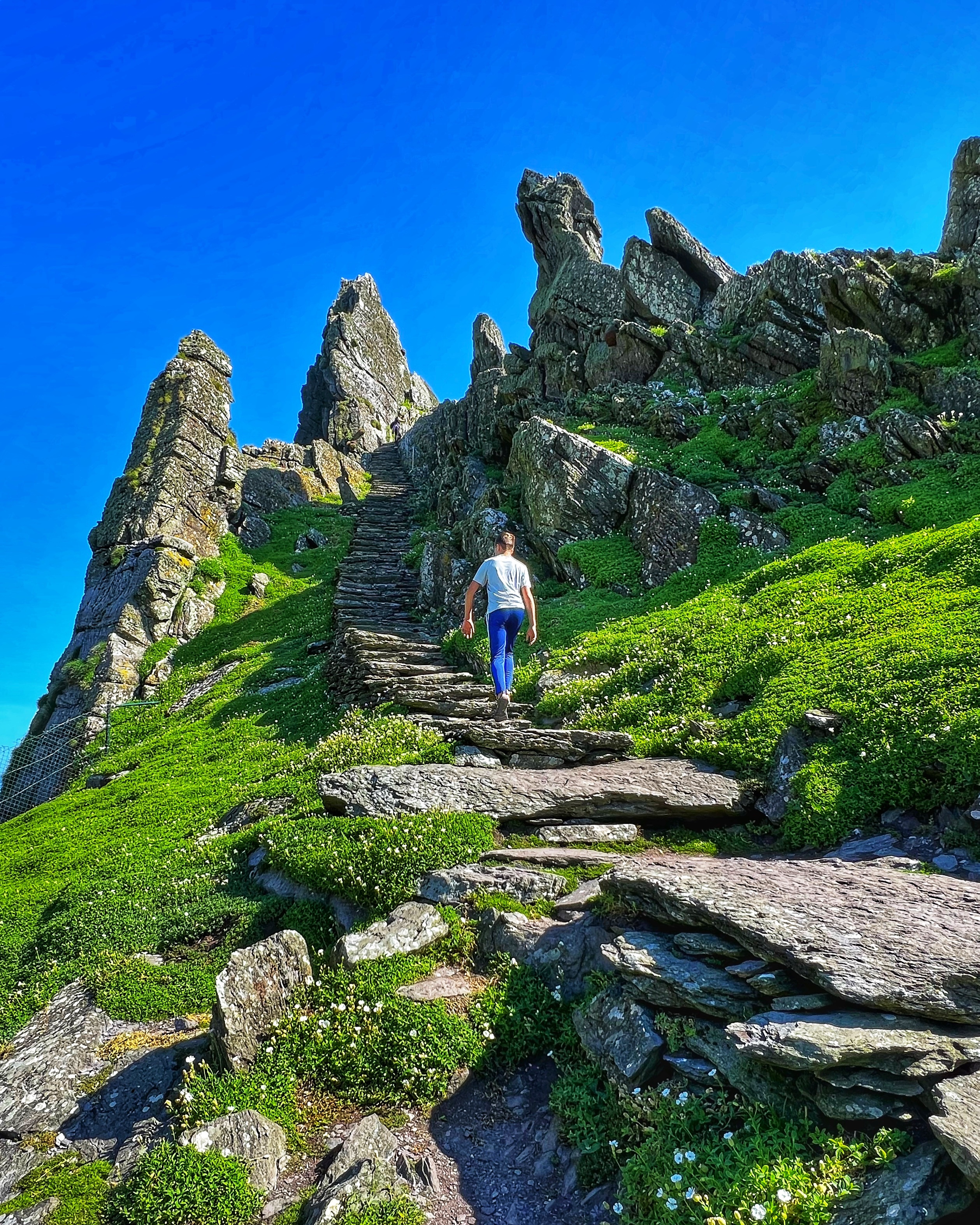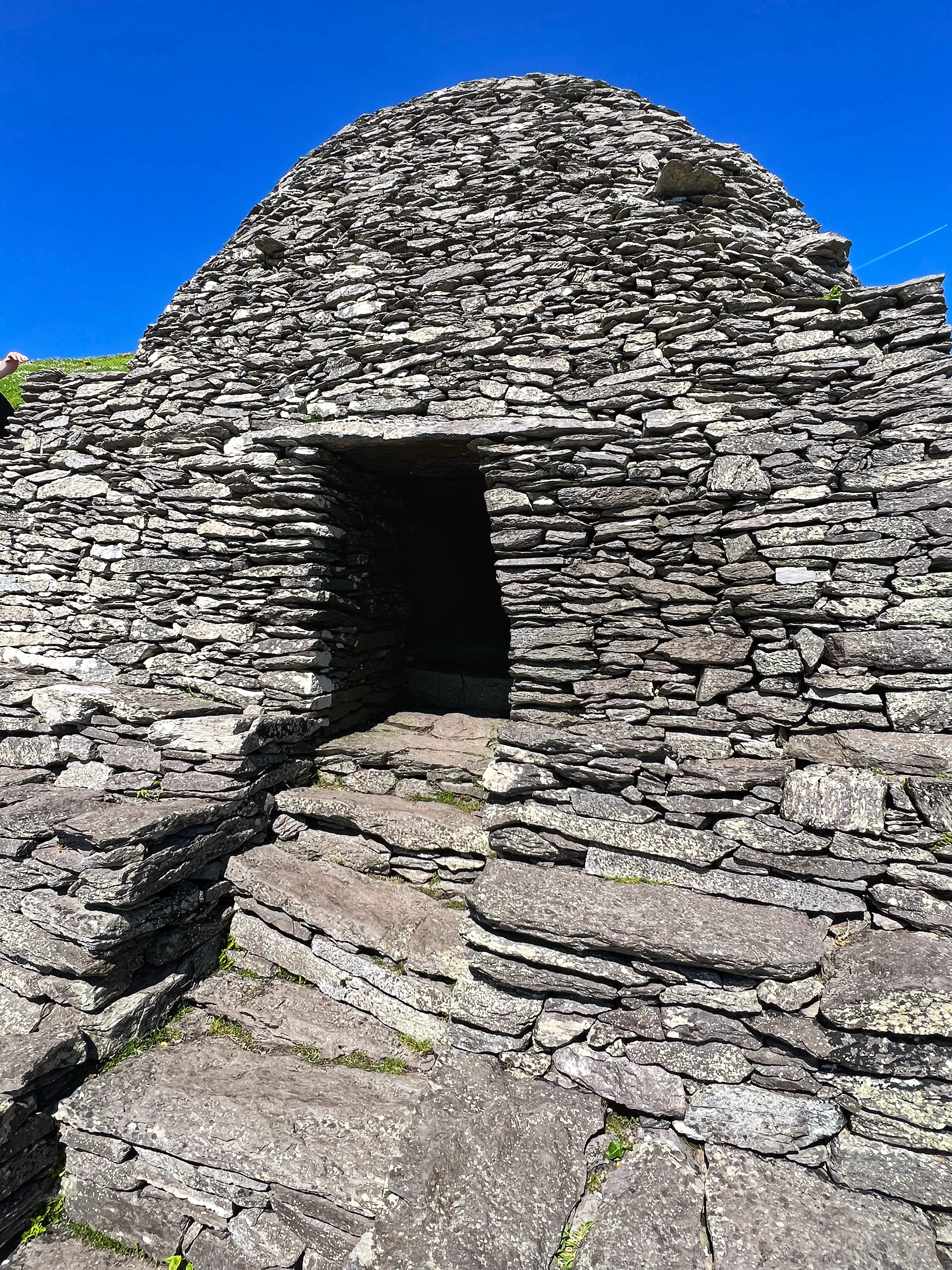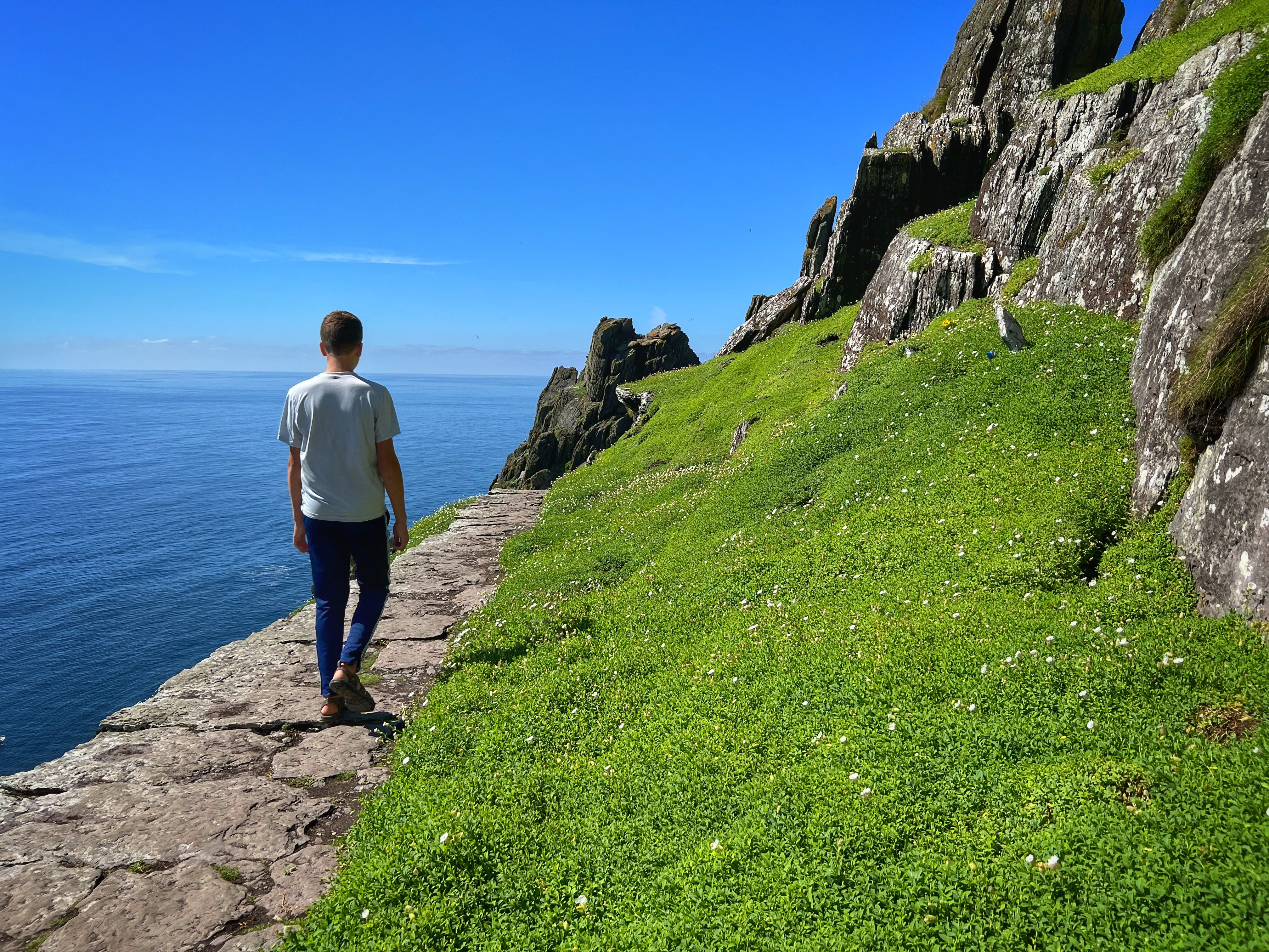 What an incredible day with my son! I was overwhelmed by it, really. We loved standing on the mythical STAR WARS island of Ahch-To and learning about the real life monks who lived at this UNESCO World Heritage Site for centuries. The original Gaelic monastery was slowly built between the 6th-8th centuries and endured for a millenia, when around the 16th century it became a site for religious pilgrims. STAR WARS nerds will appreciate that this island was used in the movies by Luke Skywalker as his hideaway, where the “sacred Jedi texts” were protected in an ancient tree. In real life, monks used the hermitage on the island to house and protect ancient texts from the Culdee church that date back to 37 AD. Interesting nod to history! Below you can see the beautiful beehive huts of the hermitage, in remarkable condition. Each one had a capstone on top that could be removed to allow campfire smoke to escape, but they were remarkably waterproof dwellings. A church, gardens, and cemetery also exist on the island. It was a self-serving community for hundreds of years as the monks fished, farmed, and let livestock graze for their food. Perhaps most impressive is that they made their way to and from the island by small rowboats – something I can’t imagine, even on our day with “good seas”! When you reach the beehive huts, another tour guide shares wonderful stories for about 15 minutes. The whole experience is spectacular! Yes, you can enter the huts, and you can wander just about everywhere except off the trails.