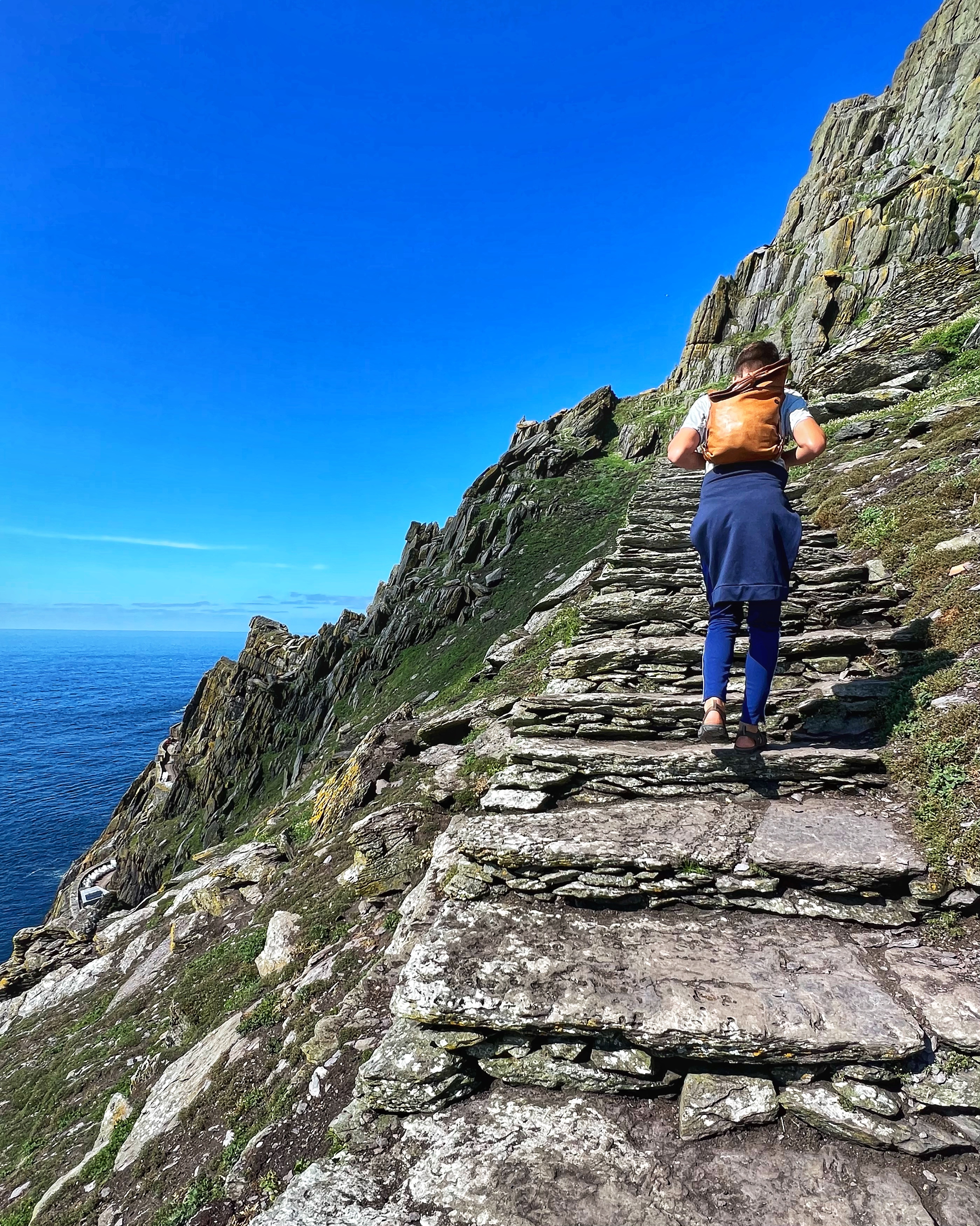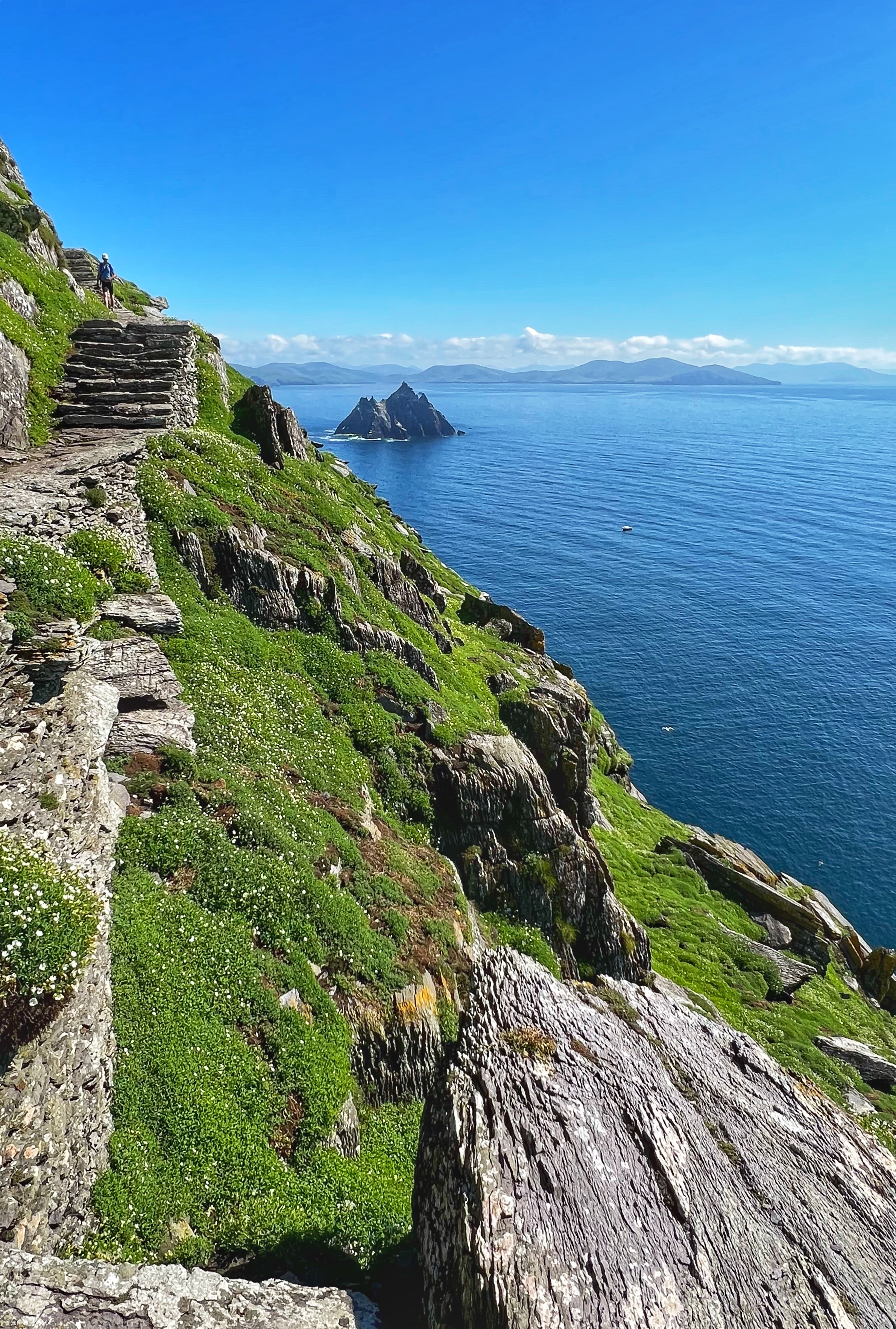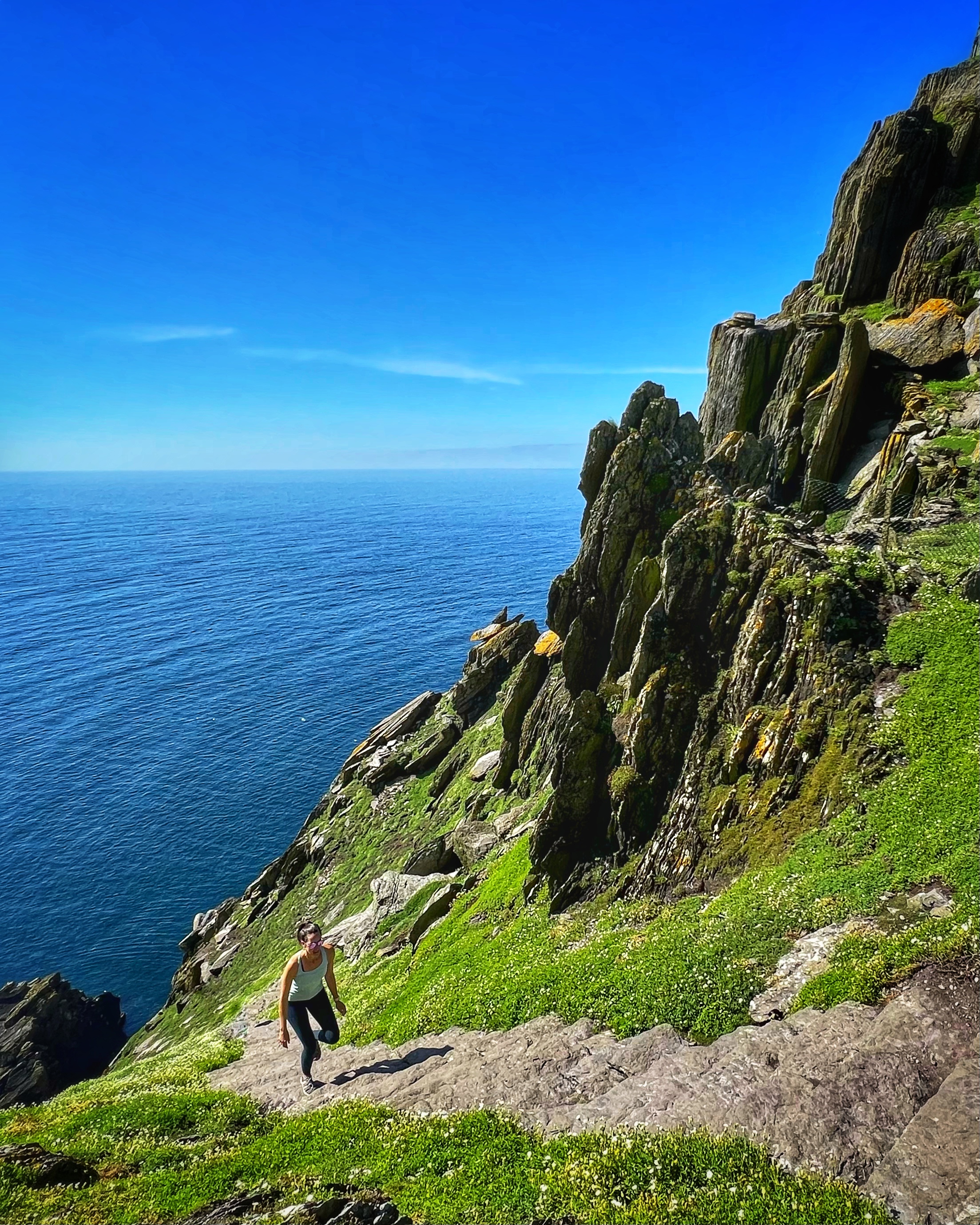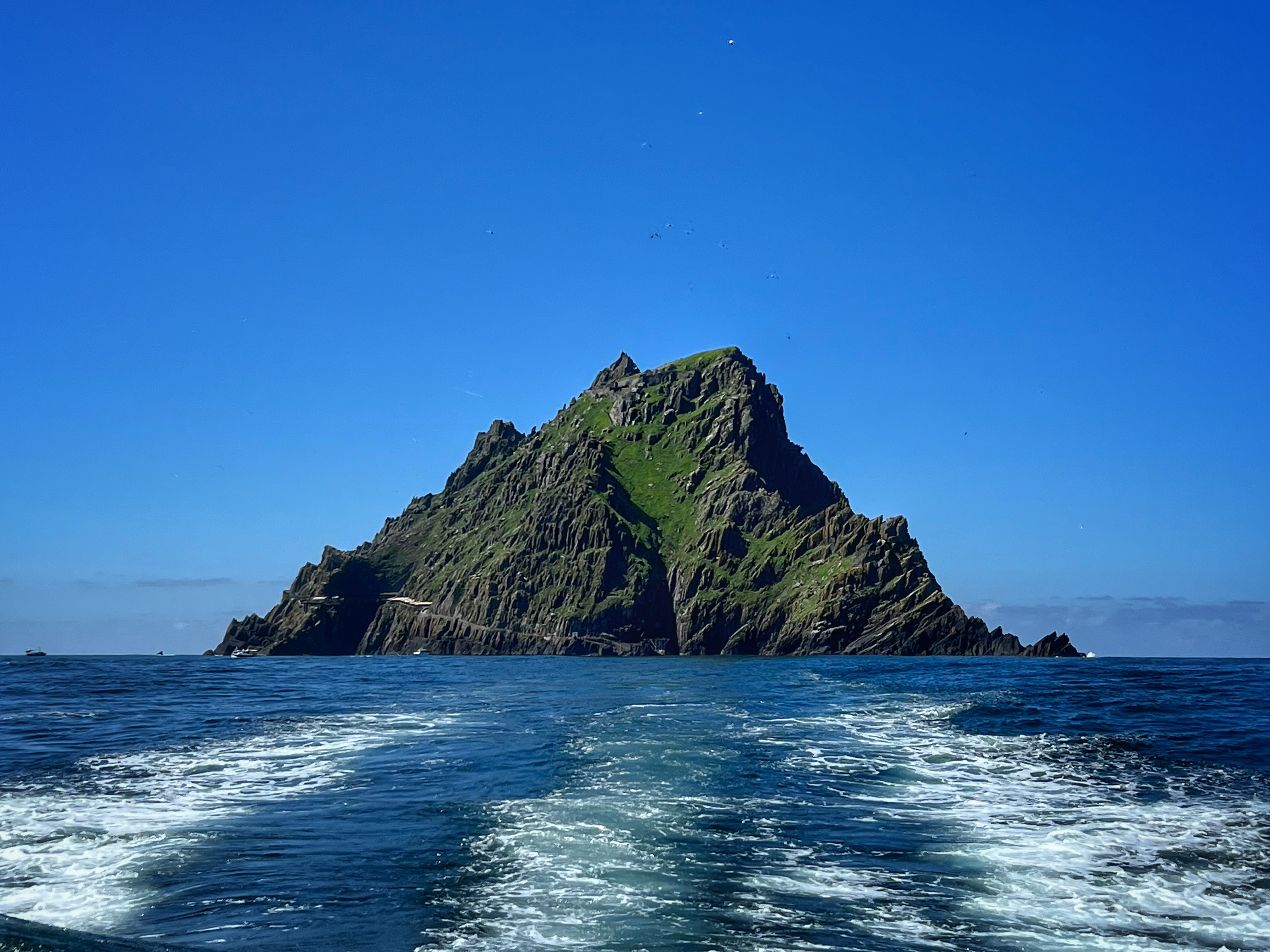 What an incredible day with my son! I was overwhelmed by it, really. We loved standing on the mythical STAR WARS island of Ahch-To and learning about the real life monks who lived at this UNESCO World Heritage Site for centuries. The original Gaelic monastery was slowly built between the 6th-8th centuries and endured for a millenia, when around the 16th century it became a site for religious pilgrims. STAR WARS nerds will appreciate that this island was used in the movies by Luke Skywalker as his hideaway, where the “sacred Jedi texts” were protected in an ancient tree. In real life, monks used the hermitage on the island to house and protect ancient texts from the Culdee church that date back to 37 AD. Interesting nod to history! Below you can see the beautiful beehive huts of the hermitage, in remarkable condition. Each one had a capstone on top that could be removed to allow campfire smoke to escape, but they were remarkably waterproof dwellings. A church, gardens, and cemetery also exist on the island. It was a self-serving community for hundreds of years as the monks fished, farmed, and let livestock graze for their food. Perhaps most impressive is that they made their way to and from the island by small rowboats – something I can’t imagine, even on our day with “good seas”! When you reach the beehive huts, another tour guide shares wonderful stories for about 15 minutes. The whole experience is spectacular! Yes, you can enter the huts, and you can wander just about everywhere except off the trails.