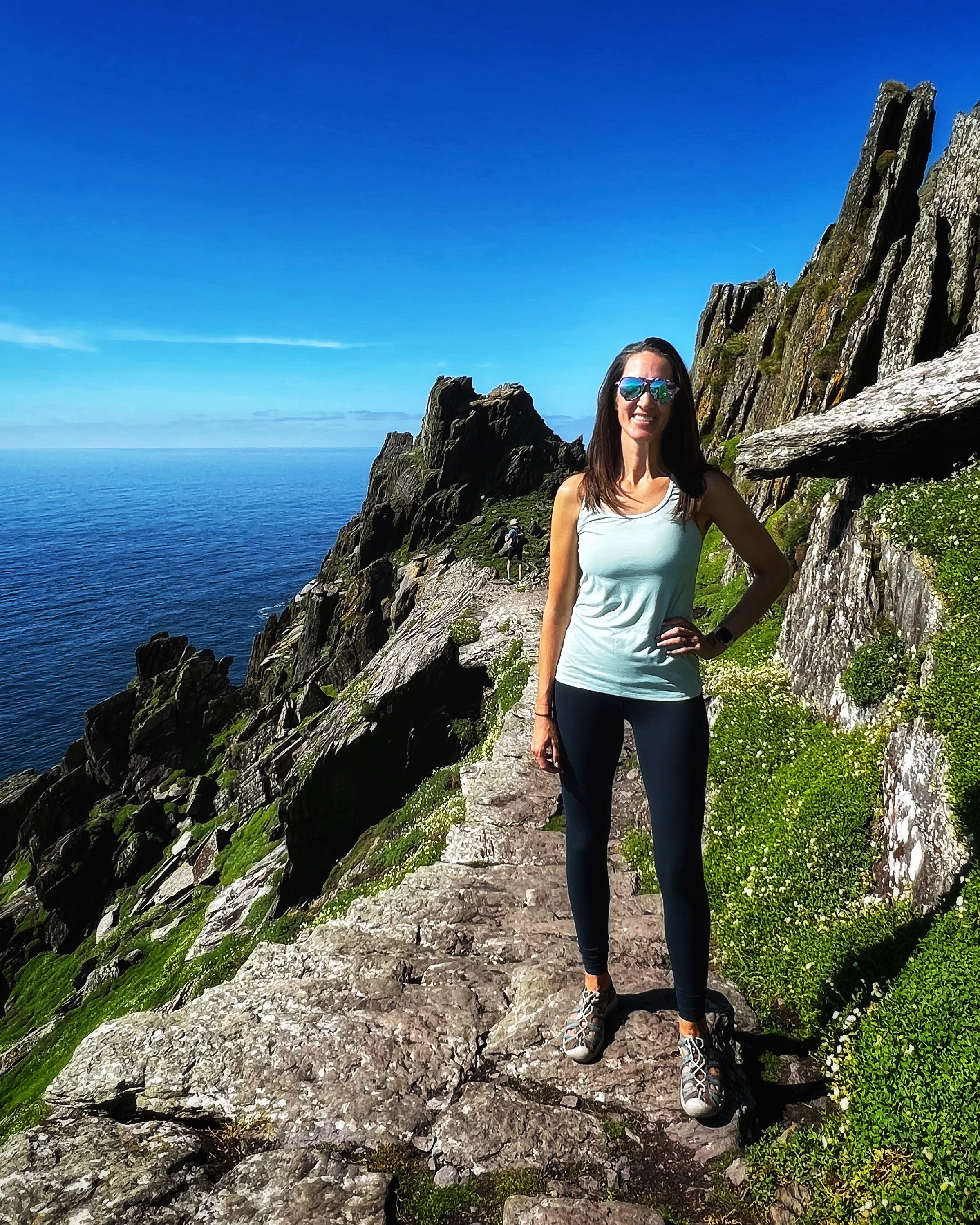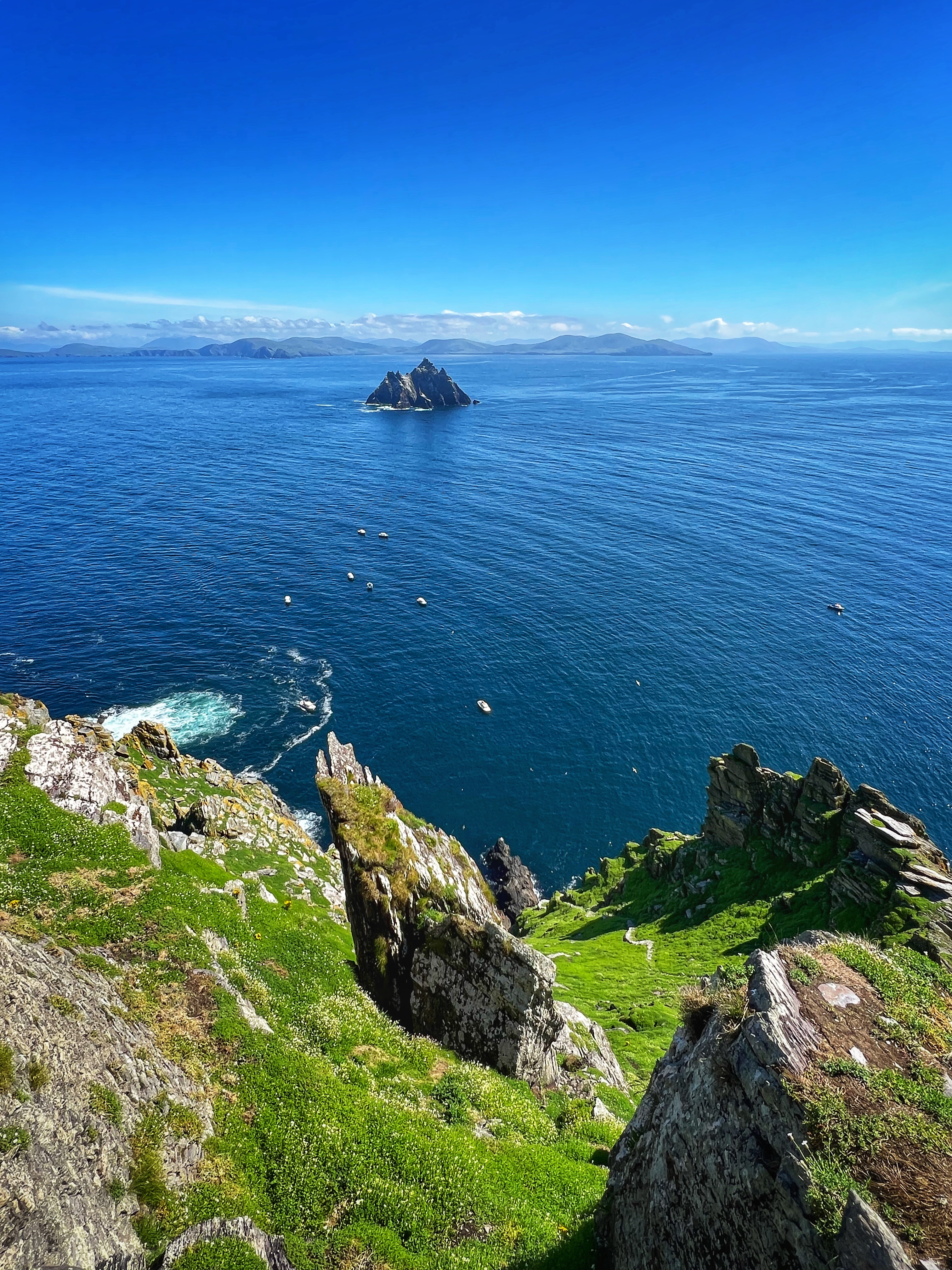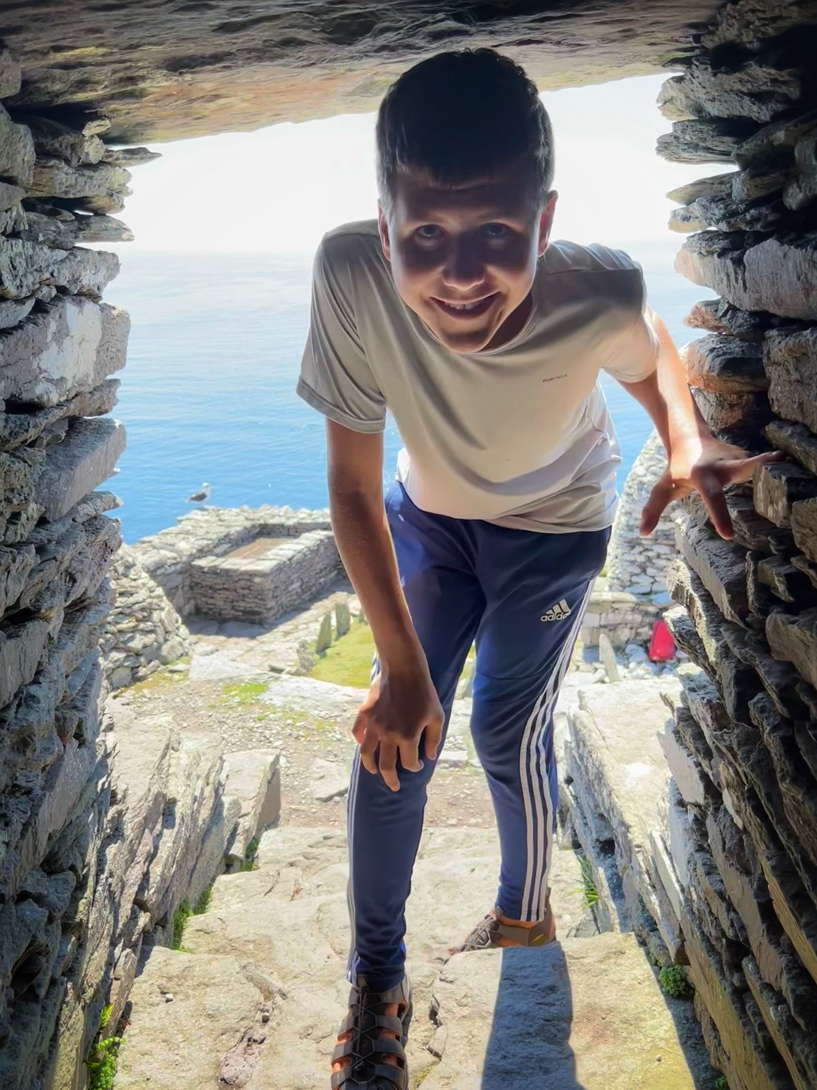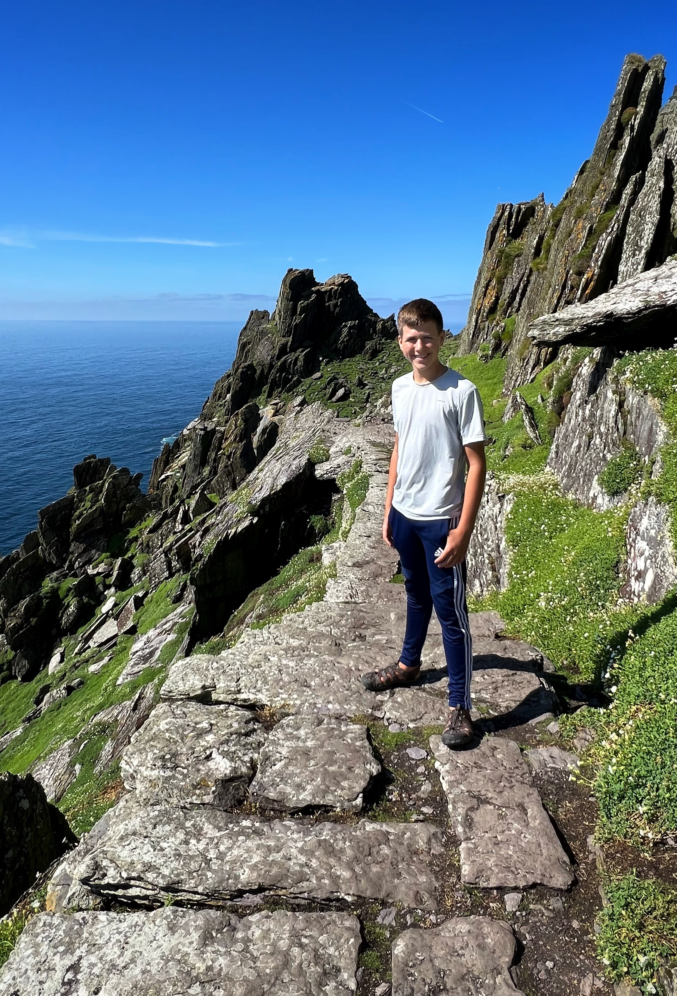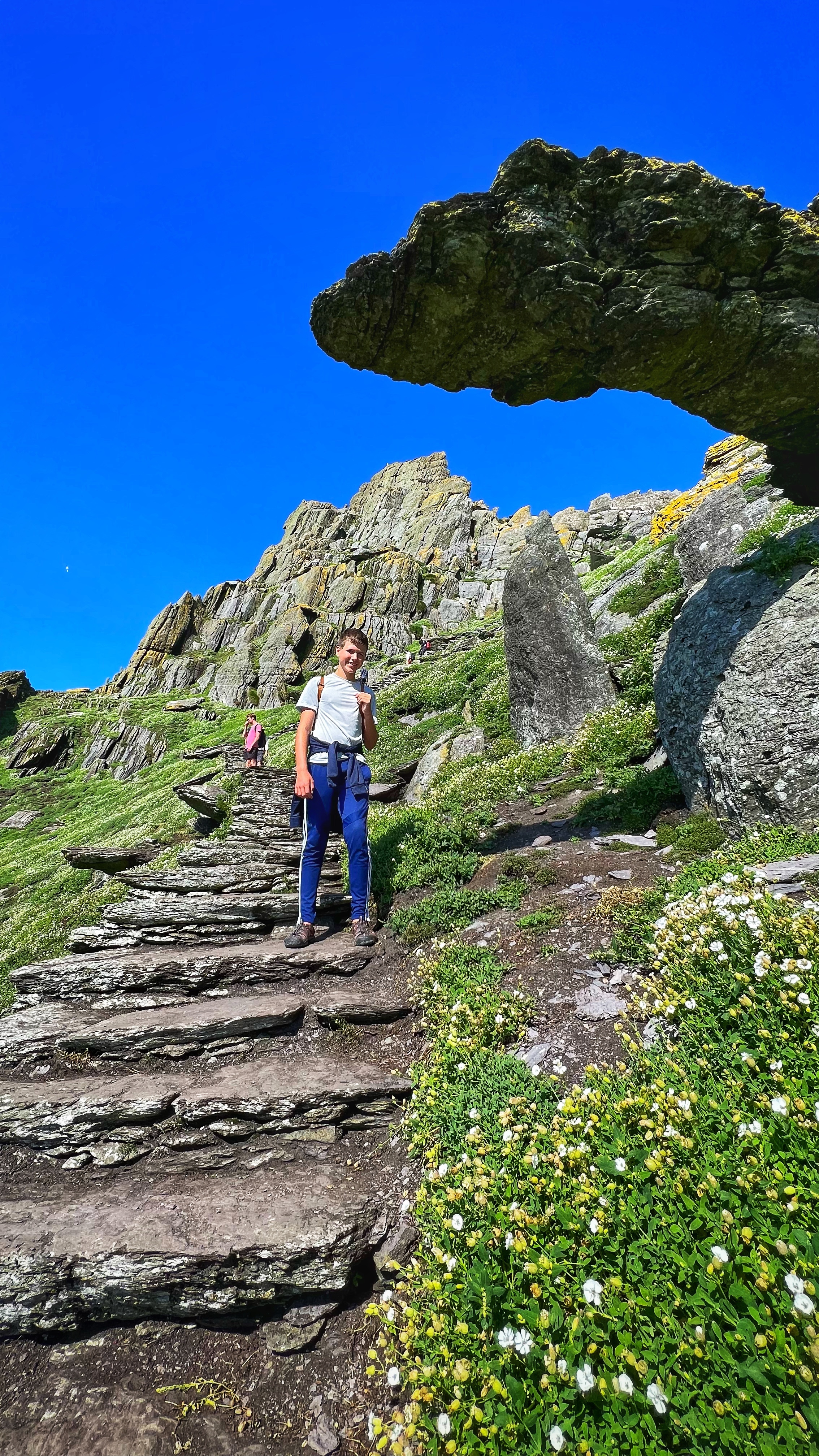 What an incredible day with my son! I was overwhelmed by it, really. We loved standing on the mythical STAR WARS island of Ahch-To and learning about the real life monks who lived at this UNESCO World Heritage Site for centuries. The original Gaelic monastery was slowly built between the 6th-8th centuries and endured for a millenia, when around the 16th century it became a site for religious pilgrims. STAR WARS nerds will appreciate that this island was used in the movies by Luke Skywalker as his hideaway, where the “sacred Jedi texts” were protected in an ancient tree. In real life, monks used the hermitage on the island to house and protect ancient texts from the Culdee church that date back to 37 AD. Interesting nod to history! Below you can see the beautiful beehive huts of the hermitage, in remarkable condition. Each one had a capstone on top that could be removed to allow campfire smoke to escape, but they were remarkably waterproof dwellings. A church, gardens, and cemetery also exist on the island. It was a self-serving community for hundreds of years as the monks fished, farmed, and let livestock graze for their food. Perhaps most impressive is that they made their way to and from the island by small rowboats – something I can’t imagine, even on our day with “good seas”! When you reach the beehive huts, another tour guide shares wonderful stories for about 15 minutes. The whole experience is spectacular! Yes, you can enter the huts, and you can wander just about everywhere except off the trails.