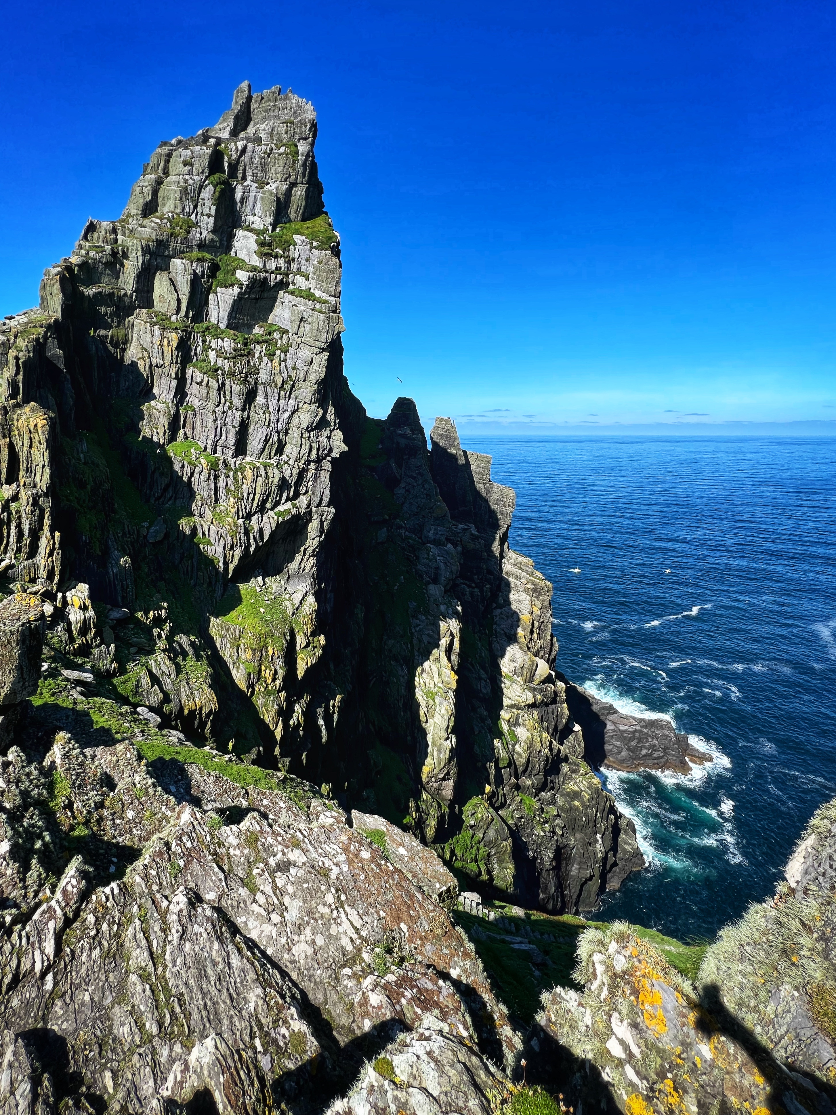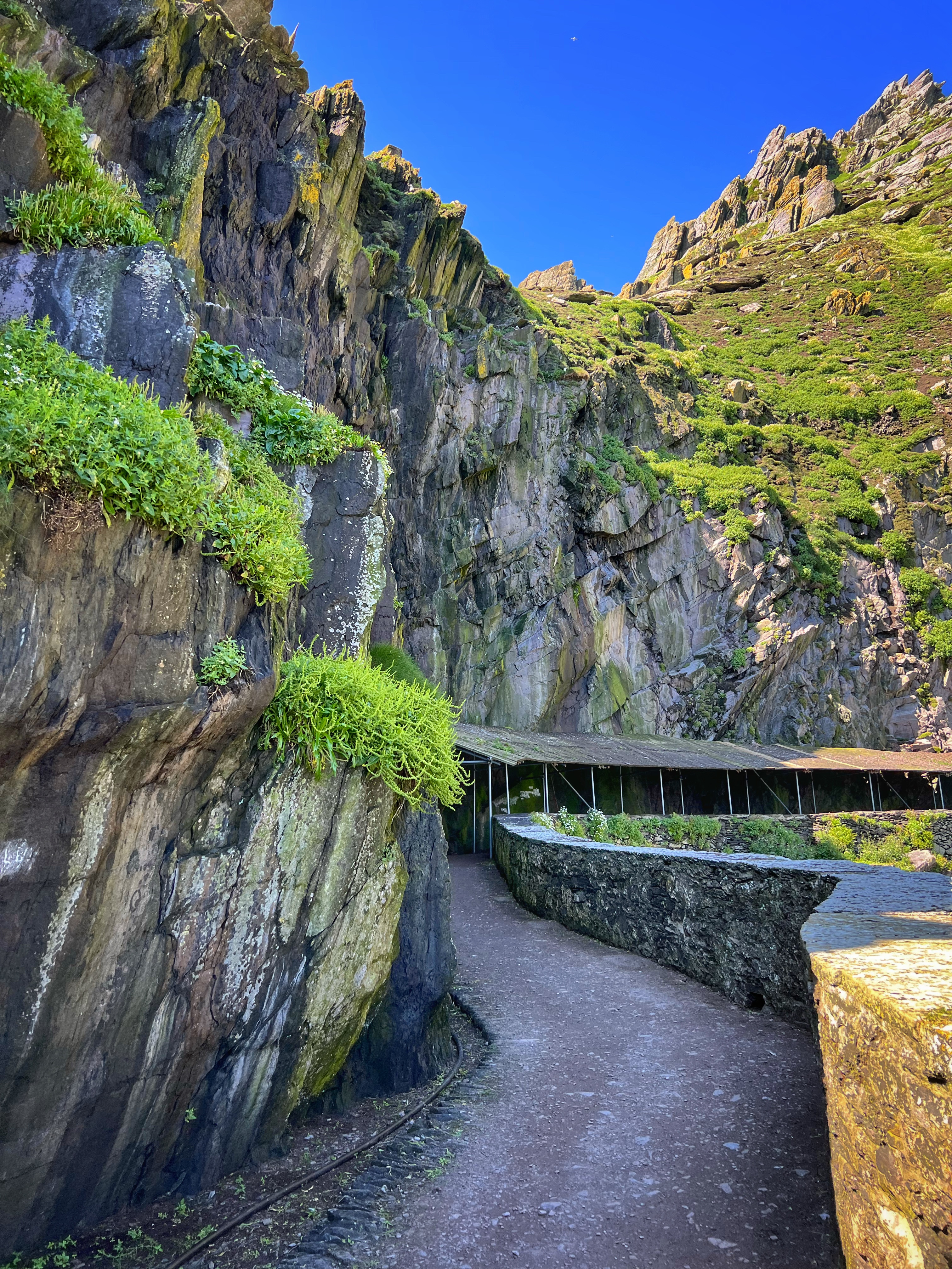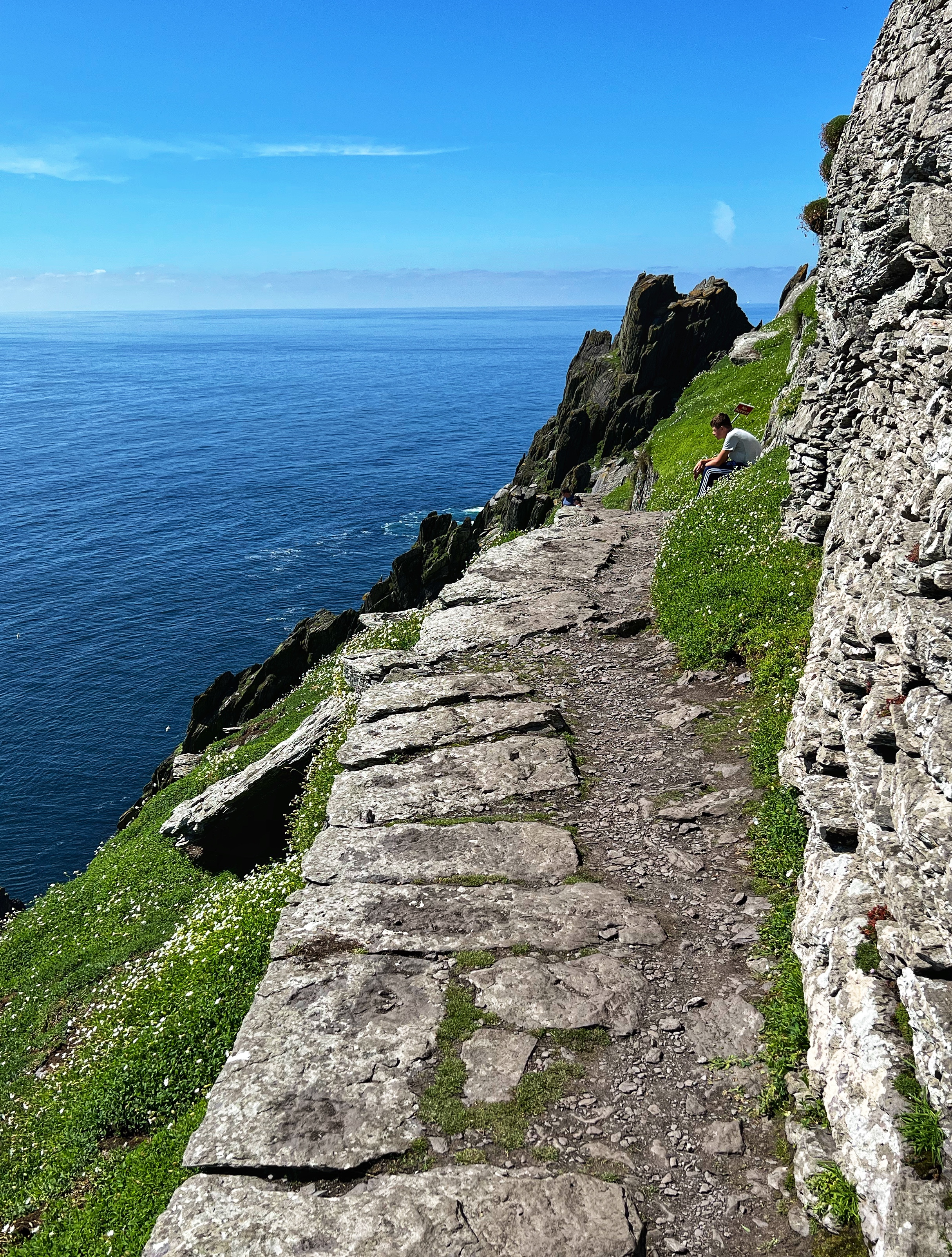 In addition to being a historic and archaeological gem, this island and its neighbor “Little Skellig” (seen in the distance in many of these photos) are home to many bird species. We arrived about one week after the puffins on the island left, but we did see their tiny homes among the rocks and wildflowers. On Little Skellig, petrels, huge gannets, and puffins cover the cliffs. There are so many birds that the rocks appear white, covered in snow. In fact it is just birds and their poop that give the rocks their white coloring. It is also possible to see falcons and grey seals on or around the island. Every single green area that you see is off limits to pedestrians, as those are likely puffin nests. I was surprised to see small modular housing for the five or so tour guides who stay on the island in two week stints. They live right there and experience everything the monks did. There is also a helicopter pad – can you see it?