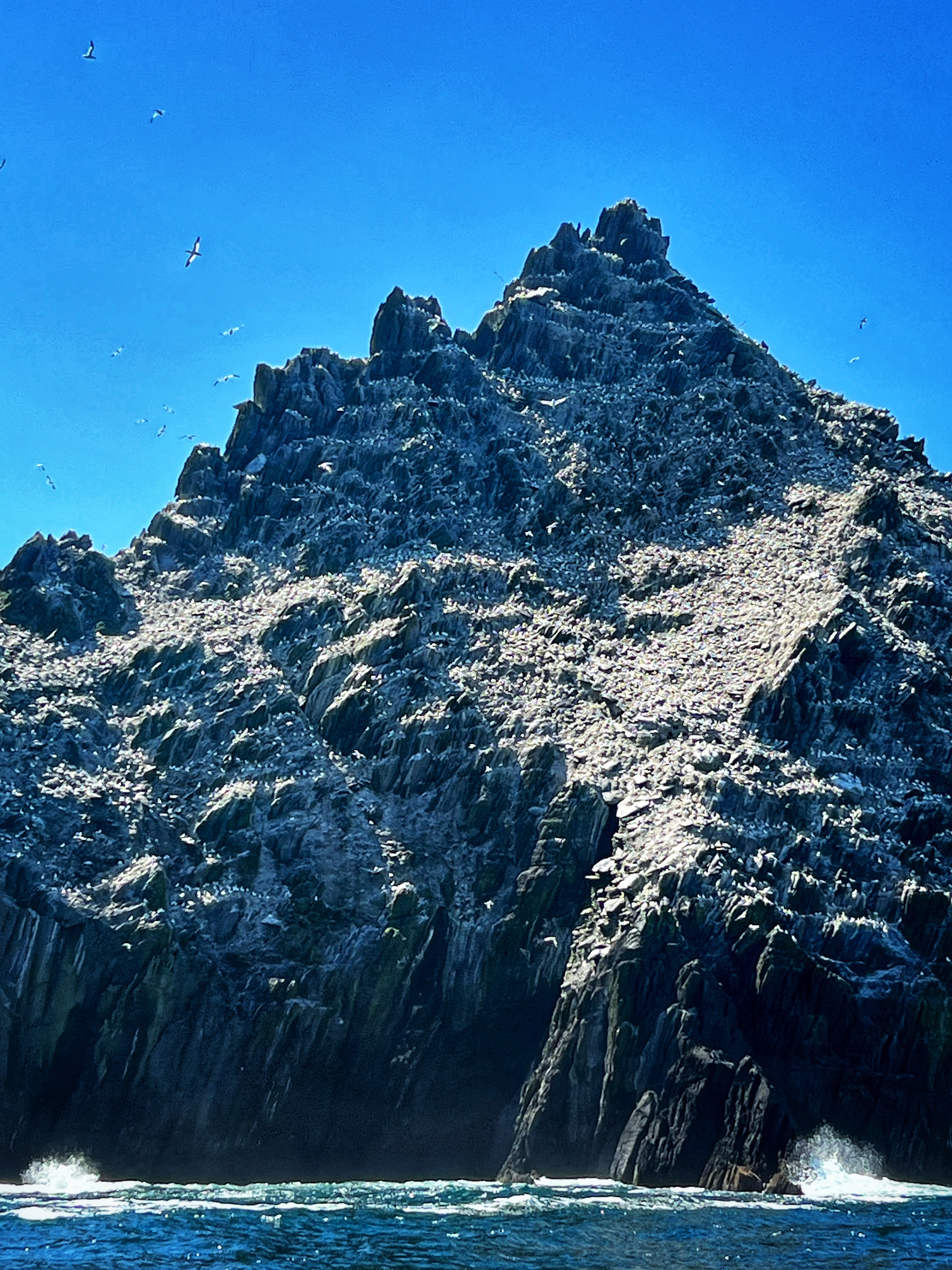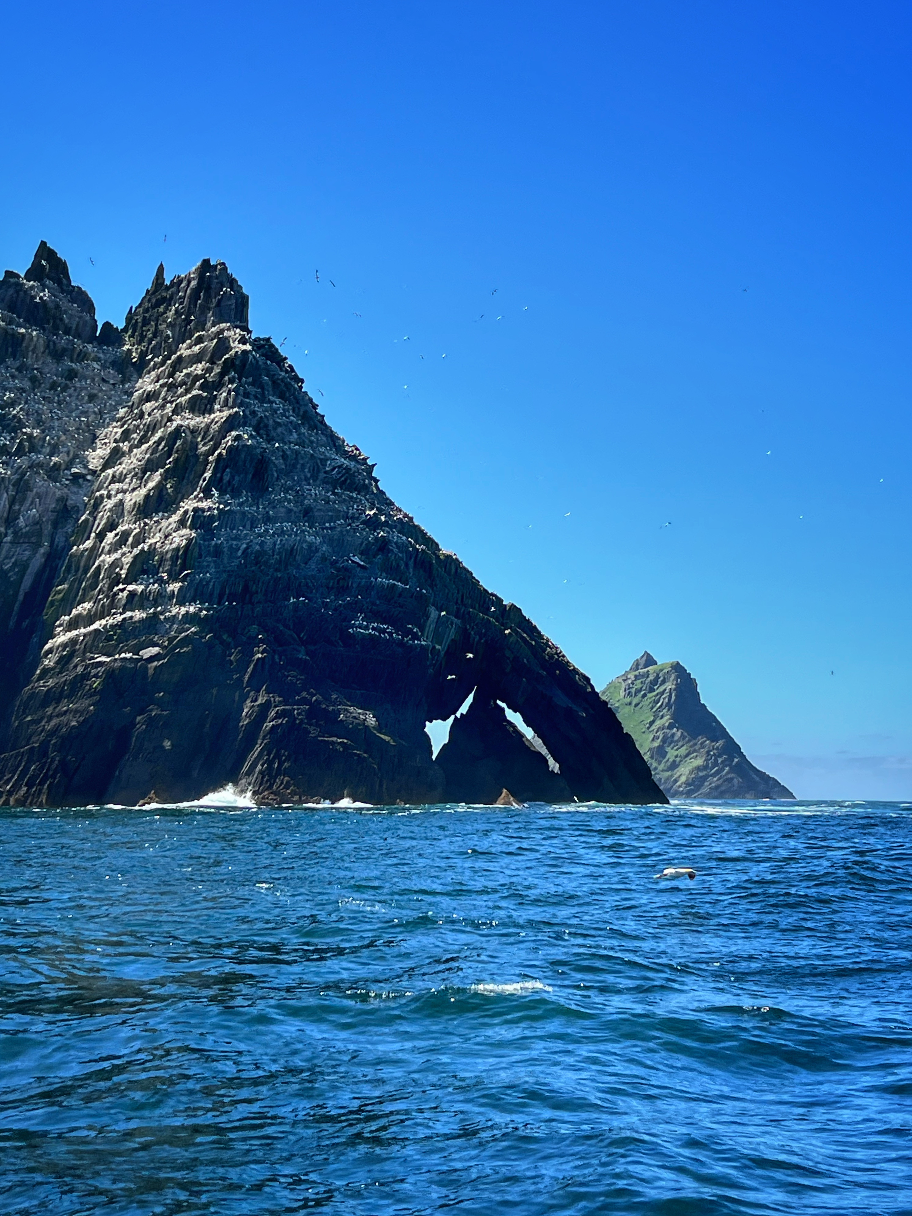 After two hours touring the great Skellig Michael and feeling on top of the world, it was time to descend and make our way back to the pier as our boat had a very specific time we were supposed to leave. Don’t miss your boat time! You don’t have to stay with your little group the whole time, but it’s a good idea to know who’s in your group so you can look out for each other. I was on such a natural high after the tour that my legs were shaking as I got back on the boat. On the way back the captain will take you around Little Skellig and tell you all about the huge gannet birds and other facts about the island. I loved the windows in the rocks all around Little Skellig. They say if you get pooped on boating around the island, it’s good luck. Well, we didn’t get pooped on, but I sure left that day feeling like we were the luckiest people in the world! This was definitely a tour to remember.