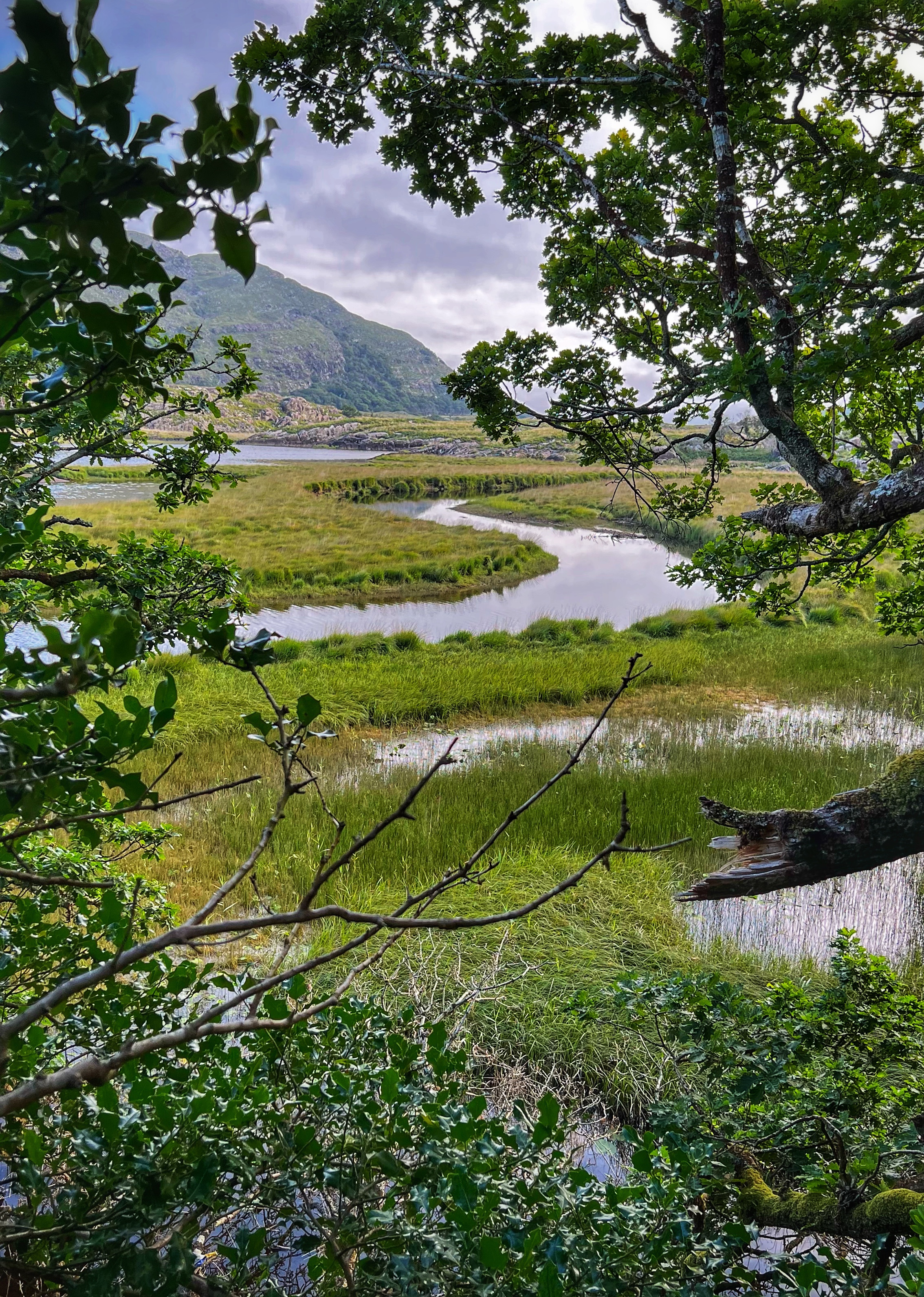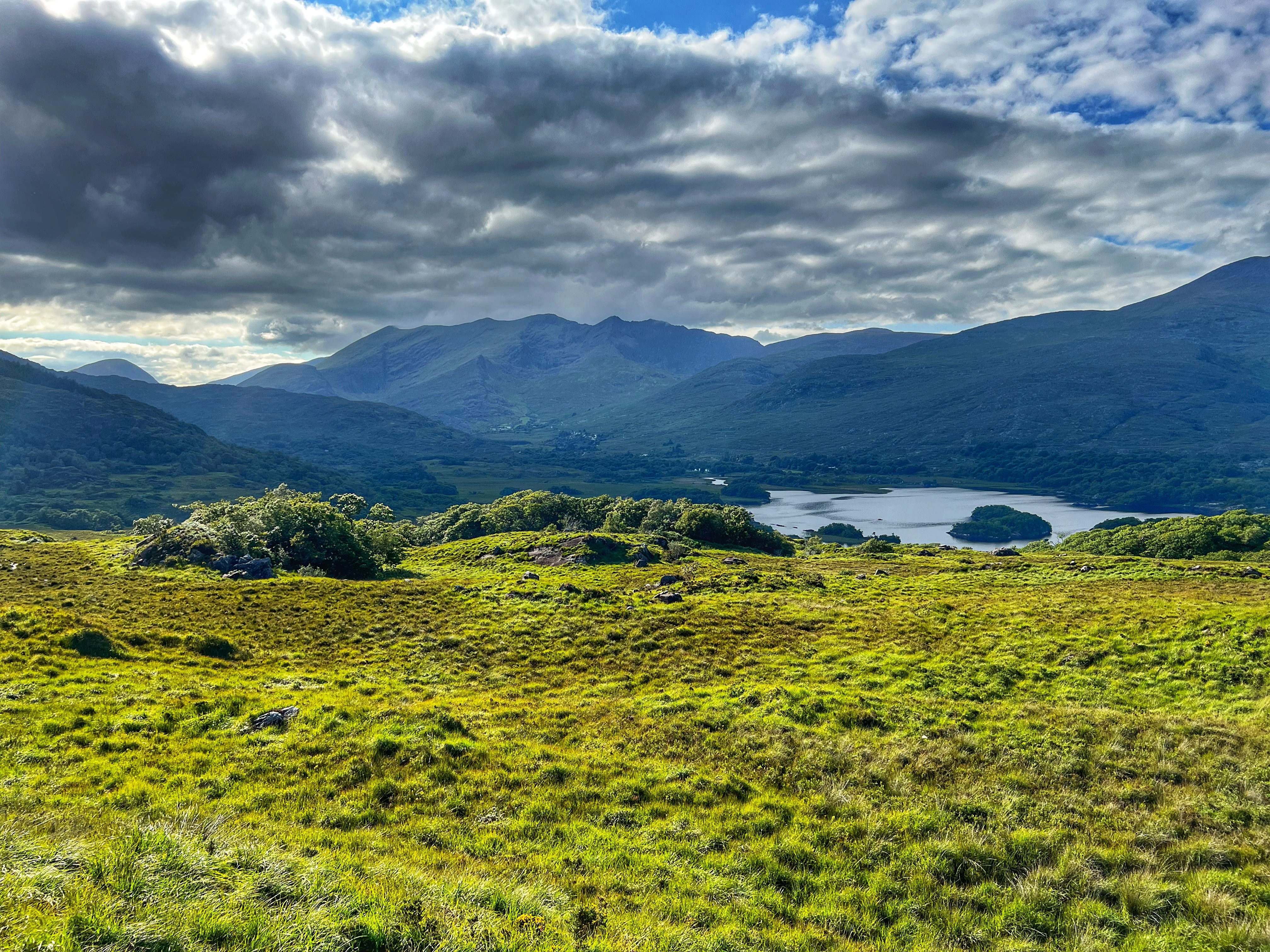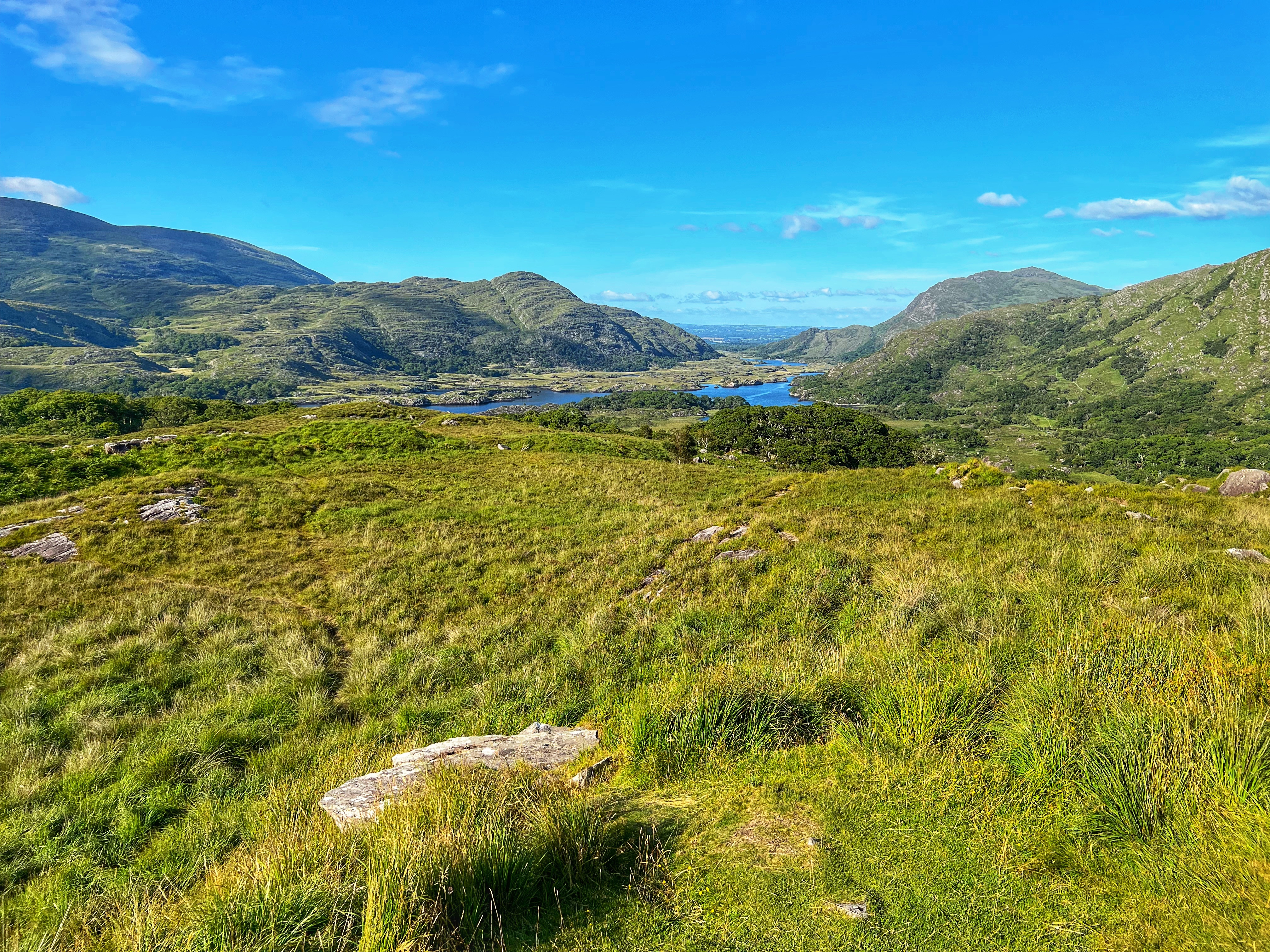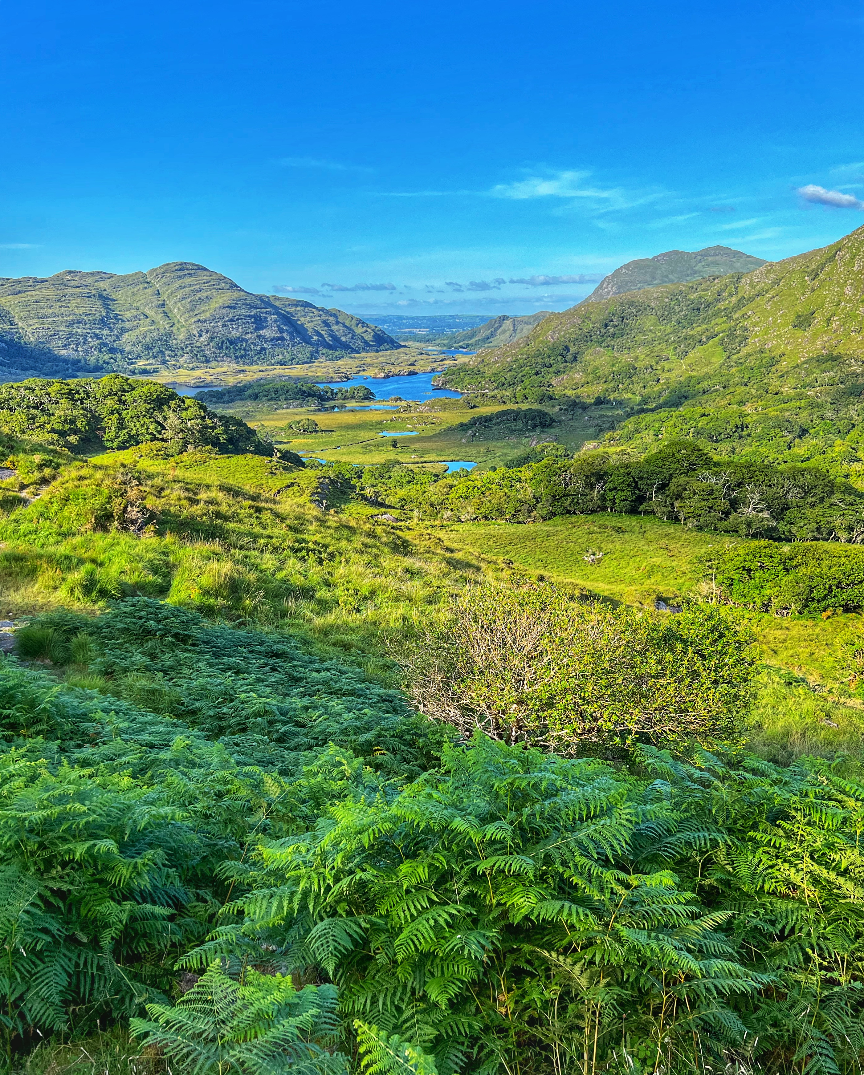 The MUST SEE viewing points along the Ring of Kerry include: Com an Chiste (above), Derrynane Beach, Molls Gap (below), and Ladies View (below). Other points of interest are Muckross Lake (including Muckross House & Gardens which I discuss later), and Torc Waterfall. My favorite of all of these was Molls Gap – an incredible viewpoint over the valley in both directions. Impossibly green and a joy to drive! At Ladies View we pulled into upper viewpoint and noticed our campervan was smoking from the hood, and it smelled like oil…