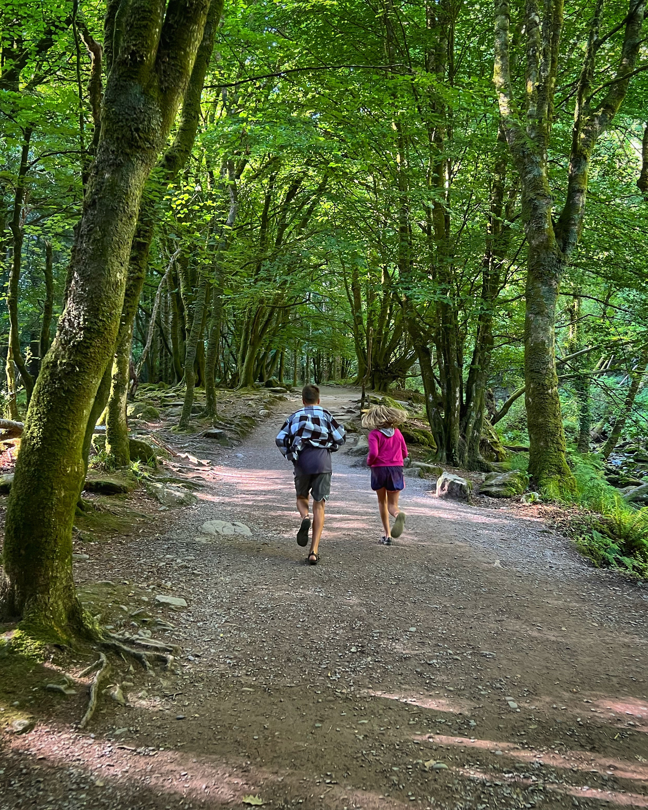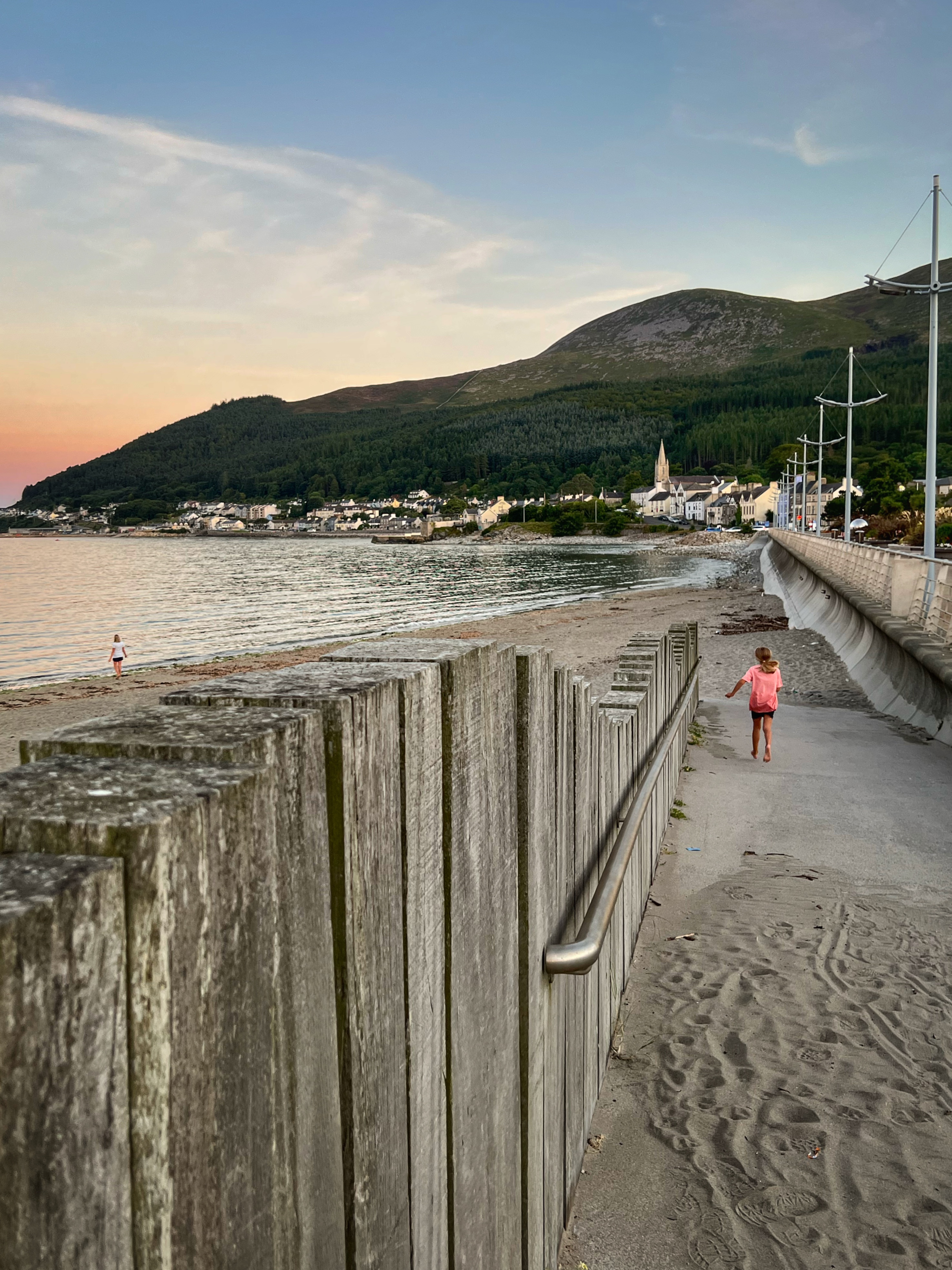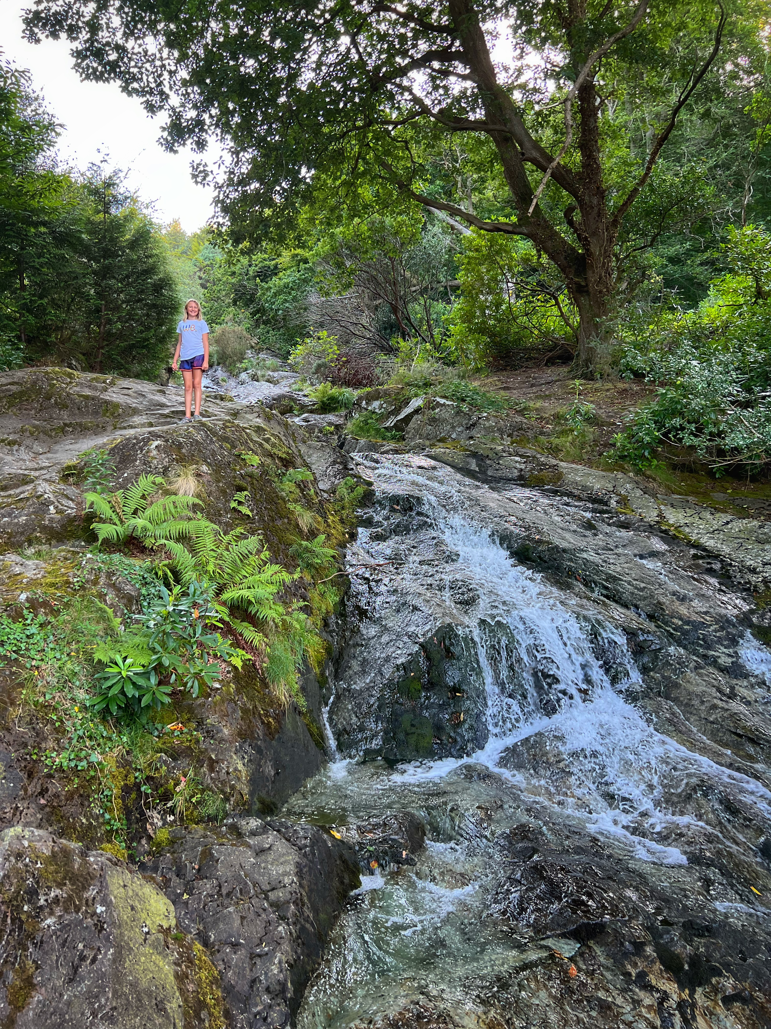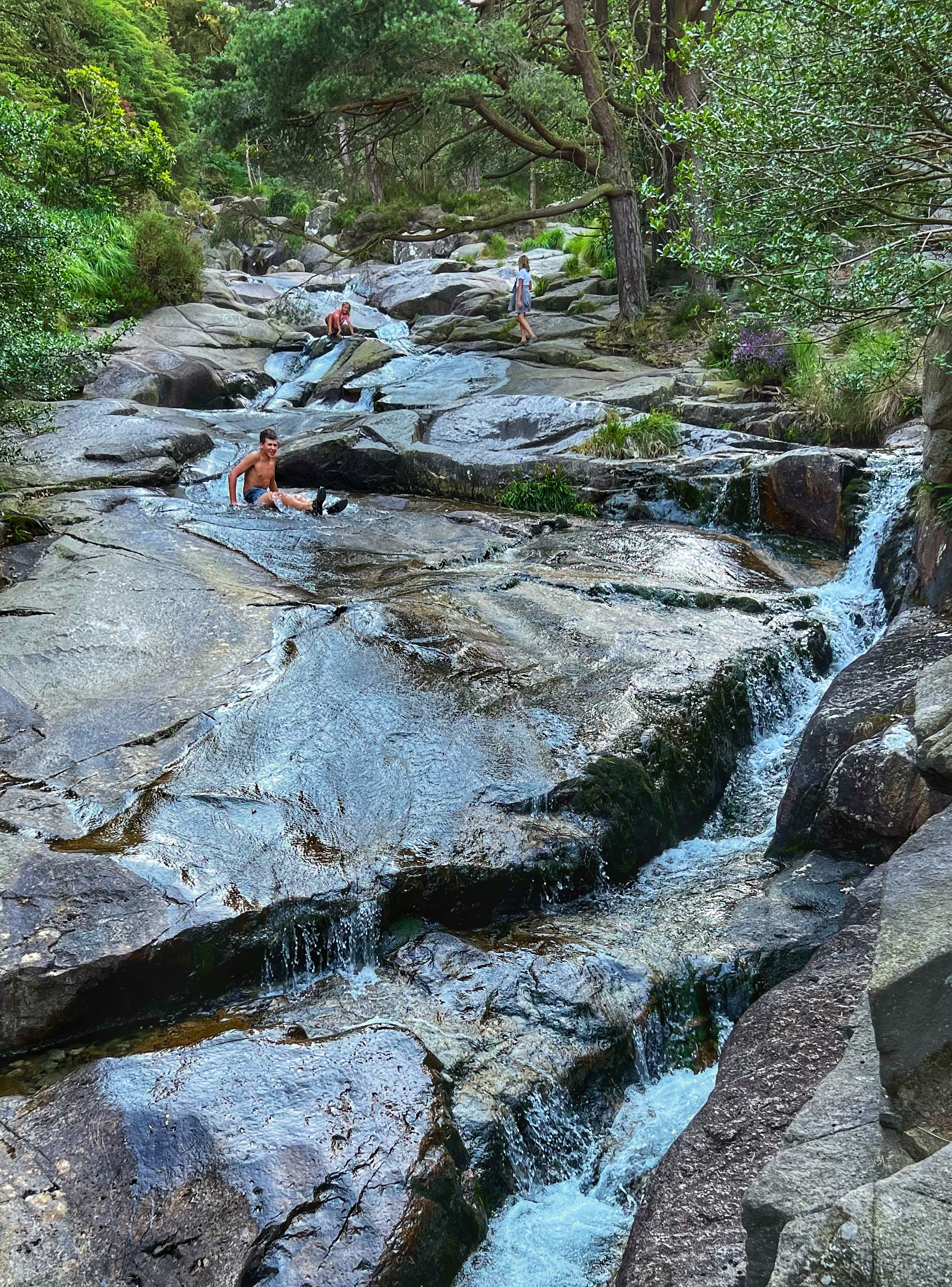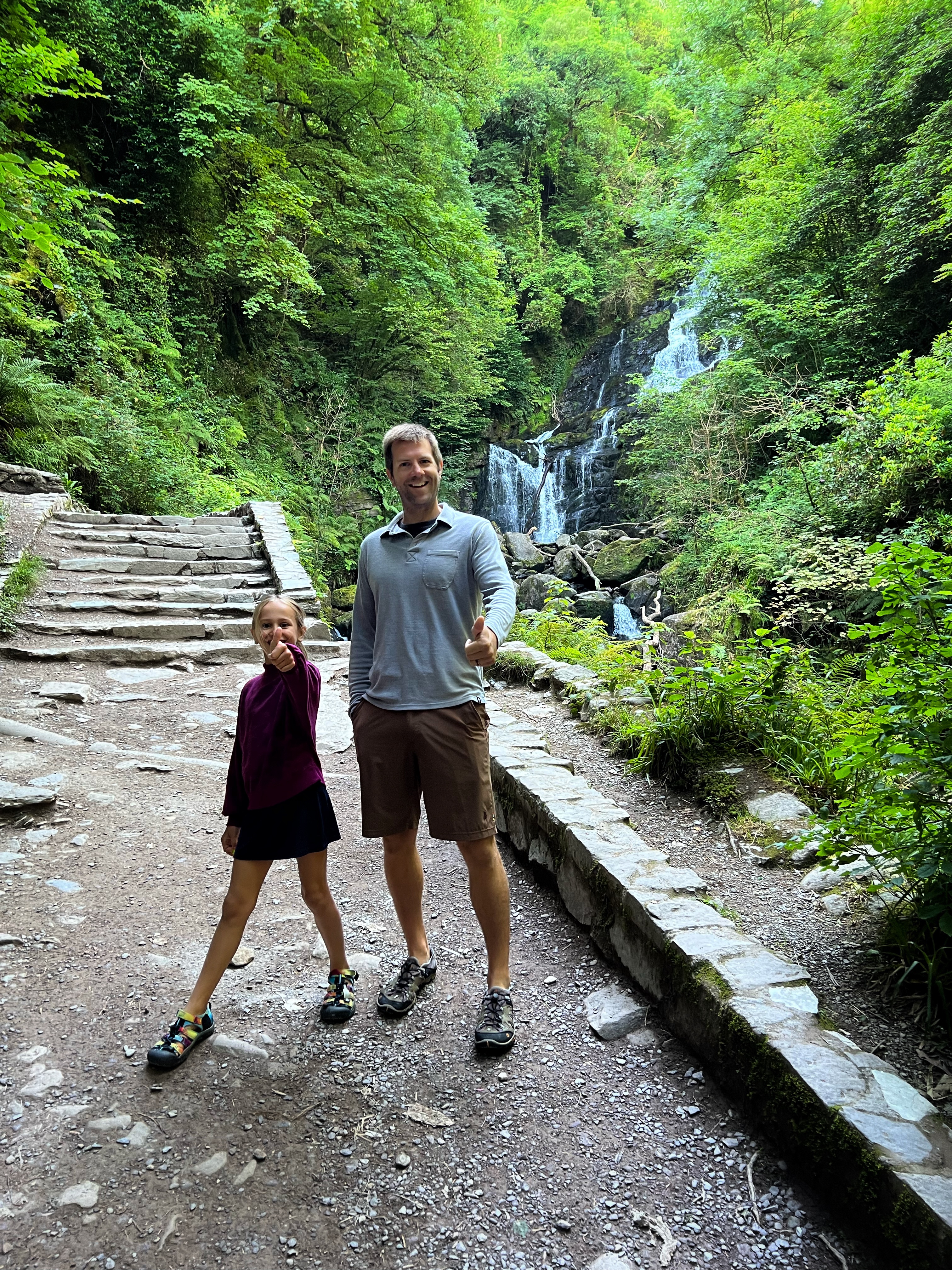 The original goal was to make the big hike all the way up Slieve Donard, the highest peak in Northern Ireland. However, we arrived at the Donard Car Park (where we stayed for the night) a little bit late, so instead we ate dinner in the campervan and took a nice sunset walk along the Glen River trails to a beautiful overlook of the coast and Newcastle. The kids loved this hike and were so happy to be back on their feet after the long drive. This hike took us about 90 minutes, complete with rope swings, tons of waterfall pools to play in, remarkable trees, beautiful views, blackberries to pick, and even smooth rocks to slide down in the river.