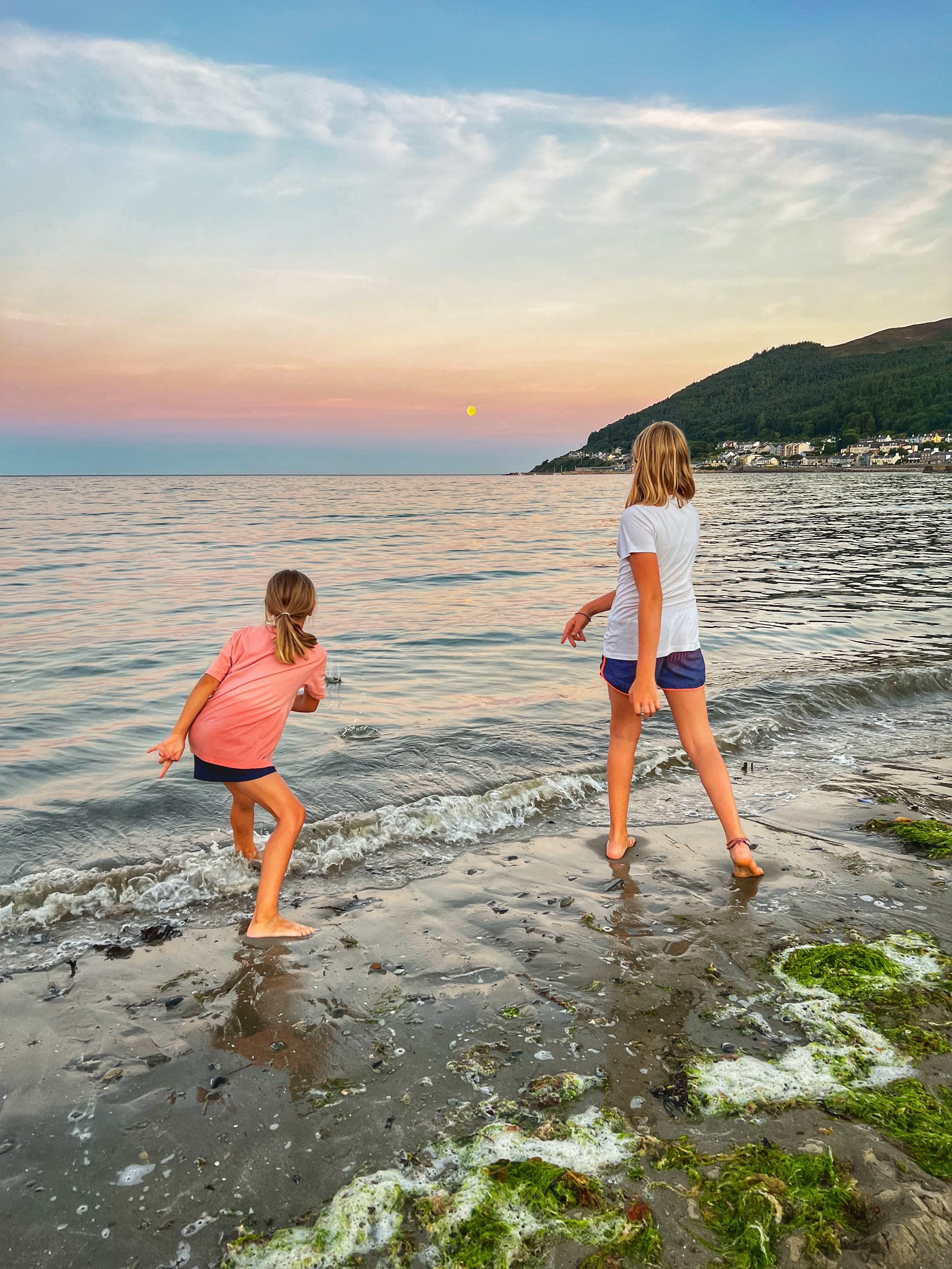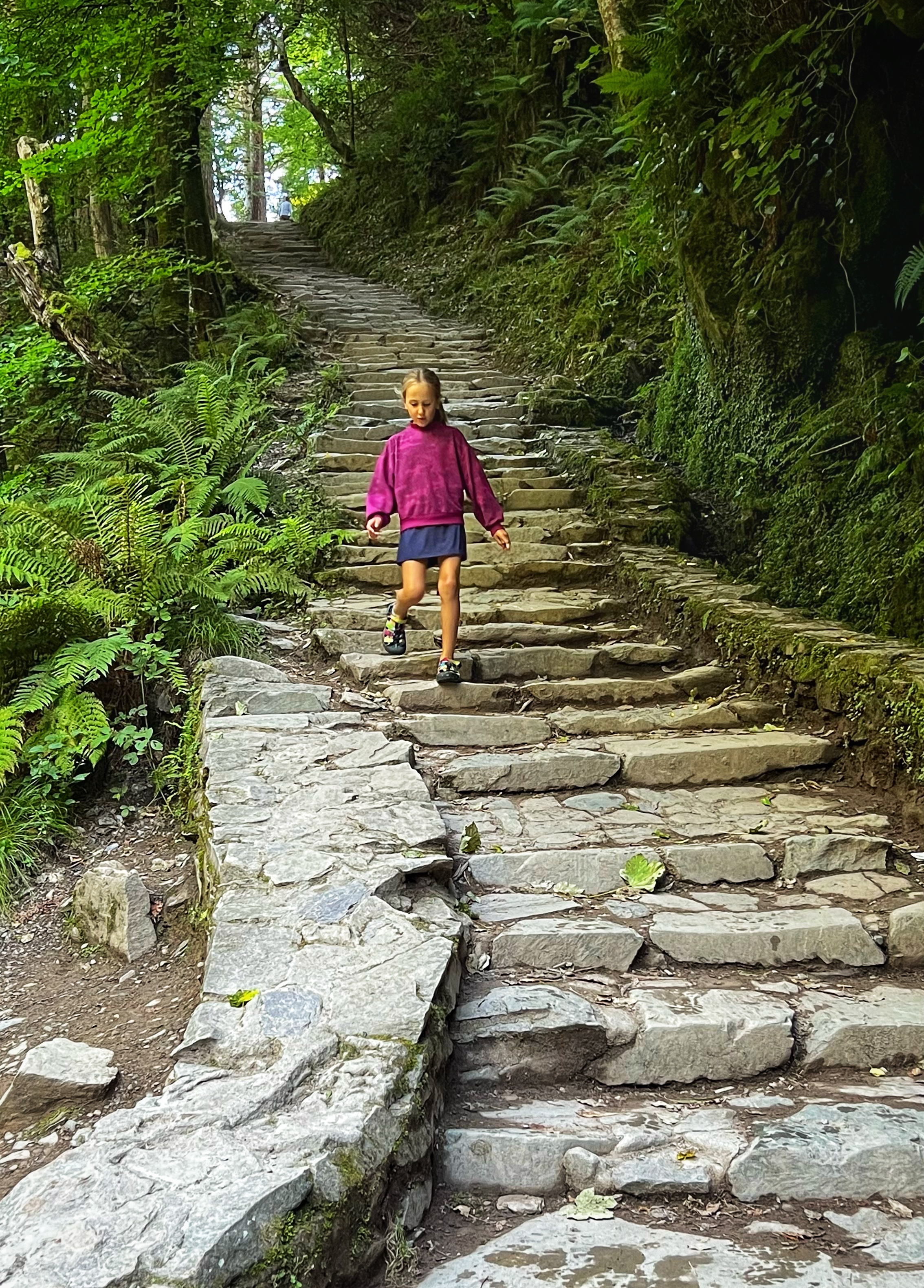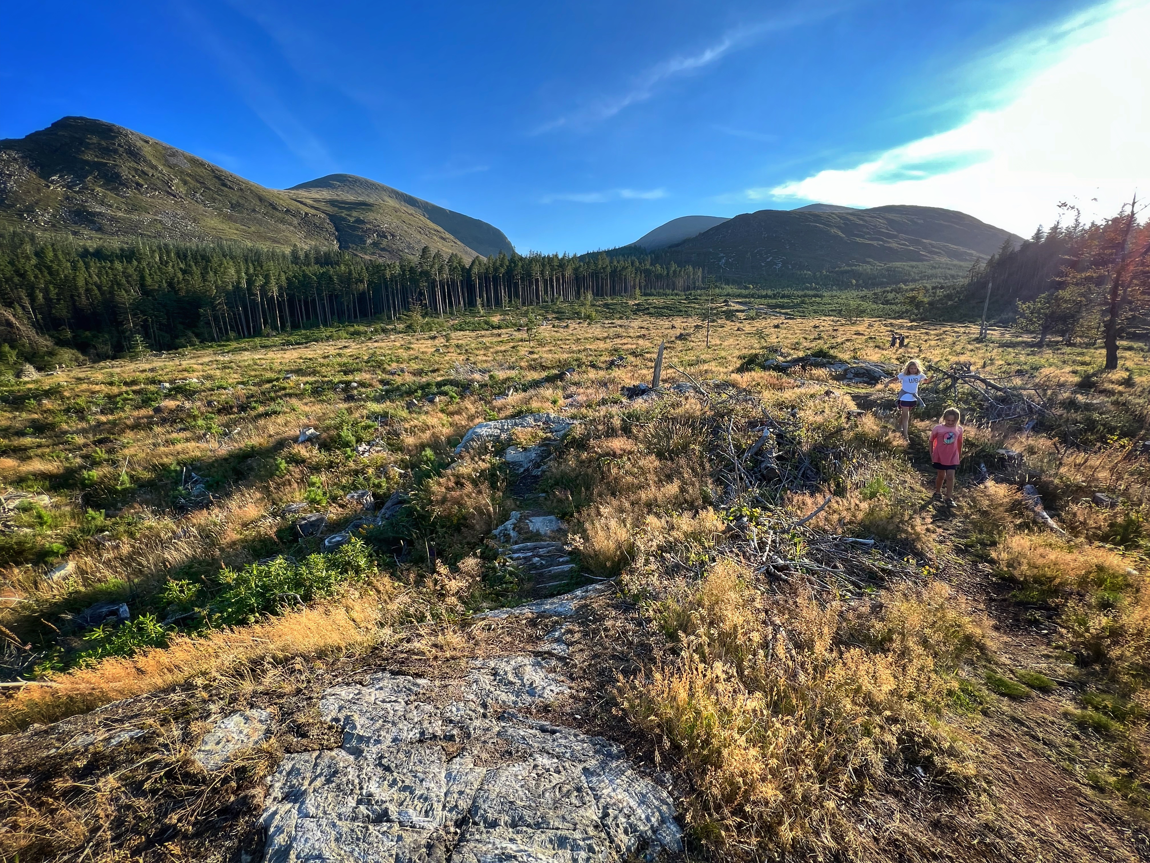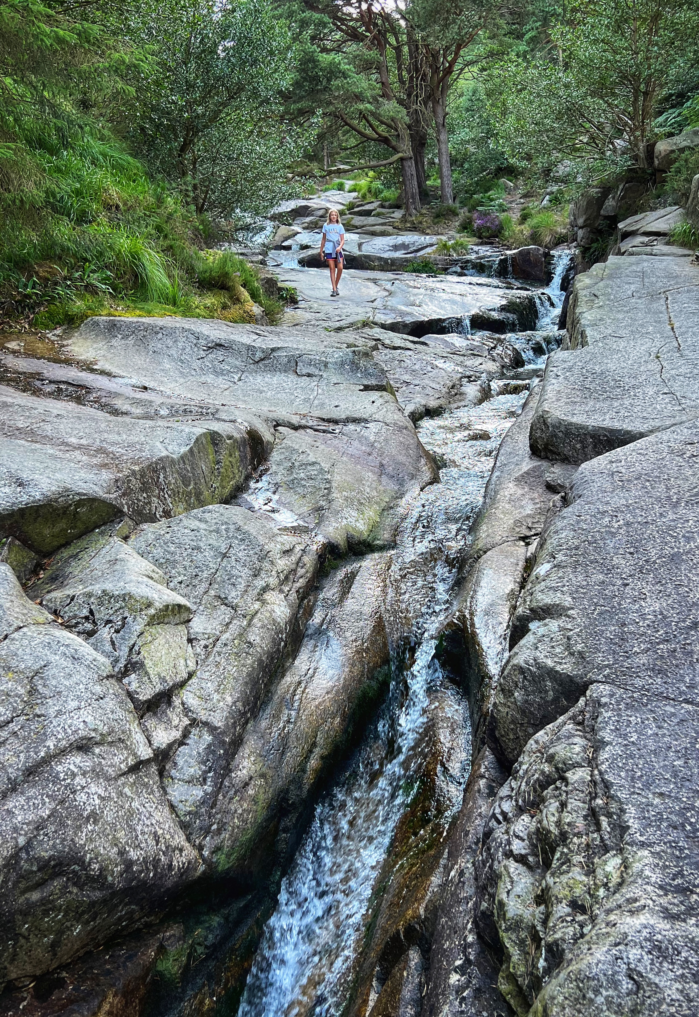 The original goal was to make the big hike all the way up Slieve Donard, the highest peak in Northern Ireland. However, we arrived at the Donard Car Park (where we stayed for the night) a little bit late, so instead we ate dinner in the campervan and took a nice sunset walk along the Glen River trails to a beautiful overlook of the coast and Newcastle. The kids loved this hike and were so happy to be back on their feet after the long drive. This hike took us about 90 minutes, complete with rope swings, tons of waterfall pools to play in, remarkable trees, beautiful views, blackberries to pick, and even smooth rocks to slide down in the river.