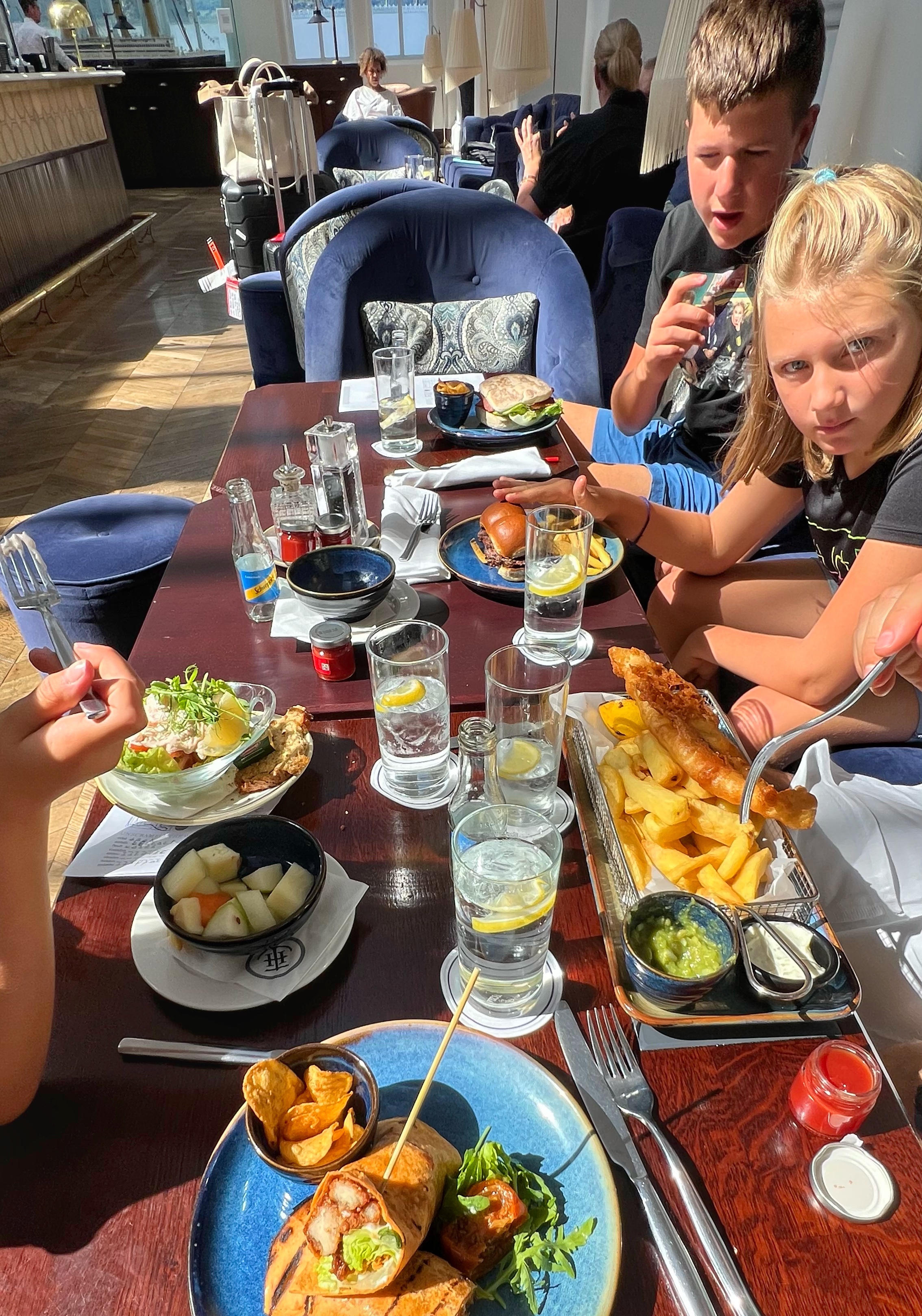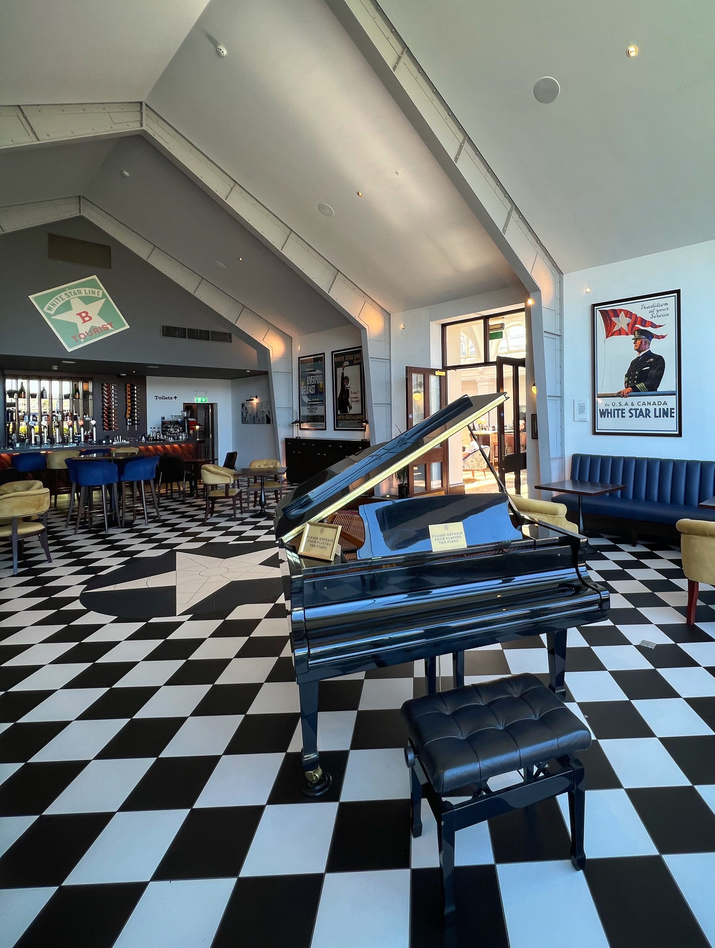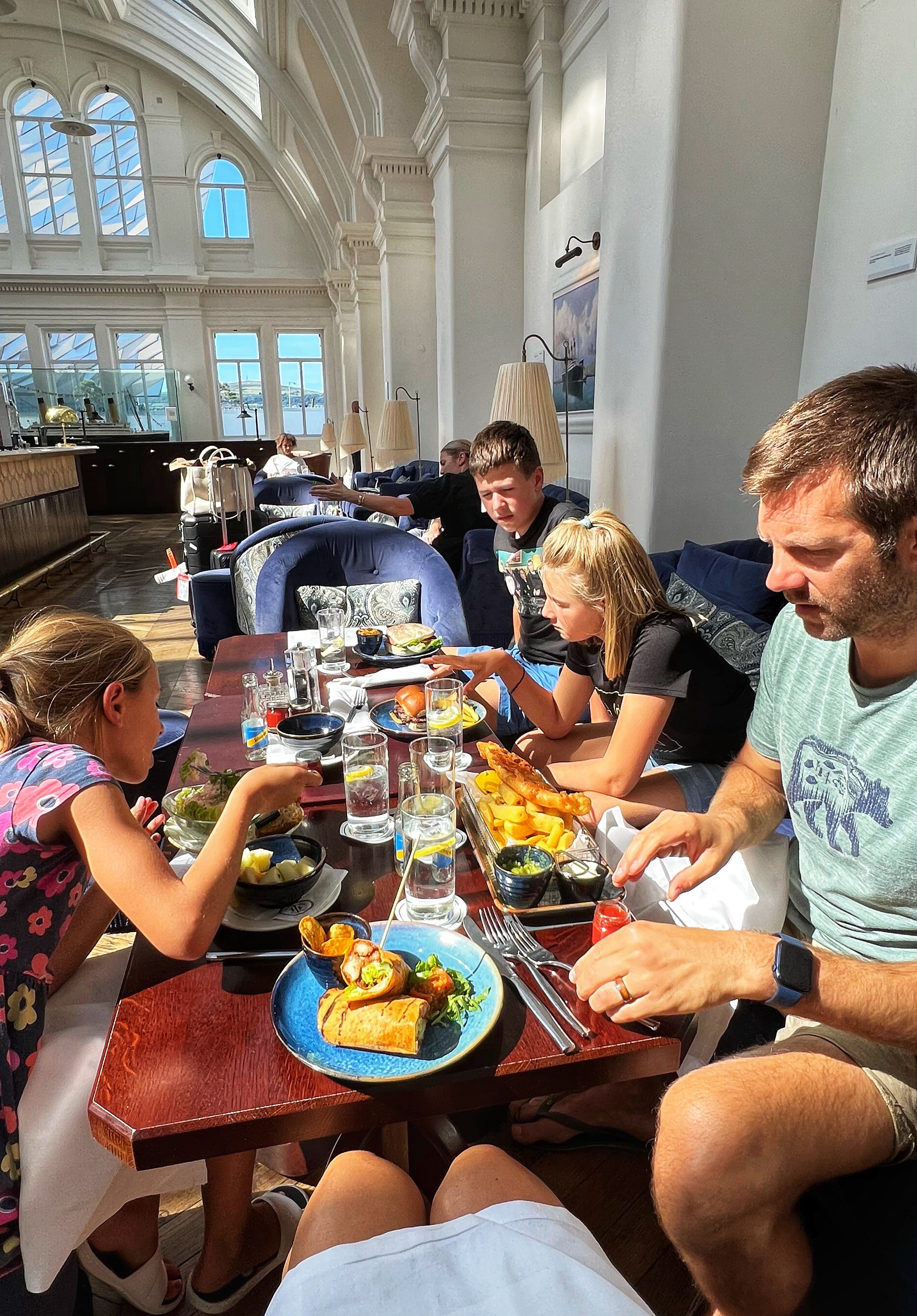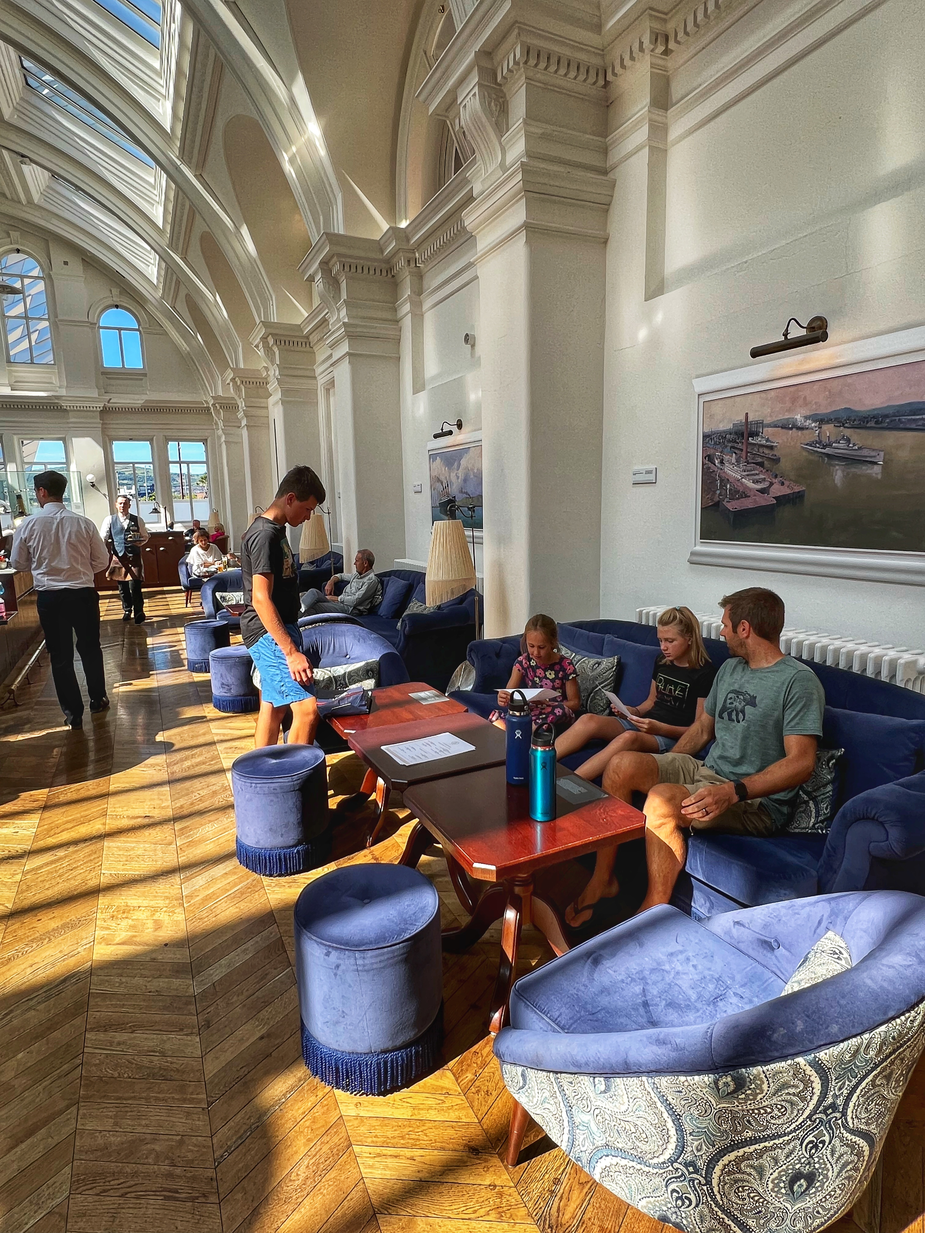 The exhibits were pretty crowded at first, but were so well done. Each of us had a Q&A sheet with treasure hunt questions that’s always a plus for families to engage the kids. There is endless paraphernalia and the design of the museum takes you through history, long before the Titanic was built. We learned about the heyday of Belfast, during its manufacturing and shipping boom that inspired the shipbuilders who made the Titanic. There are several levels of exhibits plus movies, tons of interactive displays, and even a ride through the building process. It took us about 3 hours to go through the museum, and after we were quite hungry. Not to worry, there are plenty of food options right there in the museum…but we had a tip to go next door to the Titanic Hotel and have lunch there instead, as this is where the blueprints for the Titanic were drawn up by the architects (it’s is worth seeing in its own right, even if you don’t eat there).