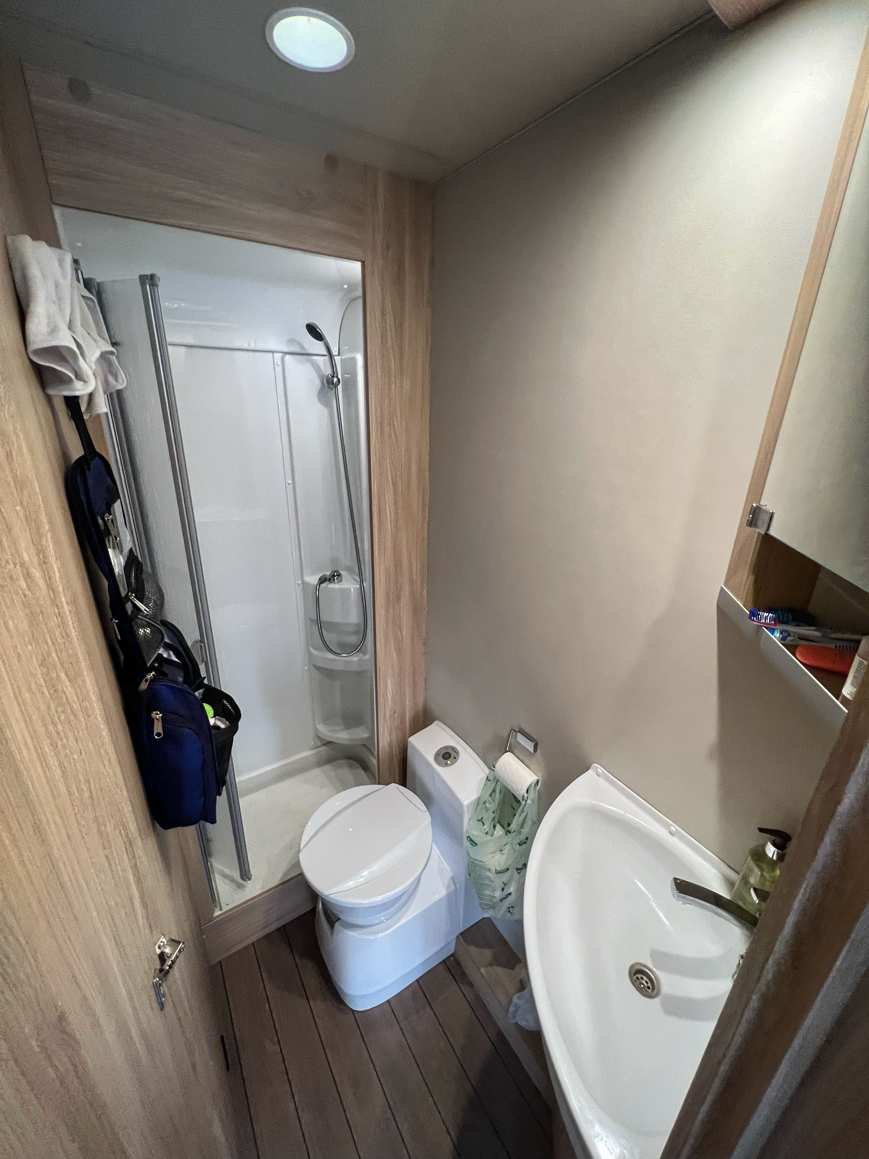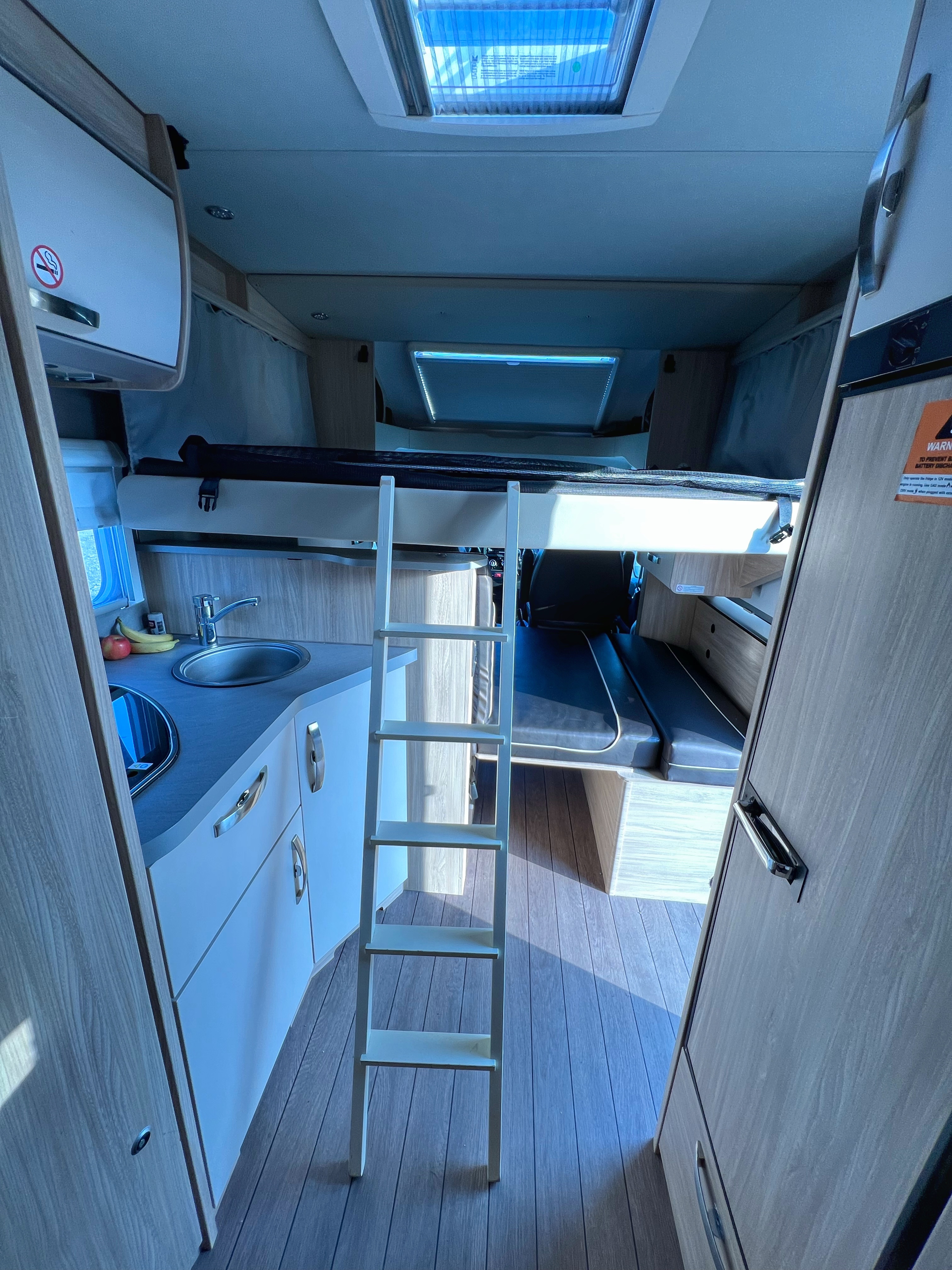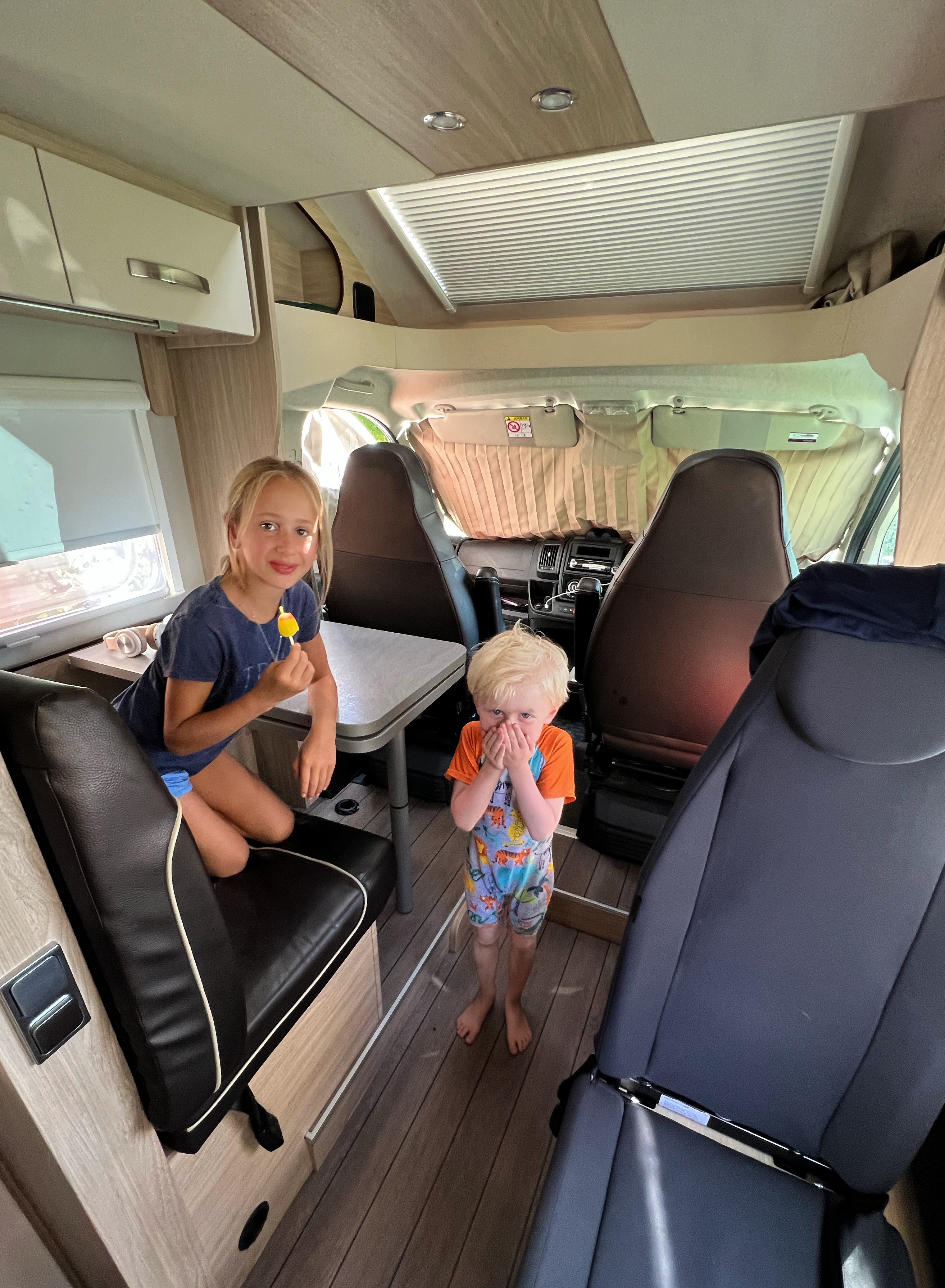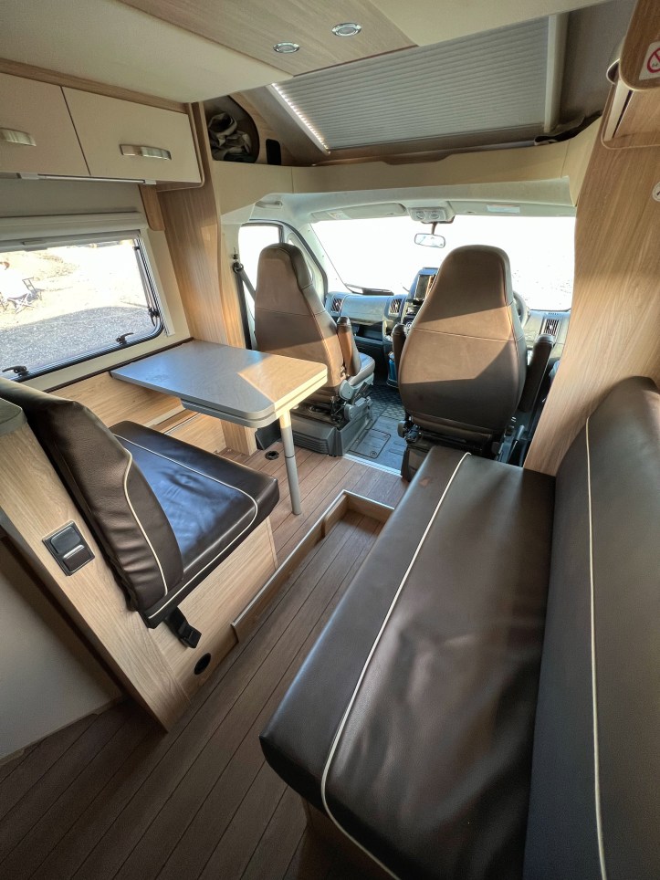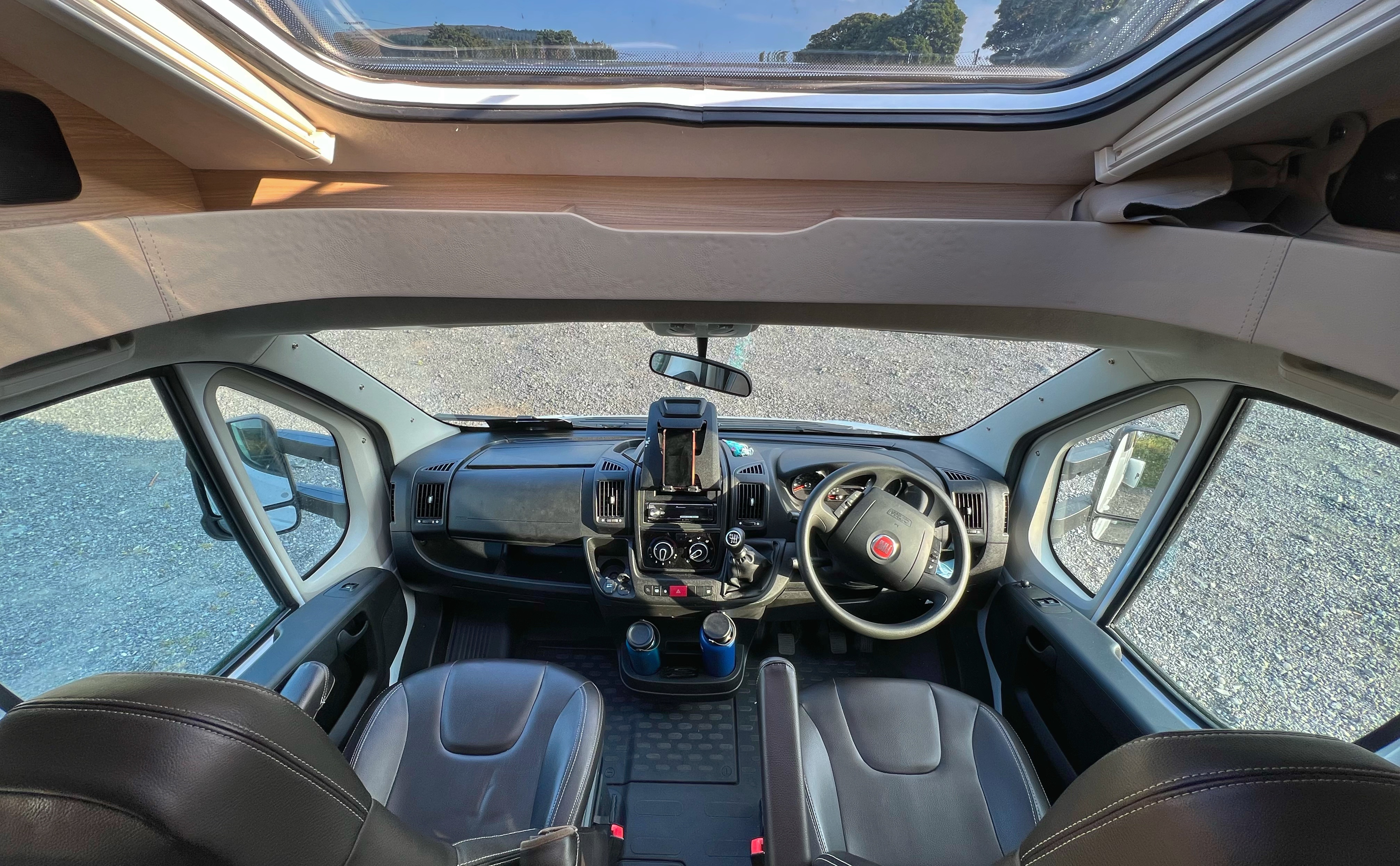 • Fiat Atlas, sleeps 5 people, 7m long, kitchen, toilet + shower, swivel front captains chairs, seat belts for 5 (one seat rear facing, see below), 1 permanent double bed, 2 modular beds.