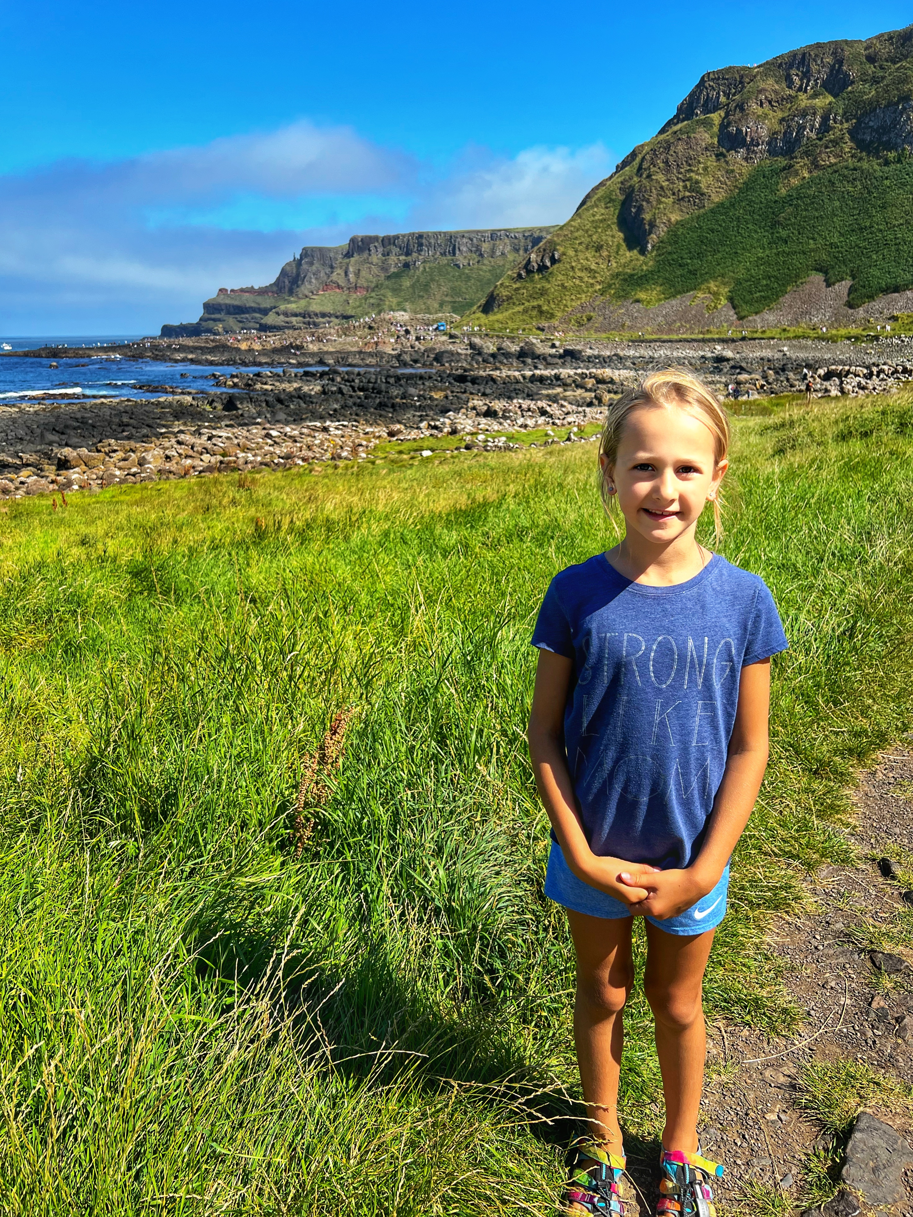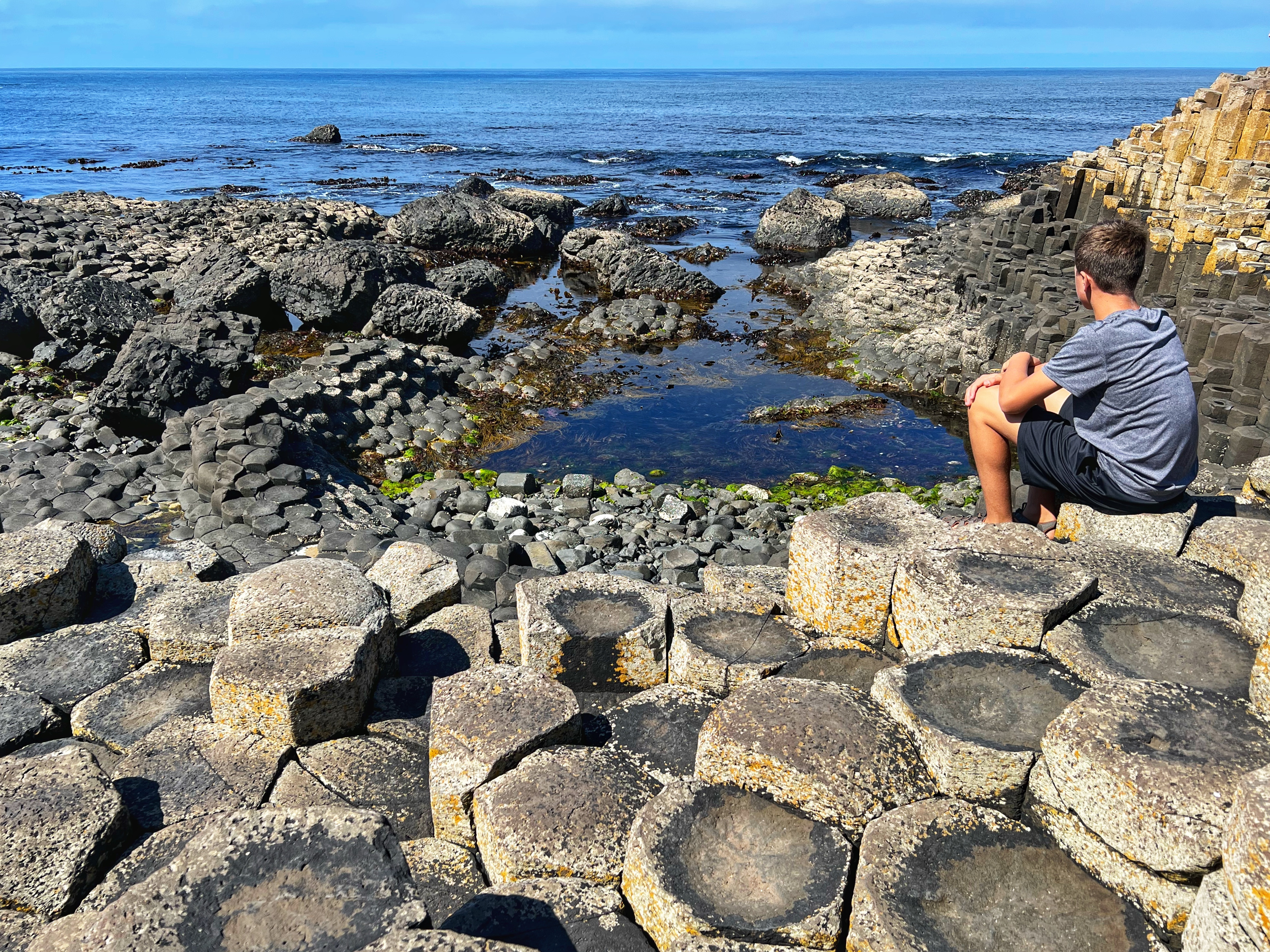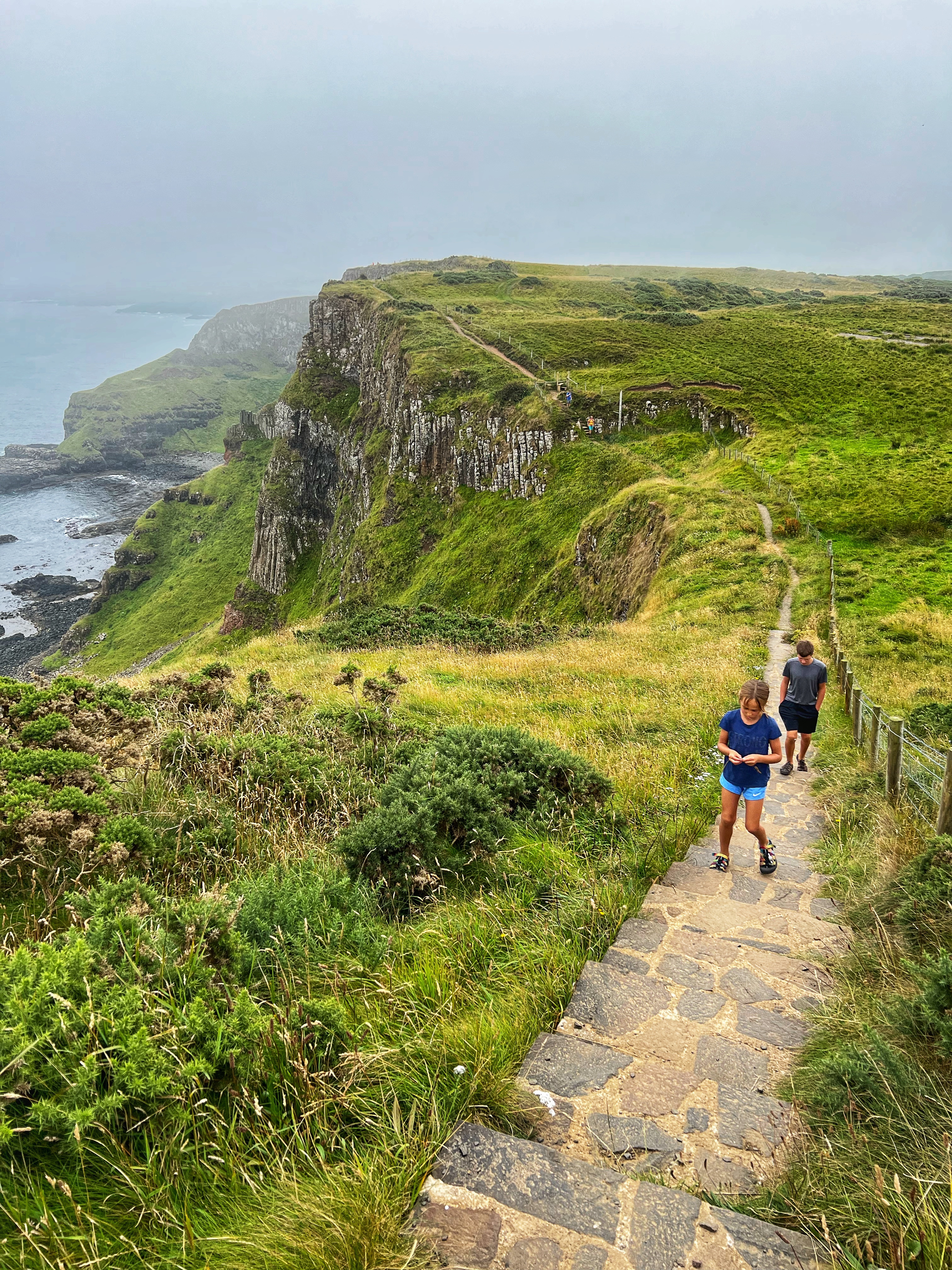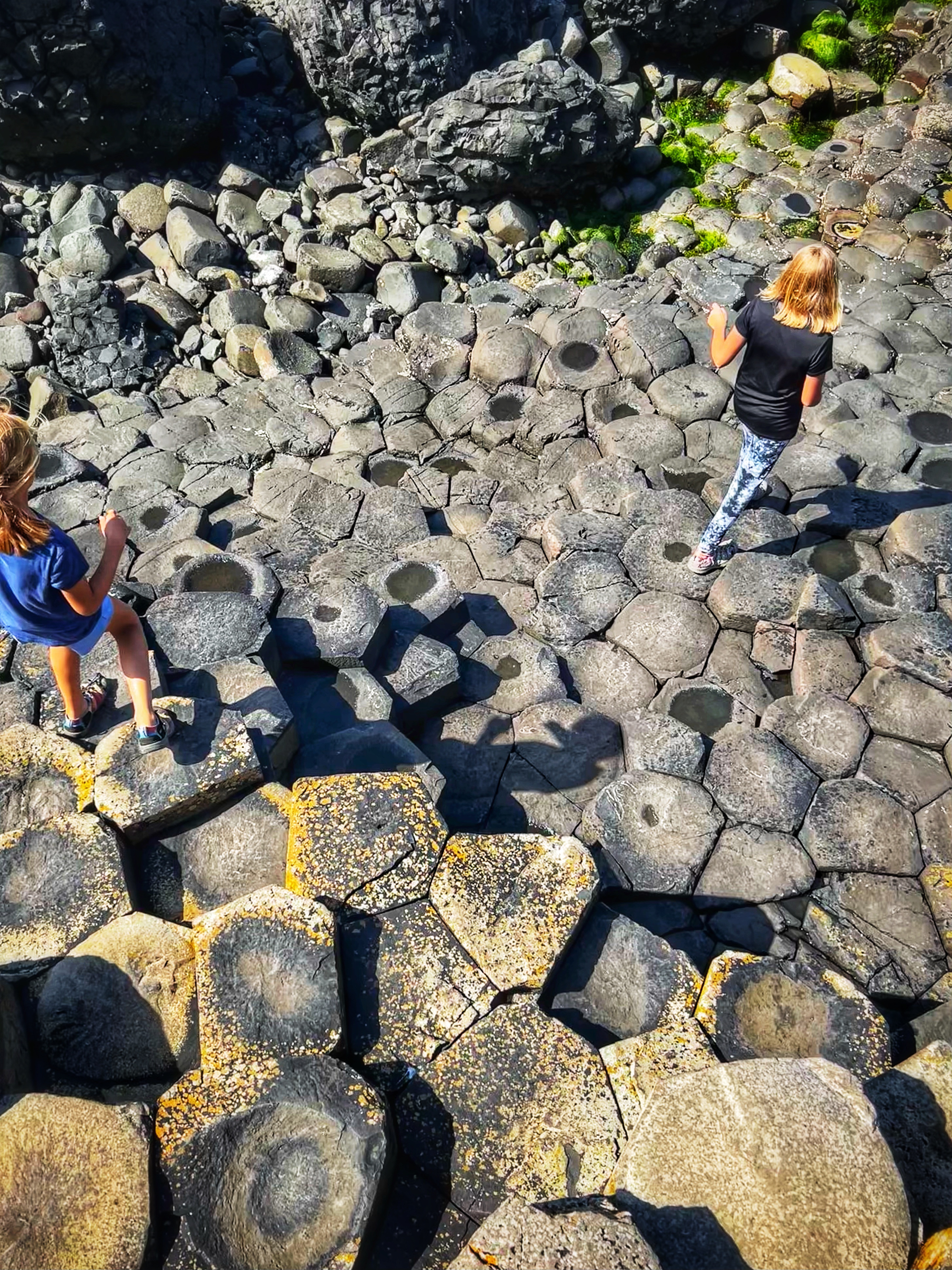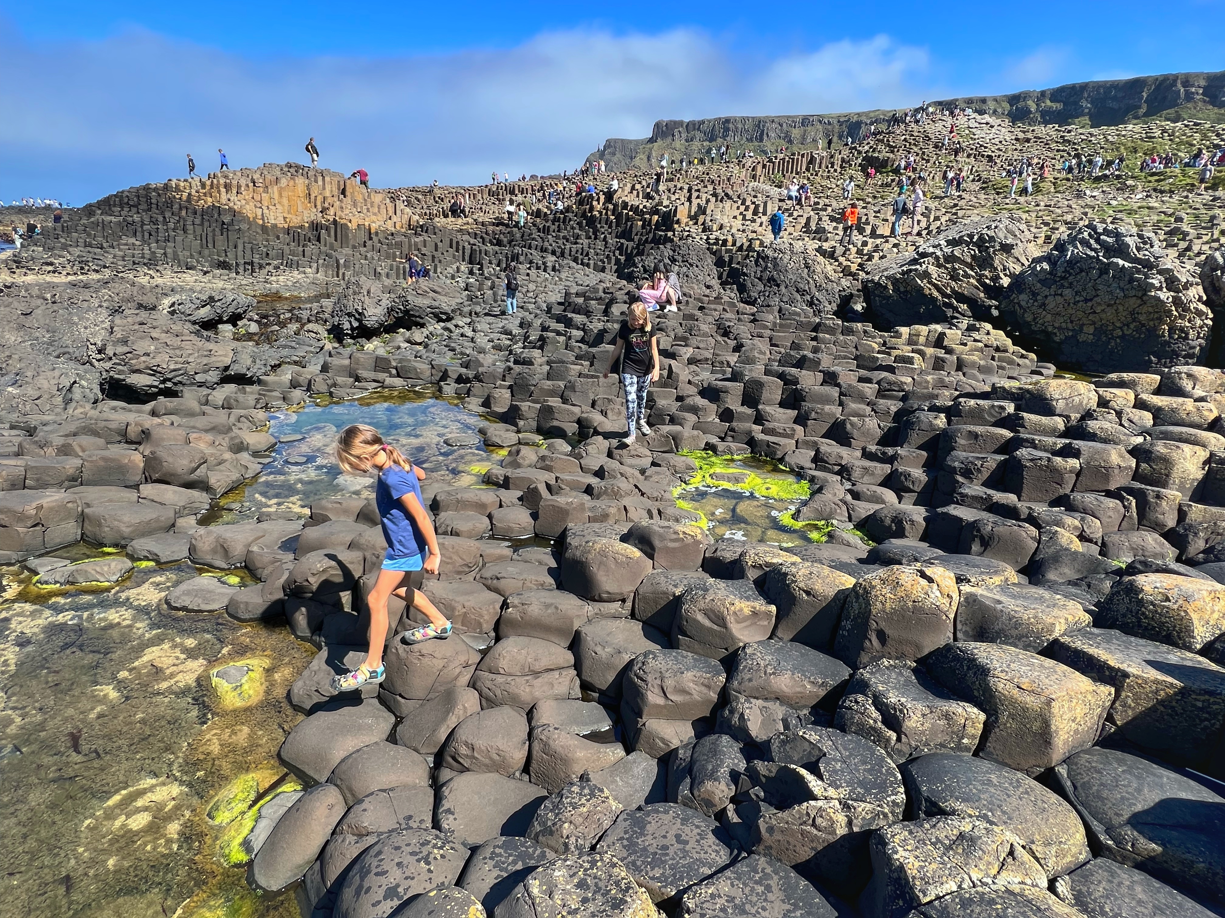 We also downloaded the free Giant’s Causeway app and listened to the little stories at various points with the kids. It was fun to learn about the lore and stories of this magical place, including a ship wreck near the Amphitheater that held some of the most valuable treasures ever discovered. From the path along the cliffs, we walked down a very steep set of steps to the lower trails and made our way to the incredible Giant’s Causeway. This impressive collection of over 40,000 hexagonal basalt columns has been wowing visitors for centuries. They were formed when lava pooled and cooled in just the right way, and this isn’t the only place on earth these kinds of formations can be found. They are also in Iceland, Scotland, Canada, and many other places around the globe.