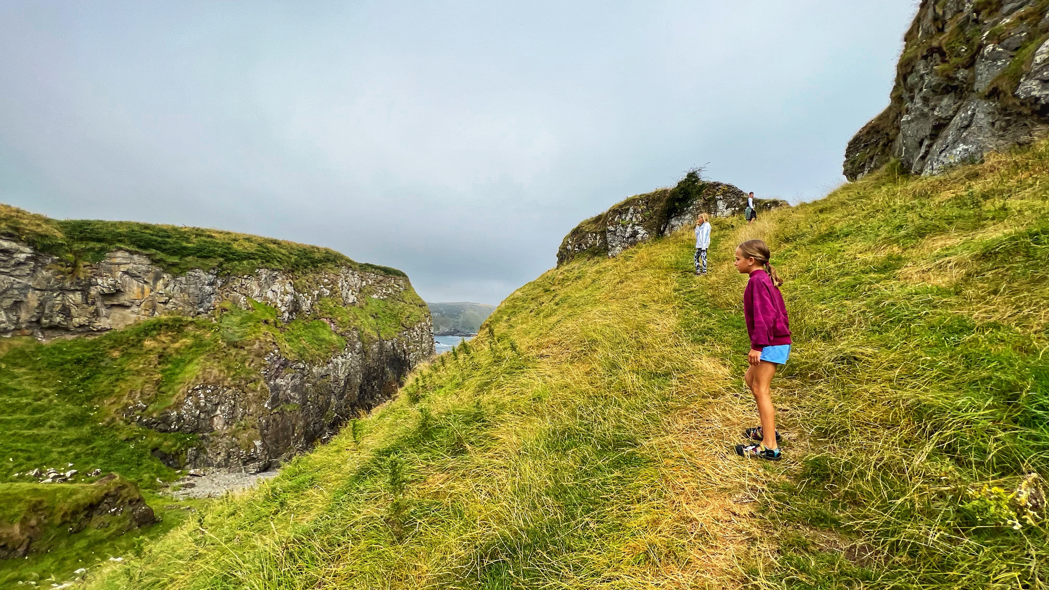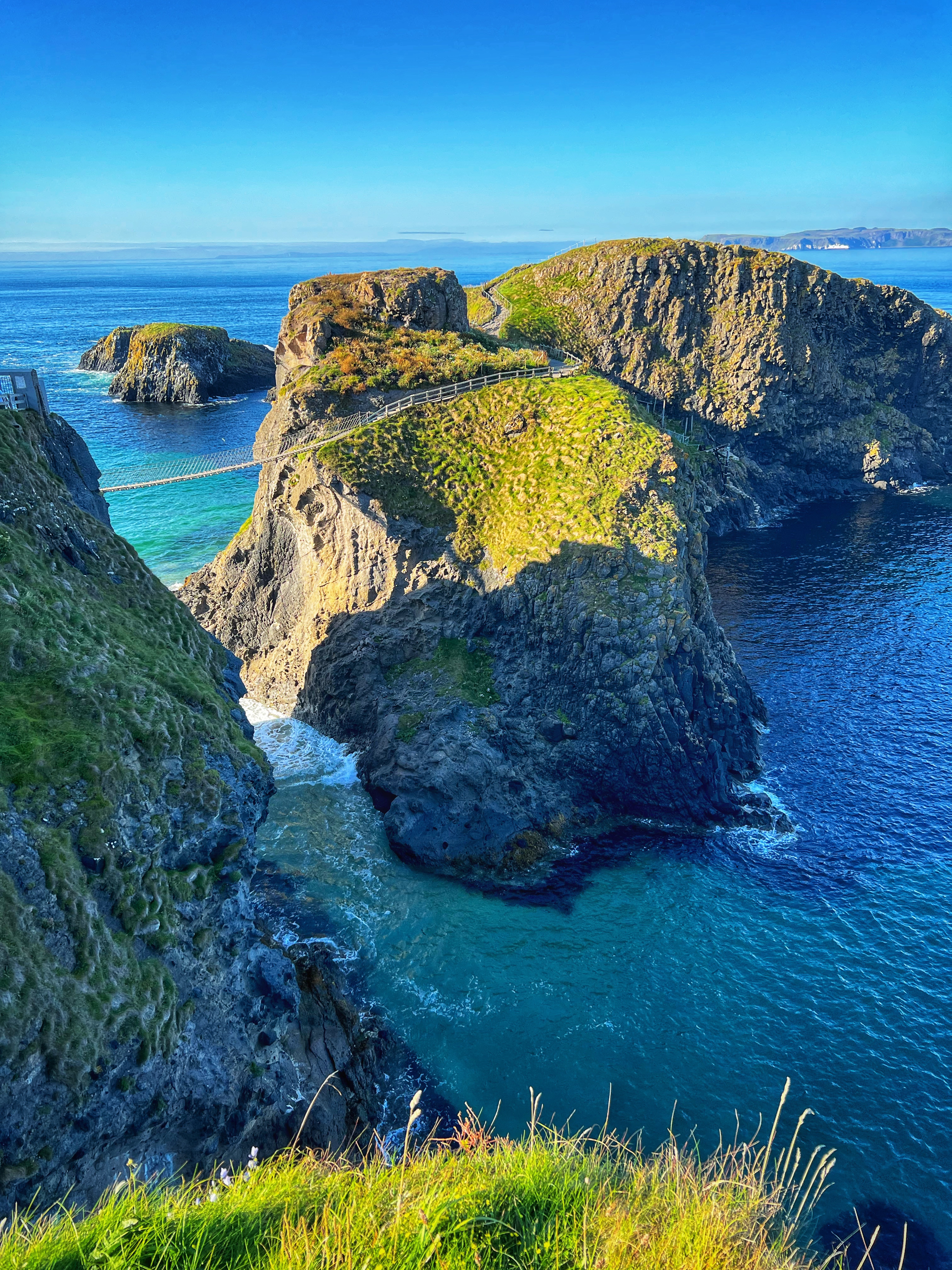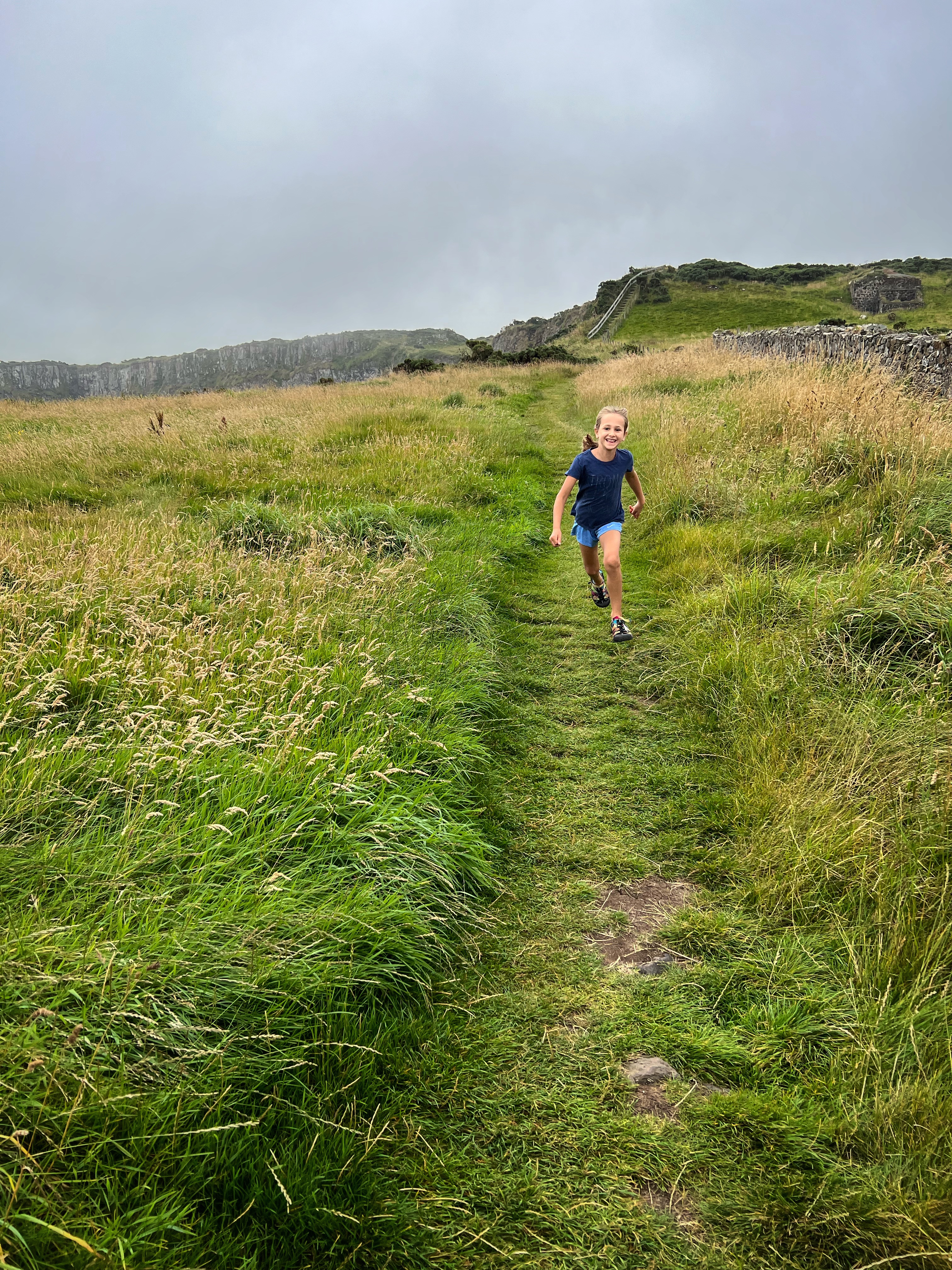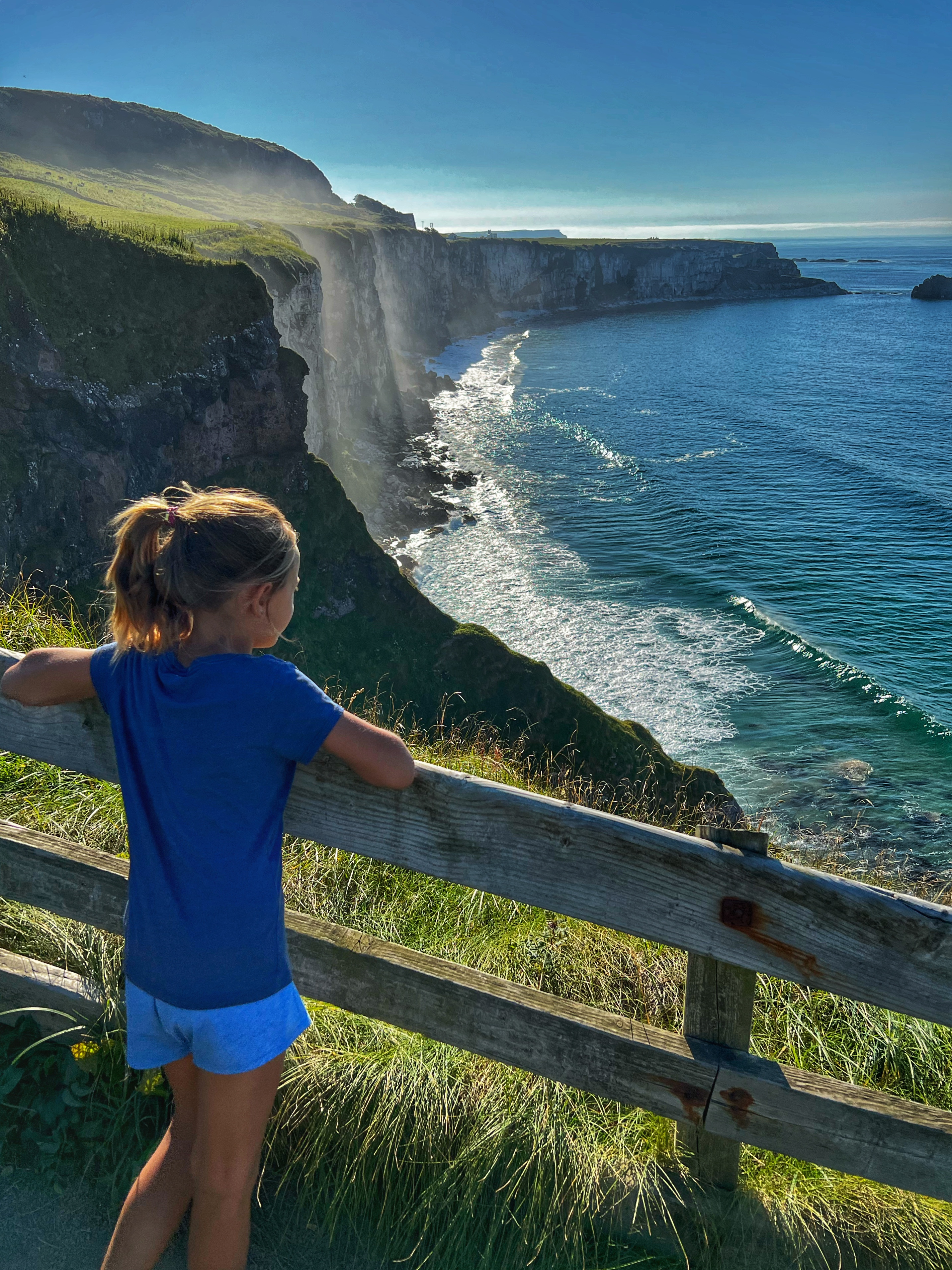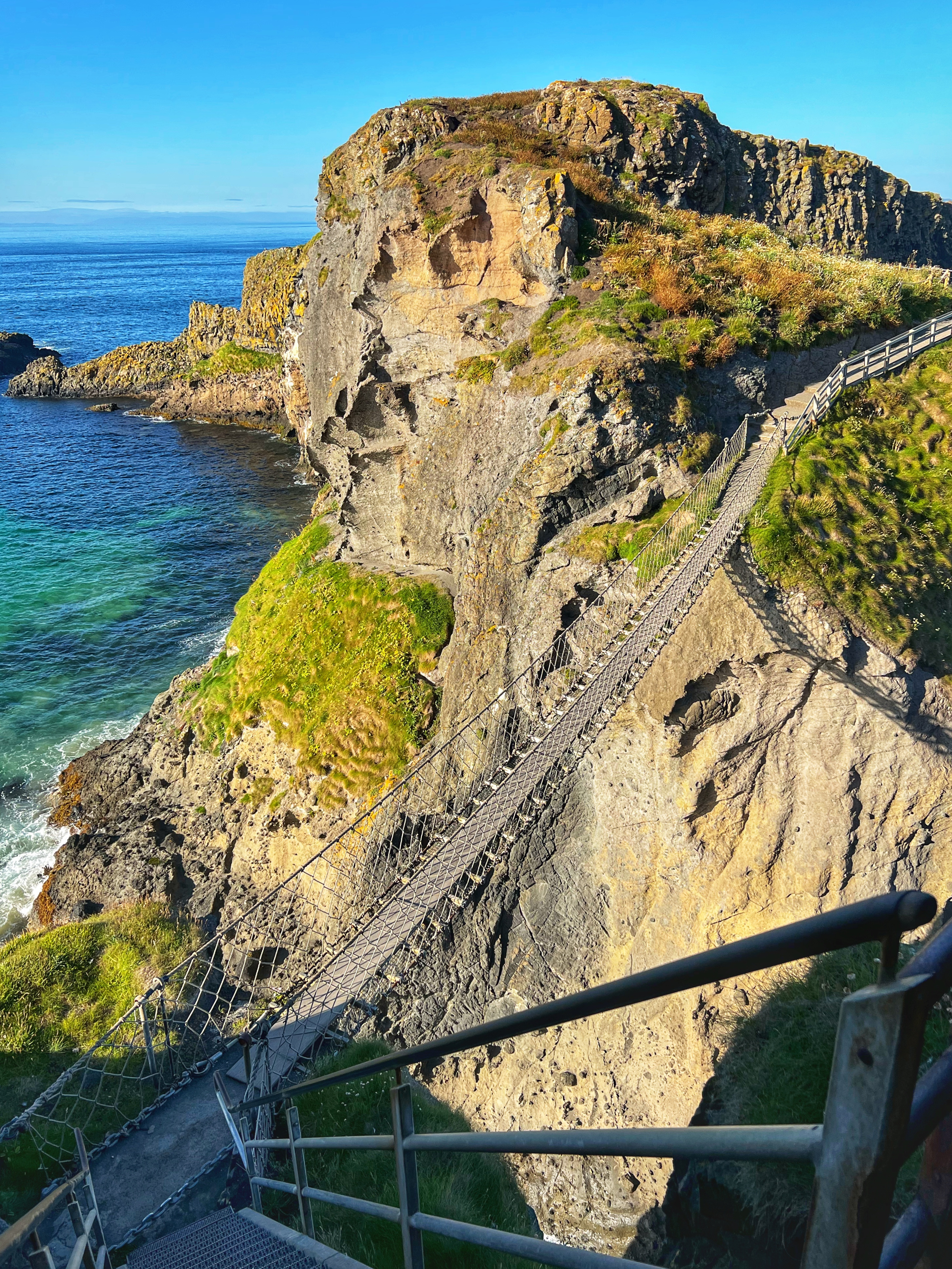 A few minutes up the road was the Carrick-a-Rede rope bridge. This unique place requires a ticket to cross, but we arrived at 6PM, just as it was closing, so didn’t have a chance to cross the bridge anyway. There is parking (but not for tall campervans) right there at the rope bridge visitors center (as well as facilities, but they close at 6PM too) for free, but if you miss it like we did, you can park up the road at the next pull out and walk down. Phew! We had burned rubber in our shoes that day with so many steps. I have to say that even arriving after it closed was just fine – the walk to the bridge was gorgeous, and we weren’t keen to pay £40+ just for our family to cross a bridge anyway. Instead we enjoyed the beautiful evening hike along the cliffs and after, went nearby to Larrybane Quarry to see another Game of Thrones filming location. Hint: for the BEST views of the rope bridge, walk to the cliff just past the bridge. If you continue on this trail it leads back to the main trail, so don’t worry. It’s a extraordinary view of the bridge back to your left (see below).