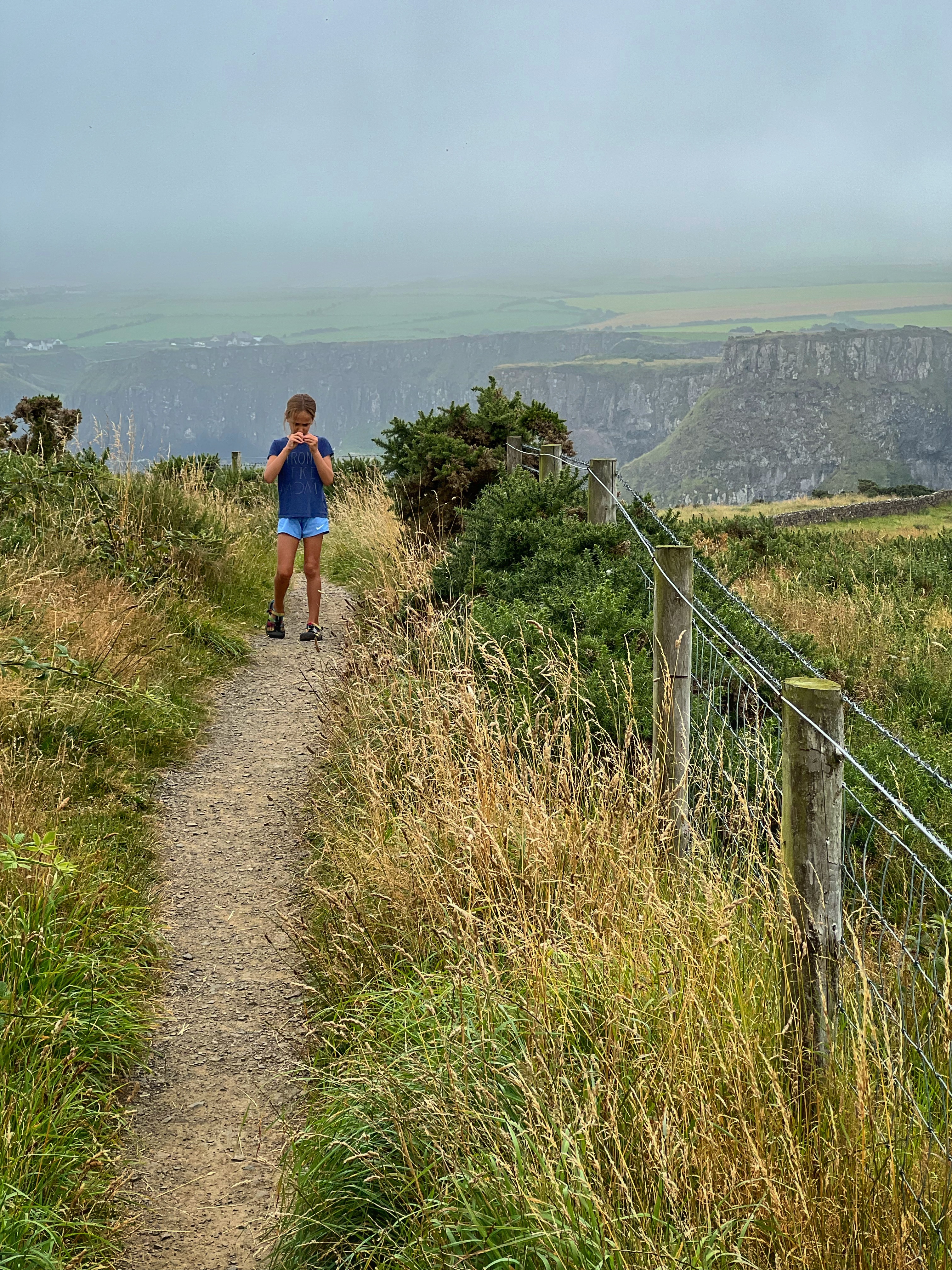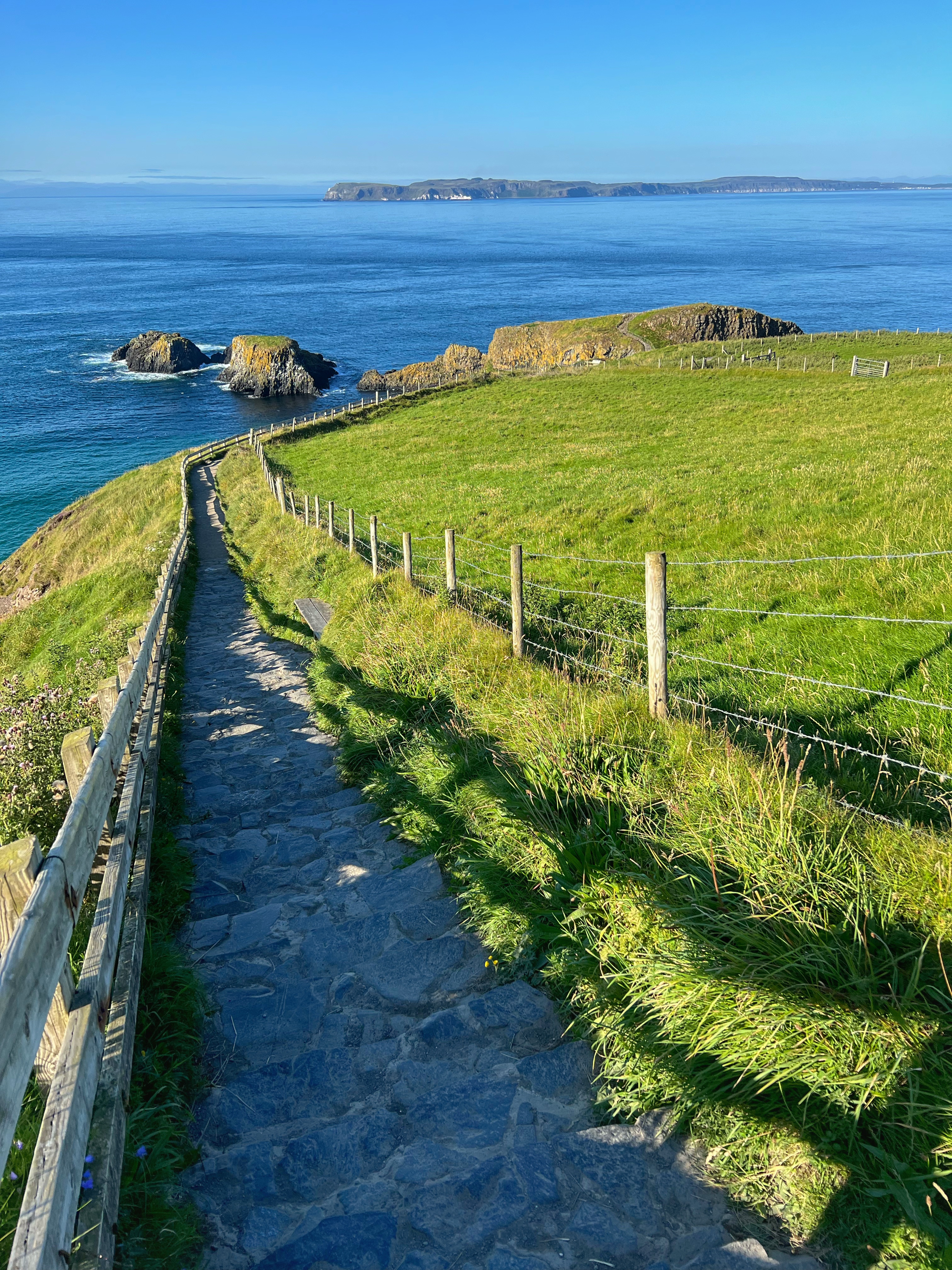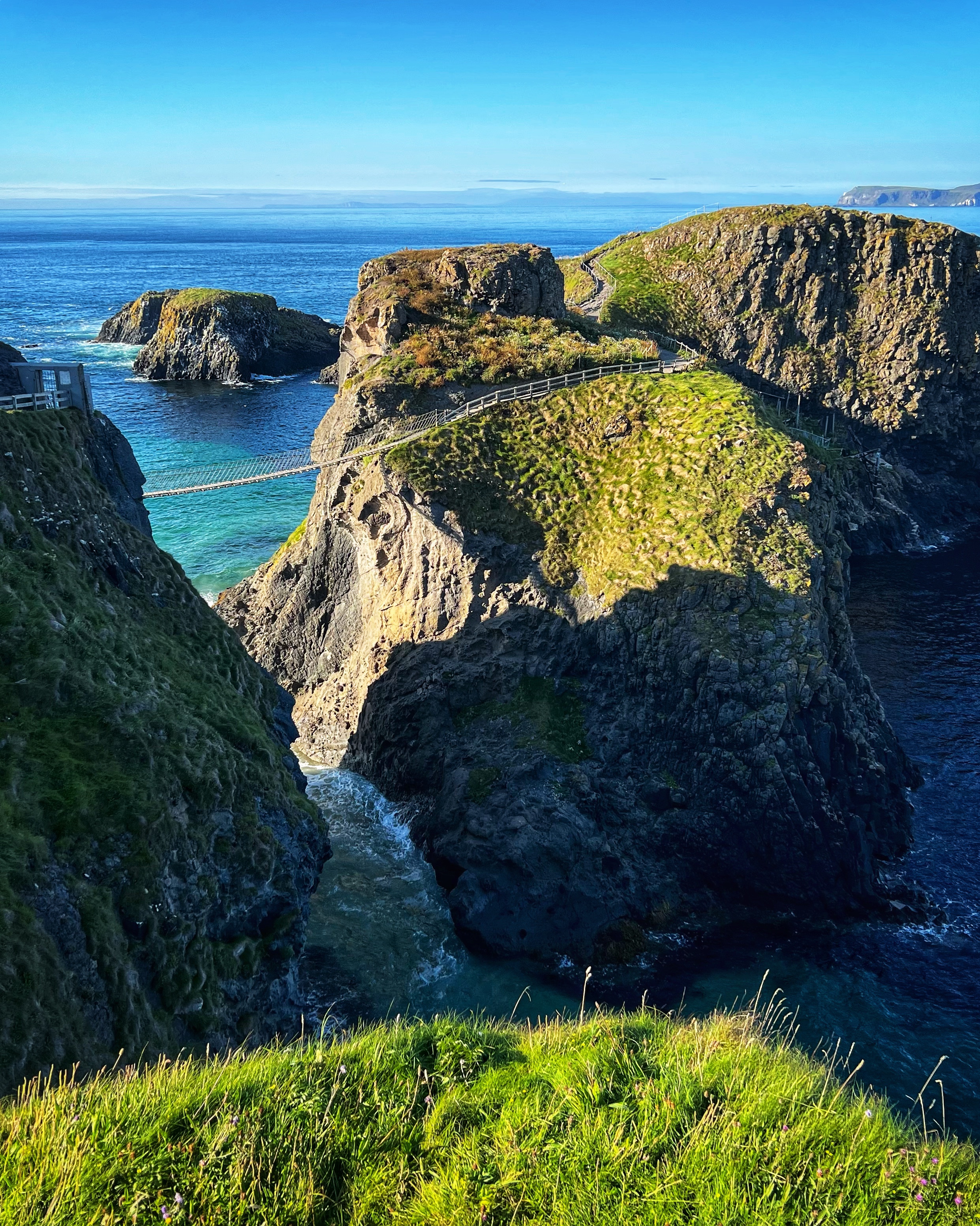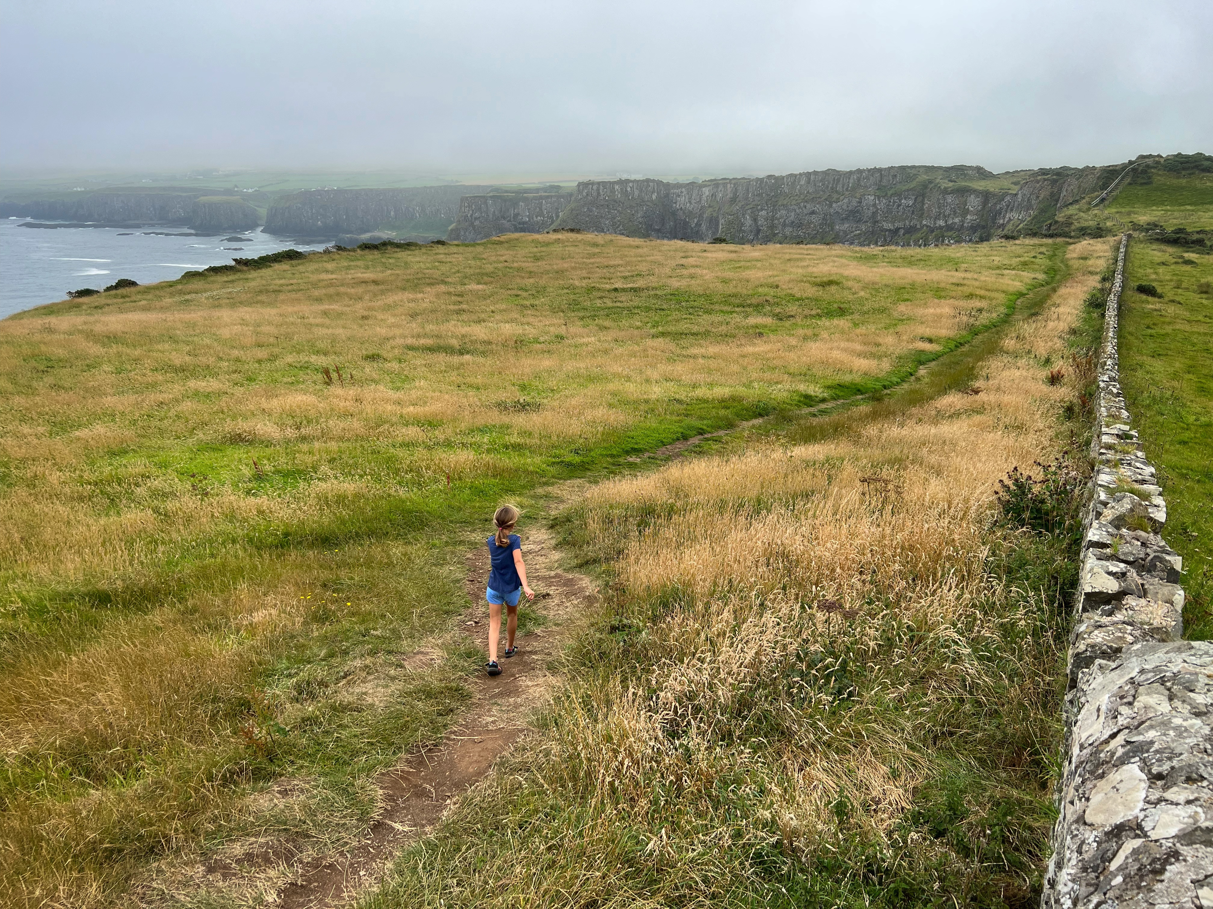 A few minutes up the road was the Carrick-a-Rede rope bridge. This unique place requires a ticket to cross, but we arrived at 6PM, just as it was closing, so didn’t have a chance to cross the bridge anyway. There is parking (but not for tall campervans) right there at the rope bridge visitors center (as well as facilities, but they close at 6PM too) for free, but if you miss it like we did, you can park up the road at the next pull out and walk down. Phew! We had burned rubber in our shoes that day with so many steps. I have to say that even arriving after it closed was just fine – the walk to the bridge was gorgeous, and we weren’t keen to pay £40+ just for our family to cross a bridge anyway. Instead we enjoyed the beautiful evening hike along the cliffs and after, went nearby to Larrybane Quarry to see another Game of Thrones filming location. Hint: for the BEST views of the rope bridge, walk to the cliff just past the bridge. If you continue on this trail it leads back to the main trail, so don’t worry. It’s a extraordinary view of the bridge back to your left (see below).
